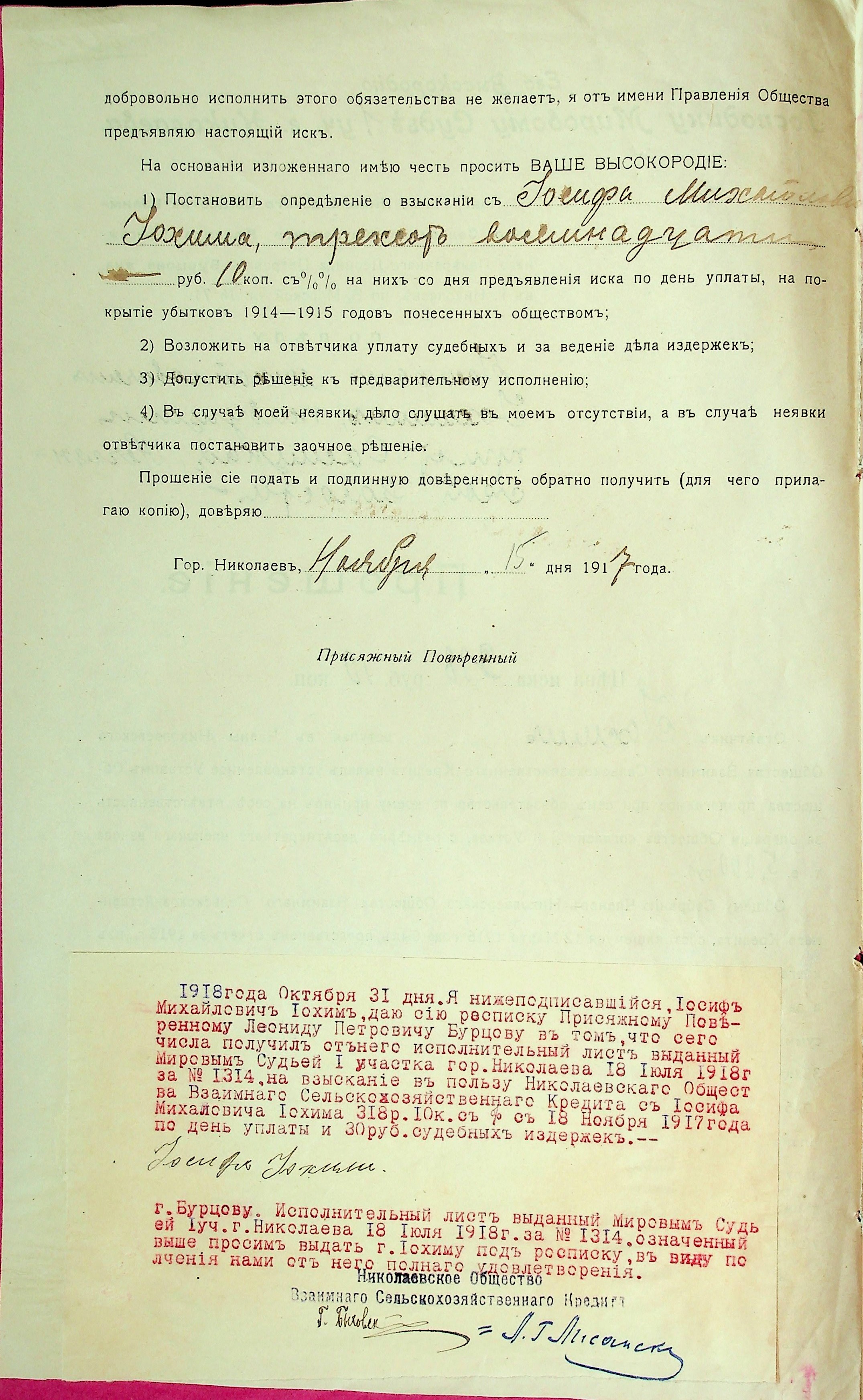 • • • • Справа № 35 “Прохання присяжного повіреного товариства Бурцова Л.П. до мирового судді дільниці № 1 м. Миколаїв про стягнення грошей за векселями на користь товариства з Іохима Й.М.”