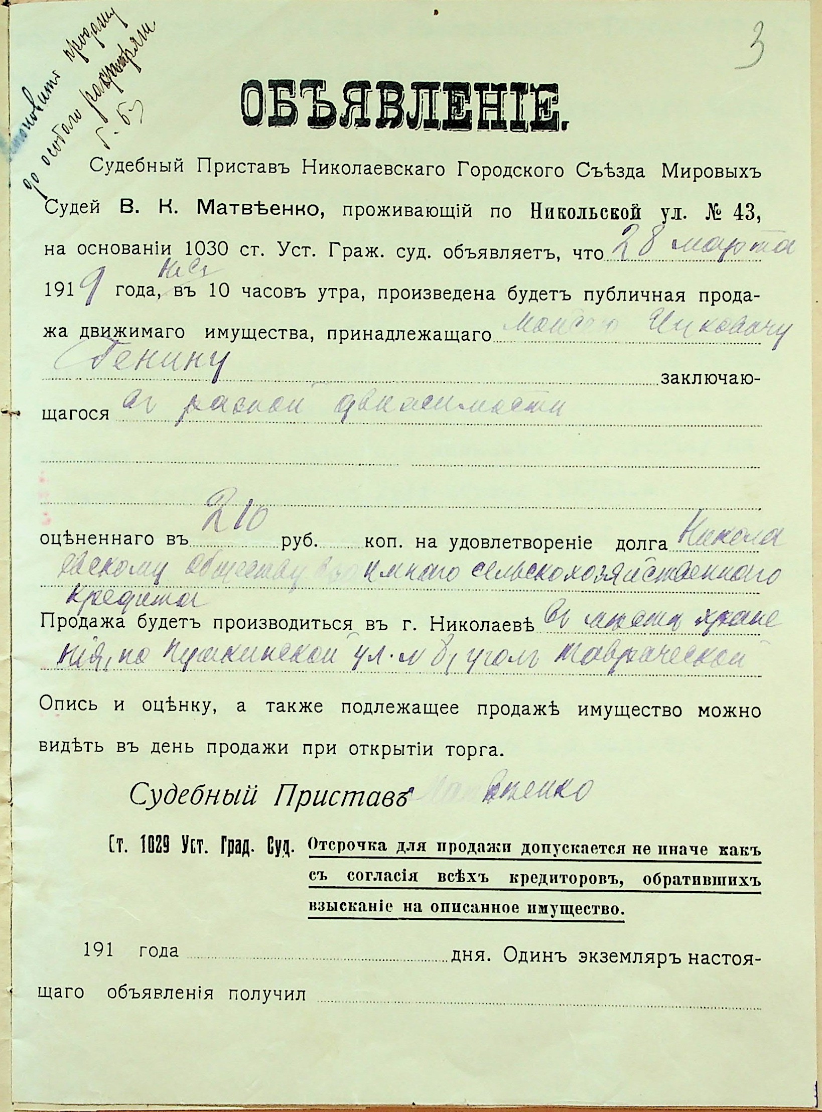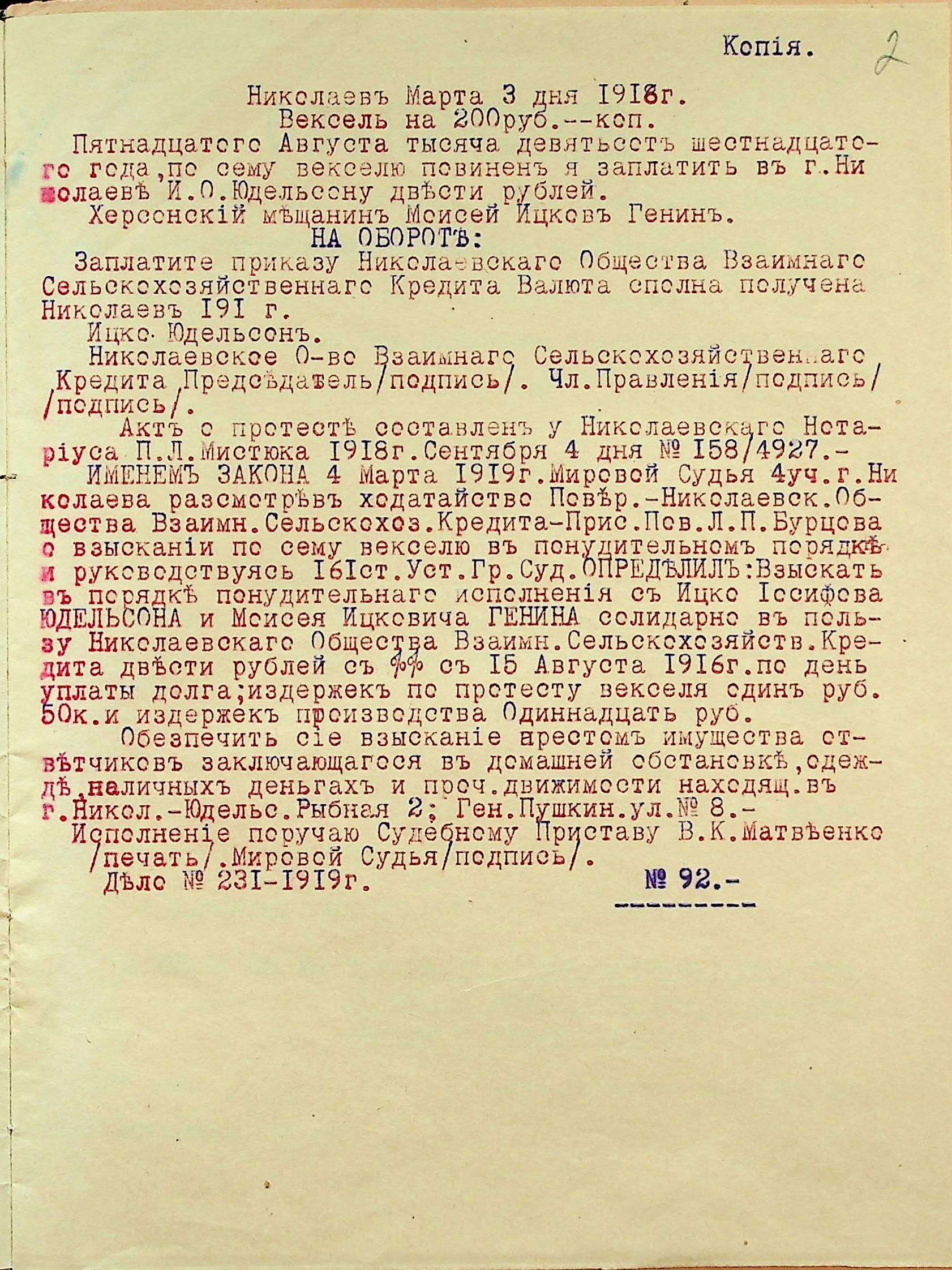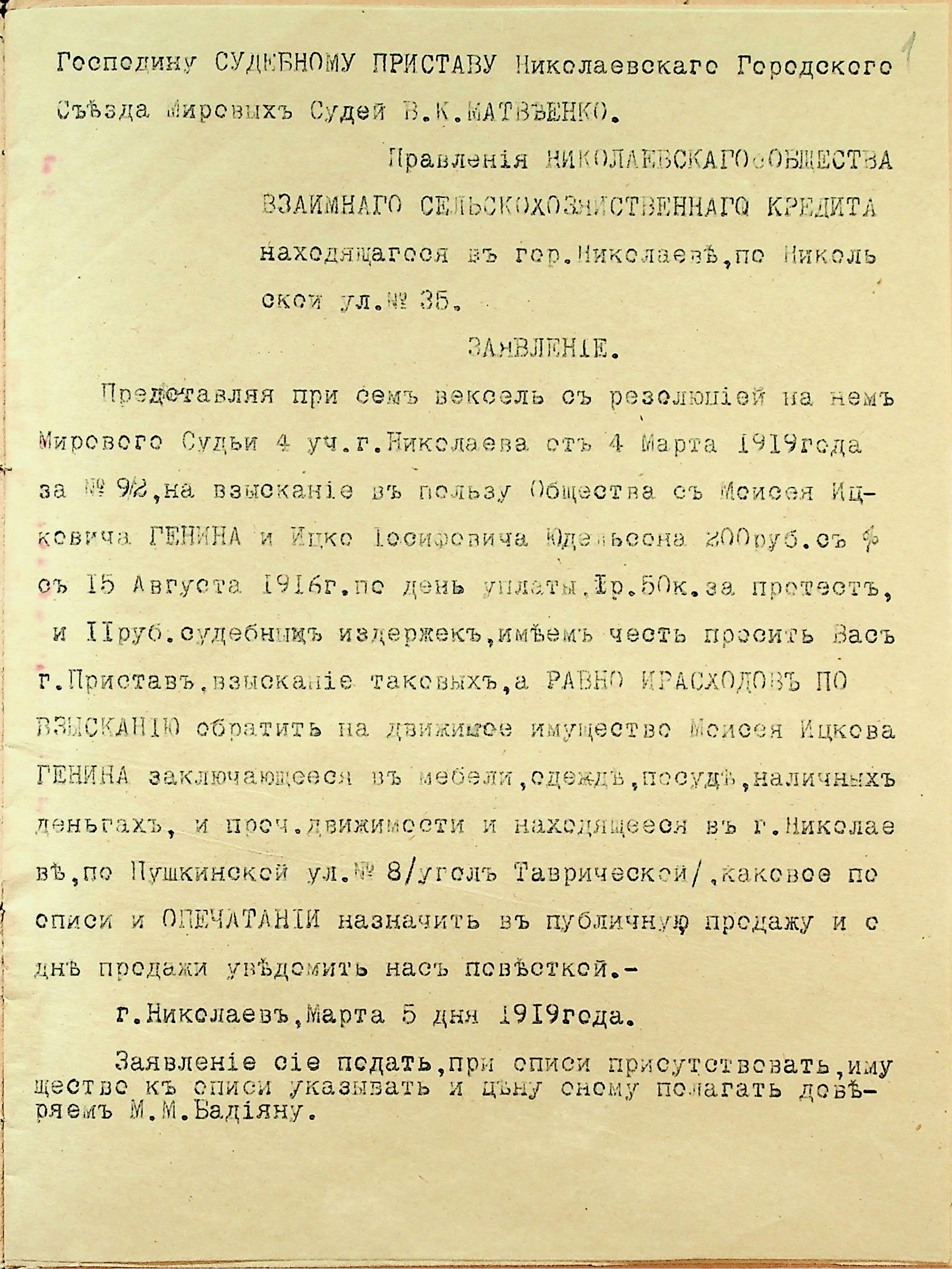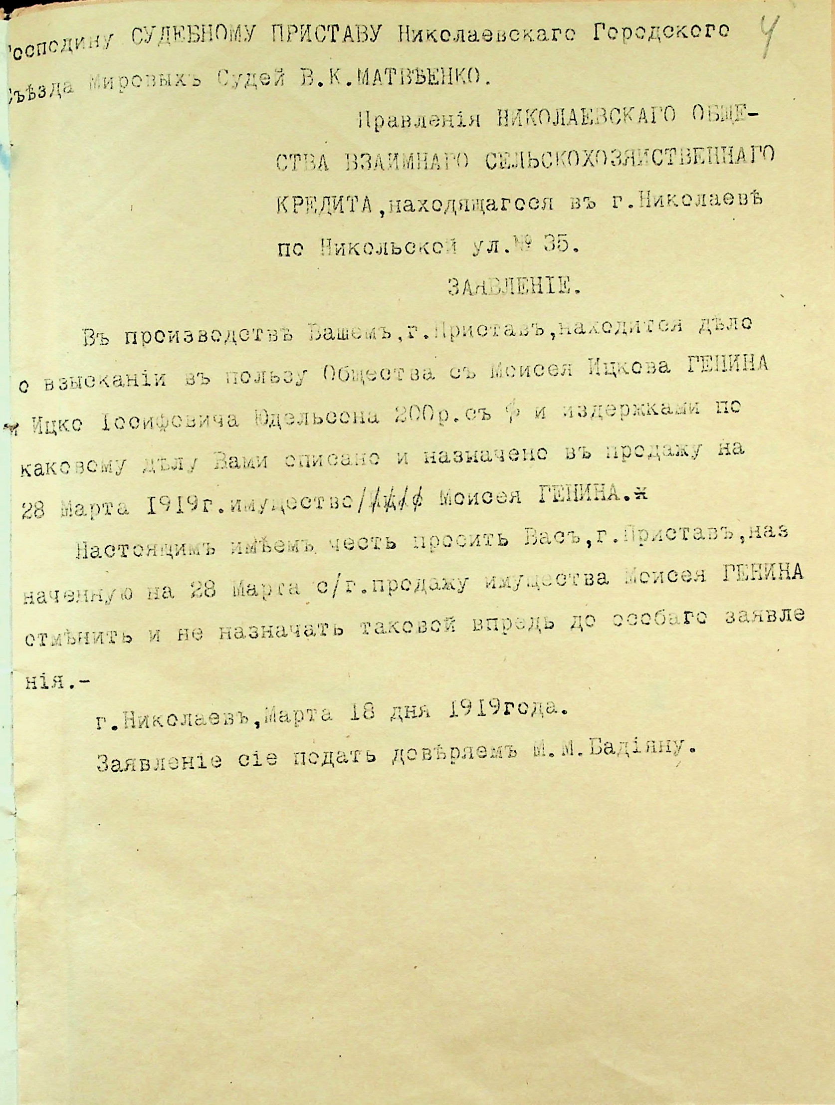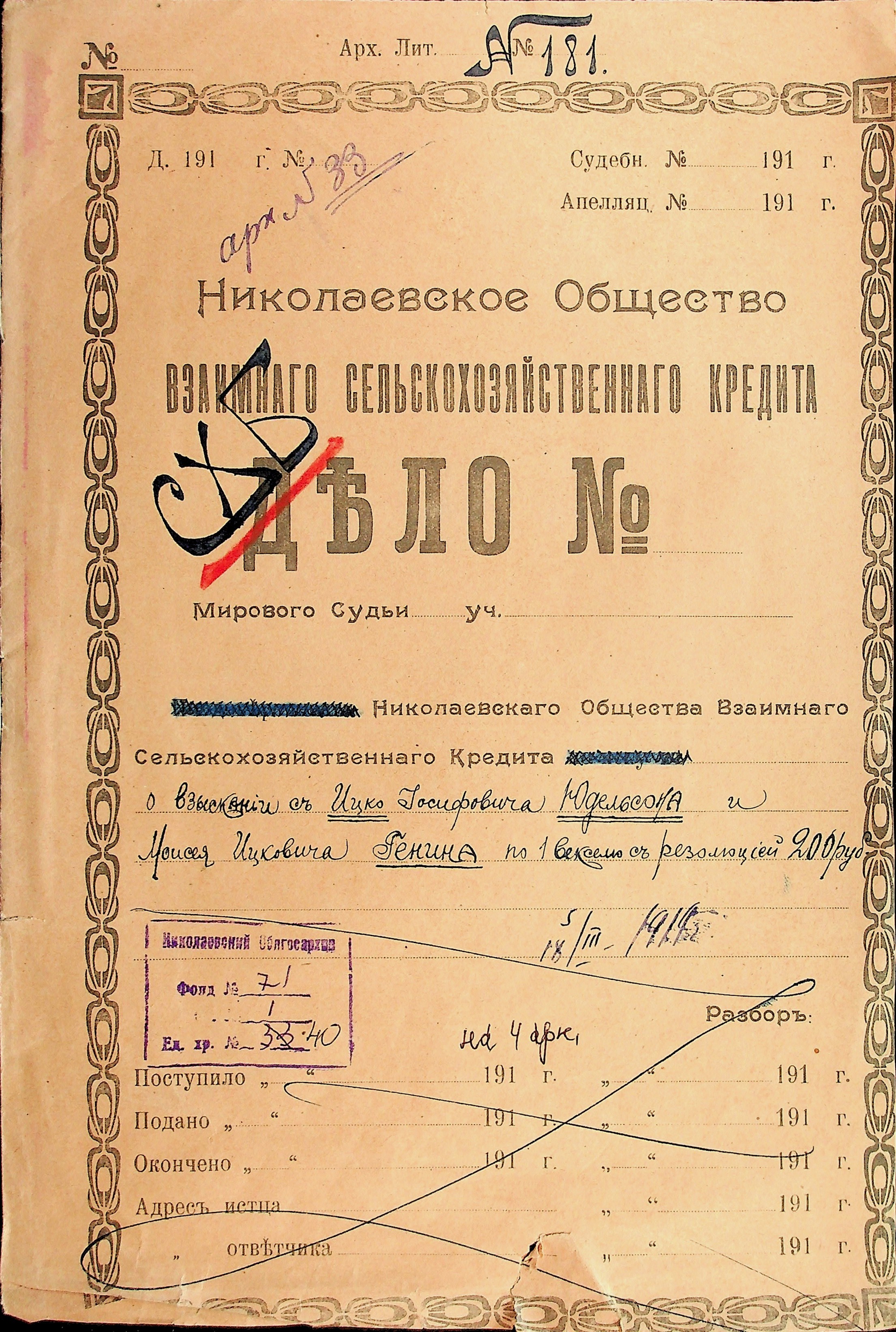 • • • • Справа № 40 “Заява правління Миколаївського товариства взаємного сільськогосподарського кредиту про стягнення грошей за векселями на користь товариства з Геніна М.І. і Юдельсона І.І., оголошення про публічний продаж майна Геніна М.І.”