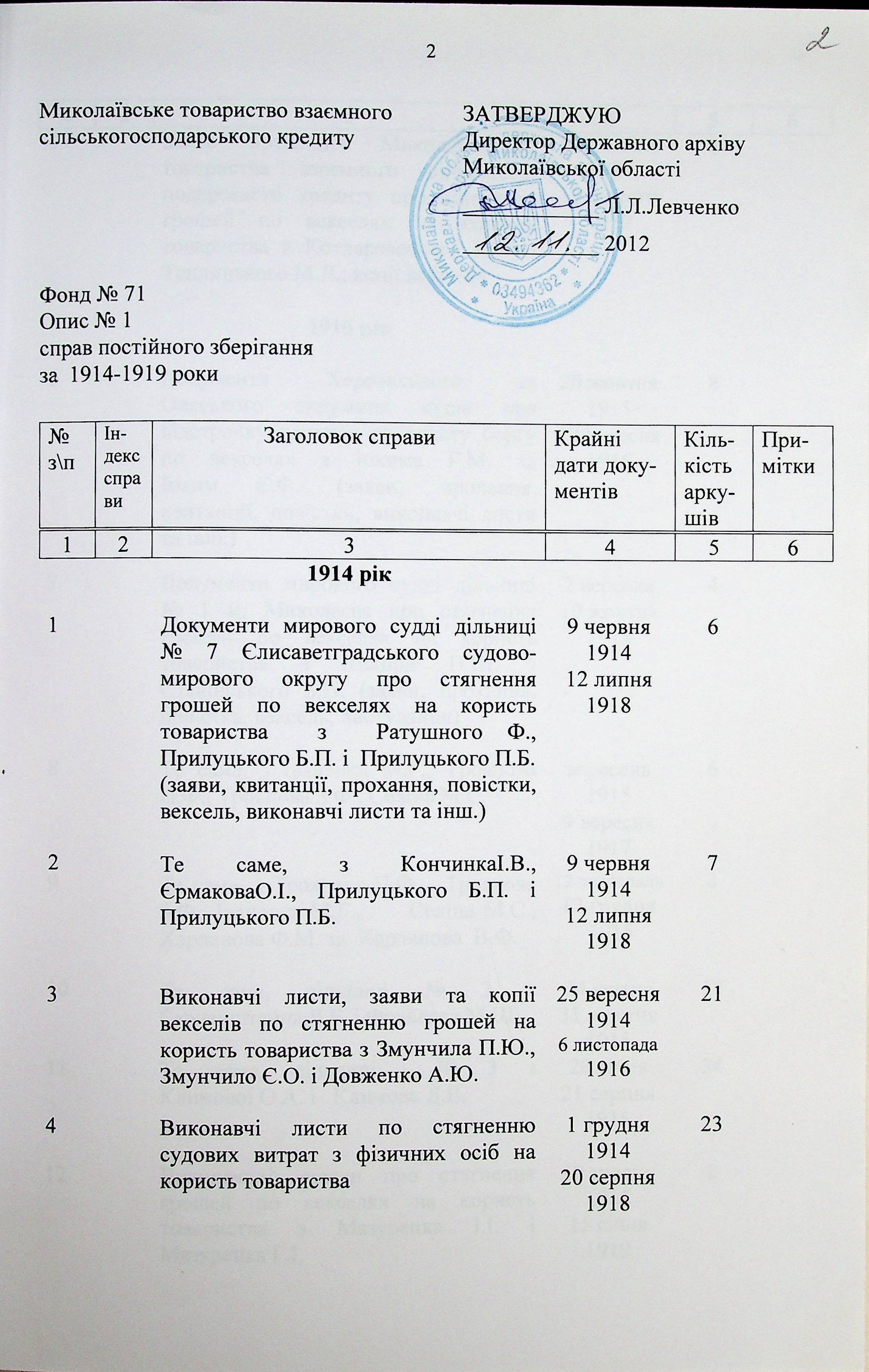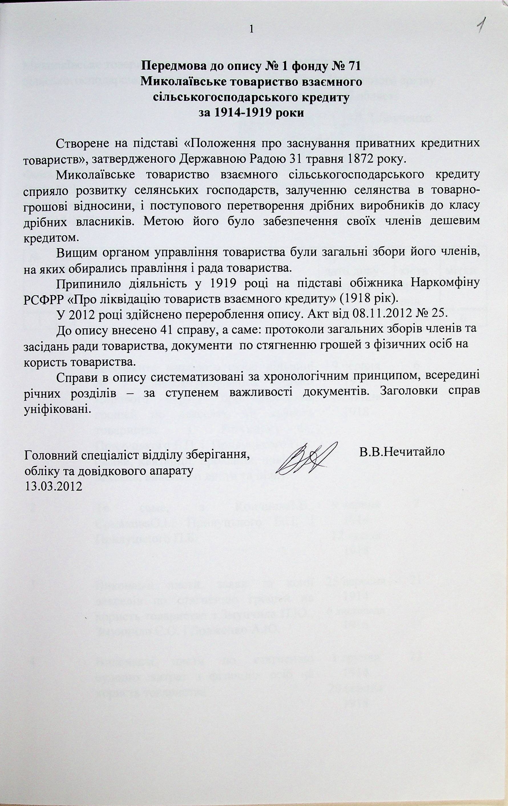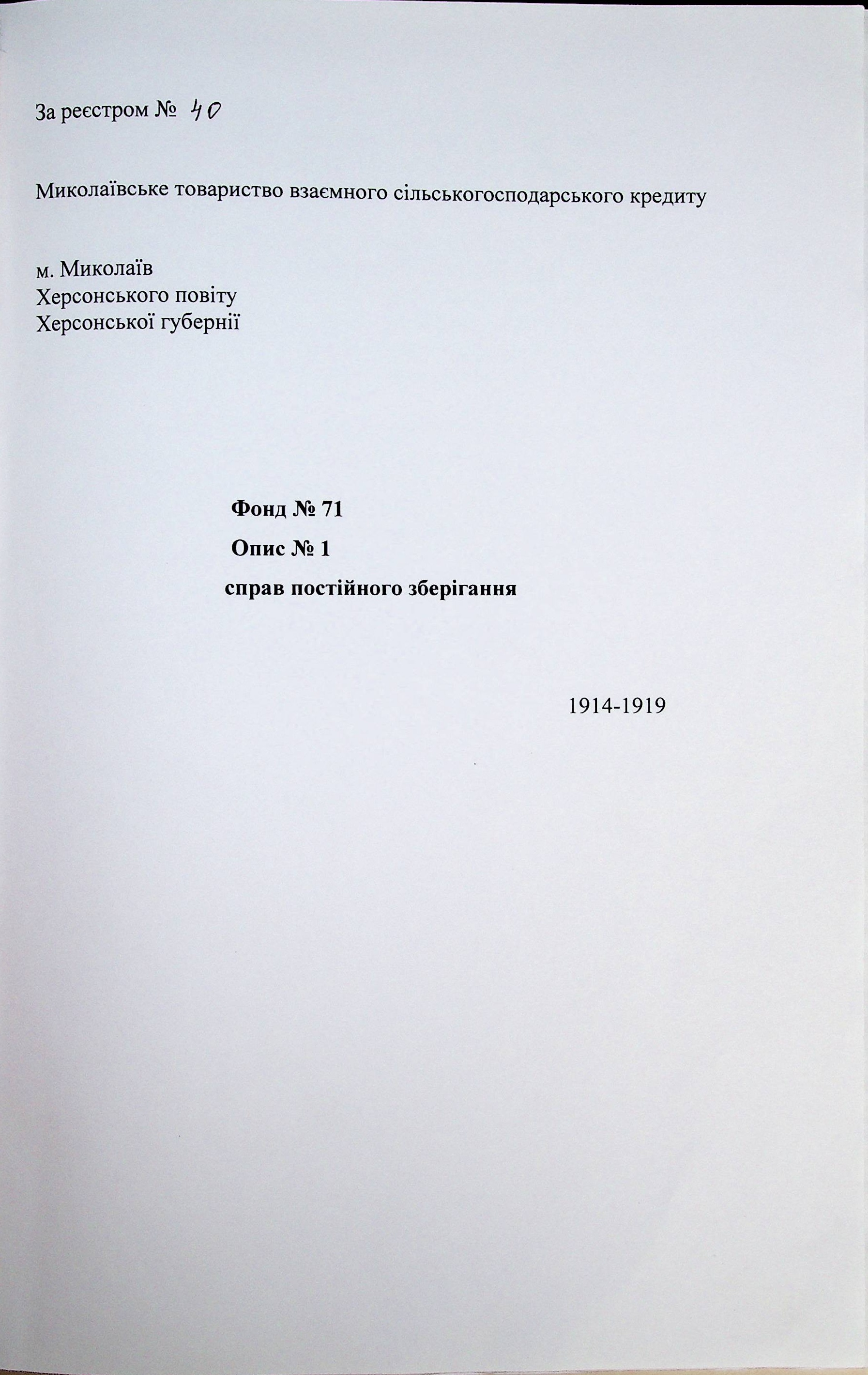 ◦ ◦ Фонд № 71 “Миколаївське товариство взаємного сільськогосподарського кредиту”