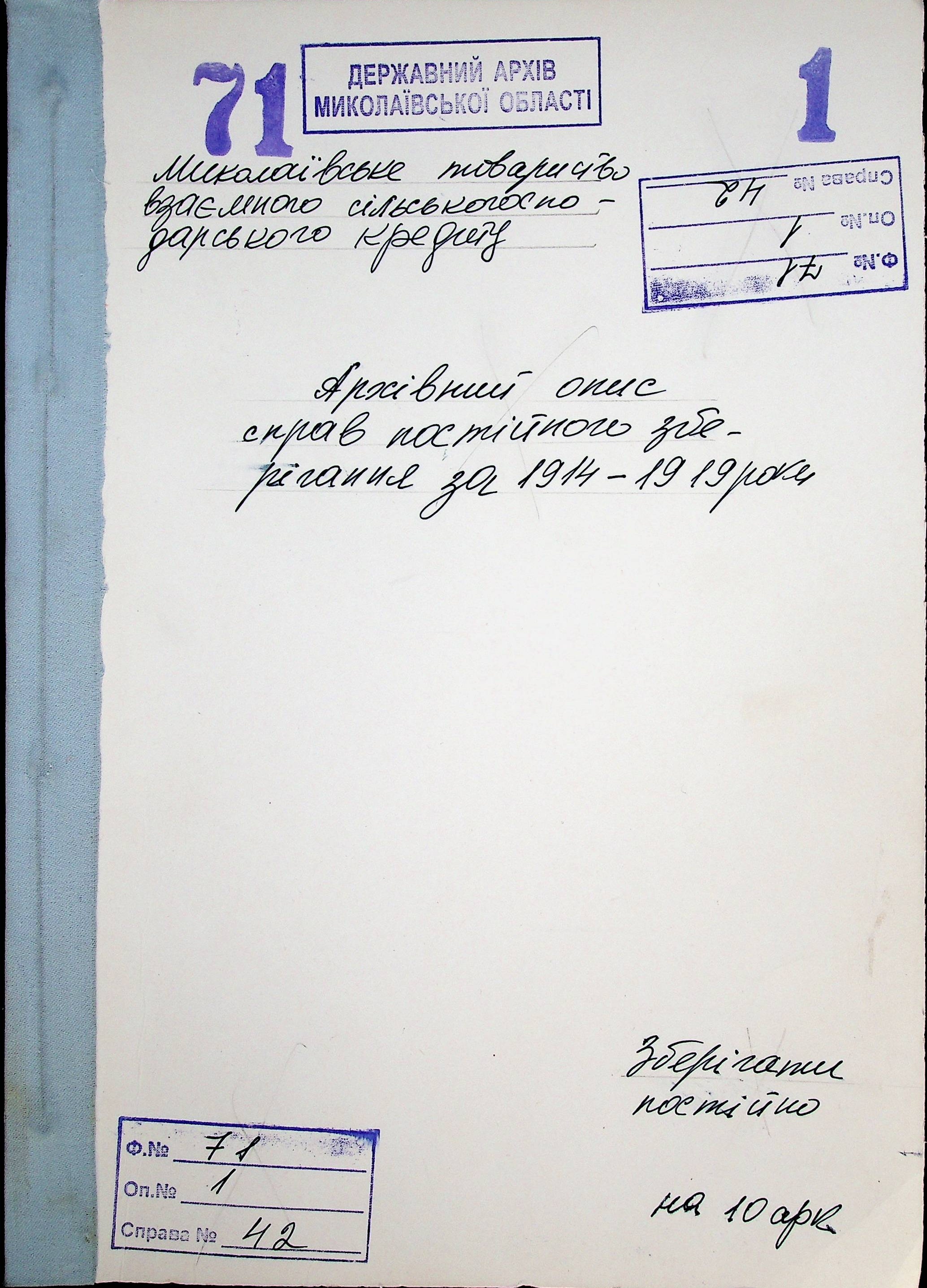 • • • • Справа № 42 “Архівний опис № 1 справ постійного зберігання фонду № 71 за 1914-1919 роки”