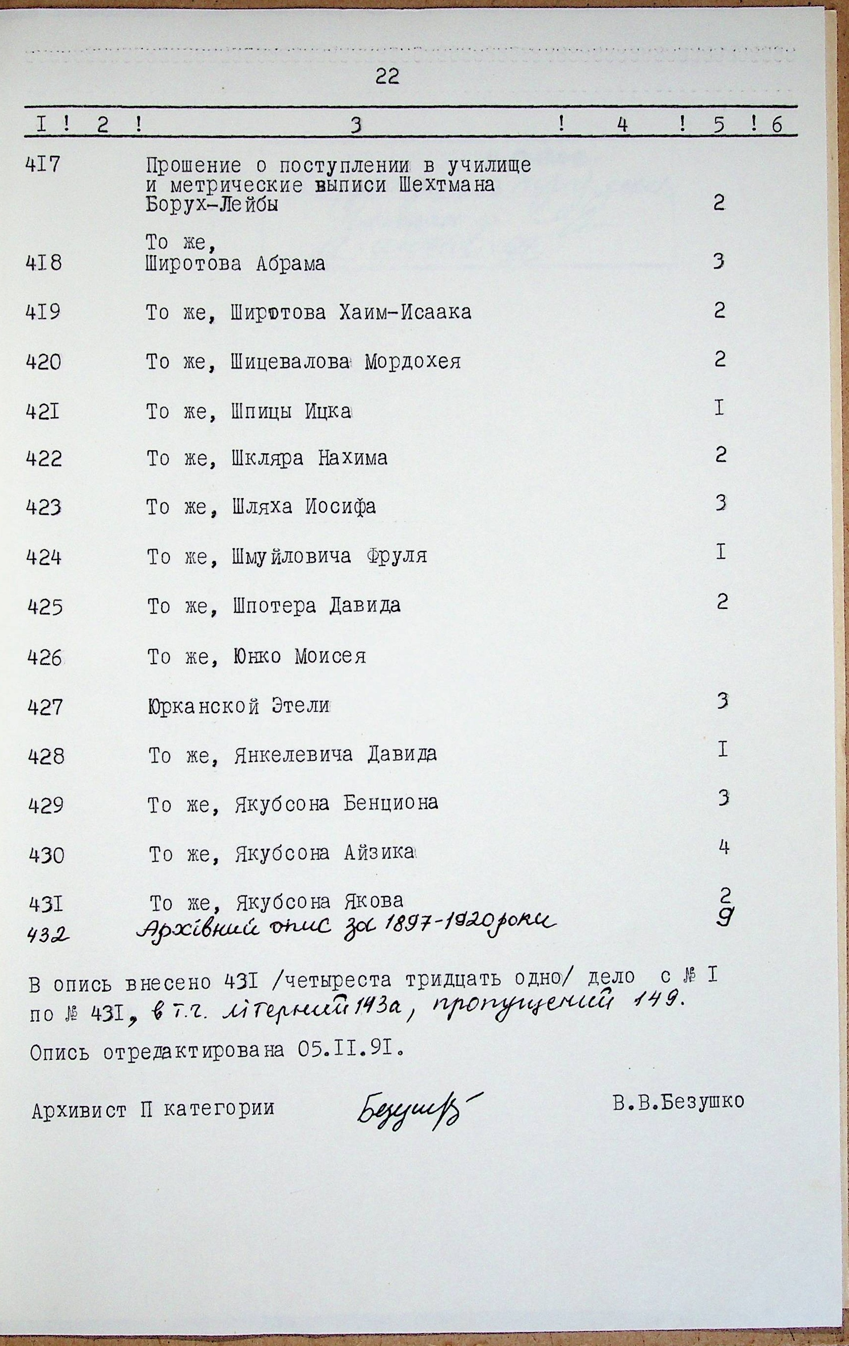 • • • • Справа № 433 «Архівний опис за 1897–1920 роки, удосконалений у 1991 році»