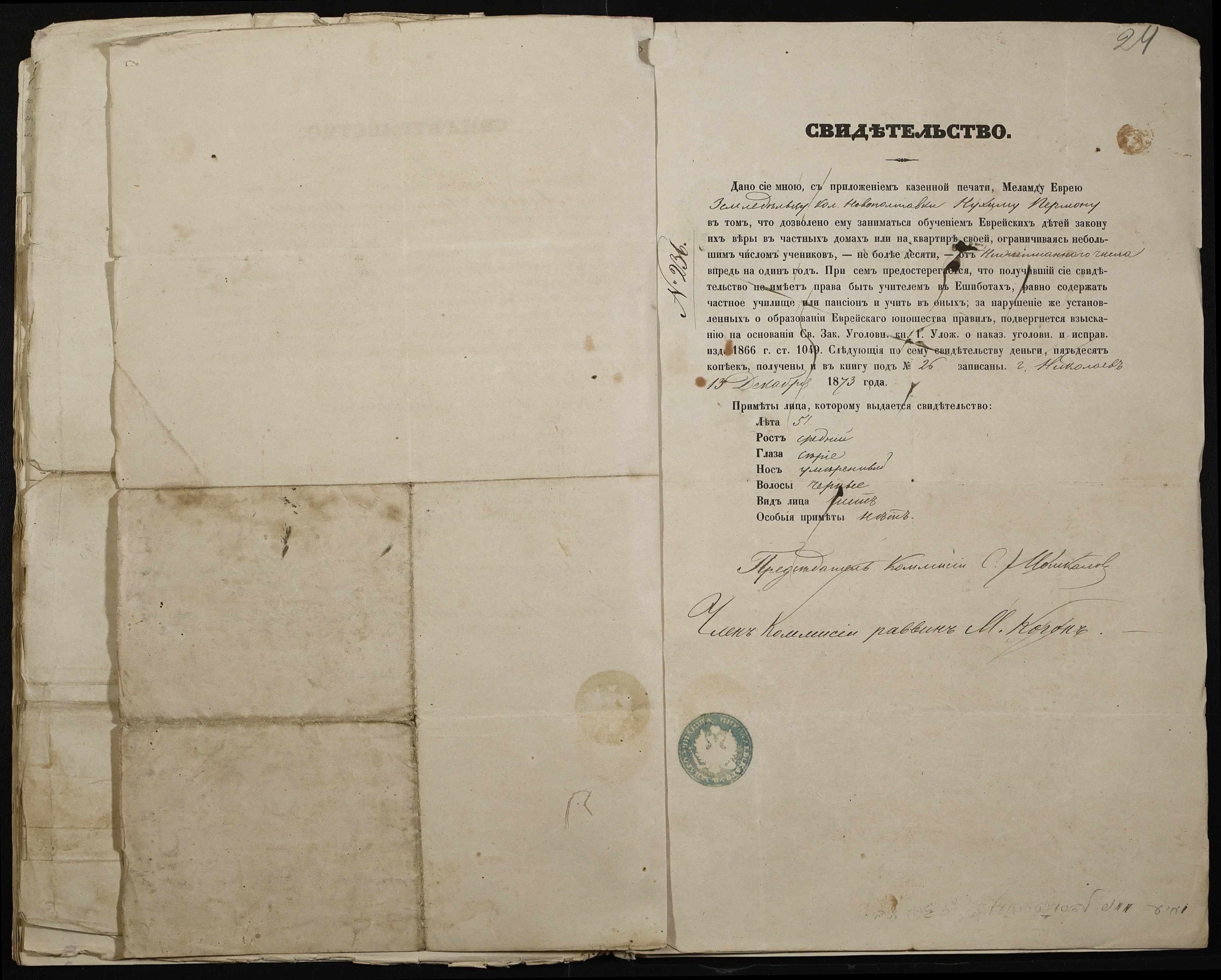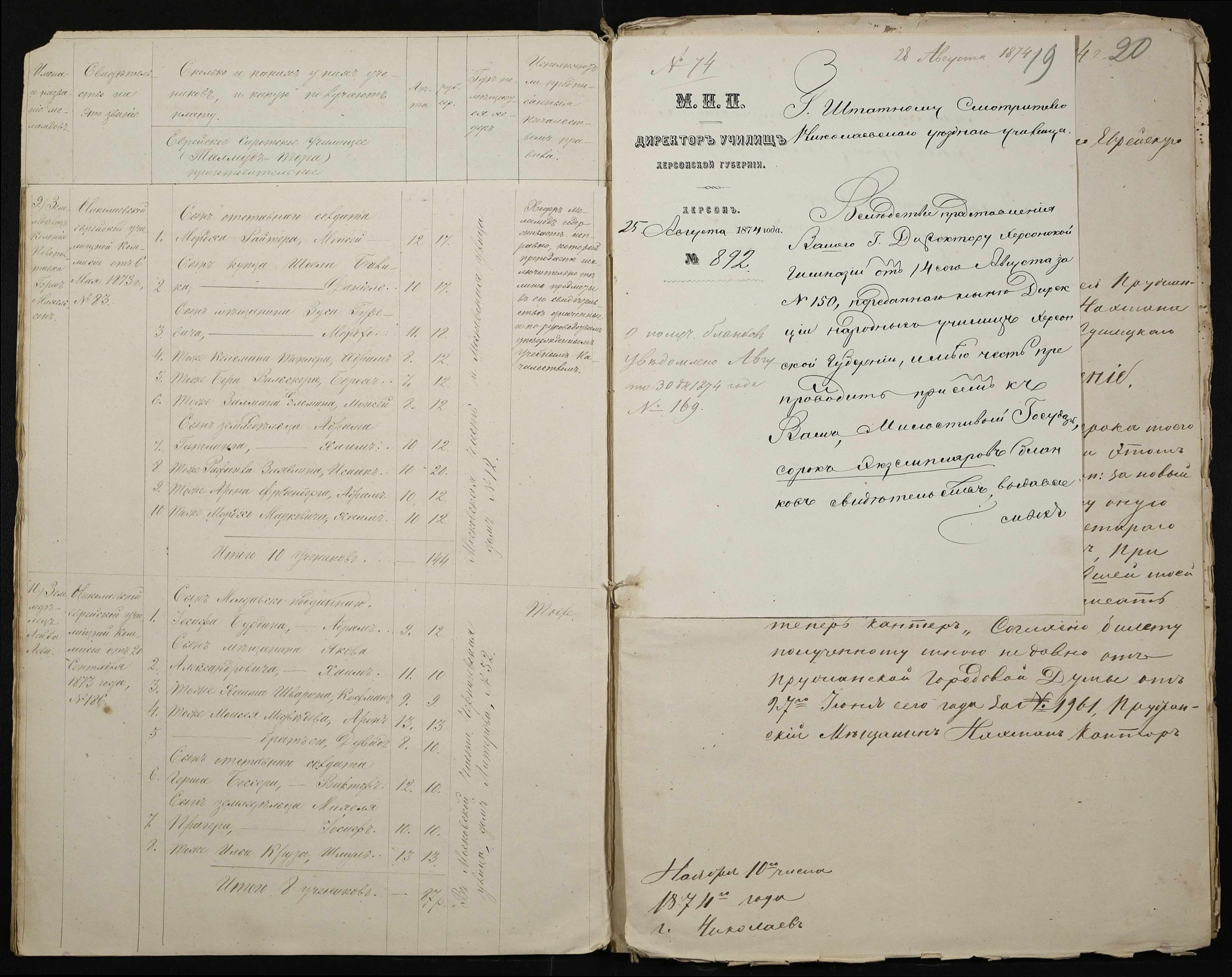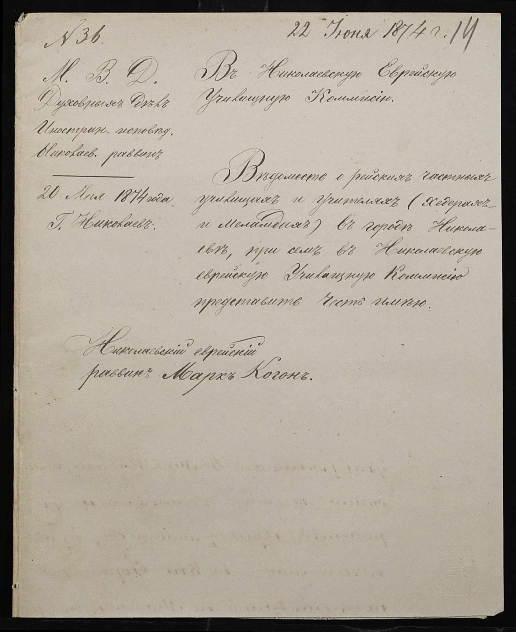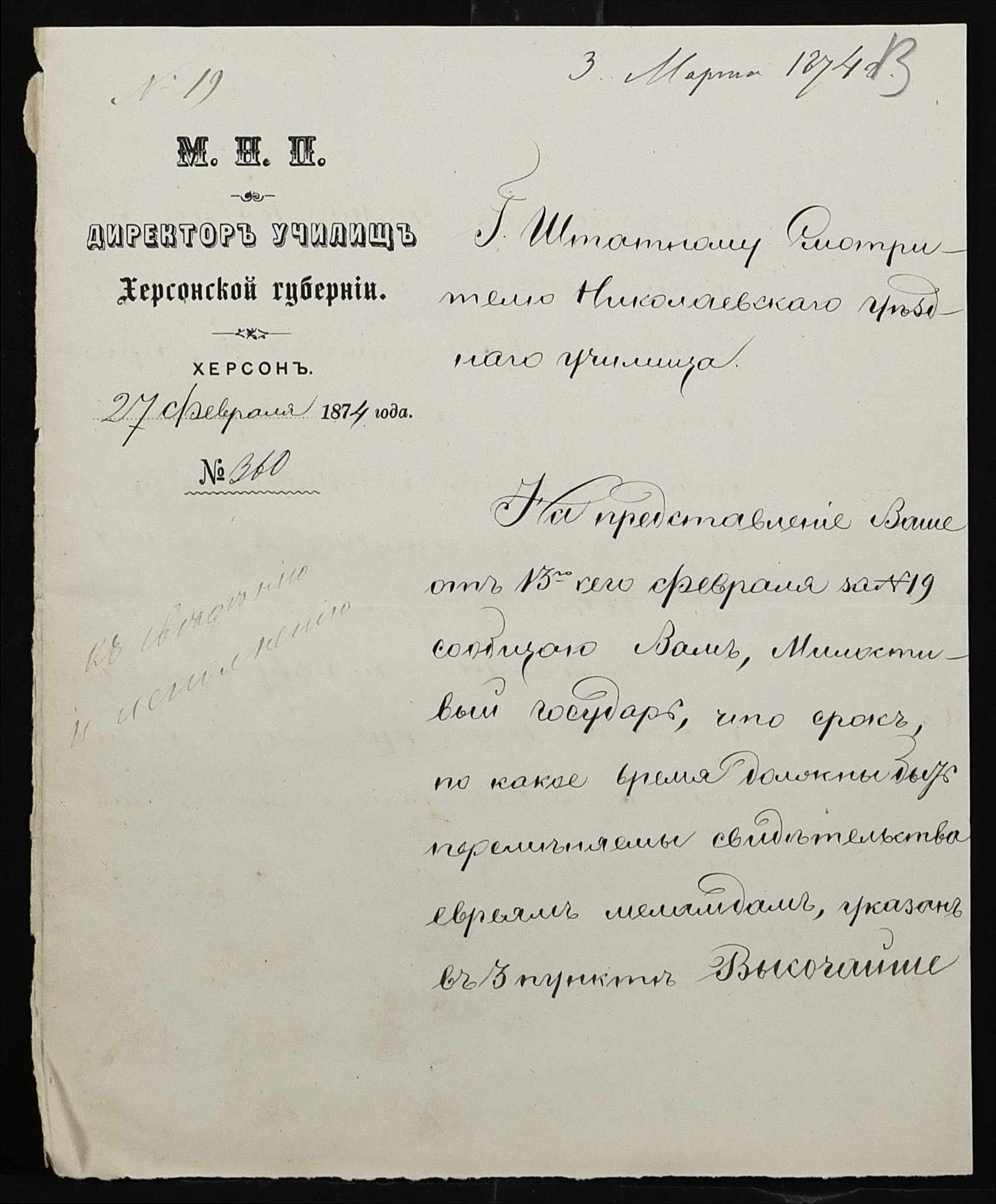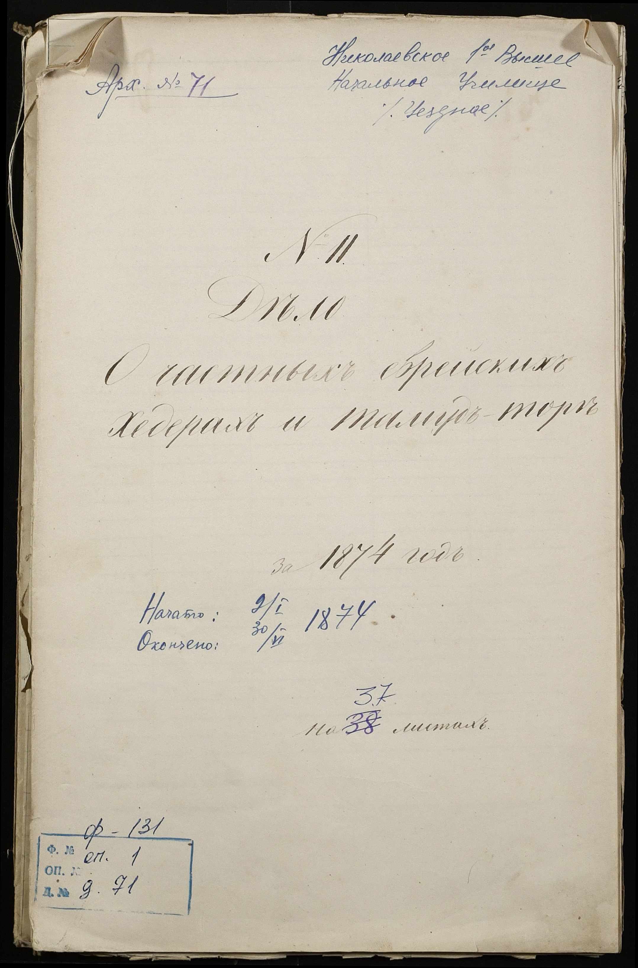 • • • • Справа № 71 “Відомості про наявність в Миколаєві приватних єврейських училищ і вчителів, екзаменаційний лист єврейського сиротинського училища, свідоцтва вчителів про дозвіл на викладання єврейської віри”