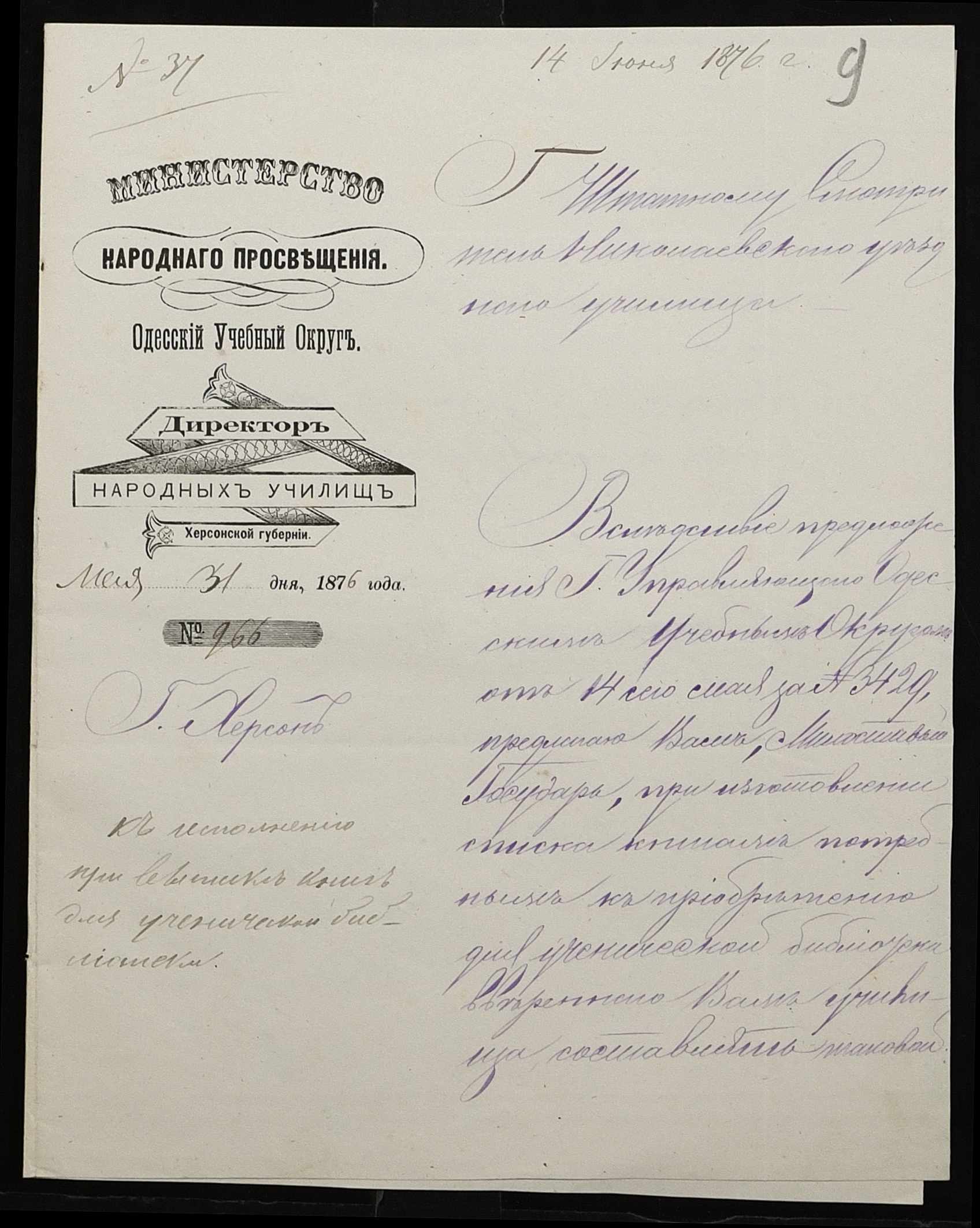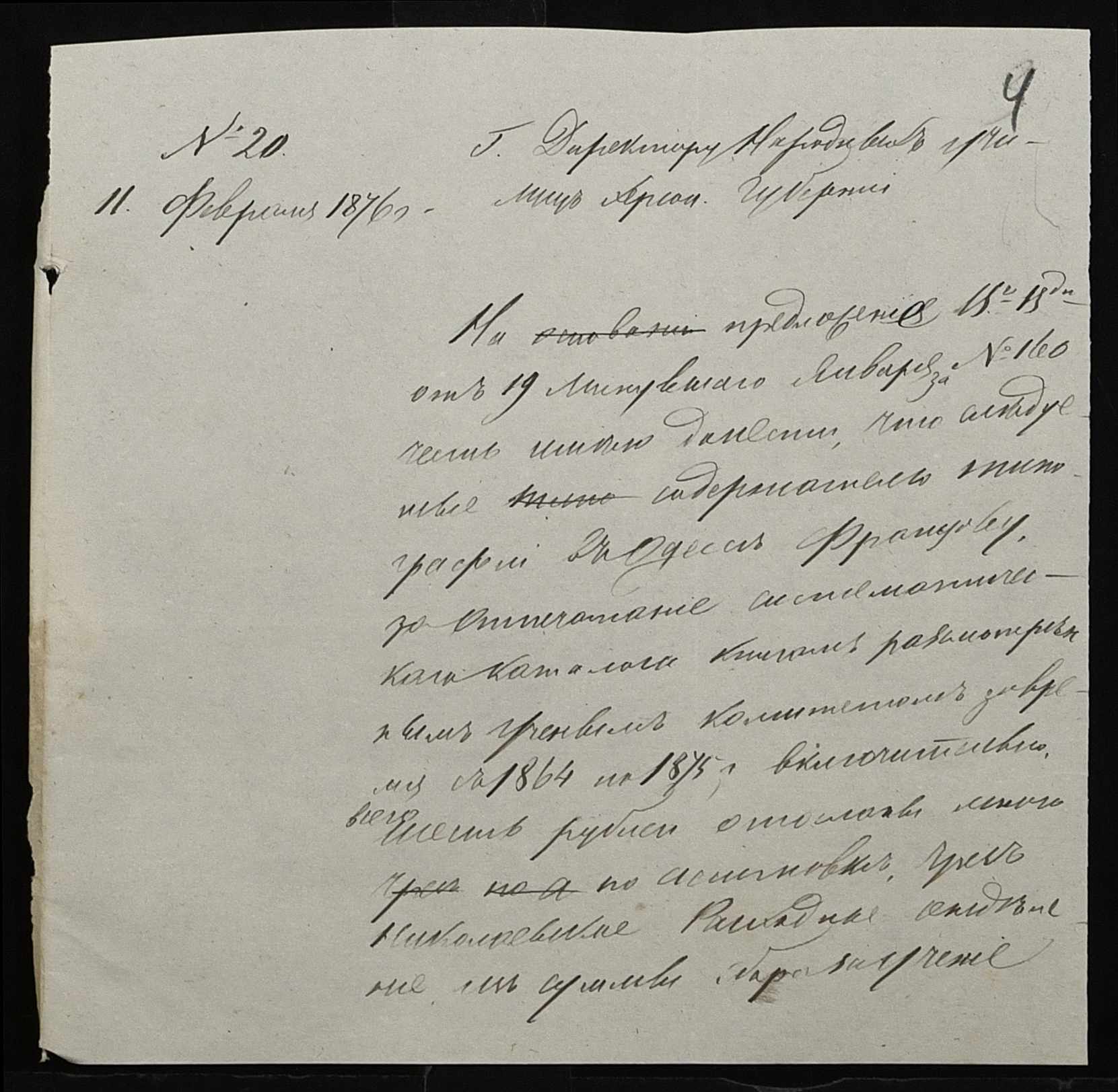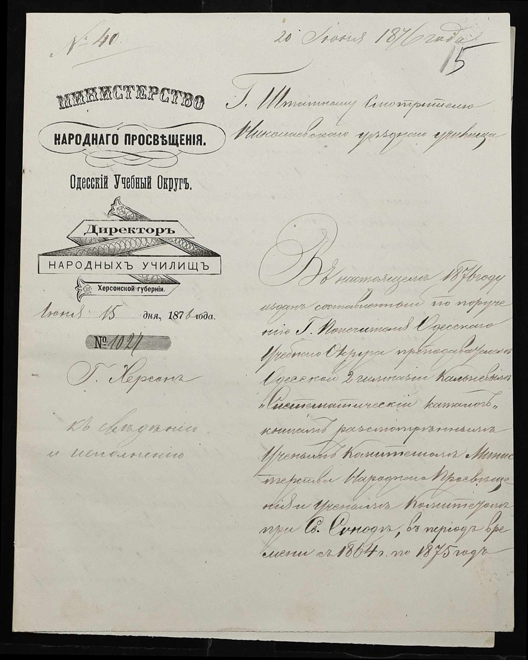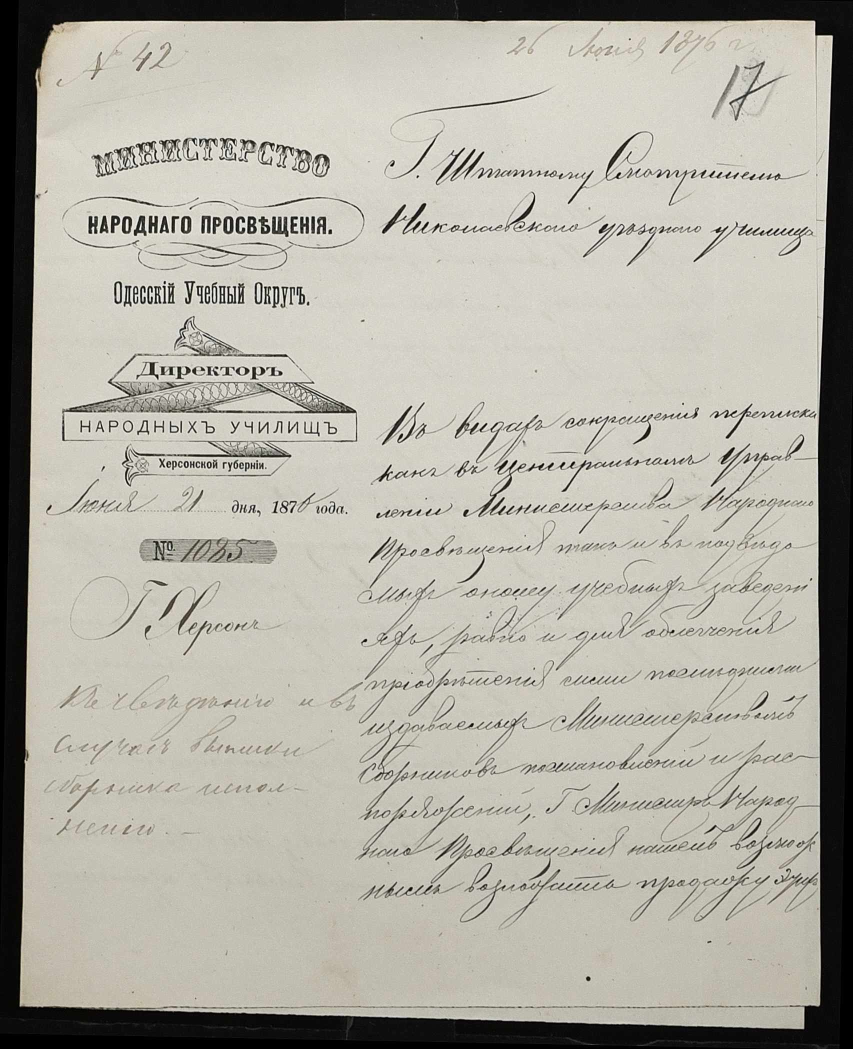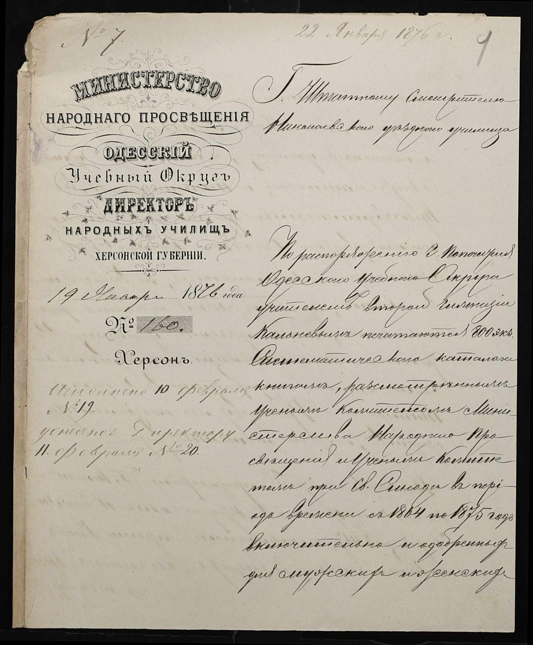 • • • • Справа № 95 “Листування з директором народних училищ про поповнення та формування бібліотеки повітового училища”