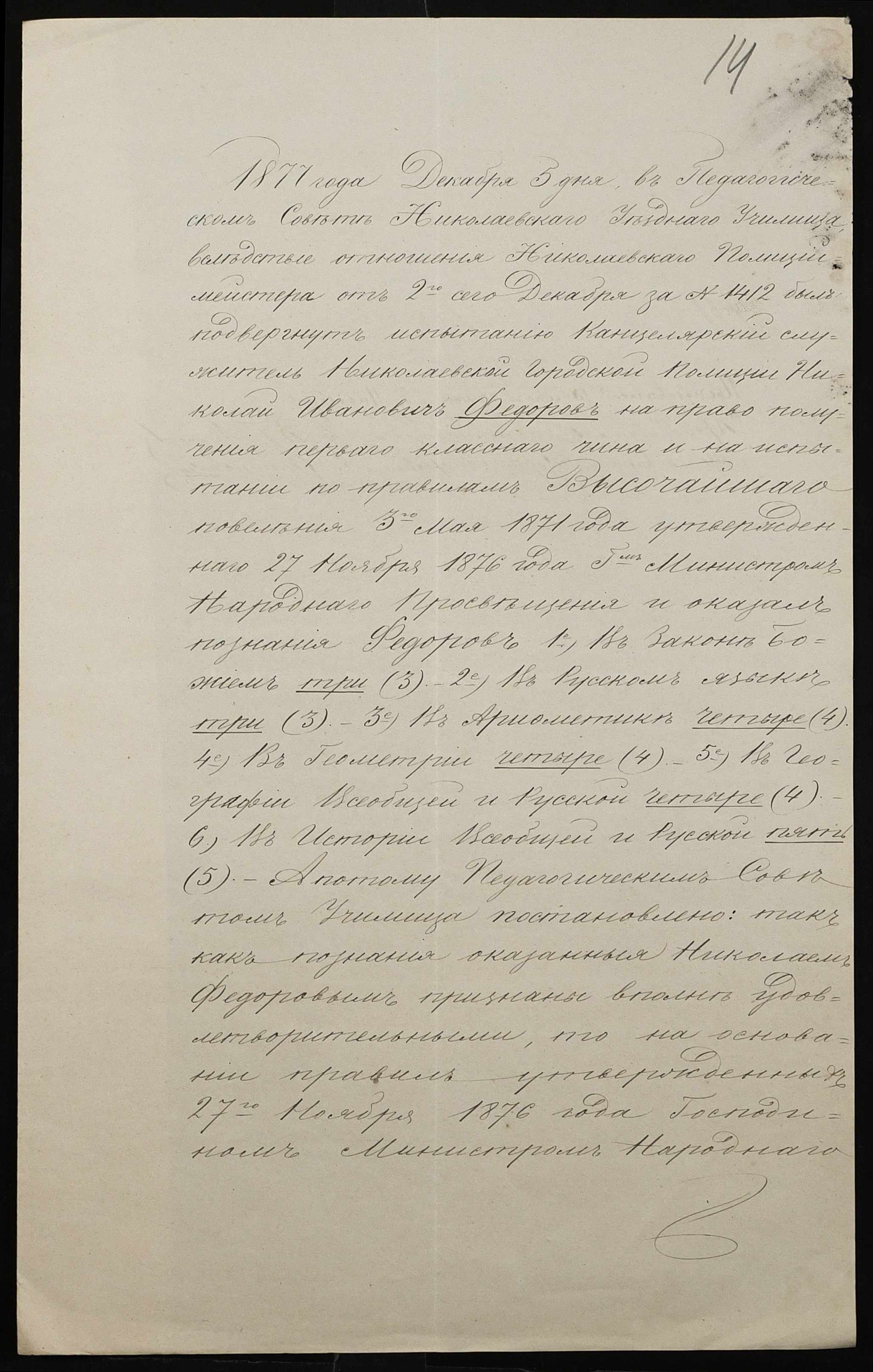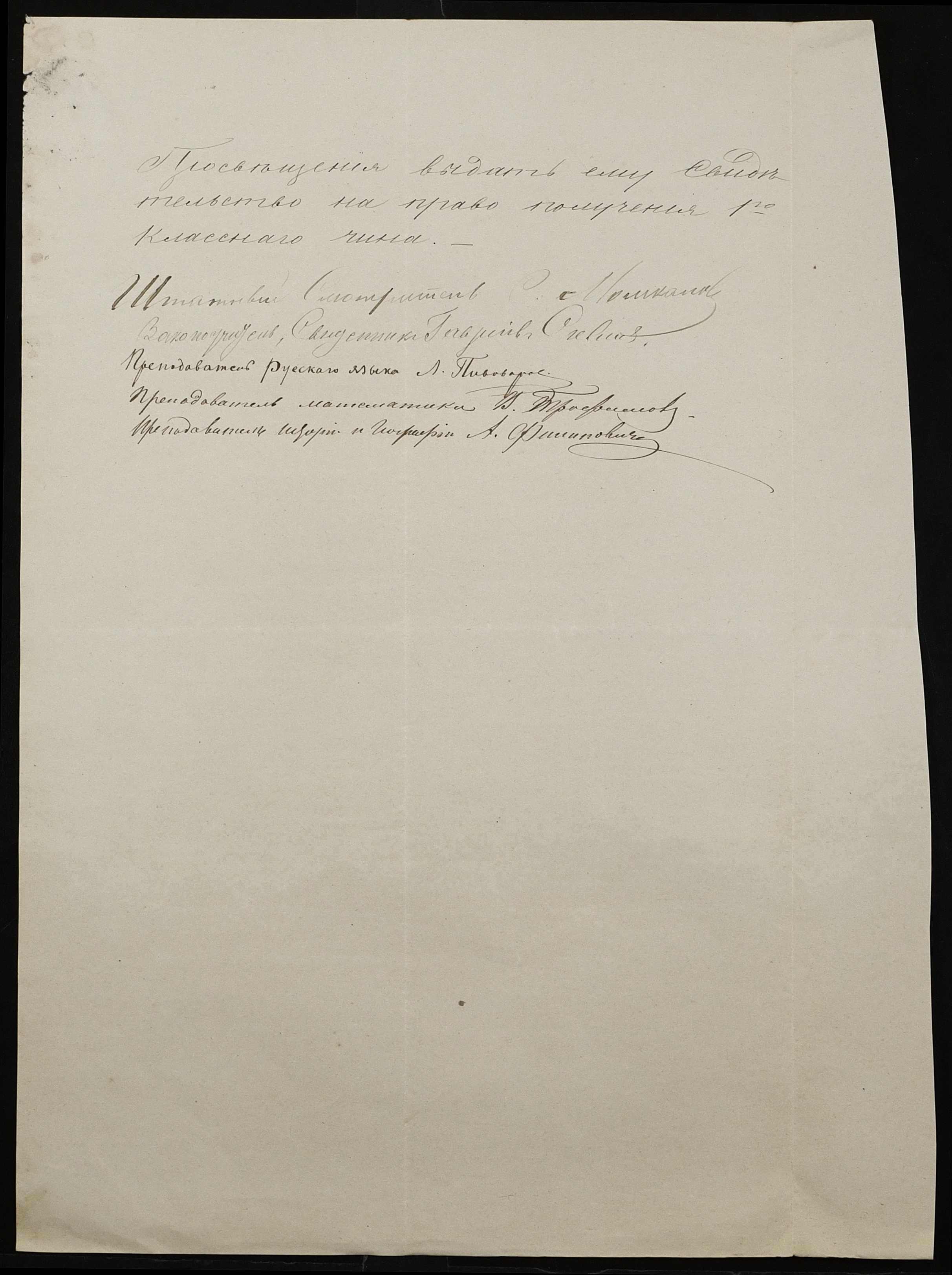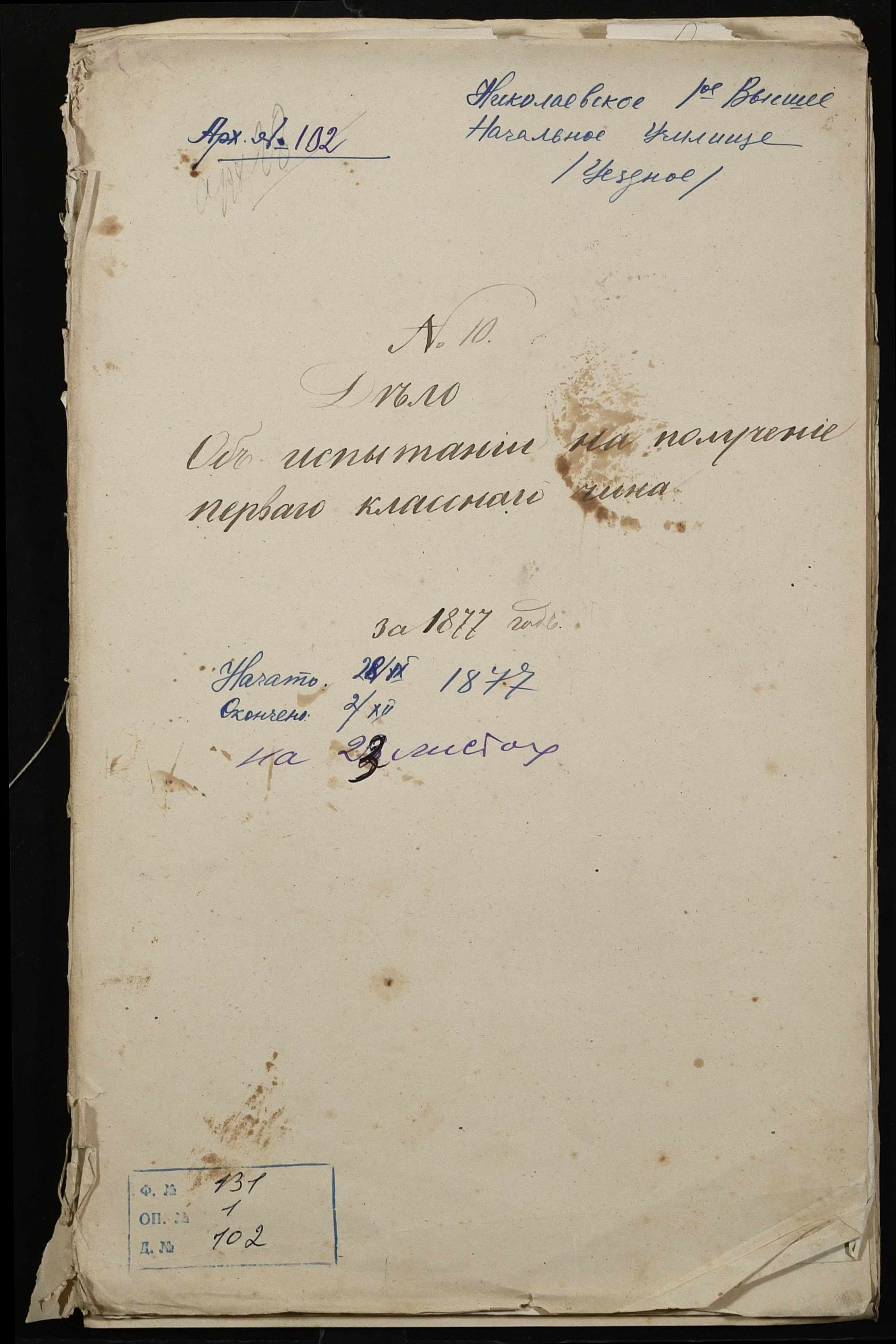 • • • • Справа № 102 “Справа про іспити і свідоцтва на отримання першого класного чина А. Стояновим (А. Стояновым), Н. Федоровим (Н. Федоровым), Є. Базилевичем (Е. Базилевичем) ”