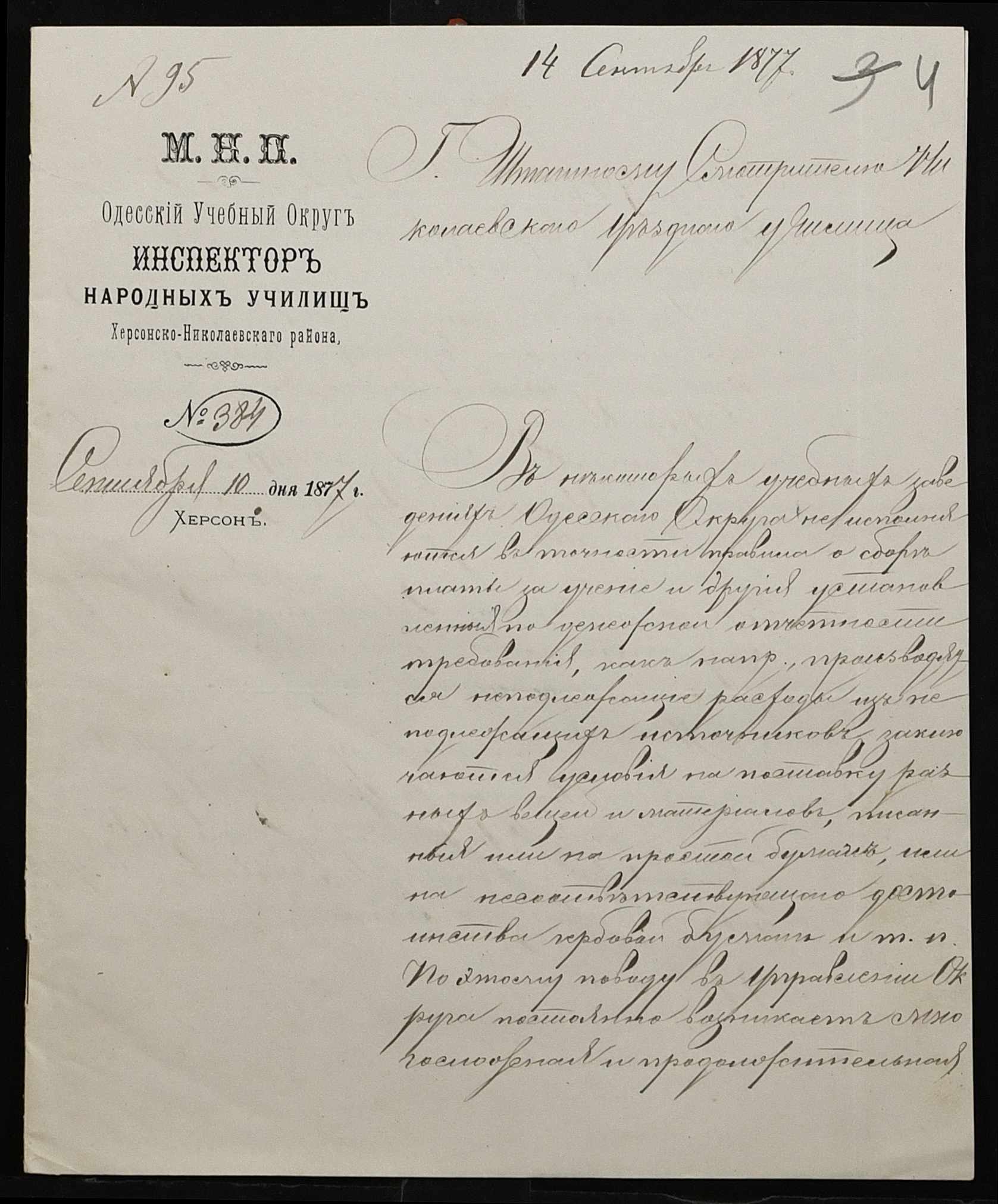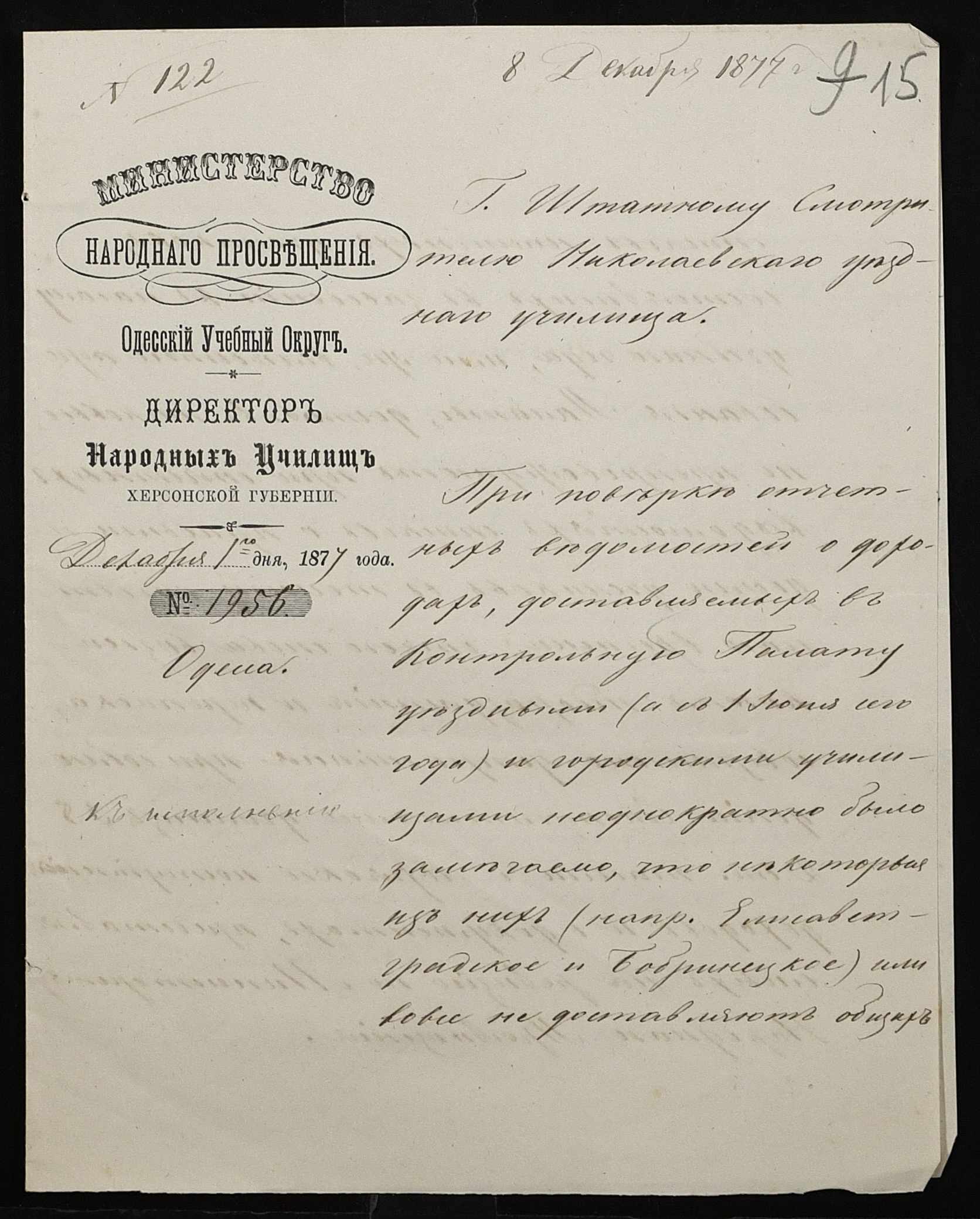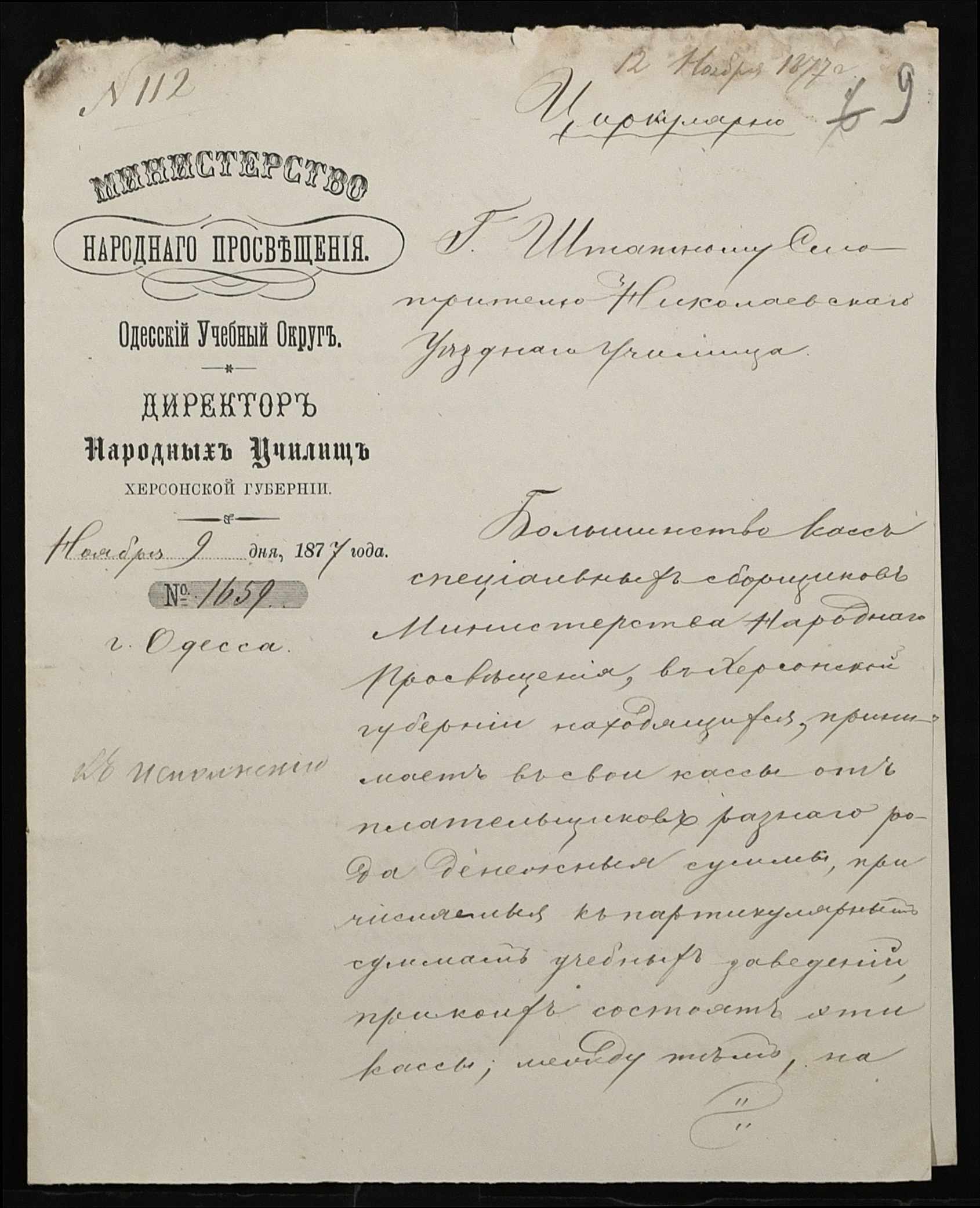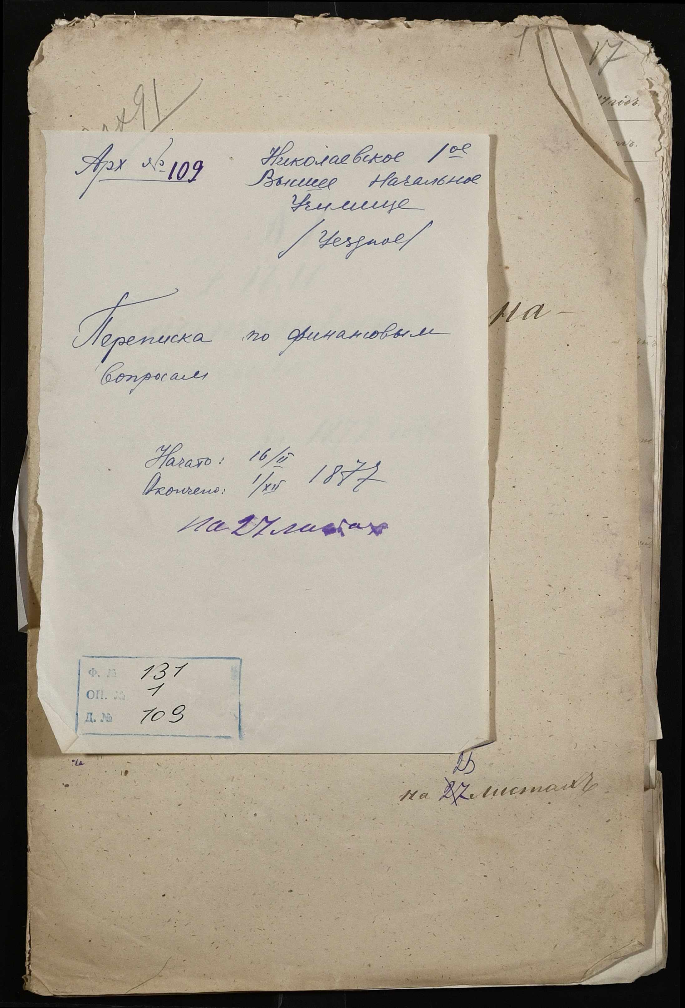 • • • • Справа № 109 “Переписка з директором народних училищ Херсонської губернії з фінансових питань; журнал реєстрації вхідних документів за 1877 рік ”