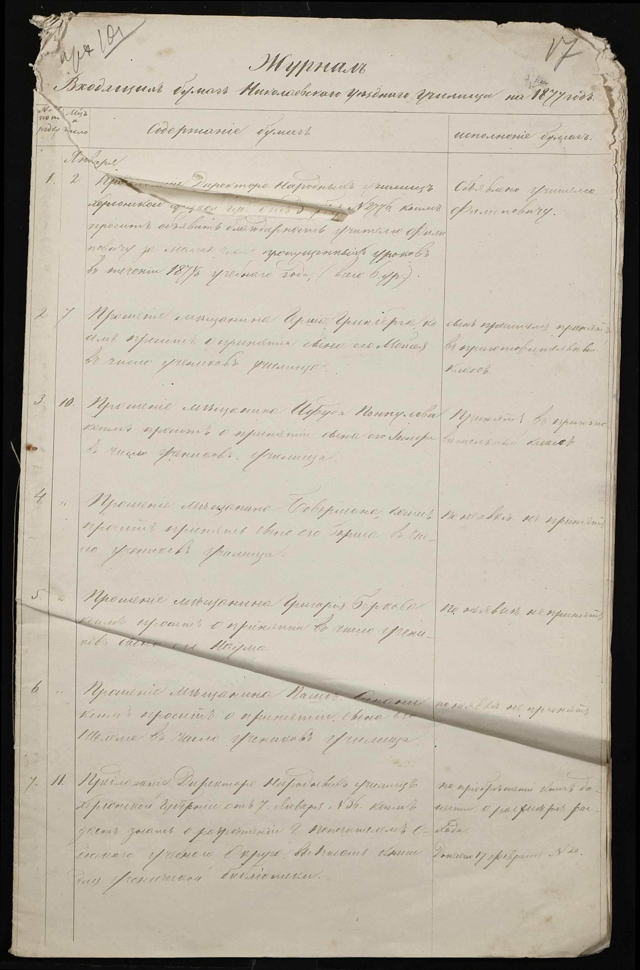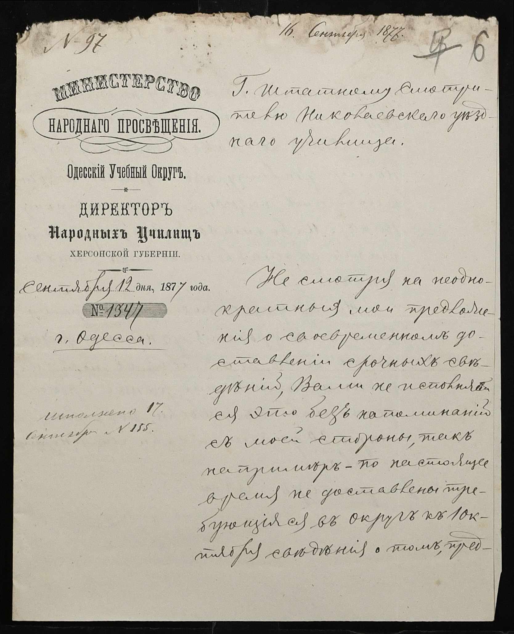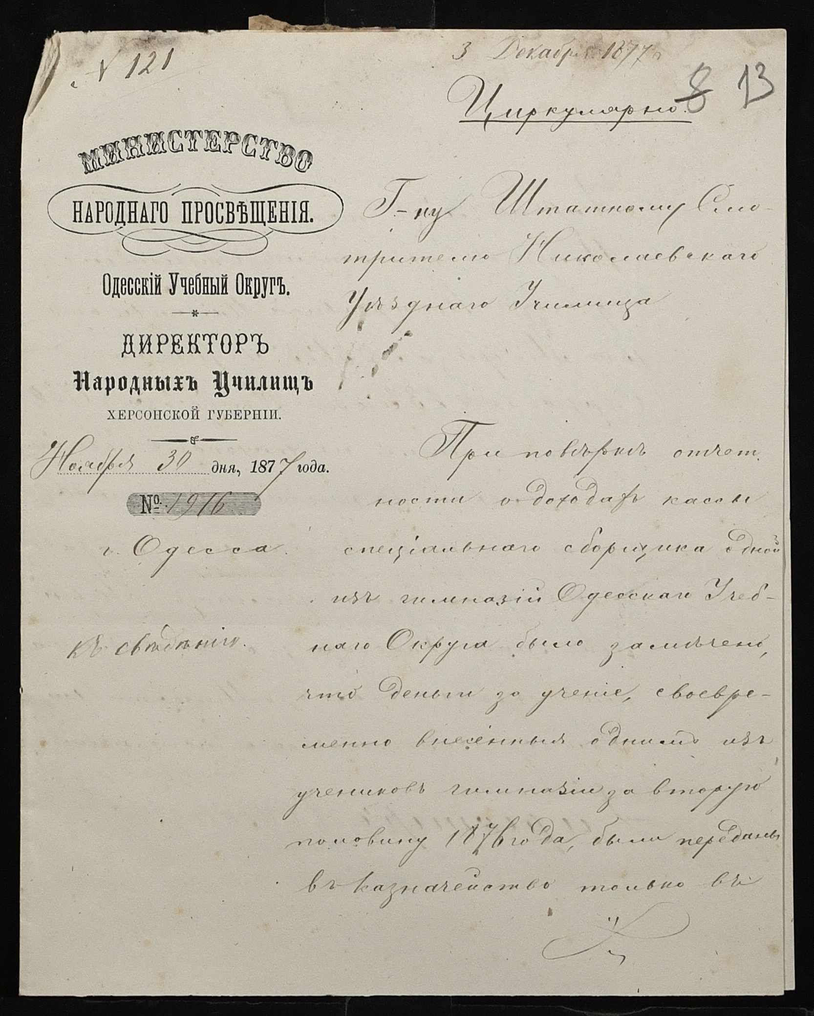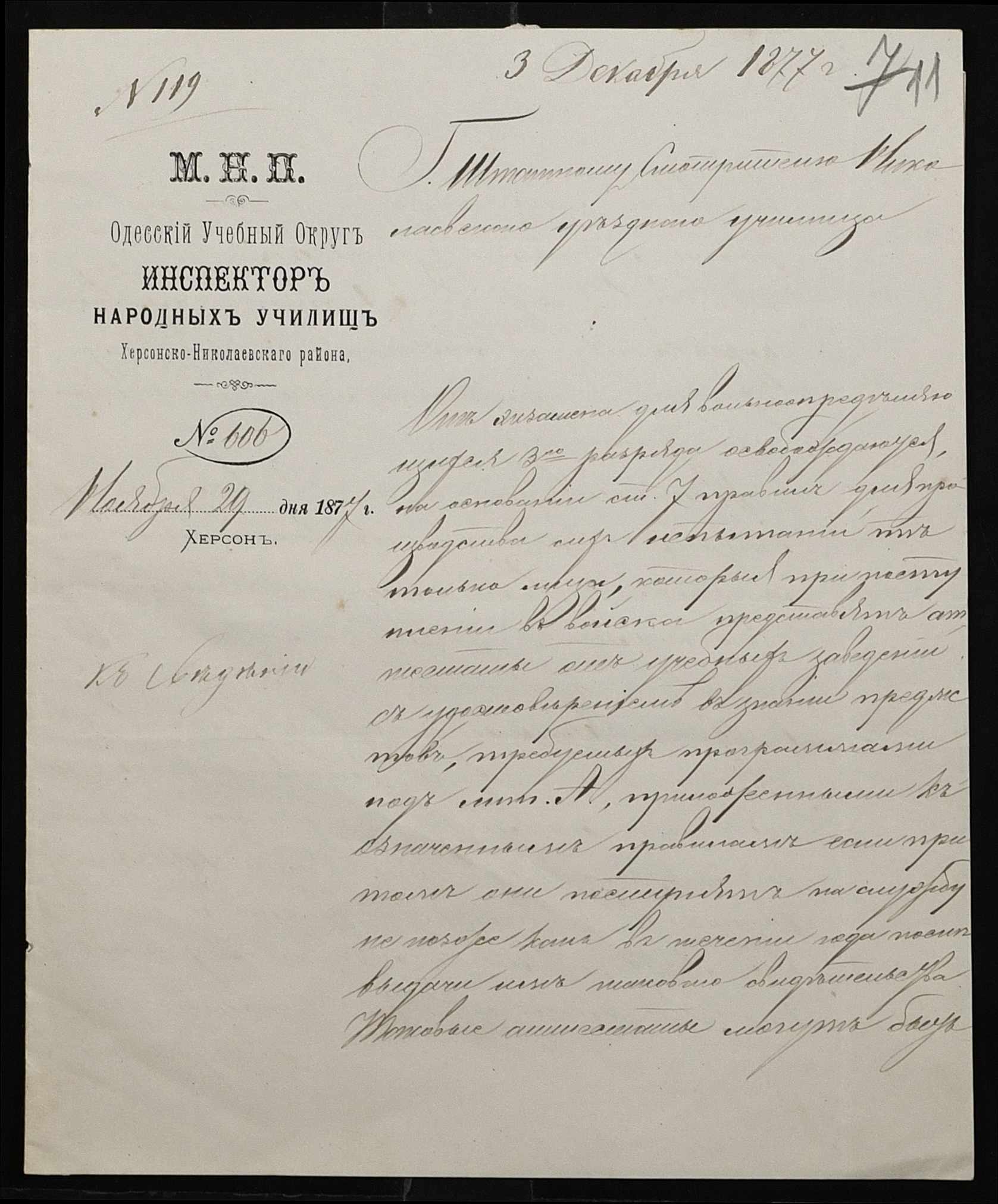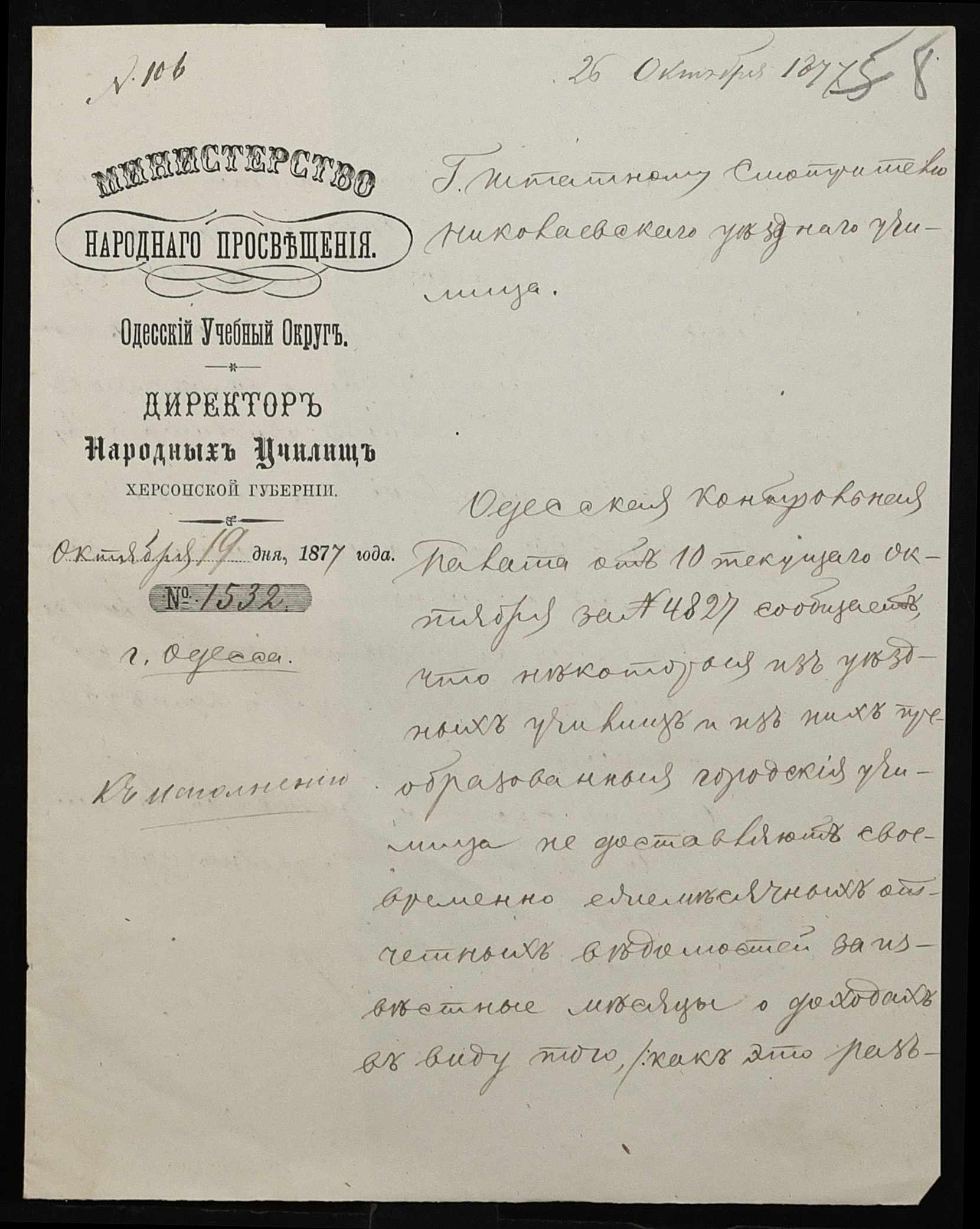 • • • • Справа № 109 “Переписка з директором народних училищ Херсонської губернії з фінансових питань; журнал реєстрації вхідних документів за 1877 рік ”