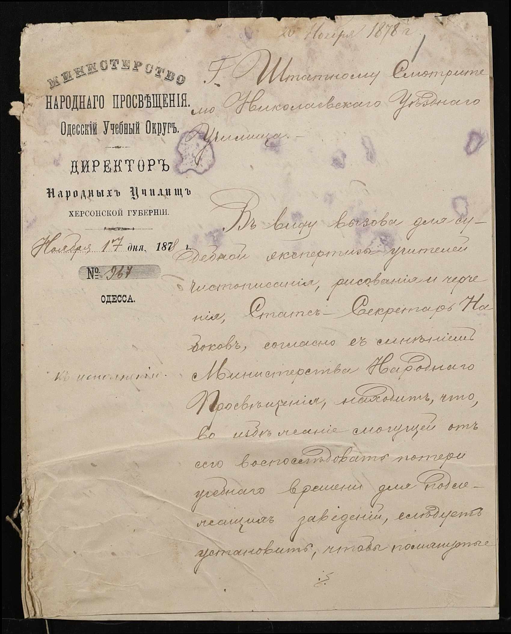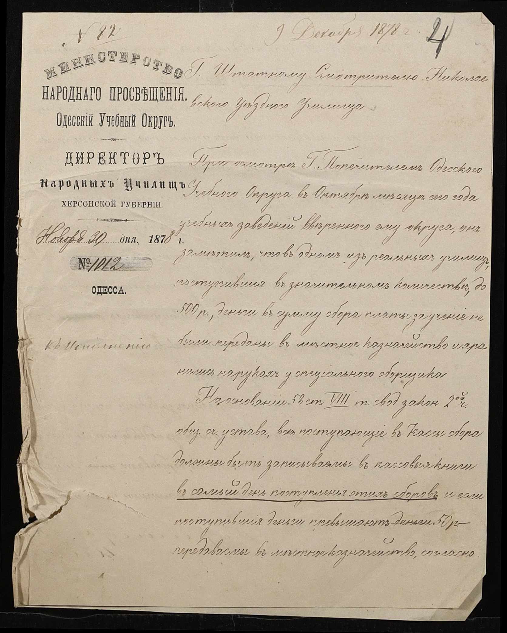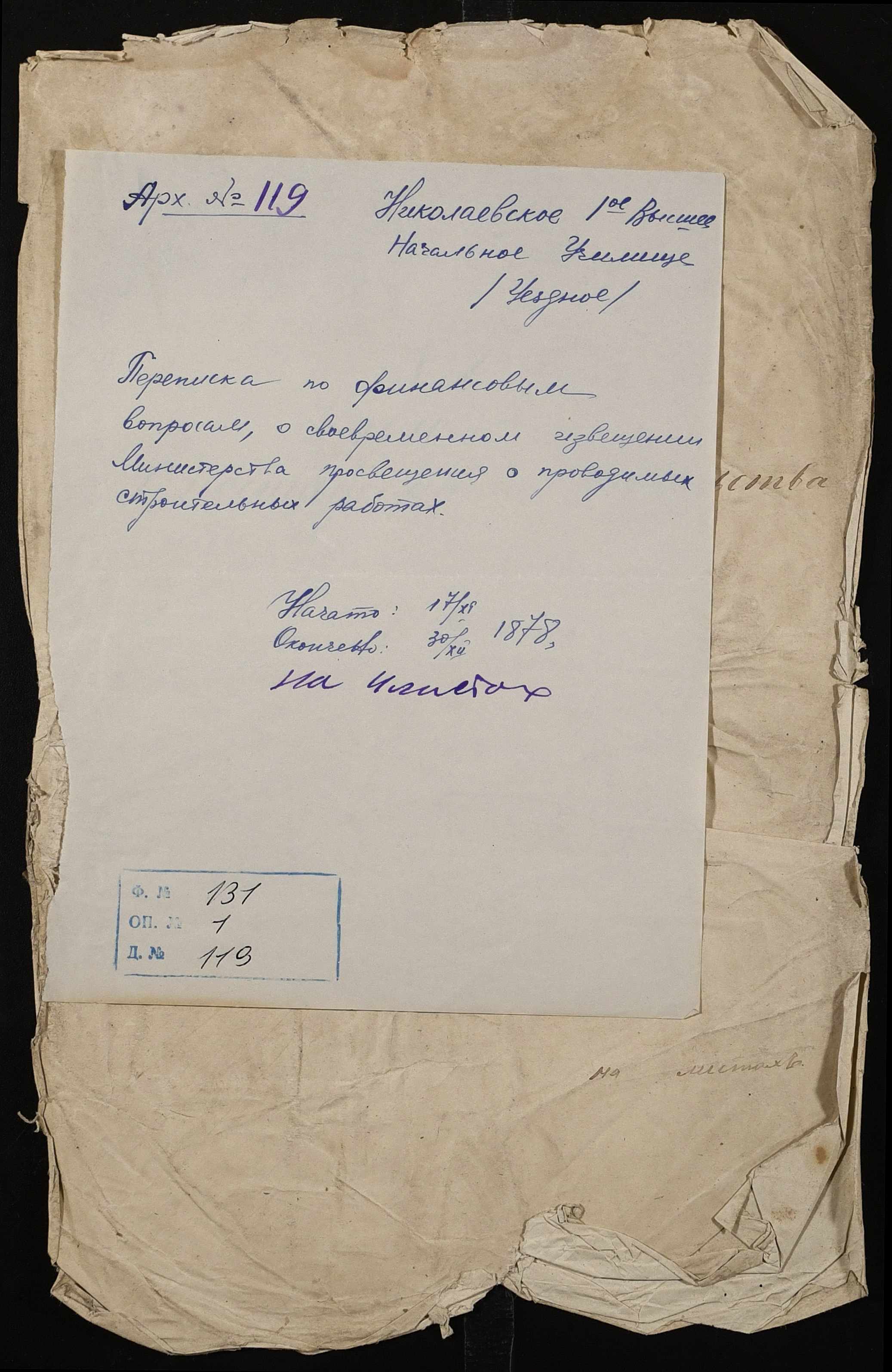 • • • • Справа № 119 “Листування з директором народних училищ Херсонської губернії з фінансових питань, про проведення будівельних робіт в училищі”
