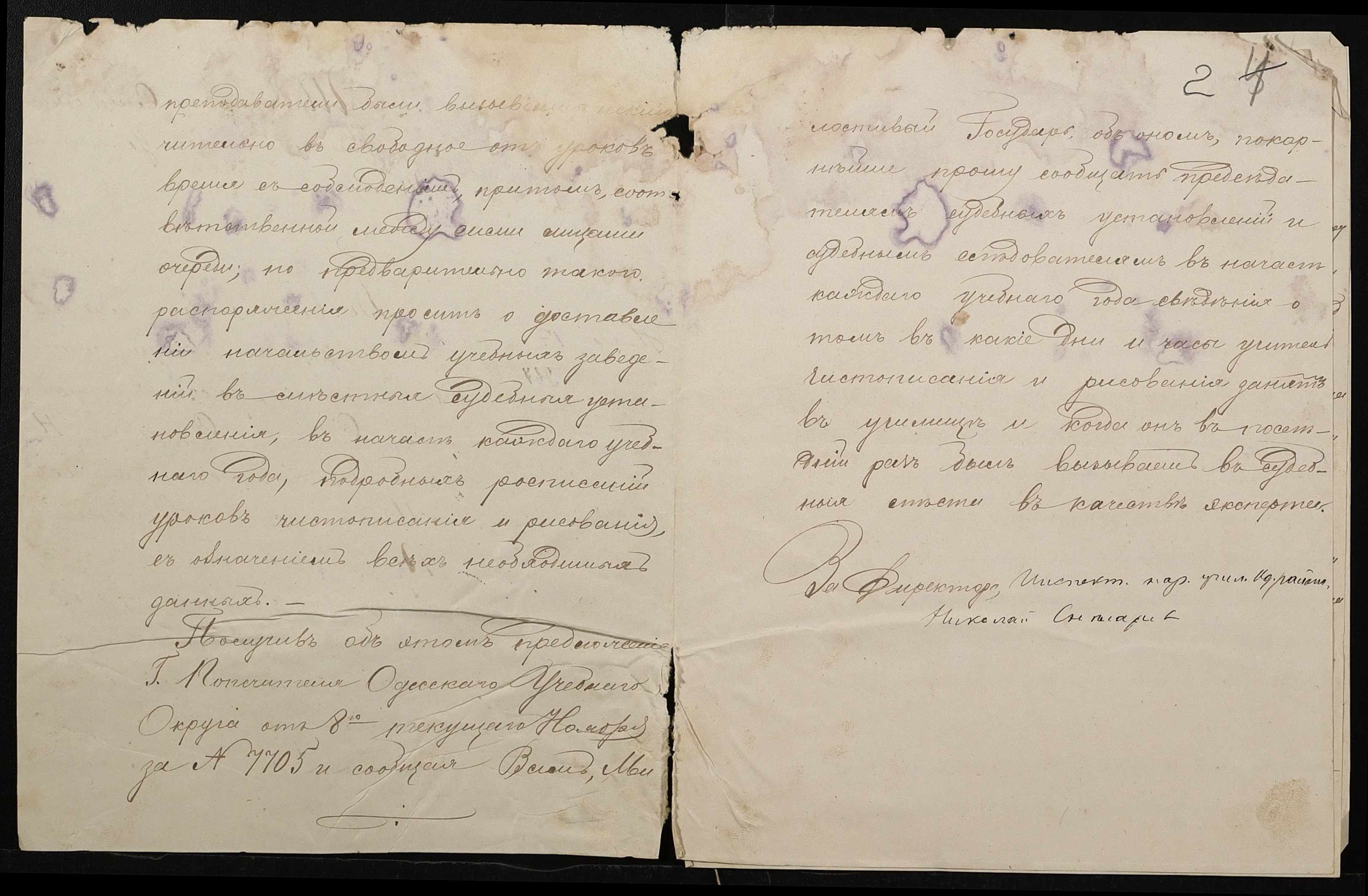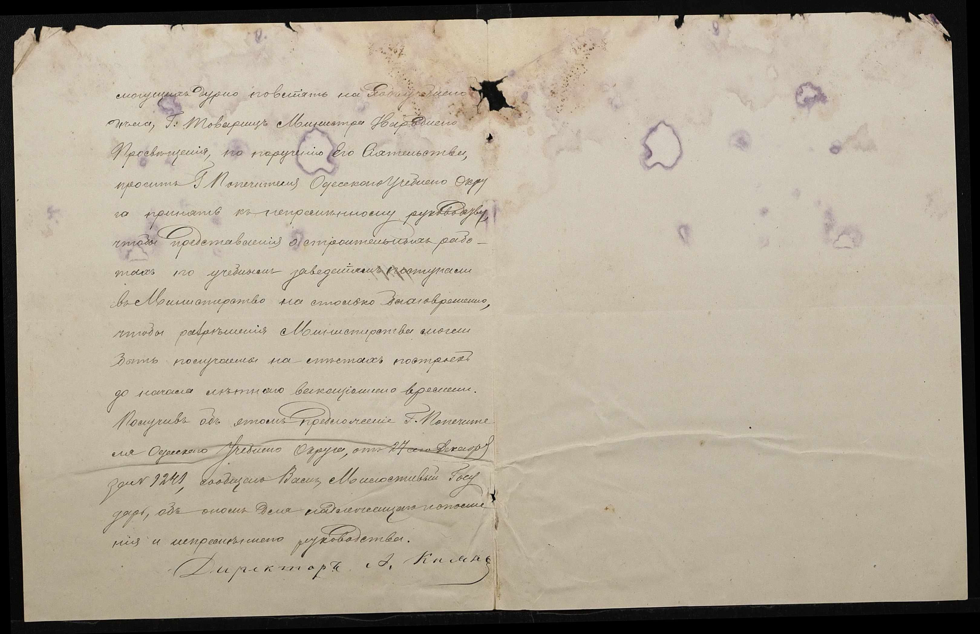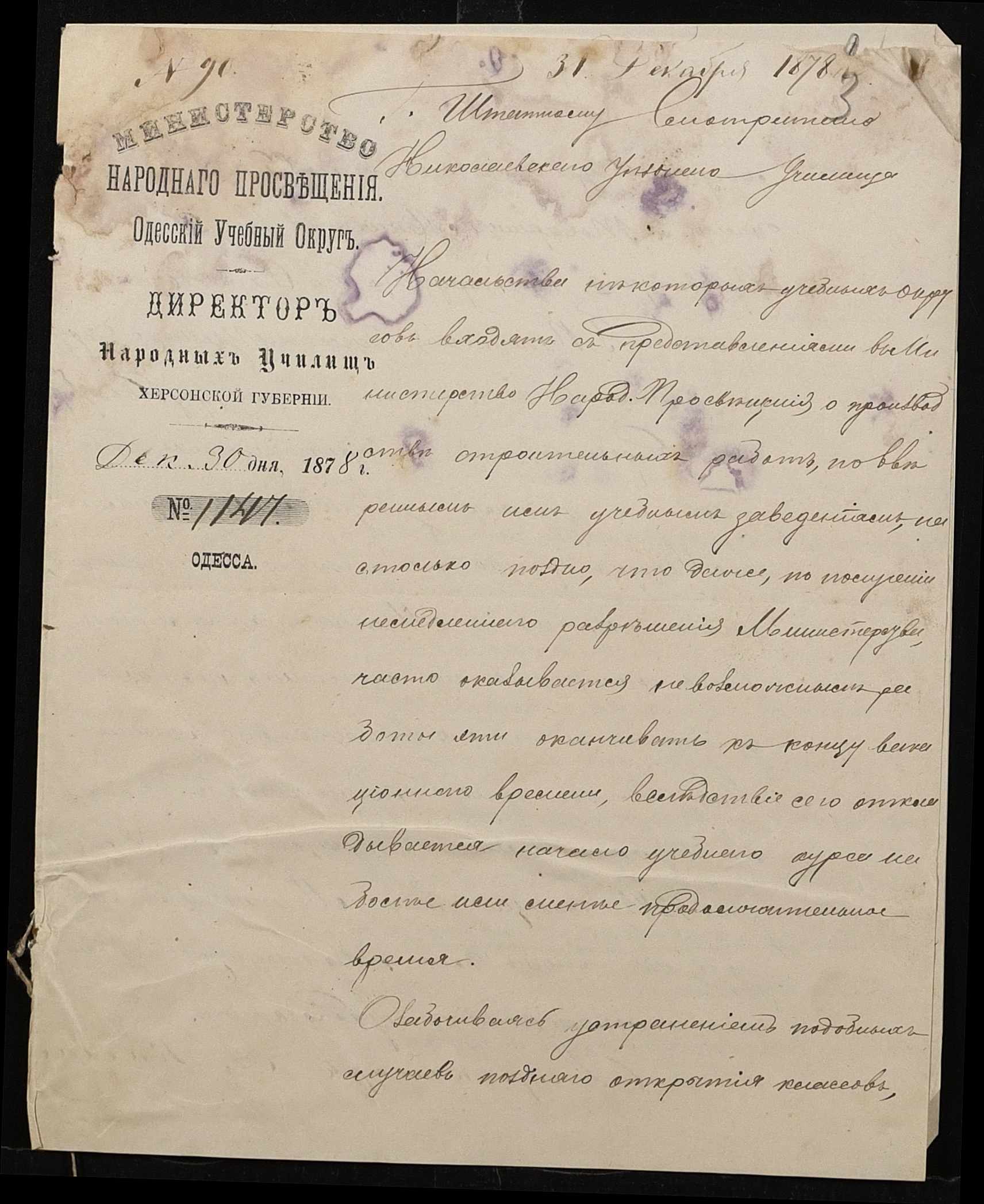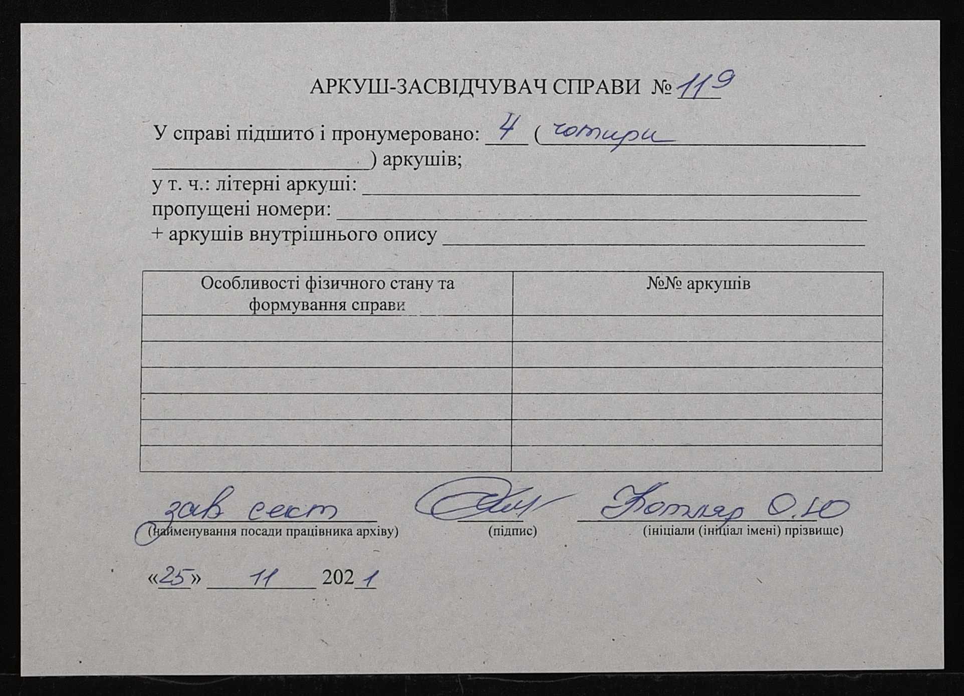 • • • • Справа № 119 “Листування з директором народних училищ Херсонської губернії з фінансових питань, про проведення будівельних робіт в училищі”