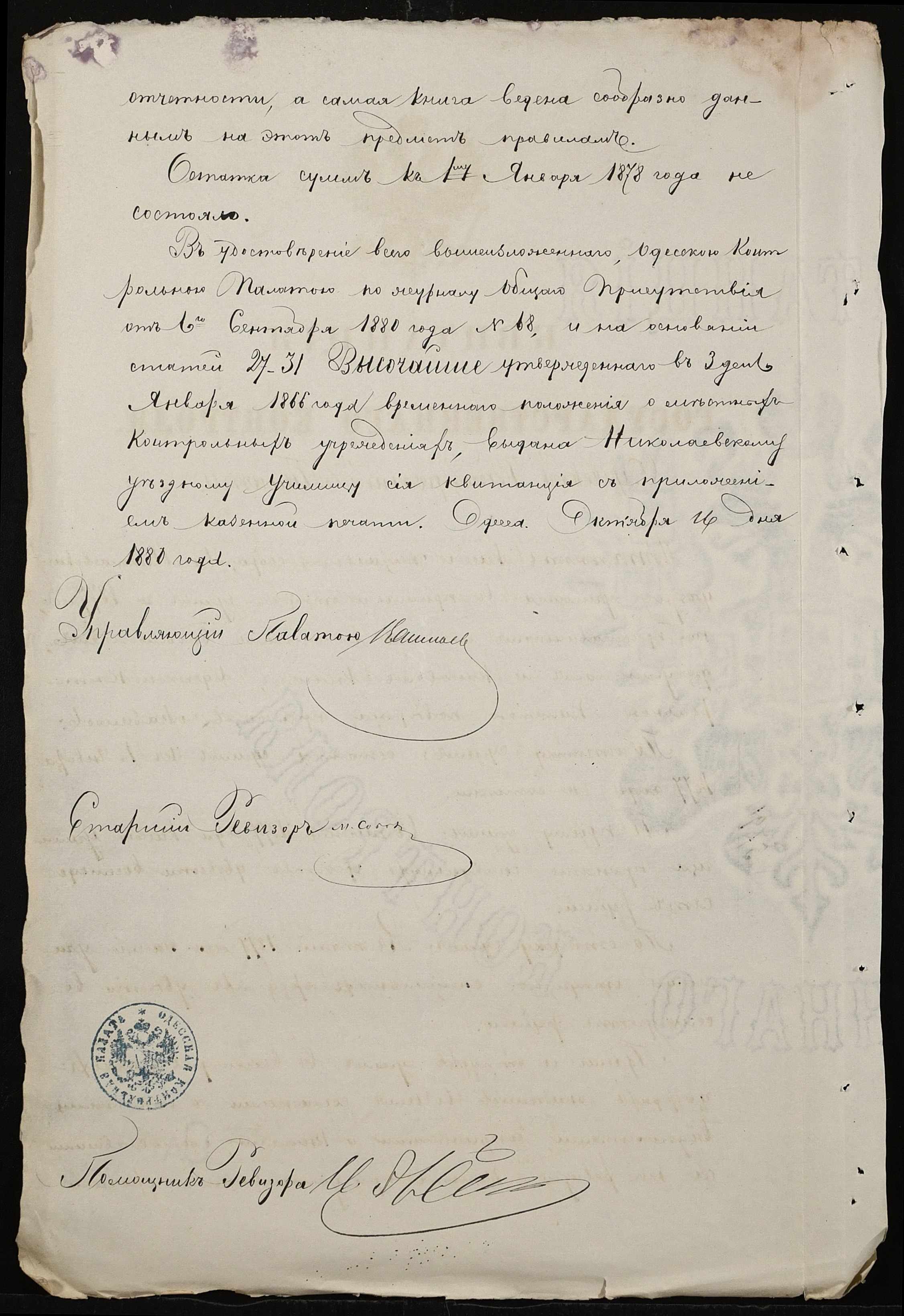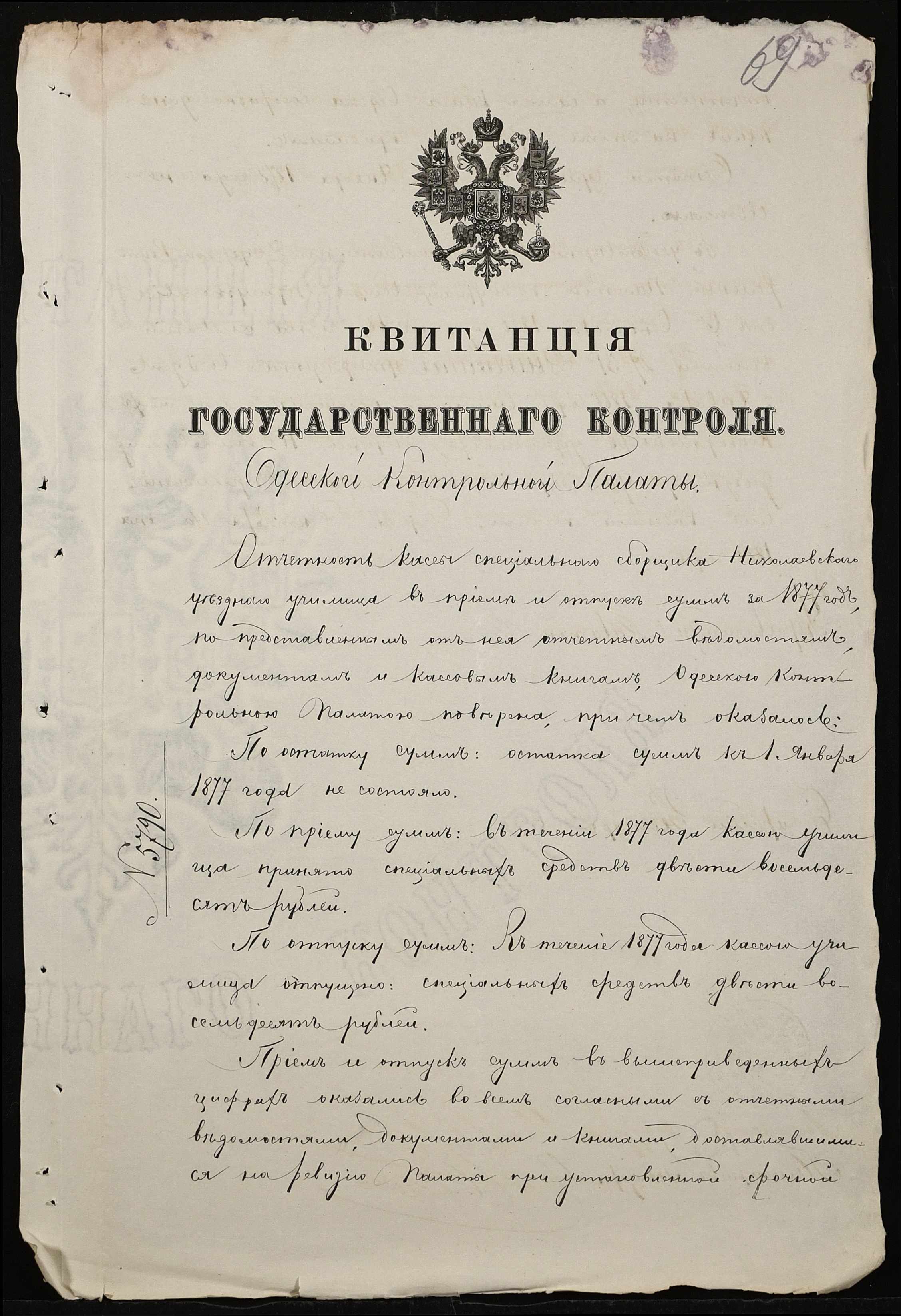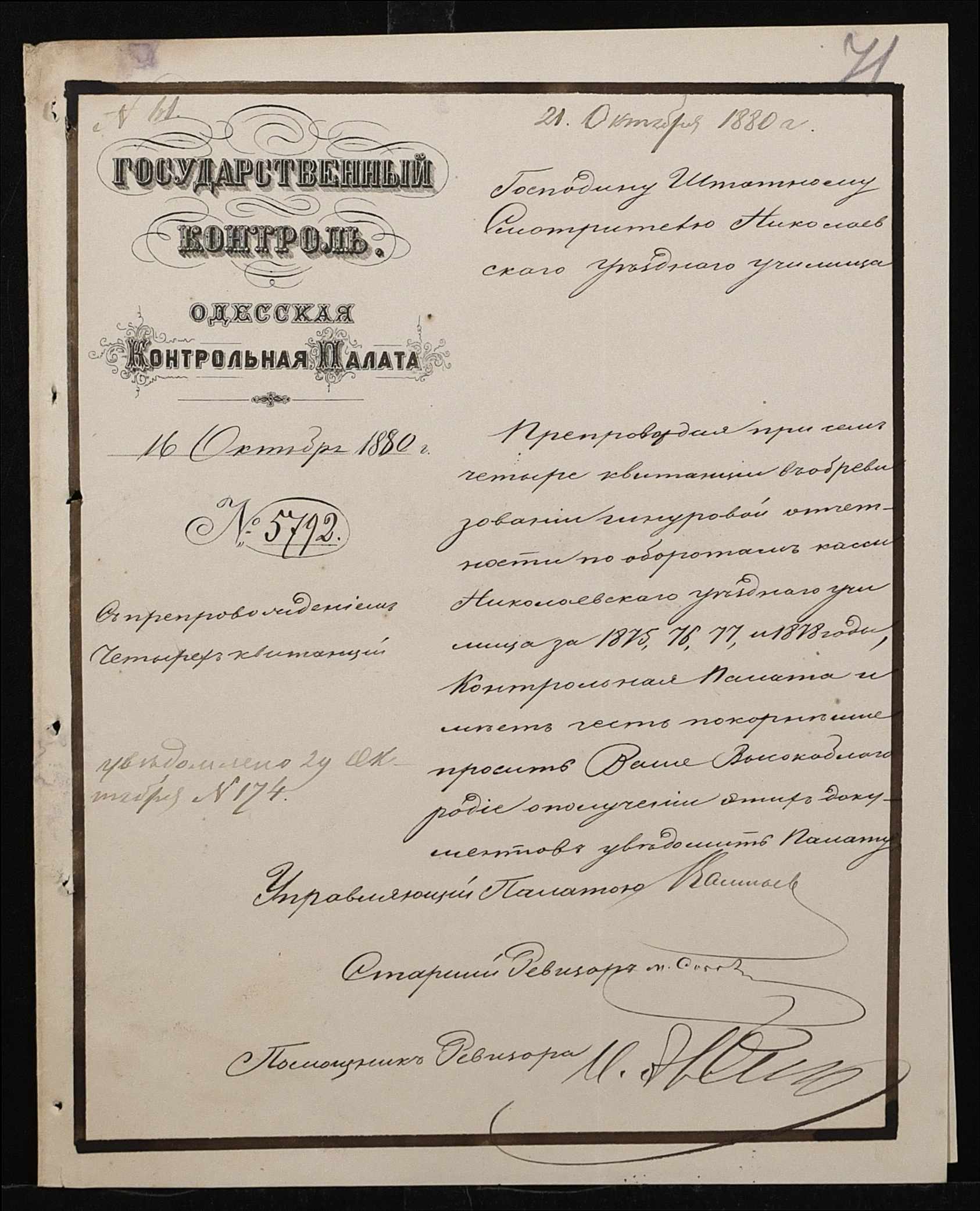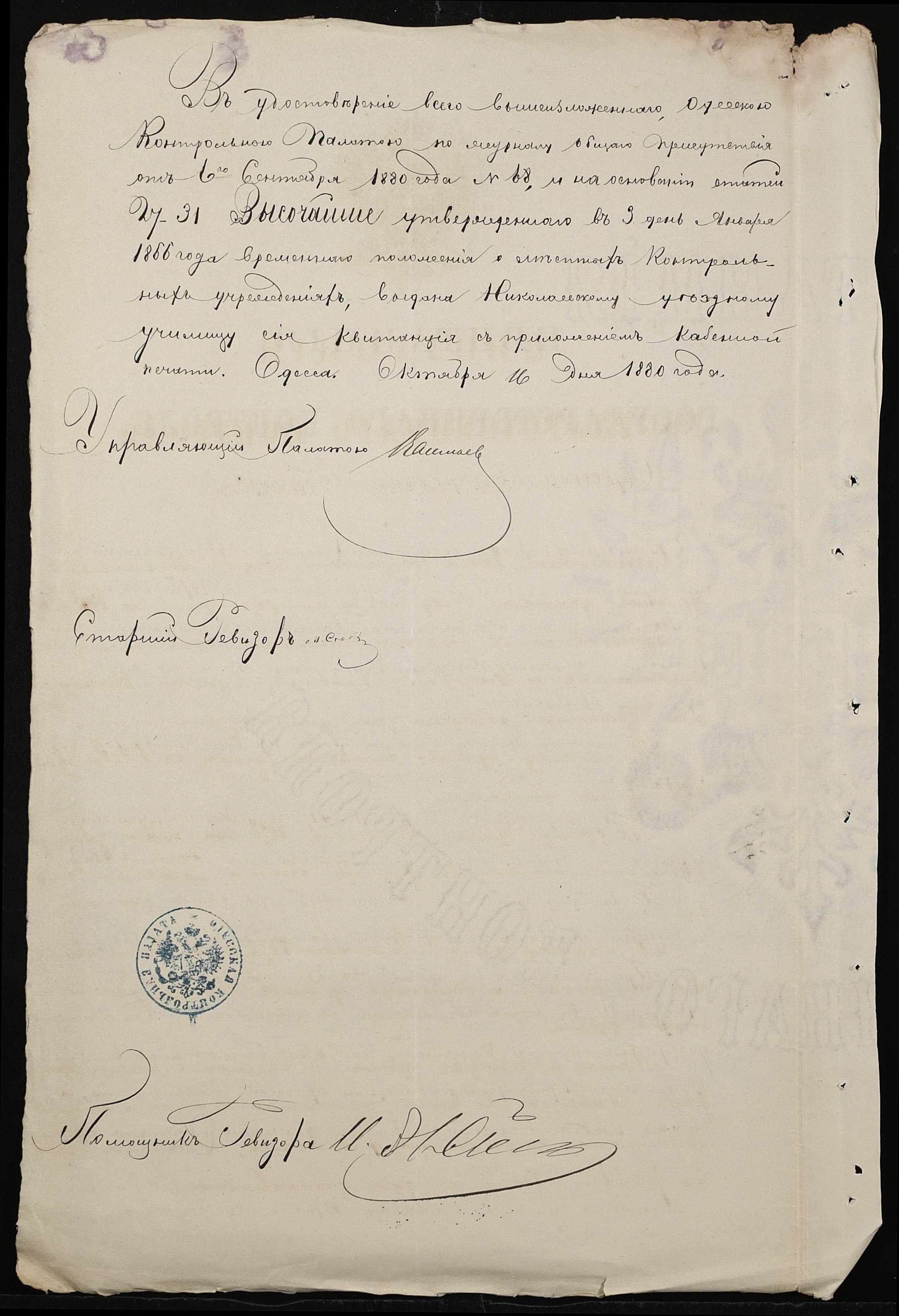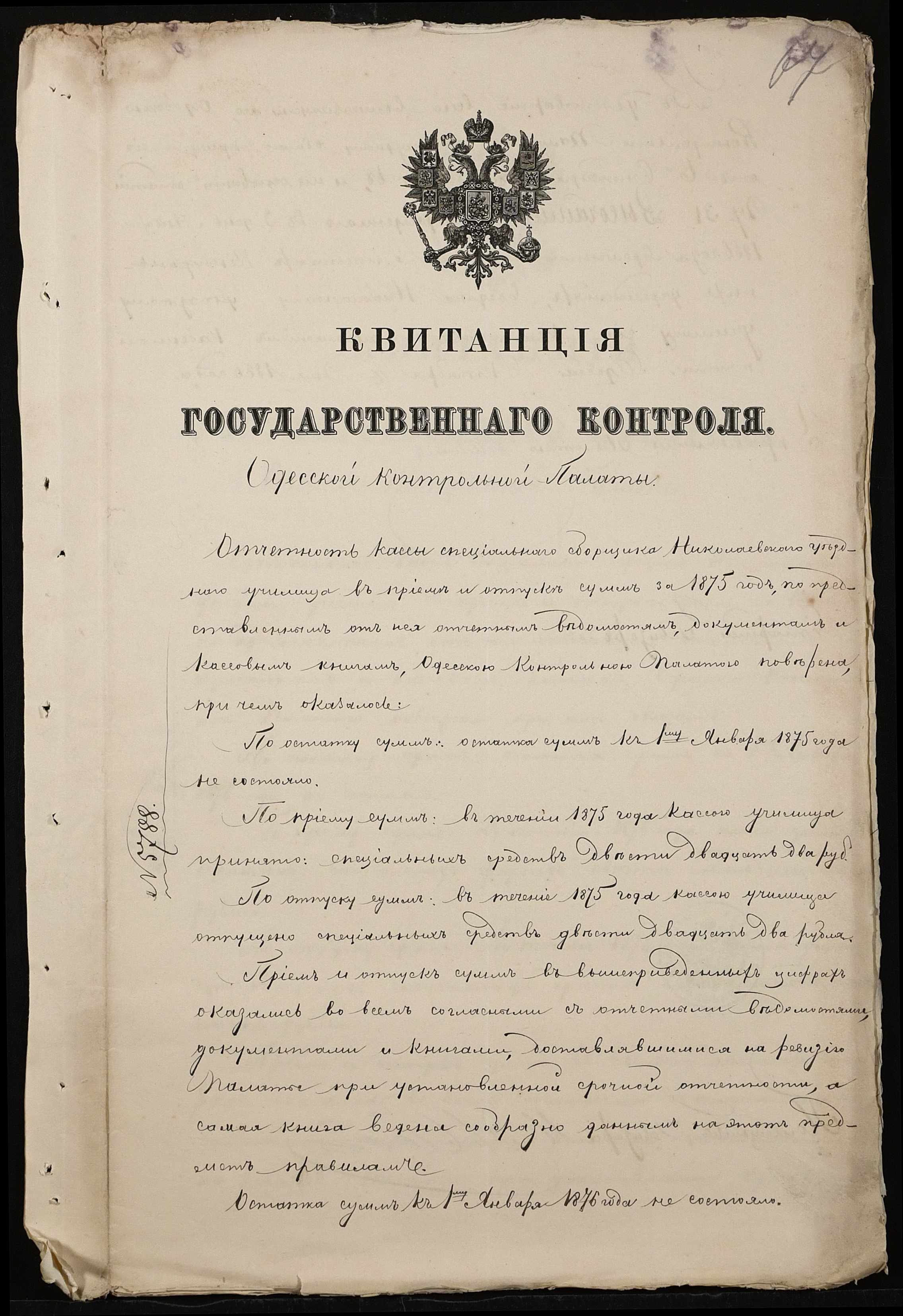 • • • • Справа № 137 “Листування з фінансових питань; квитанції державного контролю Одеської контрольної палати; списки учнів та вчителів”