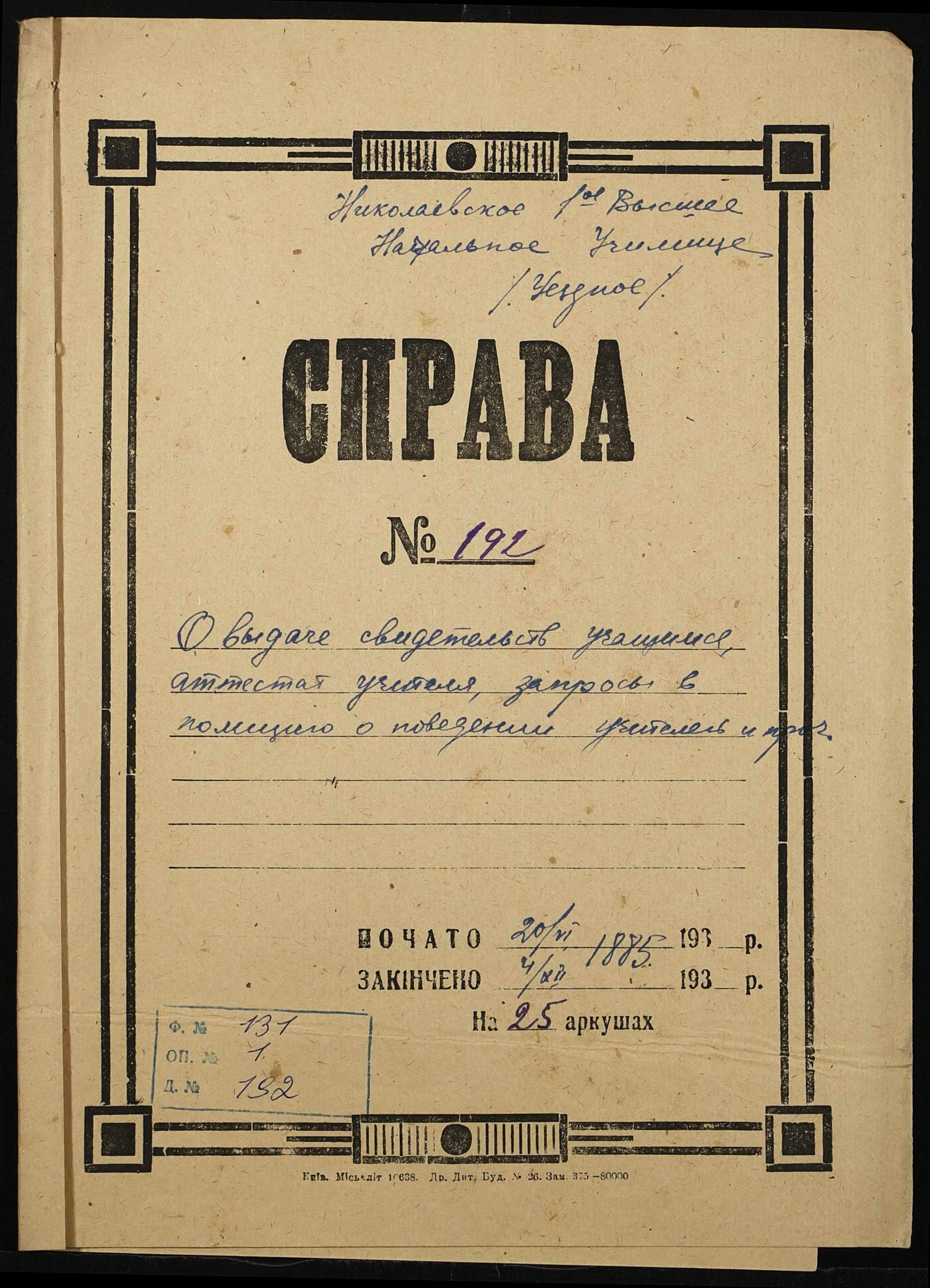 Фонд 131 / Опис 1 / Справа 192