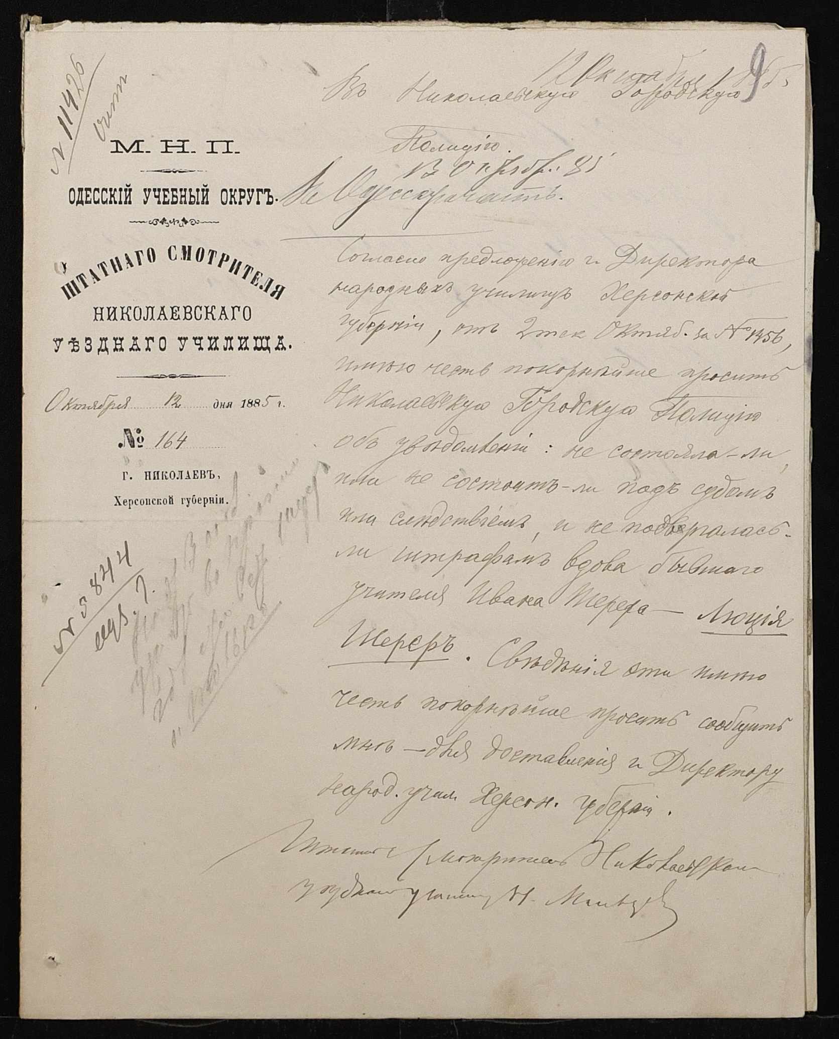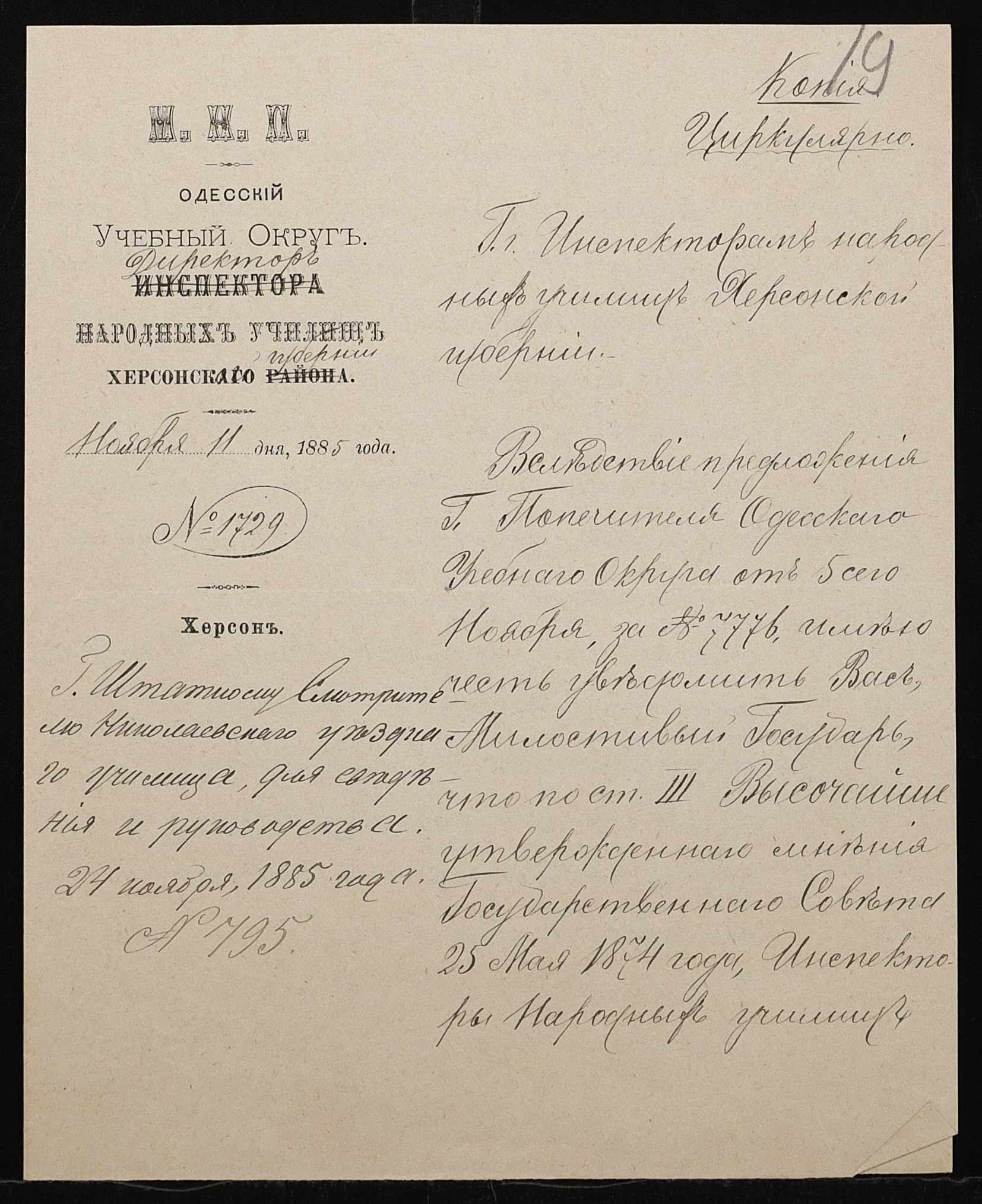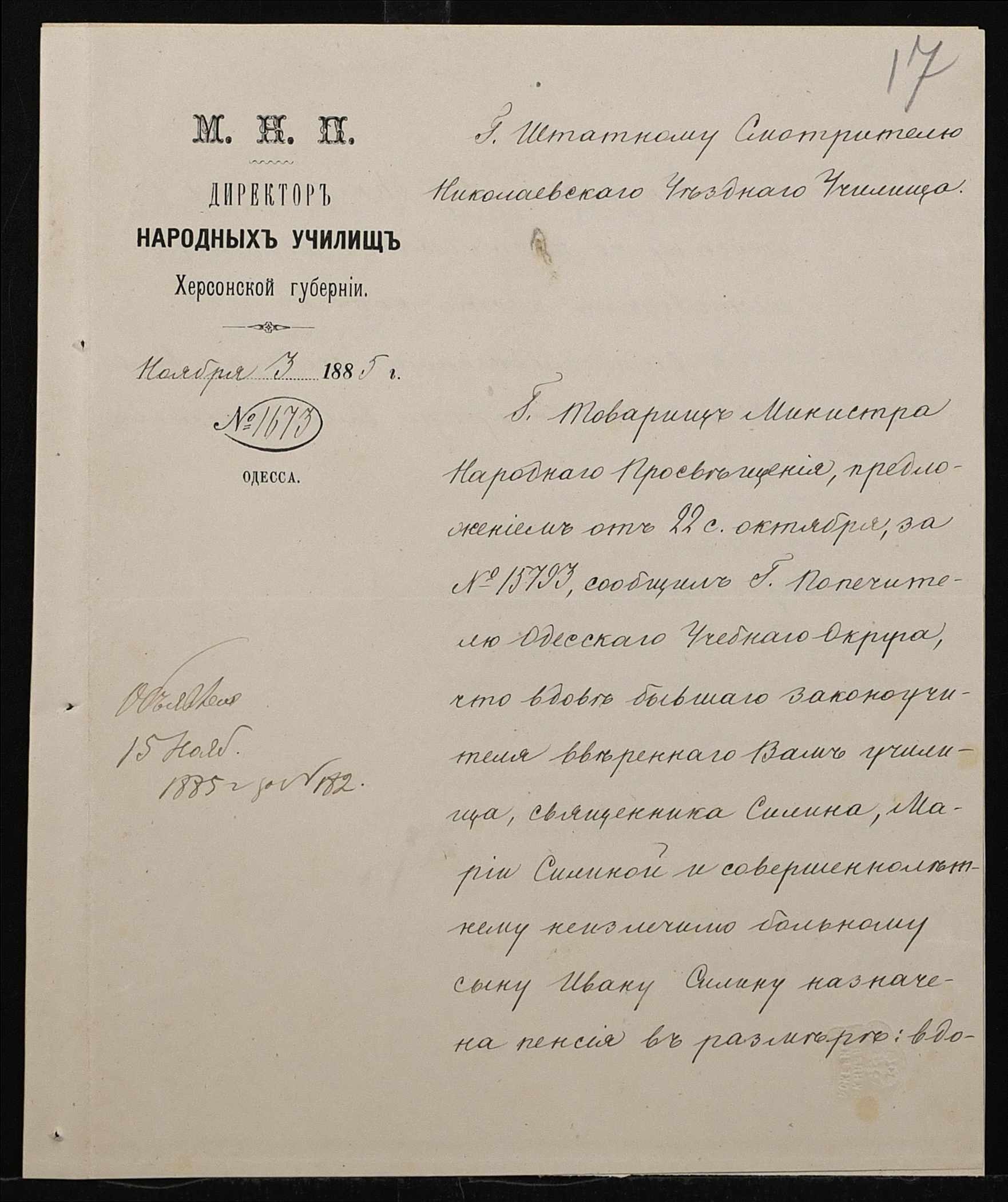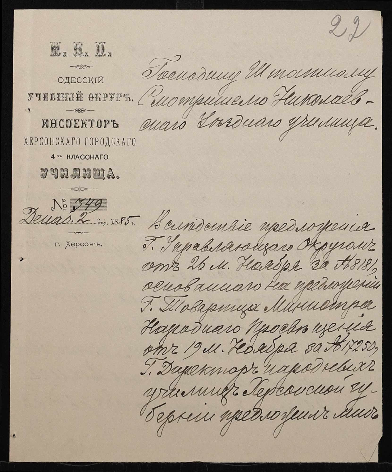 • • • • Справа № 192 “Листування з директором народних училищ Херсонської губернії про проходження служби чиновниками училища”
