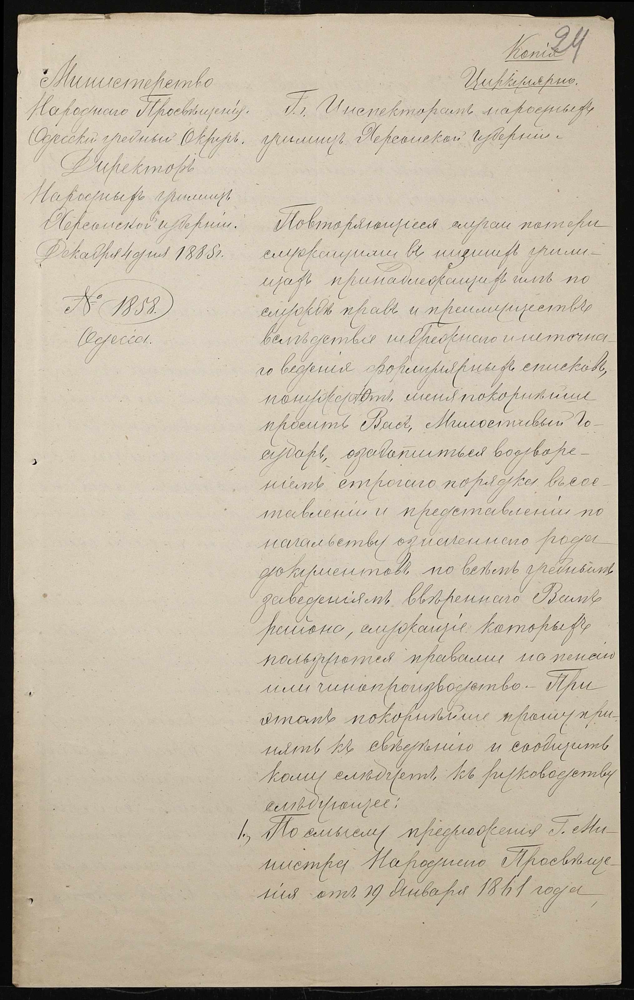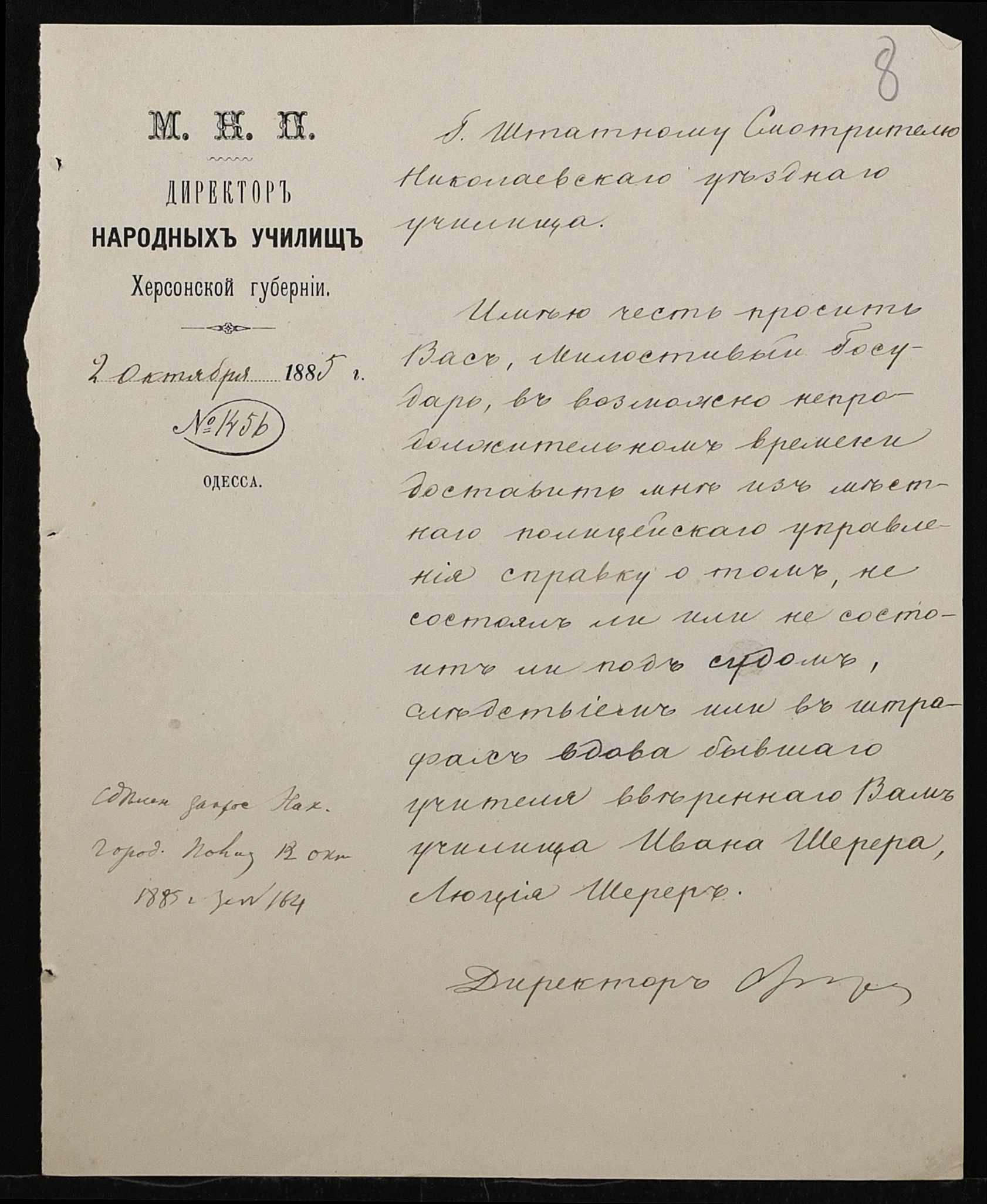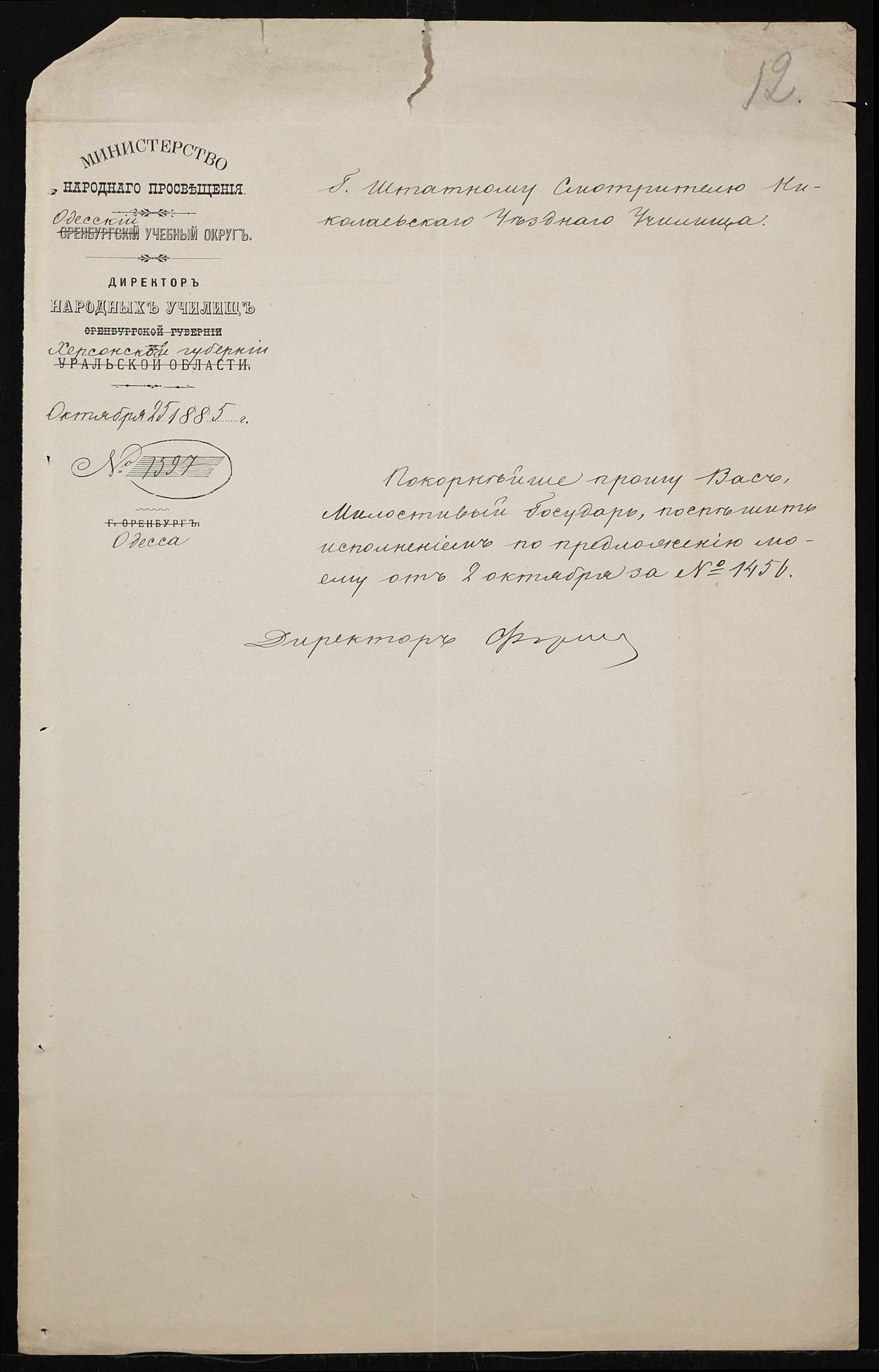 • • • • Справа № 192 “Листування з директором народних училищ Херсонської губернії про проходження служби чиновниками училища”