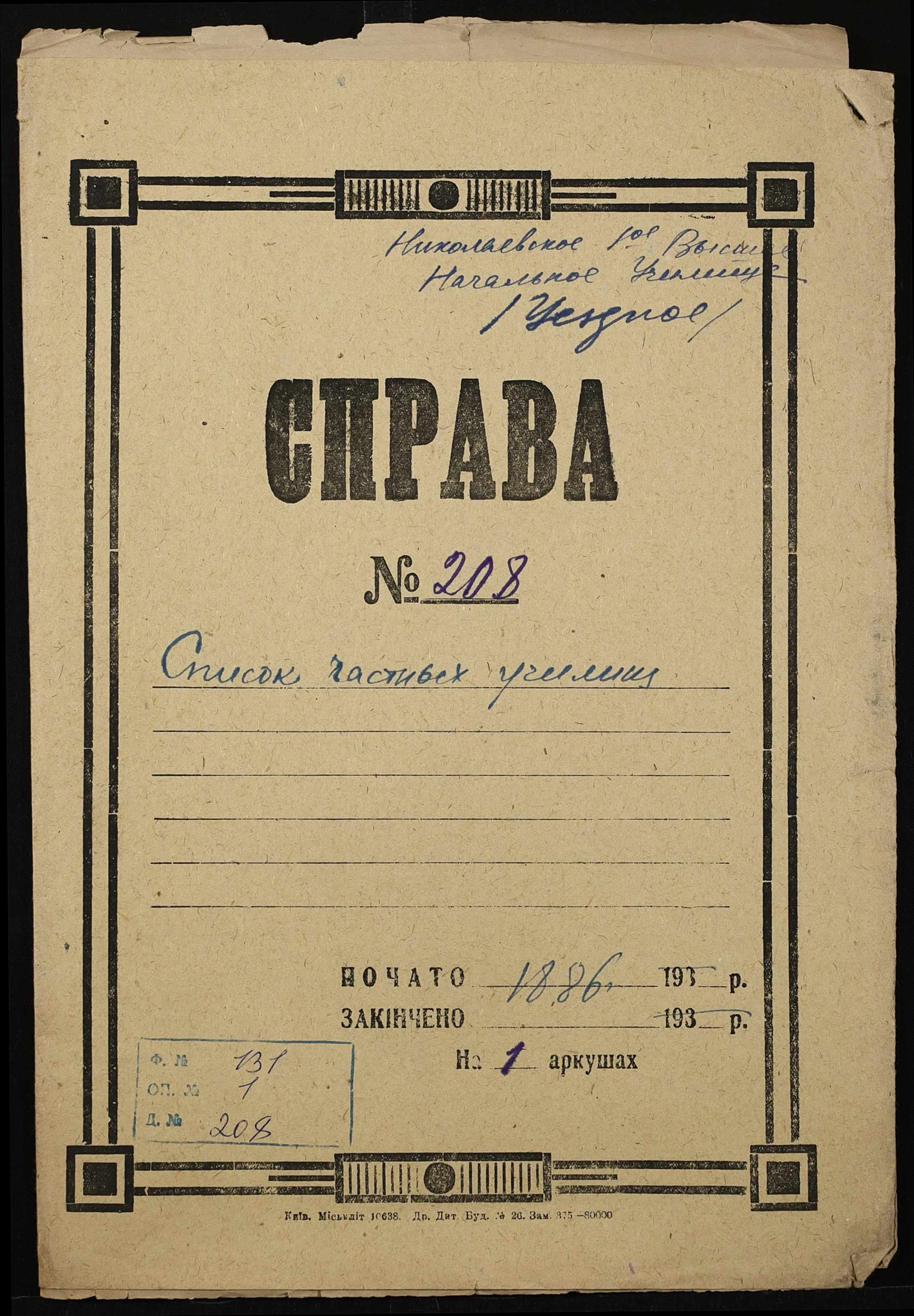 • • • • Справа № 208 “Список приватних початкових училищ III розряду в Миколаєві за 1886 рік”