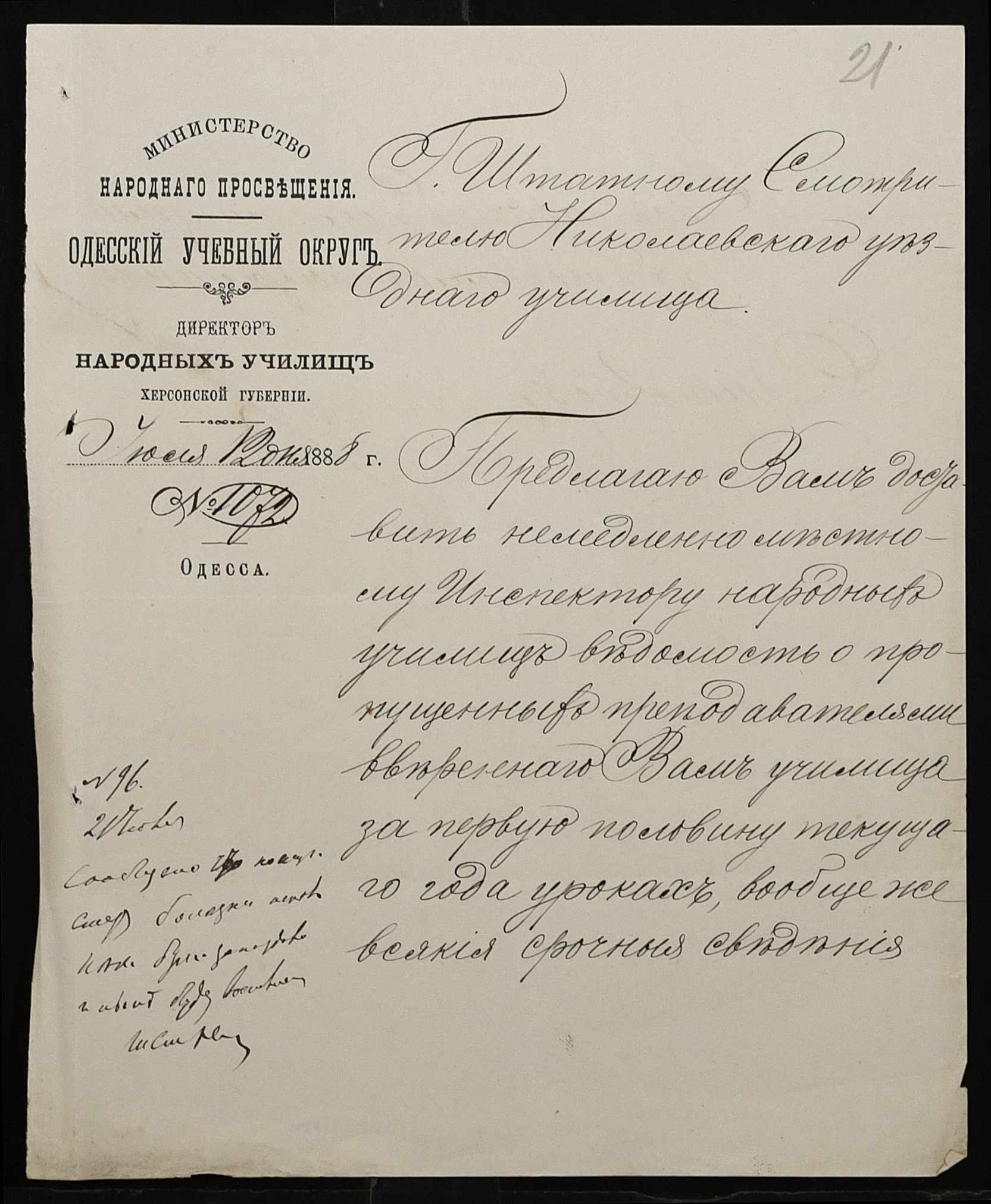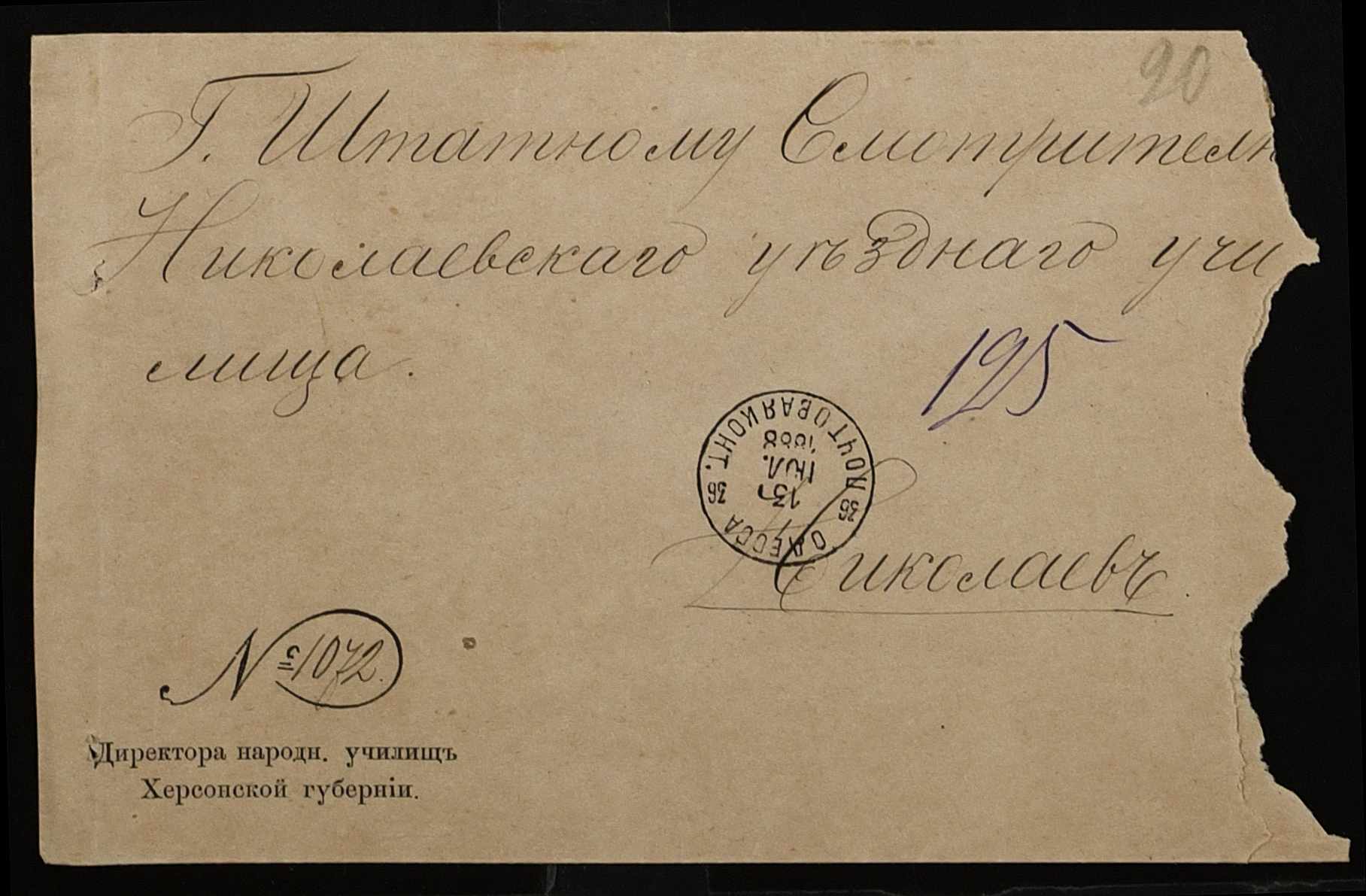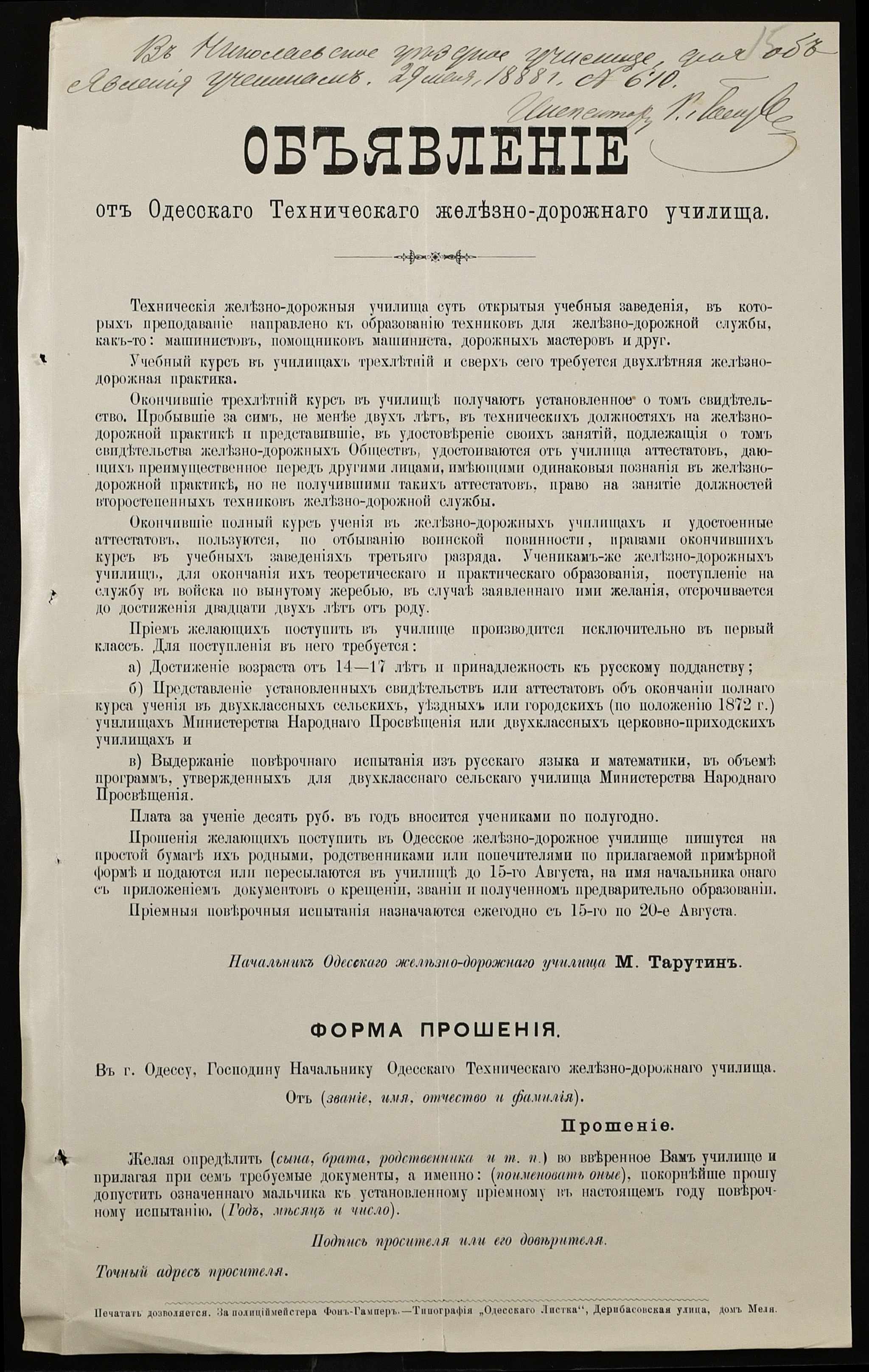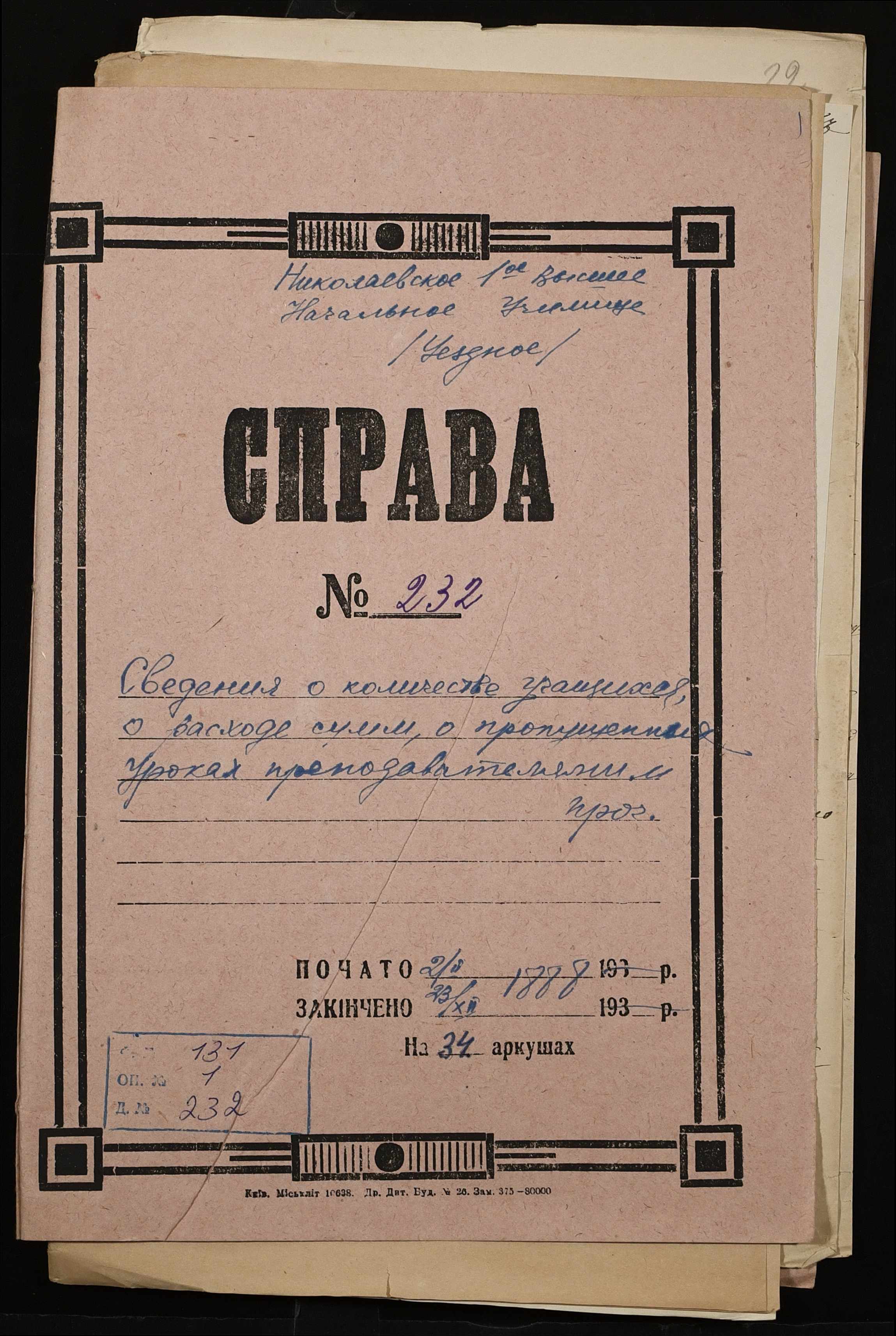 • • • • Справа № 232 “Листування про надання відомостей про уроки, на яких були відсутні викладачі, про кількість учнів на 1 січня 1888 року. Оголошення про прийом в Одеське технічне залізничне училище”