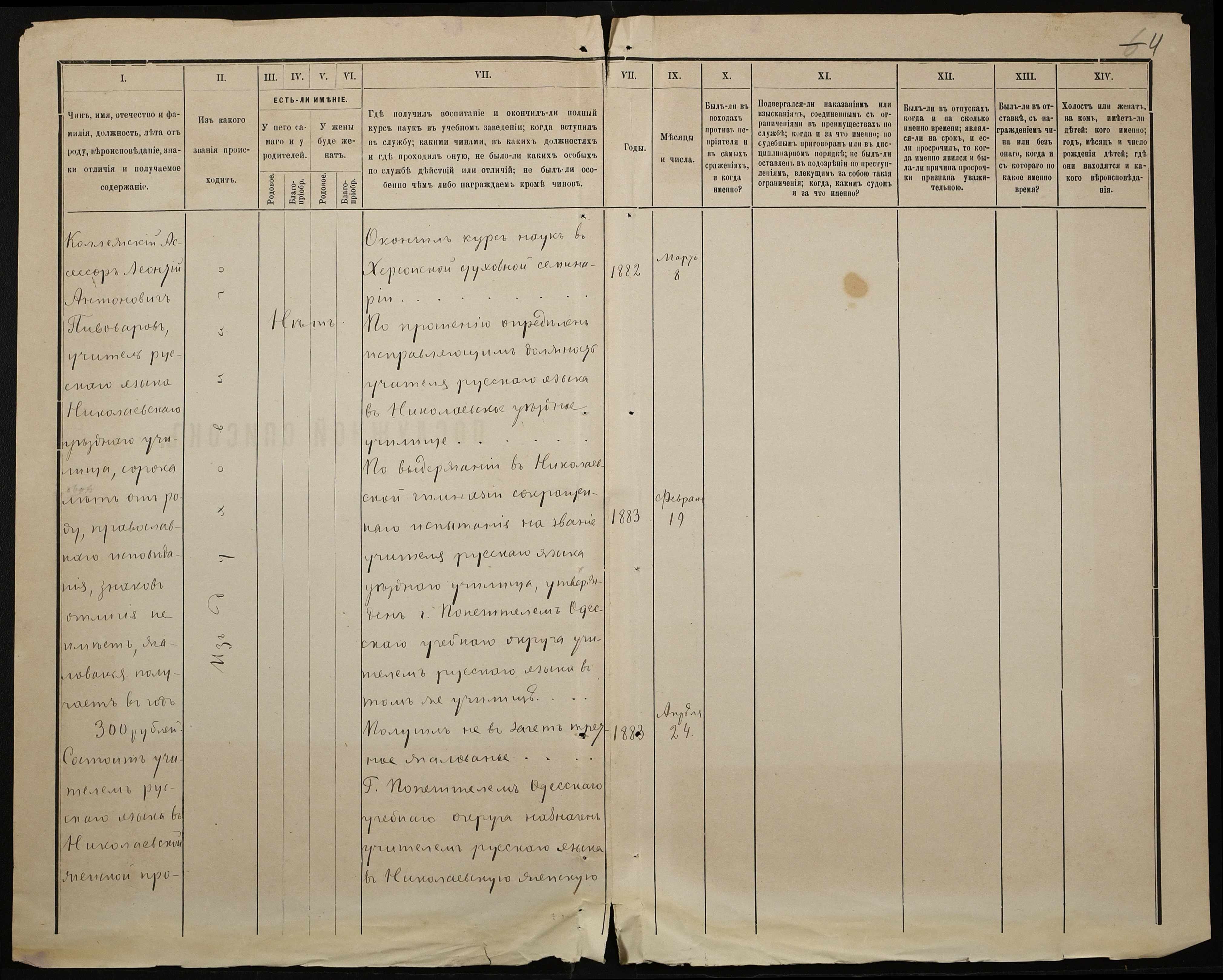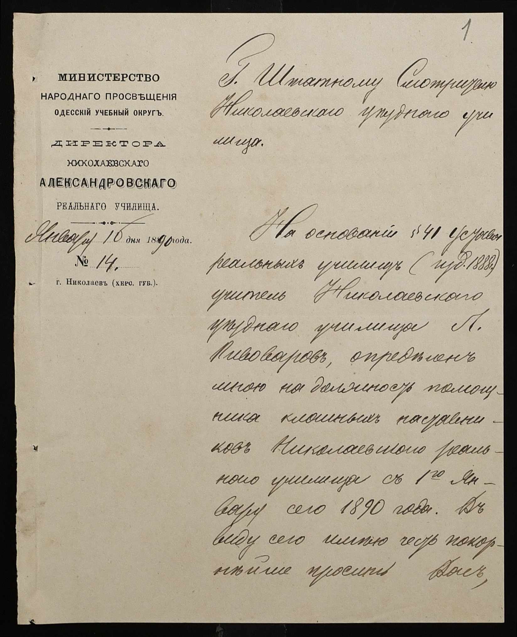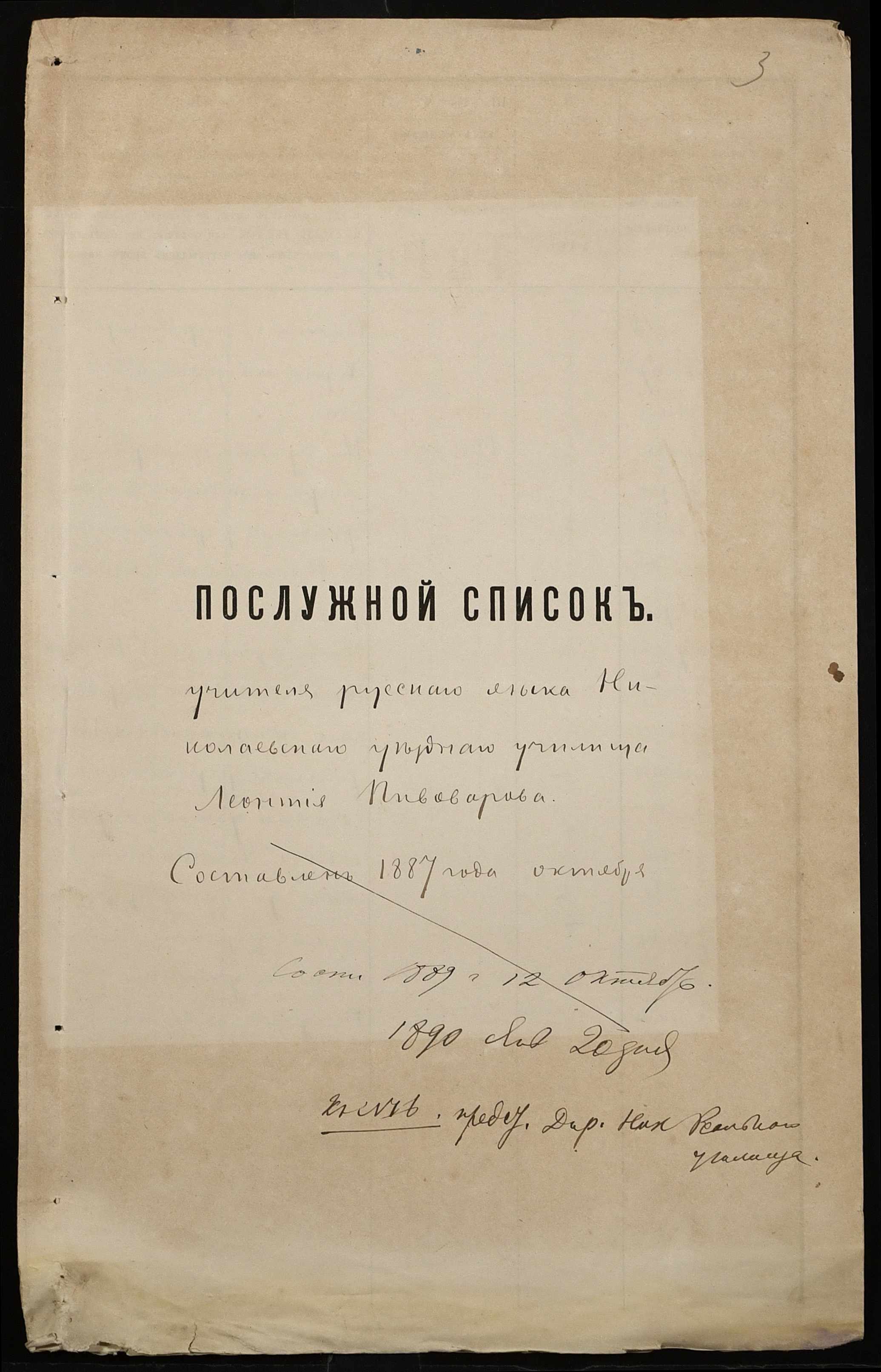 • • • • Справа № 240 “Послужний список вчителя російської мови Л. Пивоварова (Л. Пивоварова), складений 20 січня 1890 року”