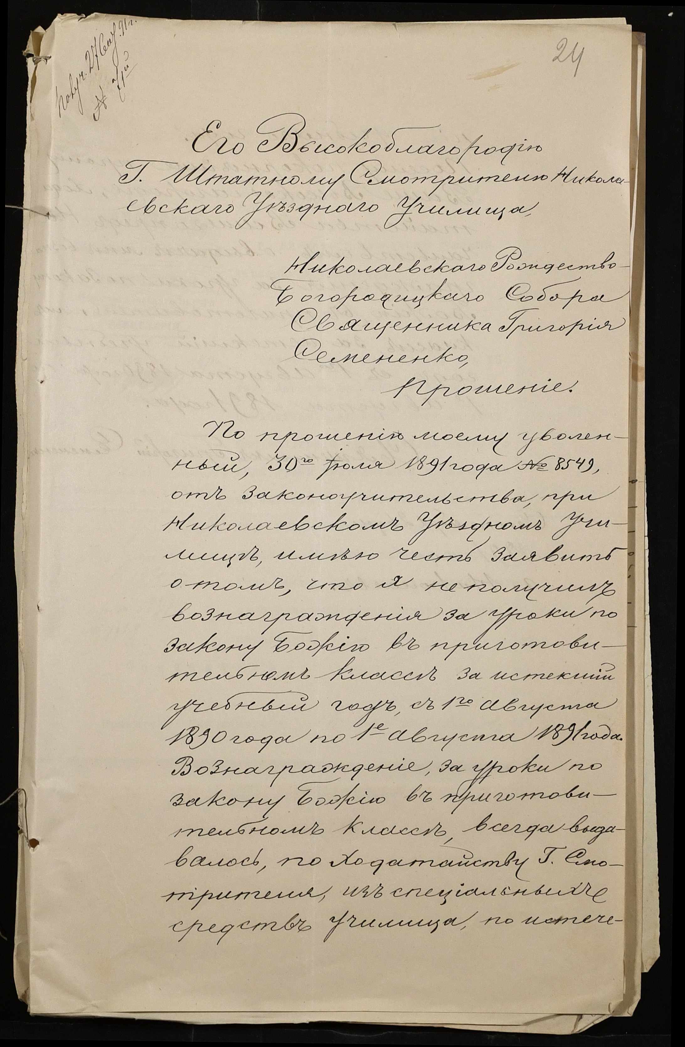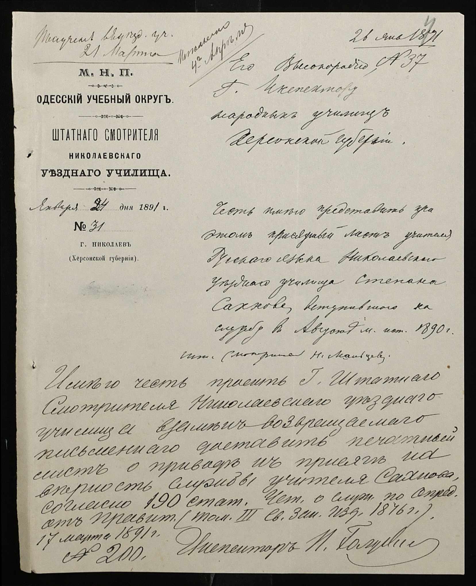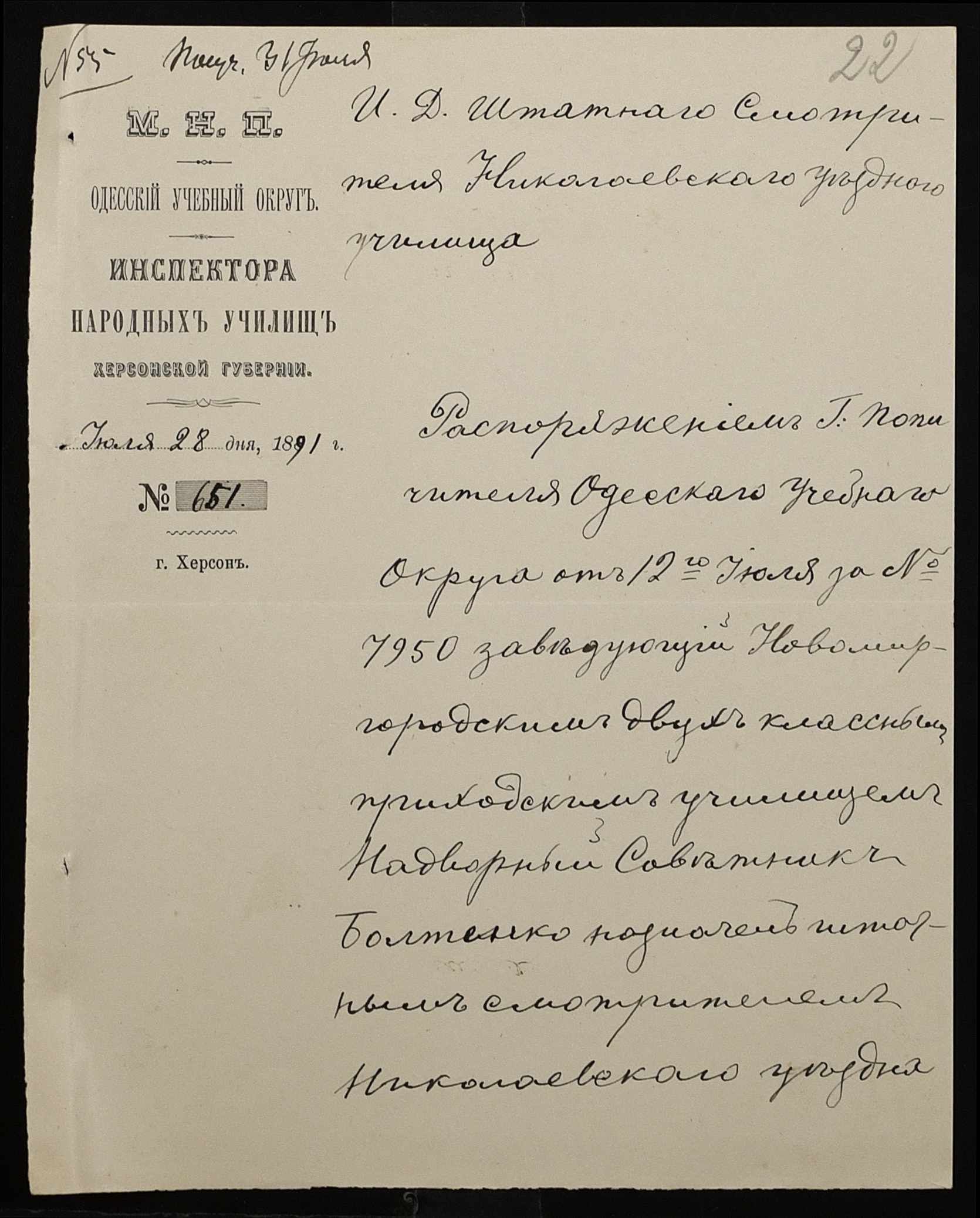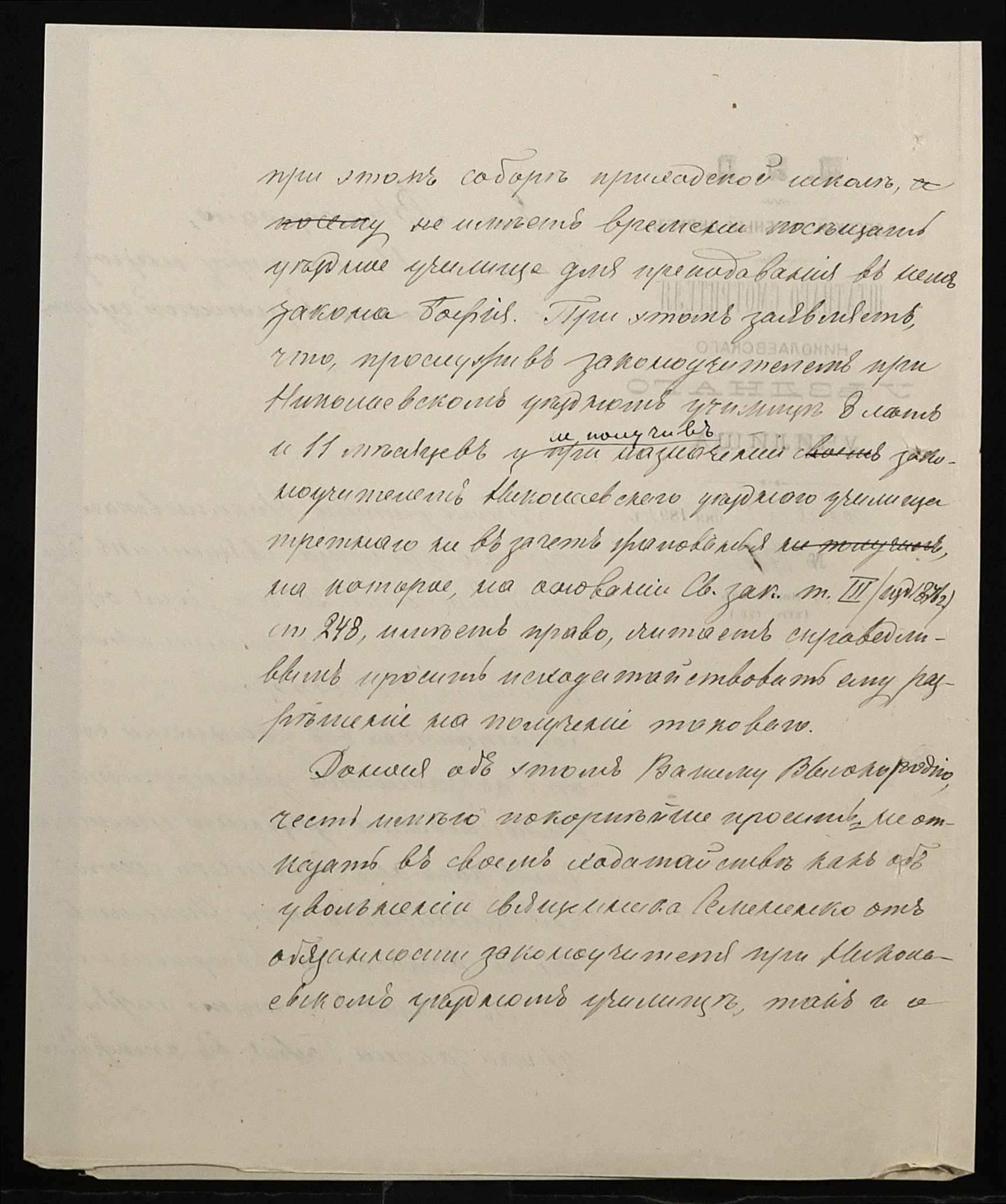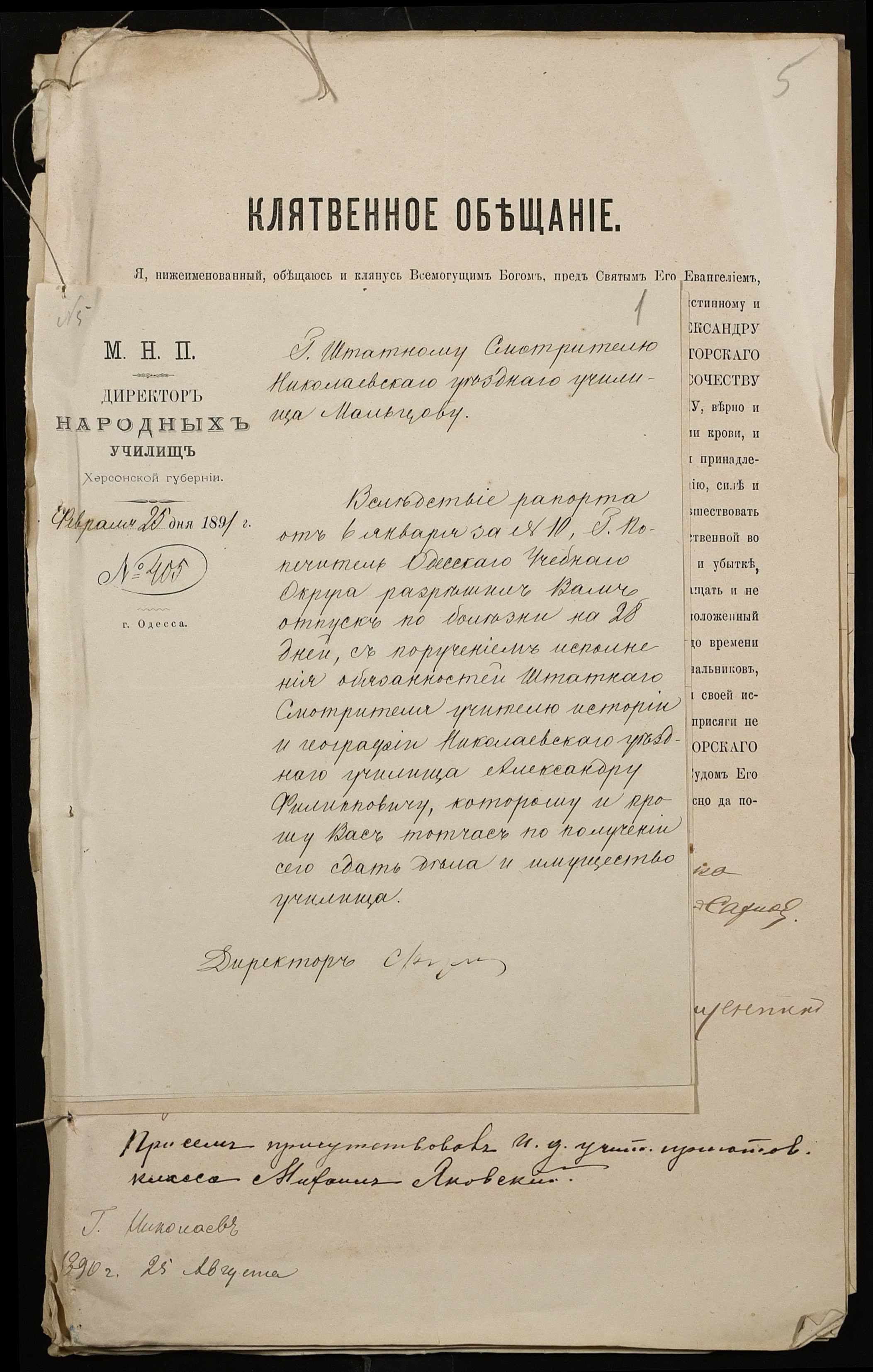 • • • • Справа № 250 “Листування про проходження служби чиновниками повітового училища”