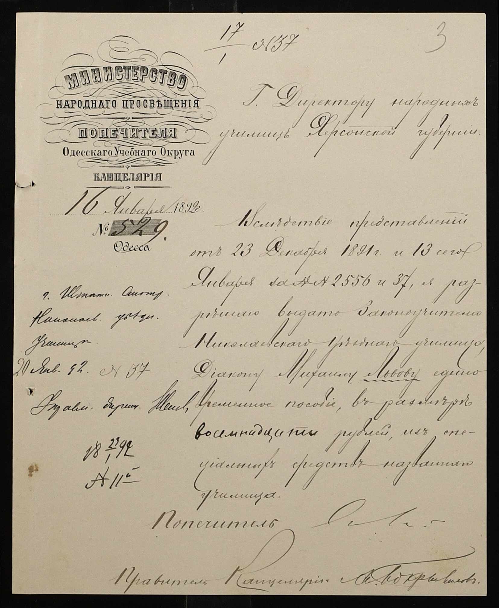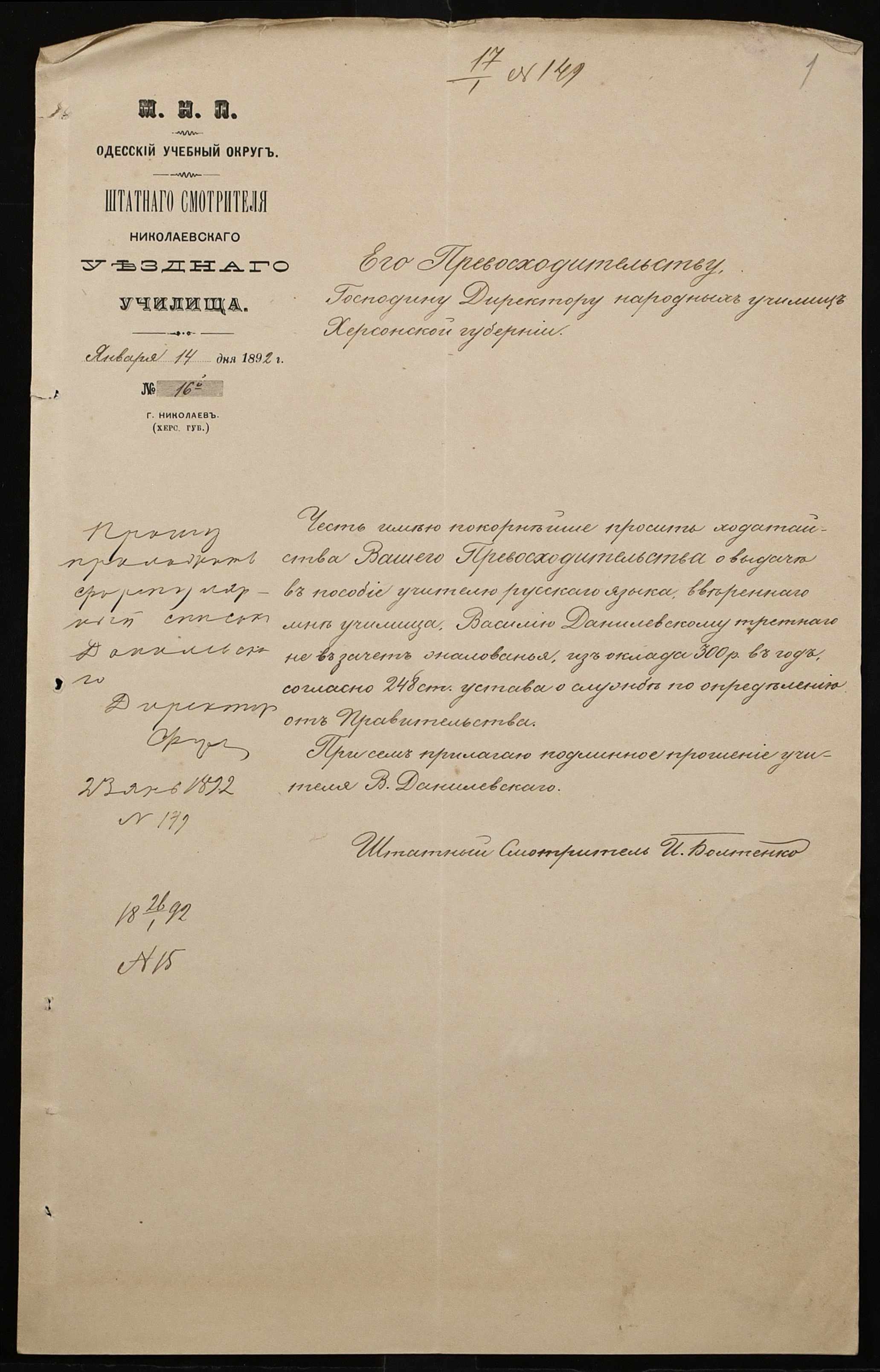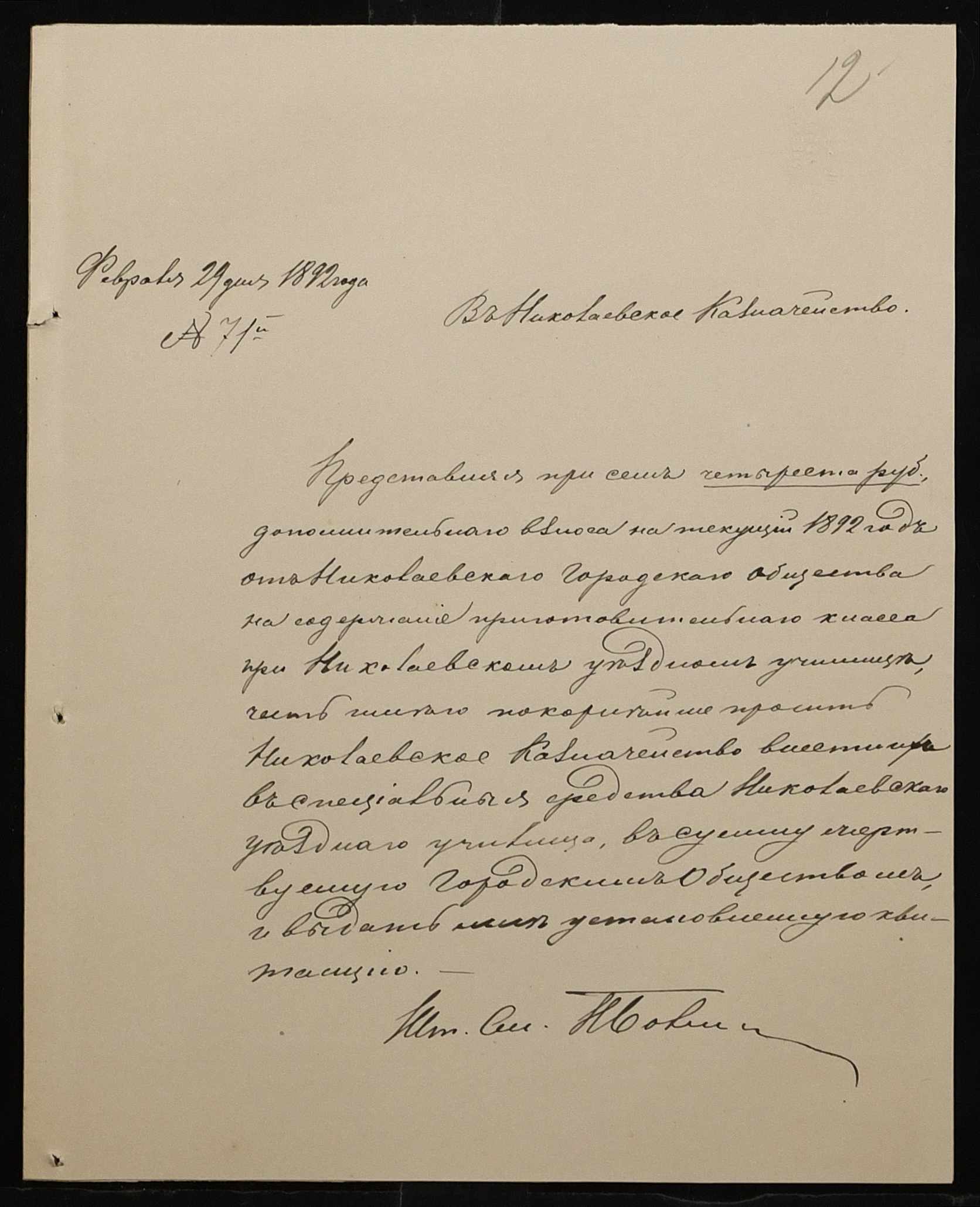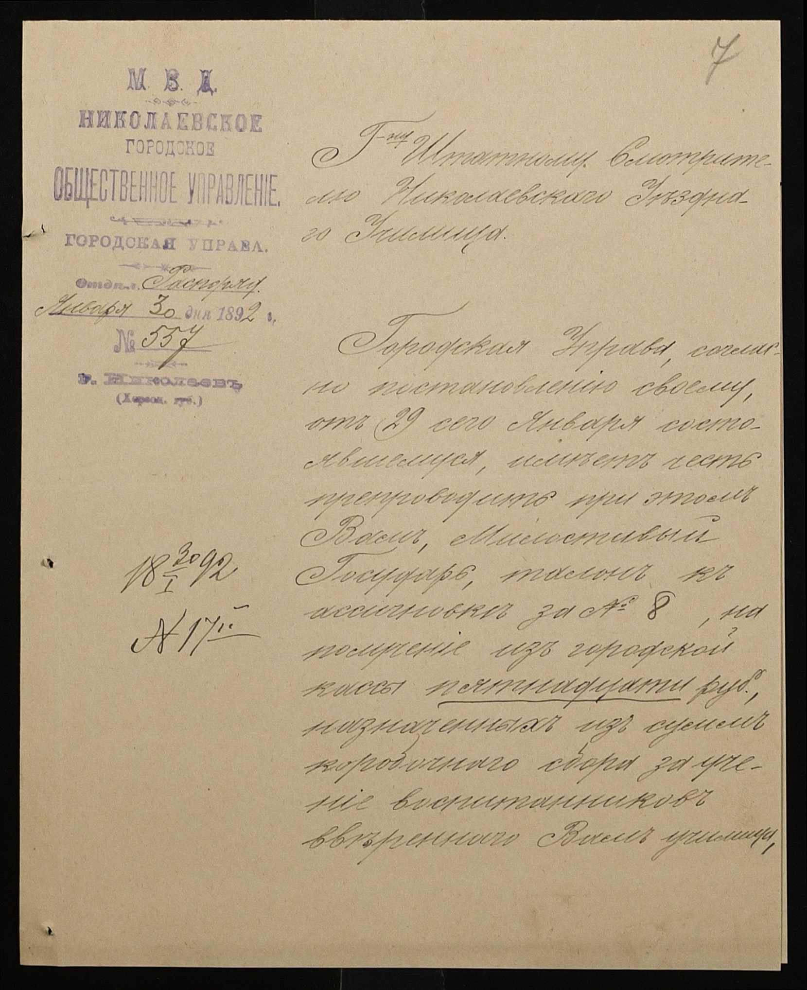 • • • • Справа № 267 “Листування з фінансових питань. Газета «Южанин» за 16 січня 1892 рік № 12”