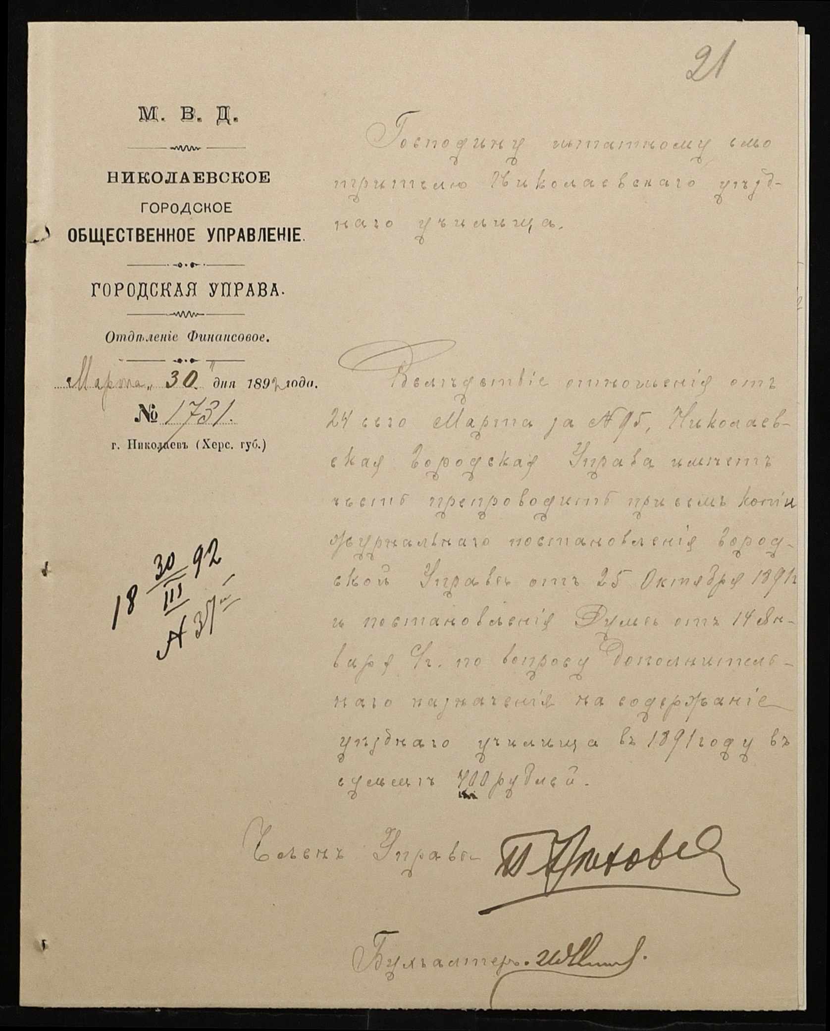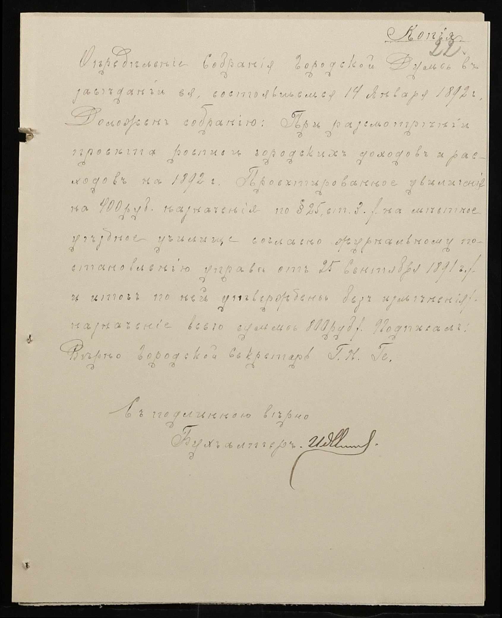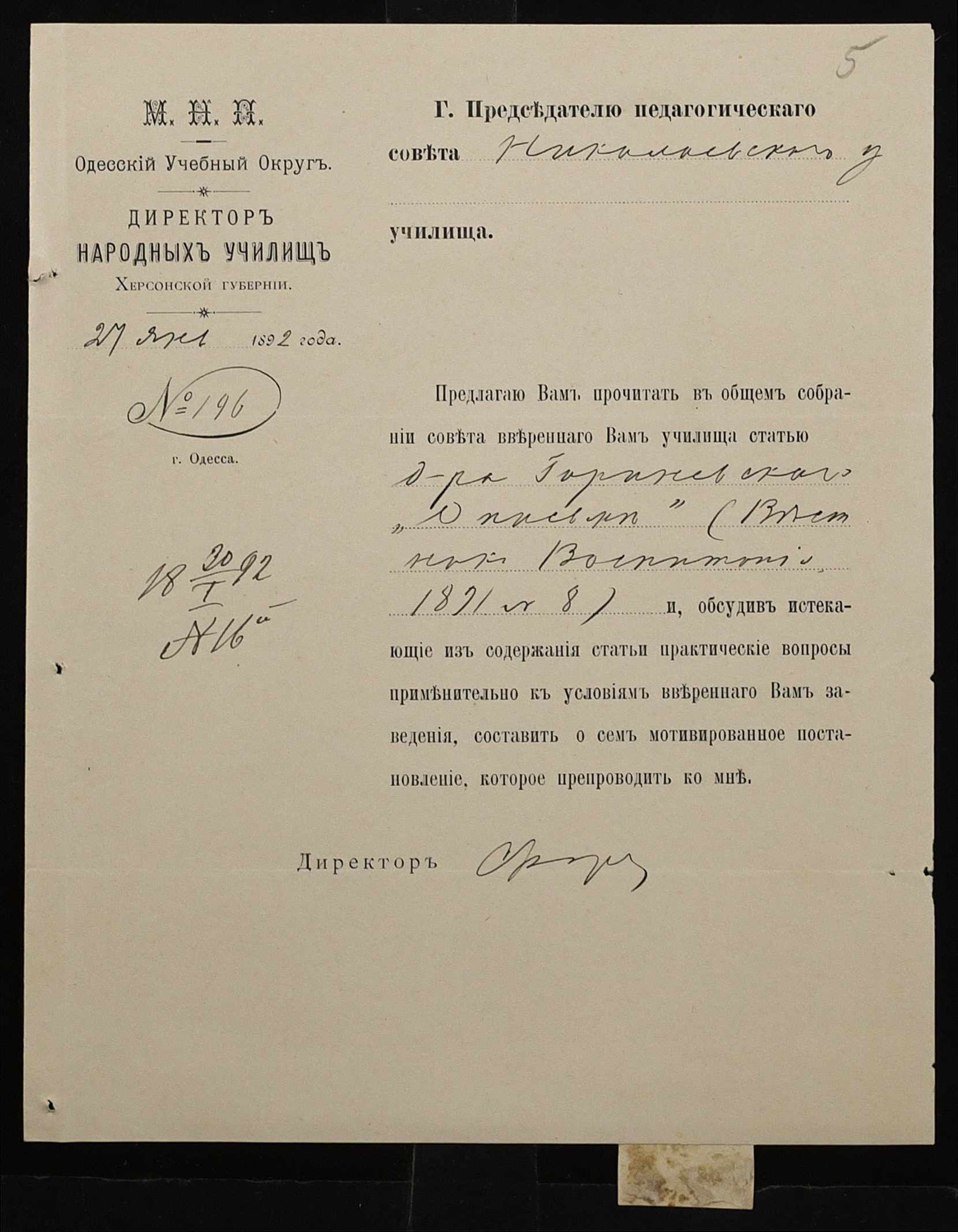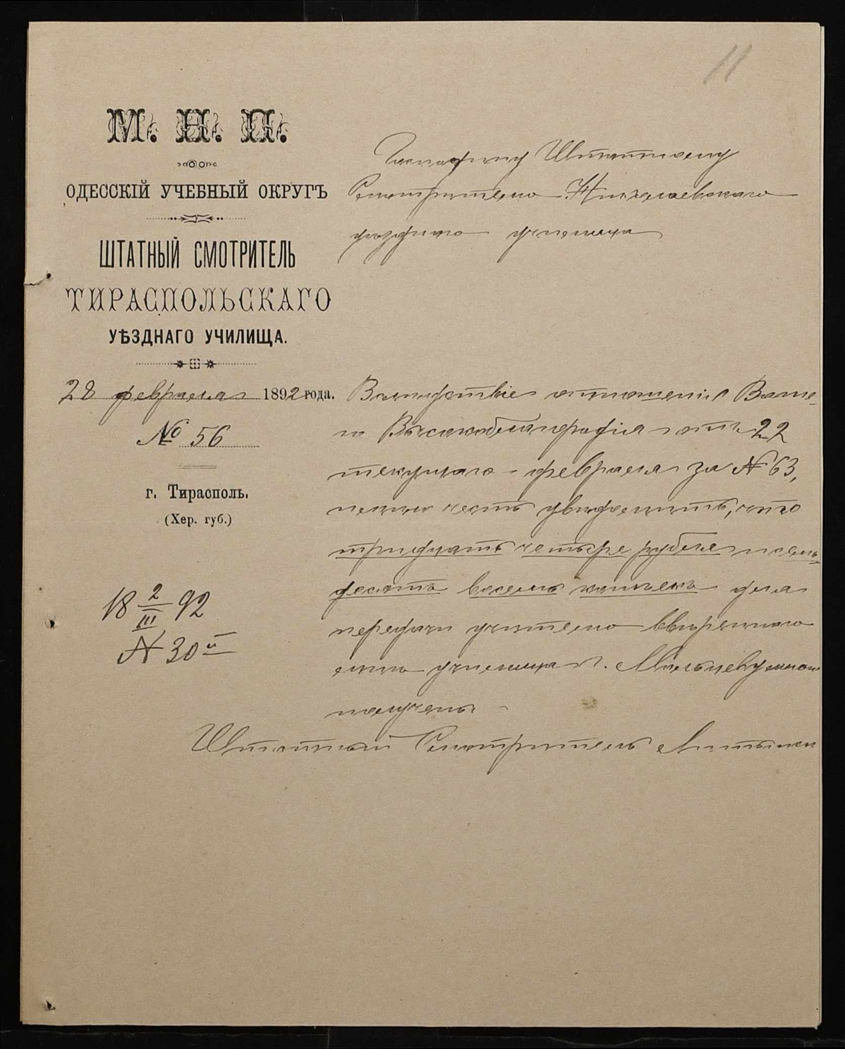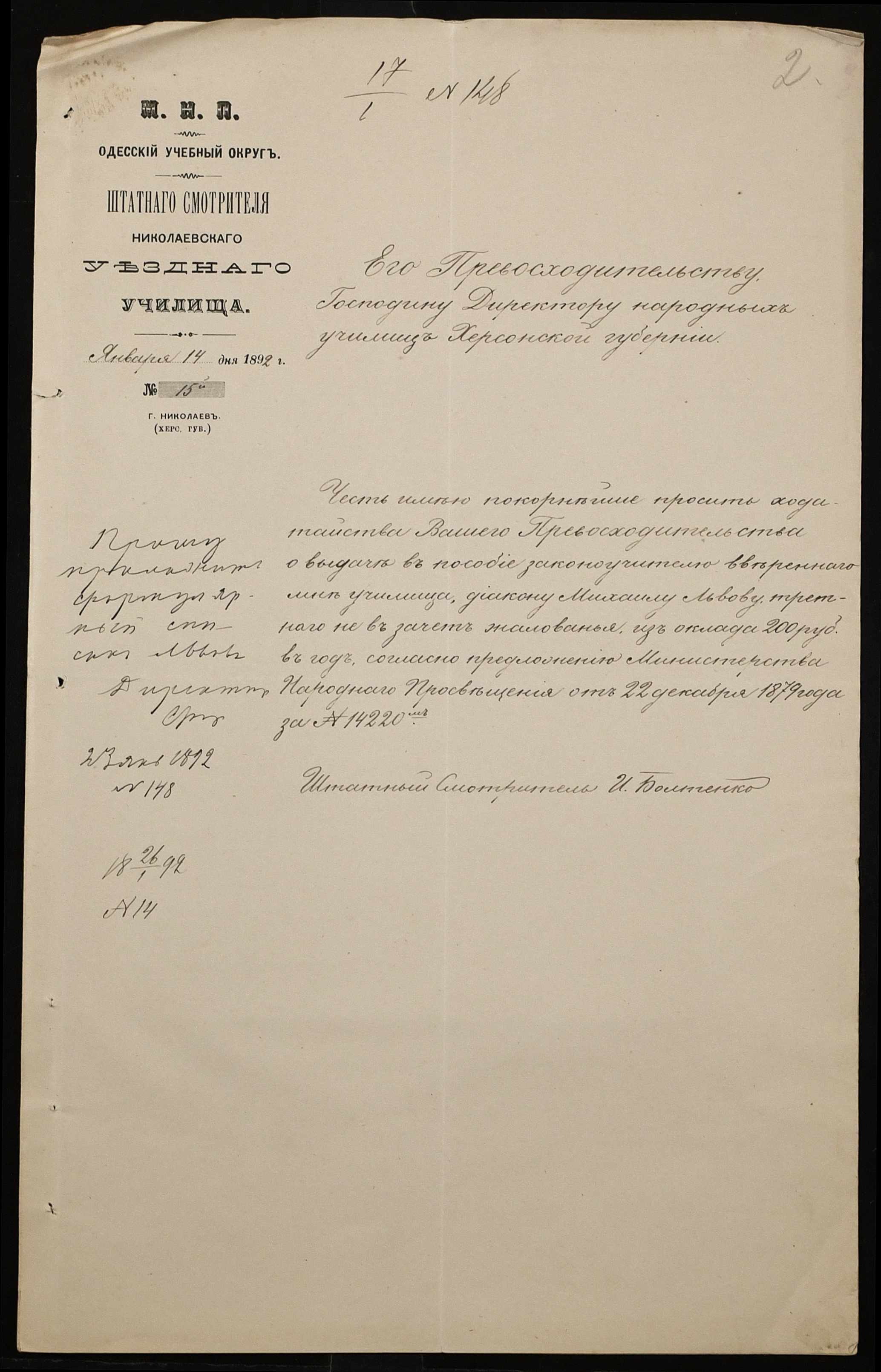 • • • • Справа № 267 “Листування з фінансових питань. Газета «Южанин» за 16 січня 1892 рік № 12”