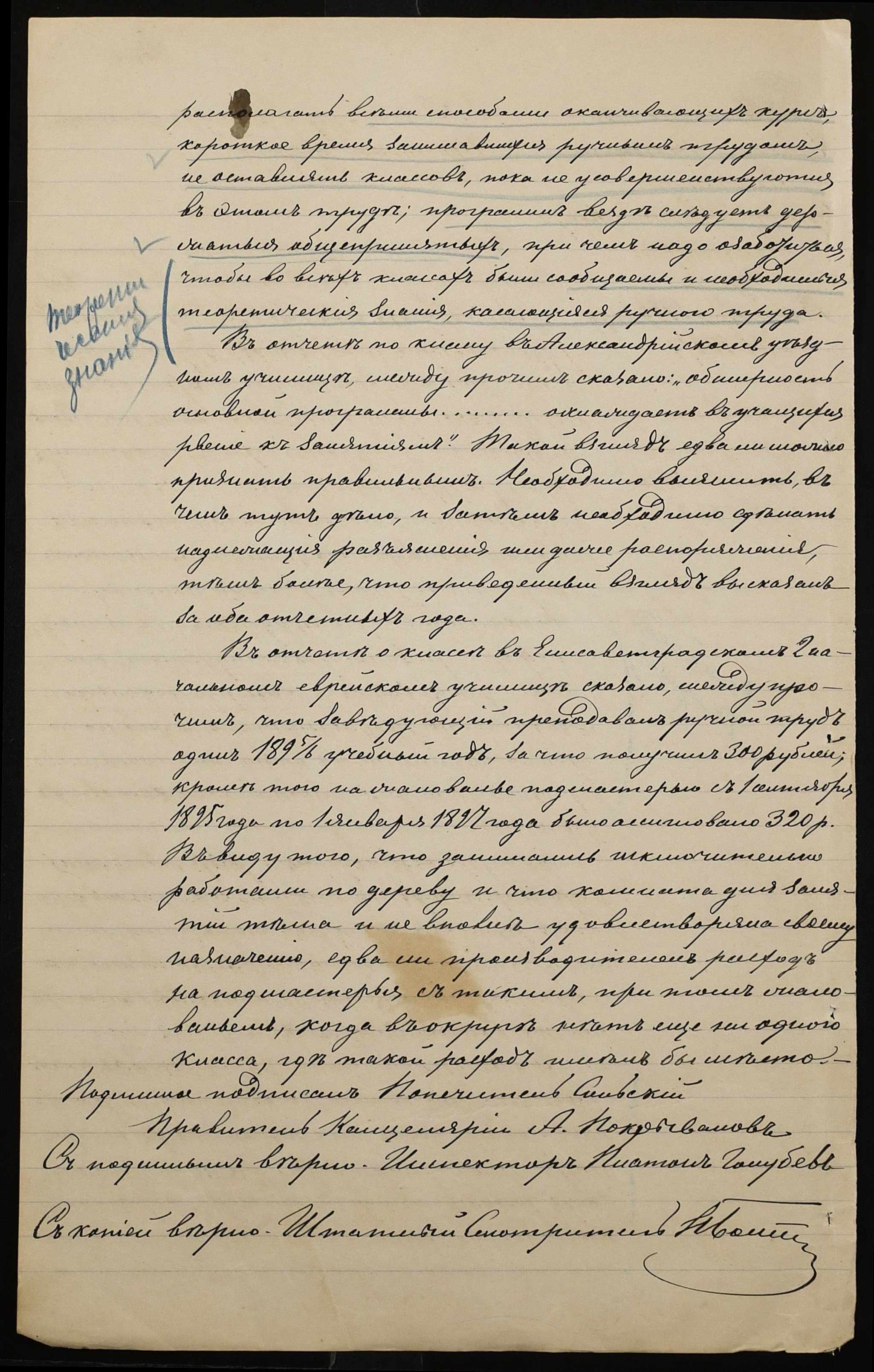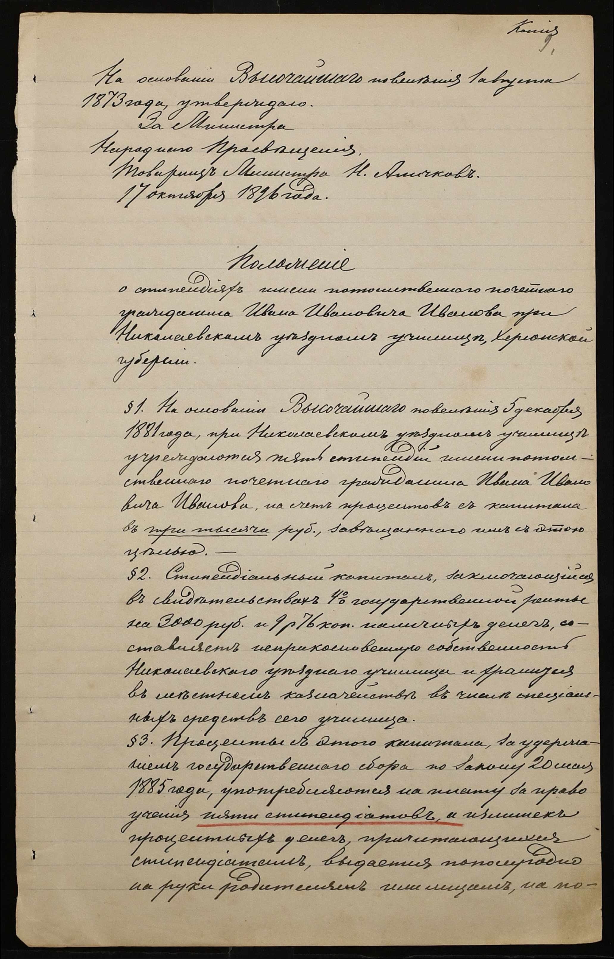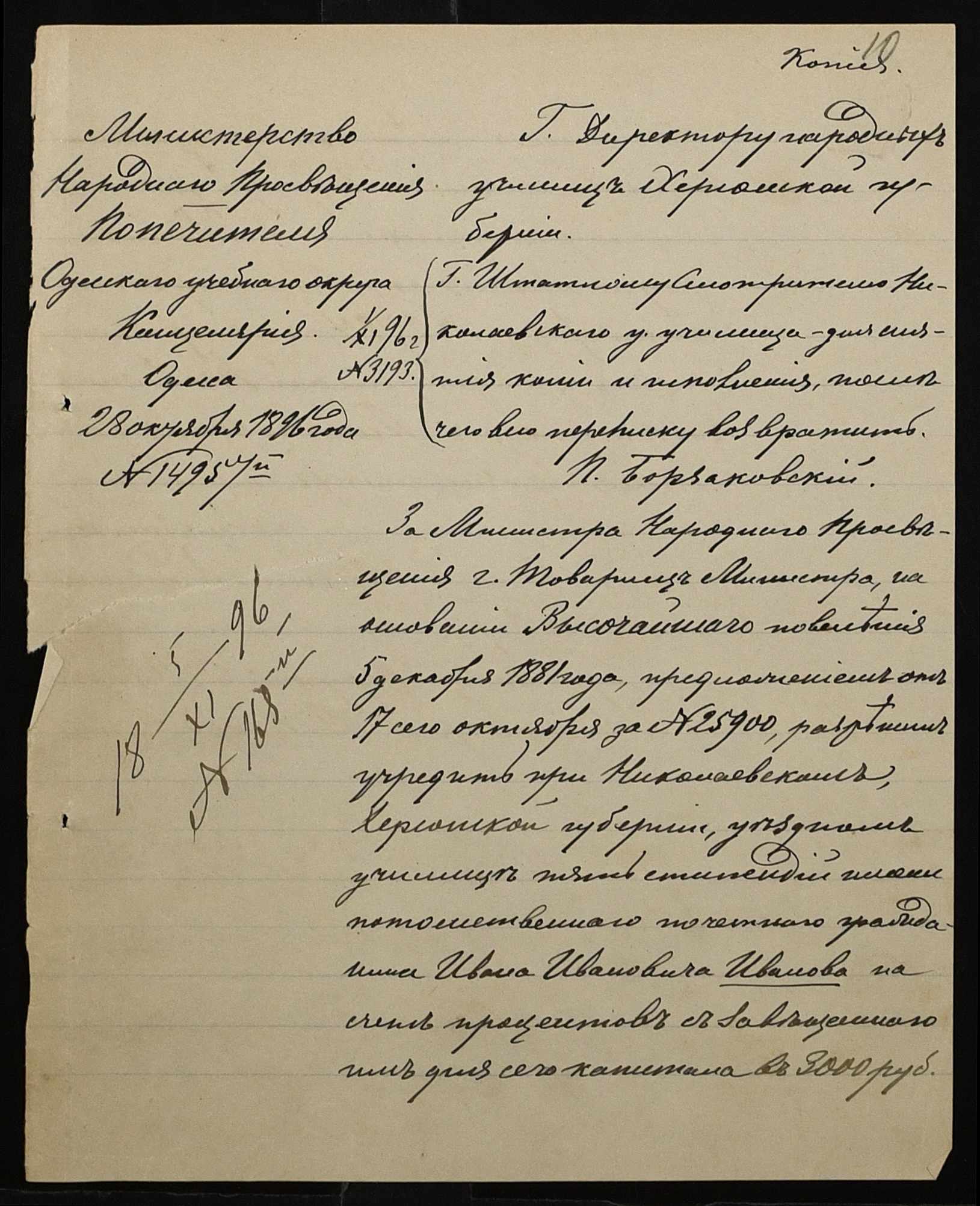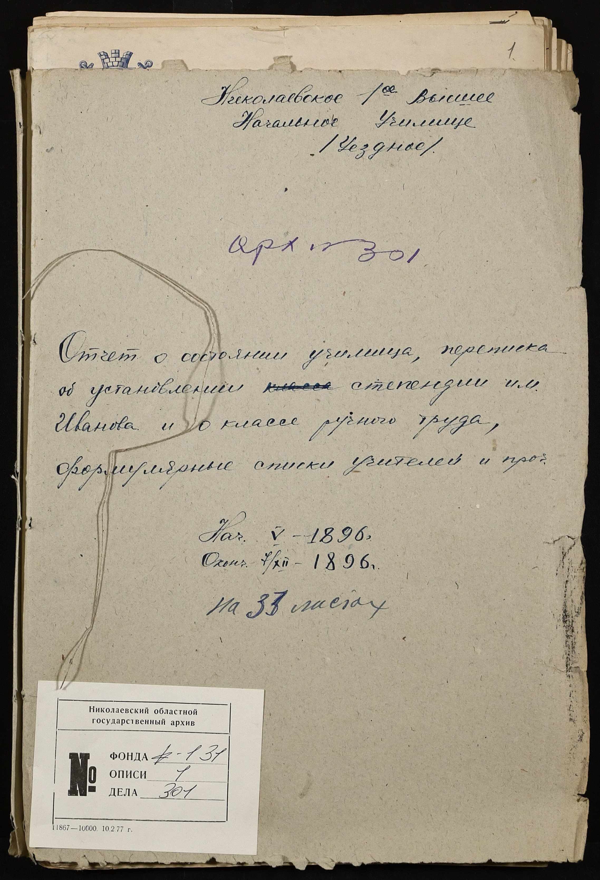 • • • • Справа № 301 “Положення про заснування стипендії почесного громадянина І.І. Іванова (И.И. Иванова), послужні списки чиновників, звіт і відомості про стан класу ручної праці училища за 1894-1895 навчальний рік”