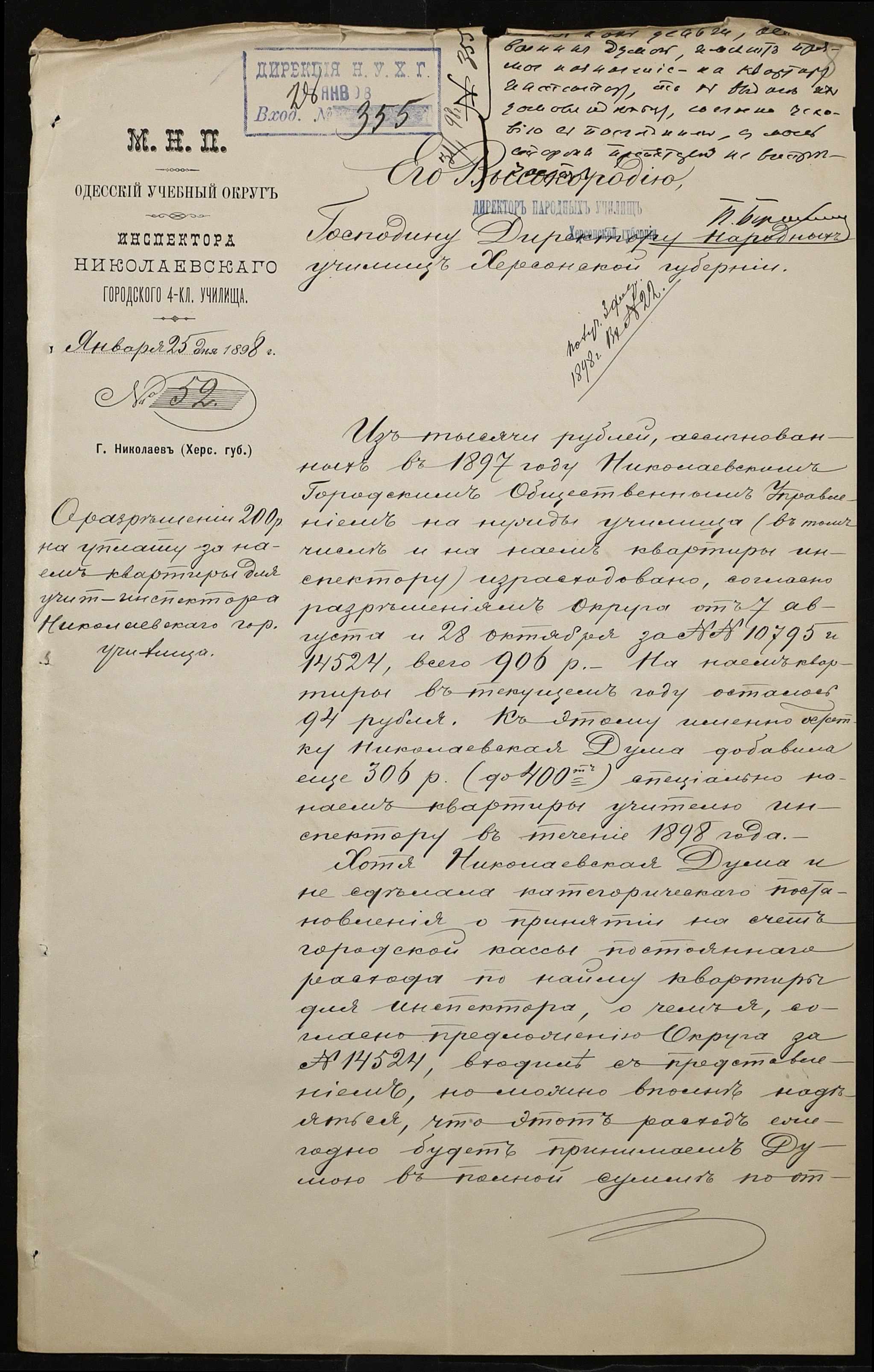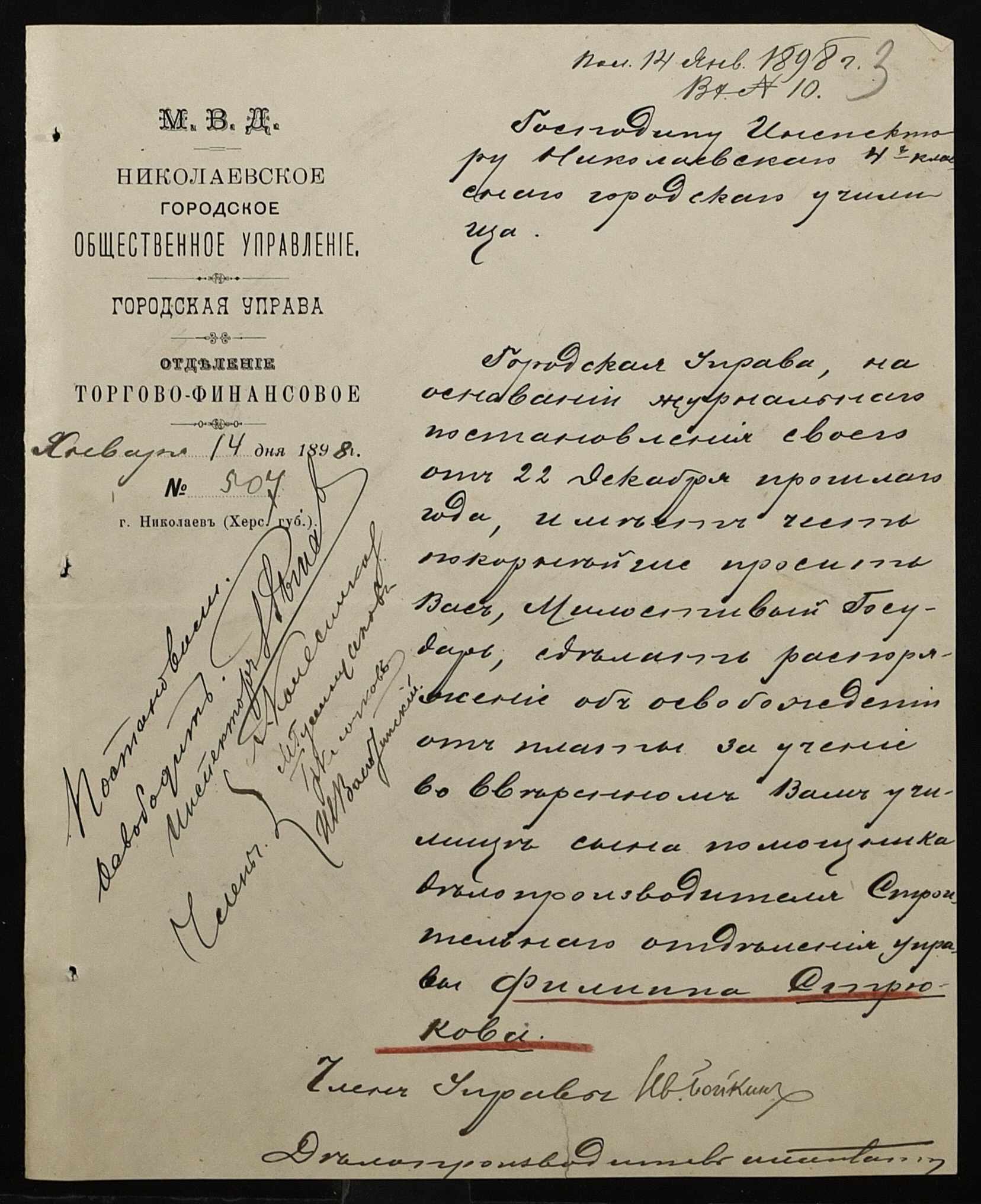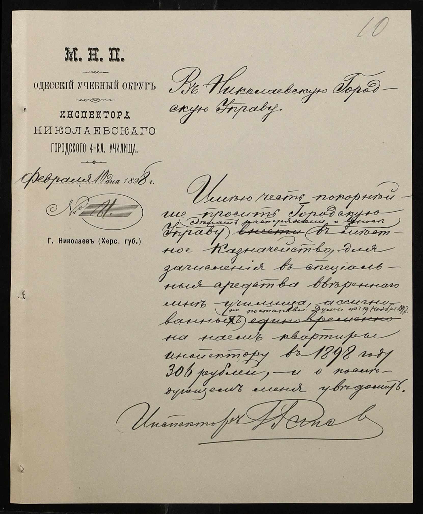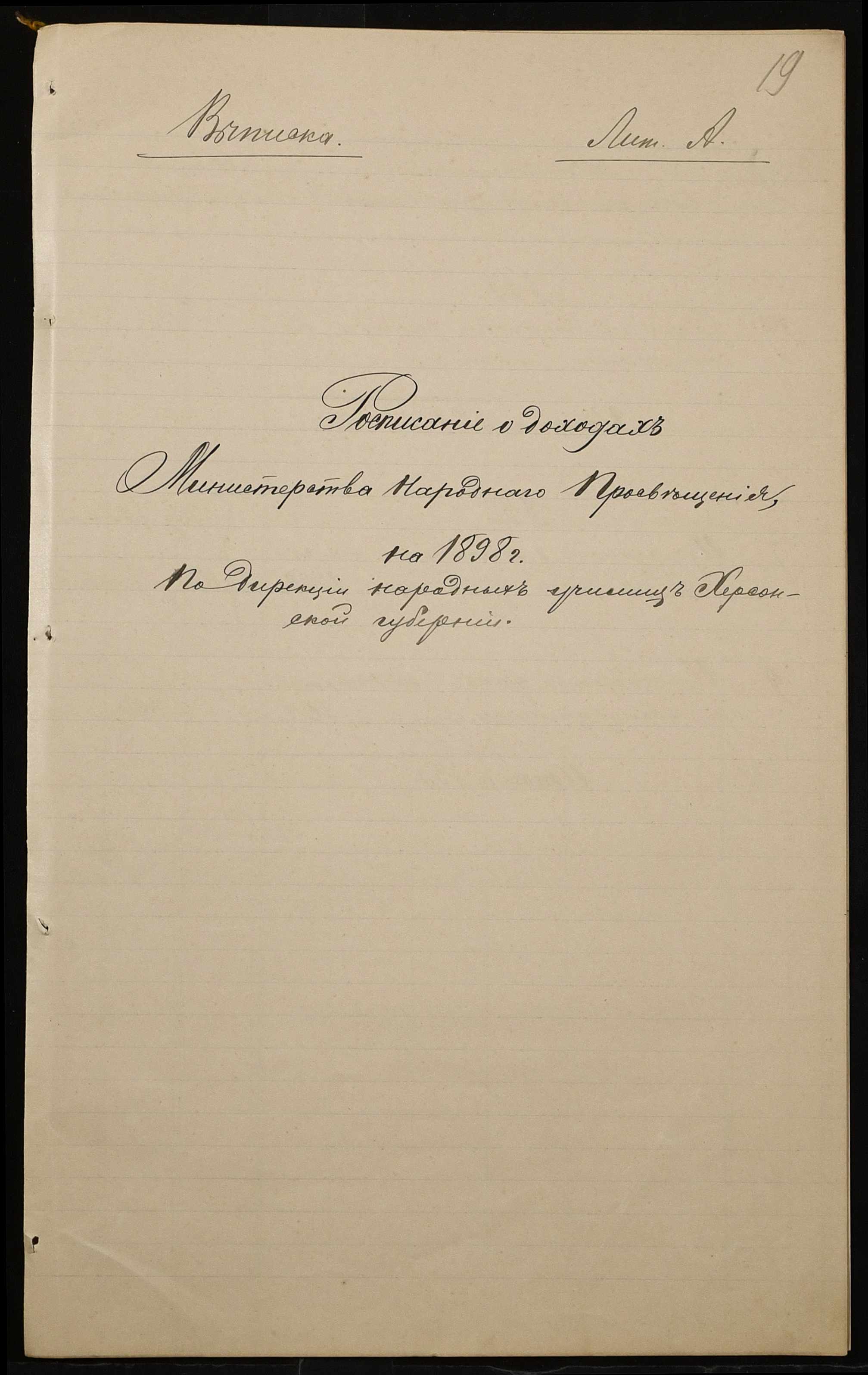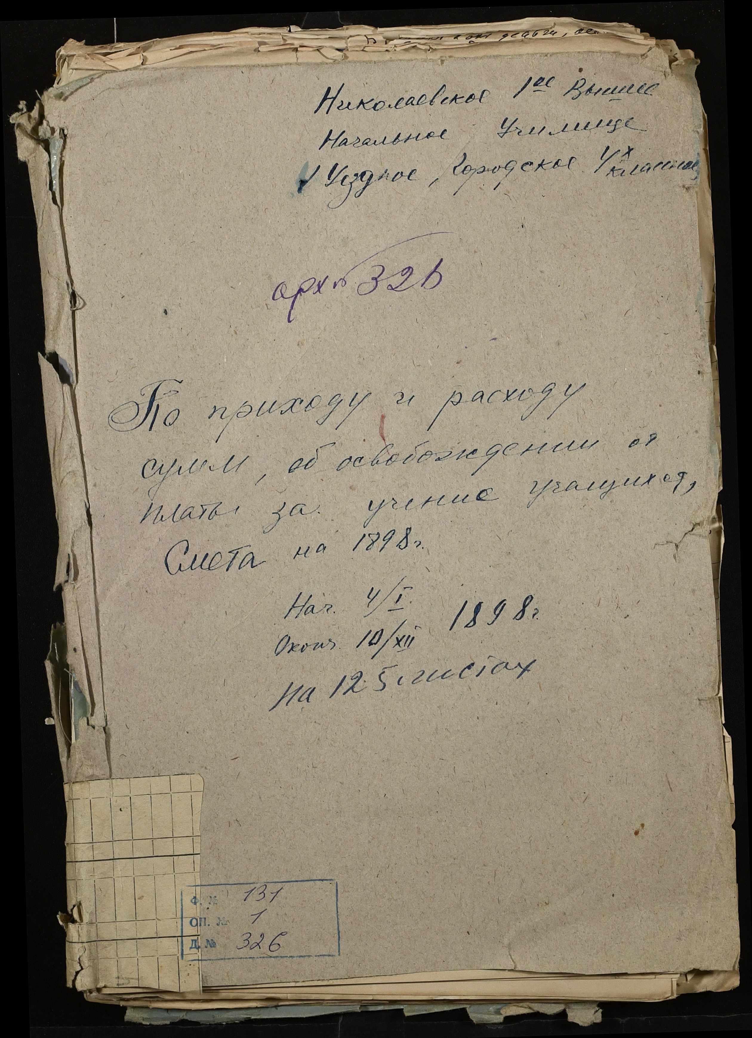 • • • • Справа № 326 “Кошторис прибутків і видатків коштів училища за 1898 рік, листування про звільнення малозабезпечених учнів від сплати за навчання”