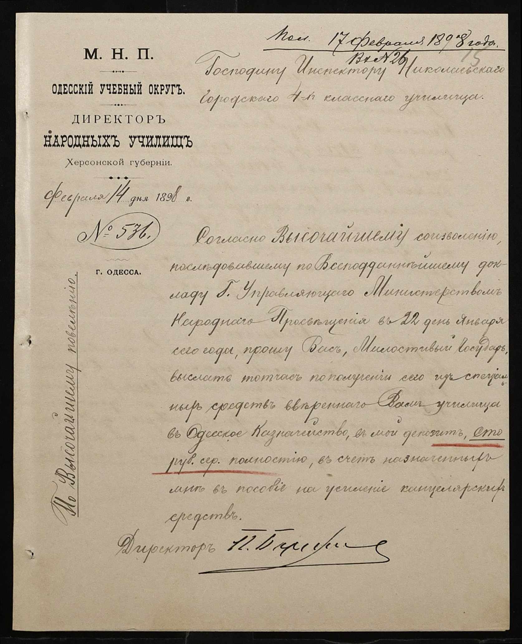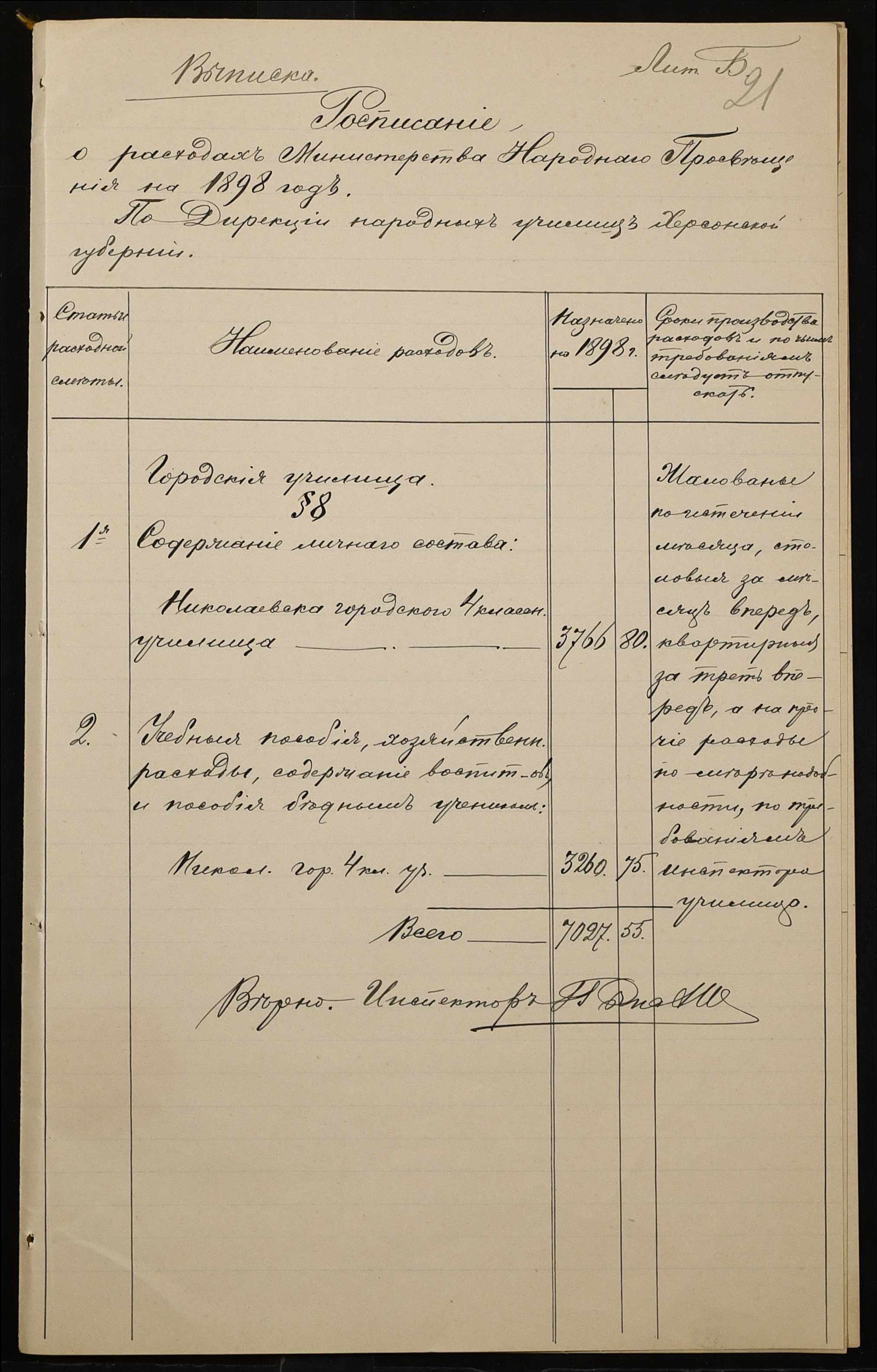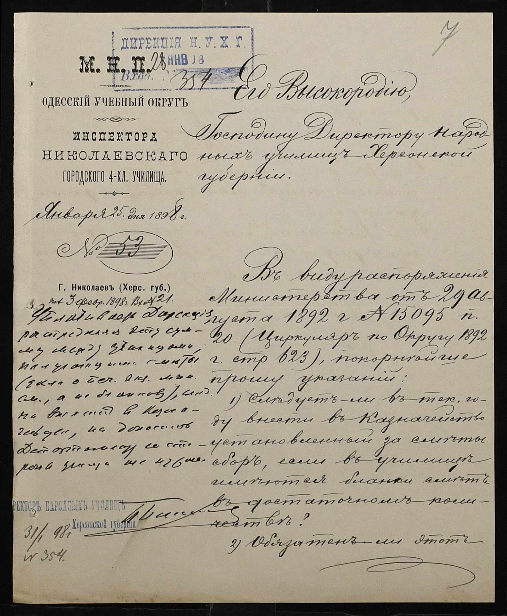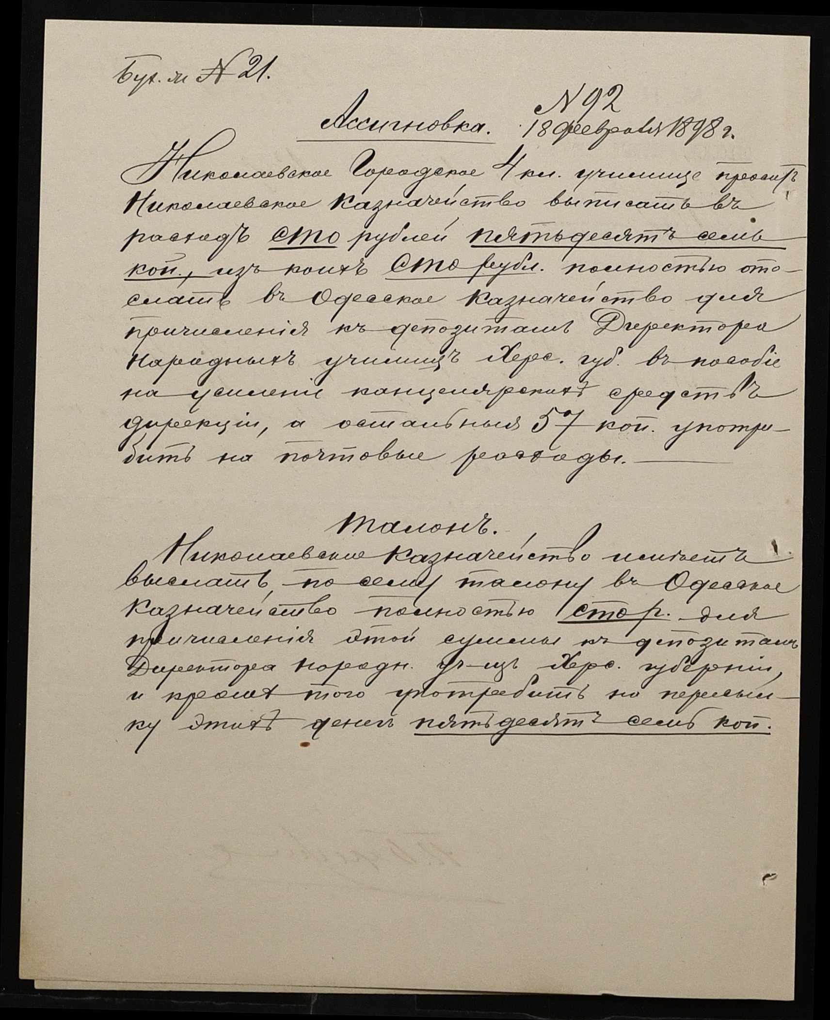 • • • • Справа № 326 “Кошторис прибутків і видатків коштів училища за 1898 рік, листування про звільнення малозабезпечених учнів від сплати за навчання”