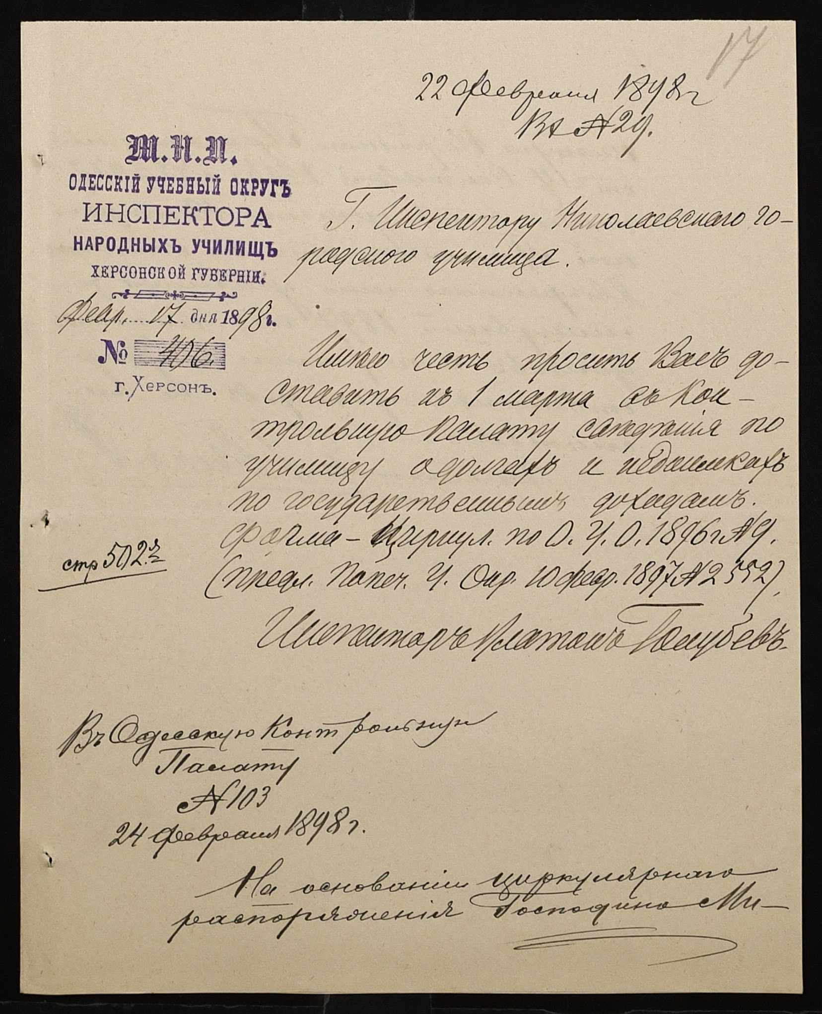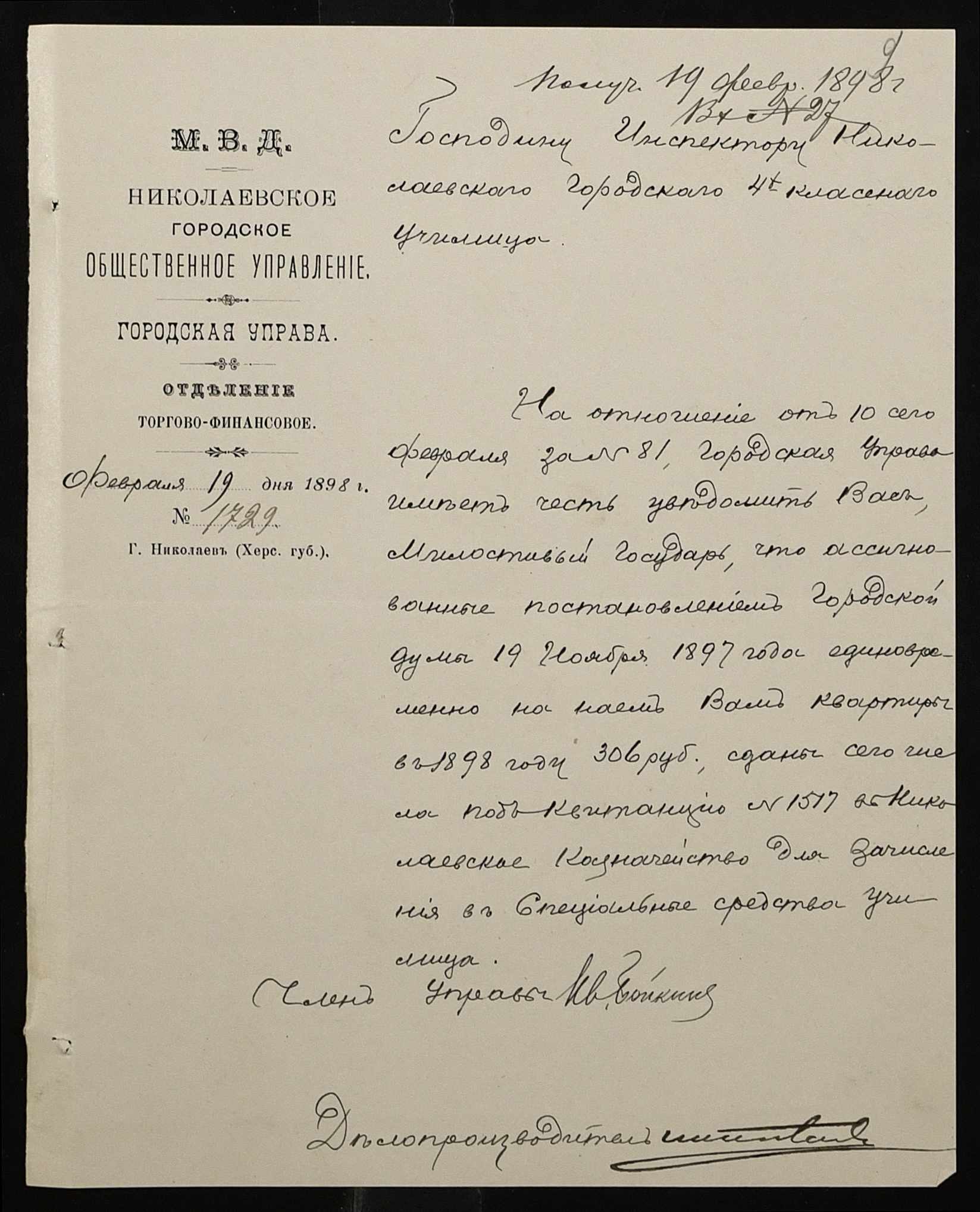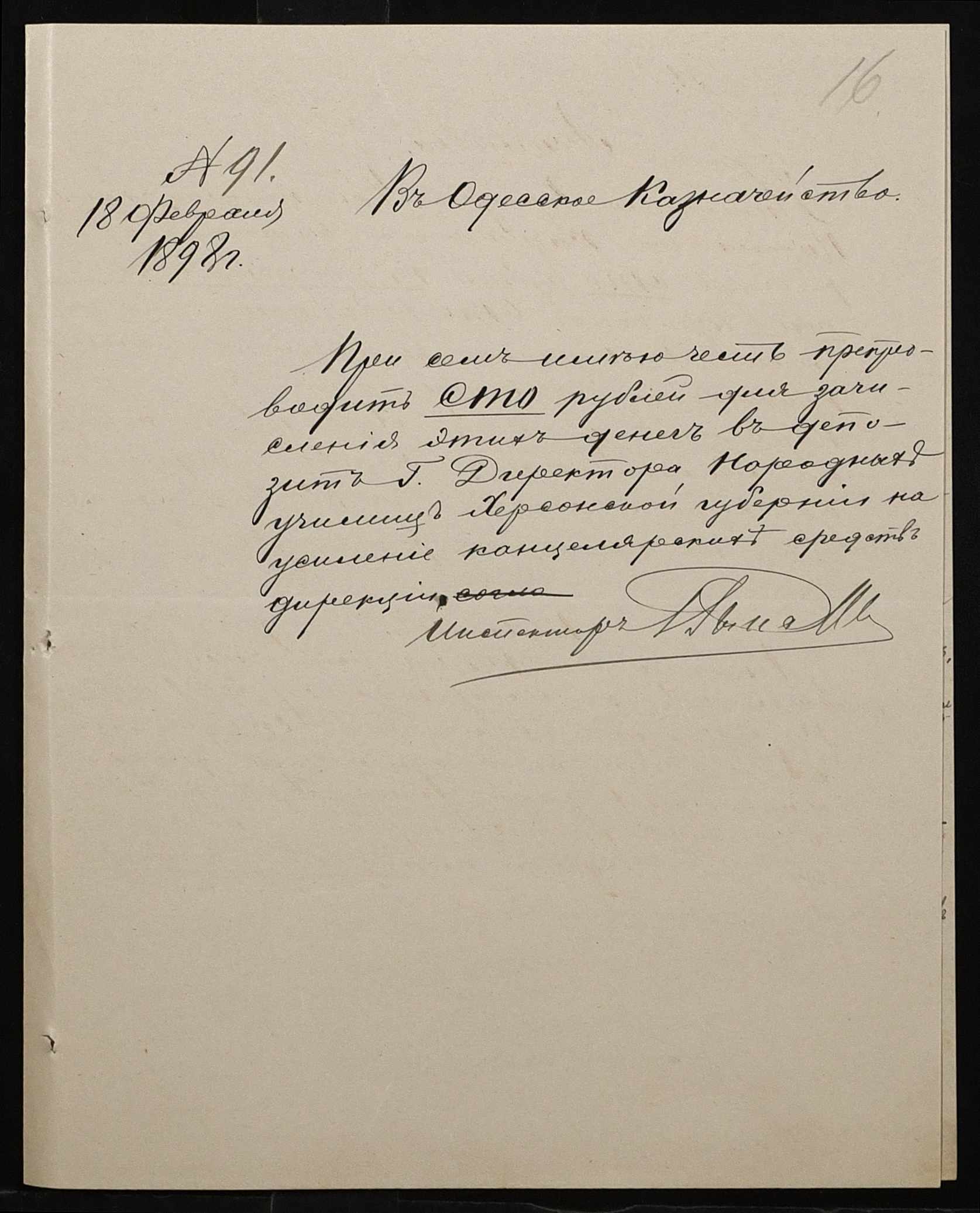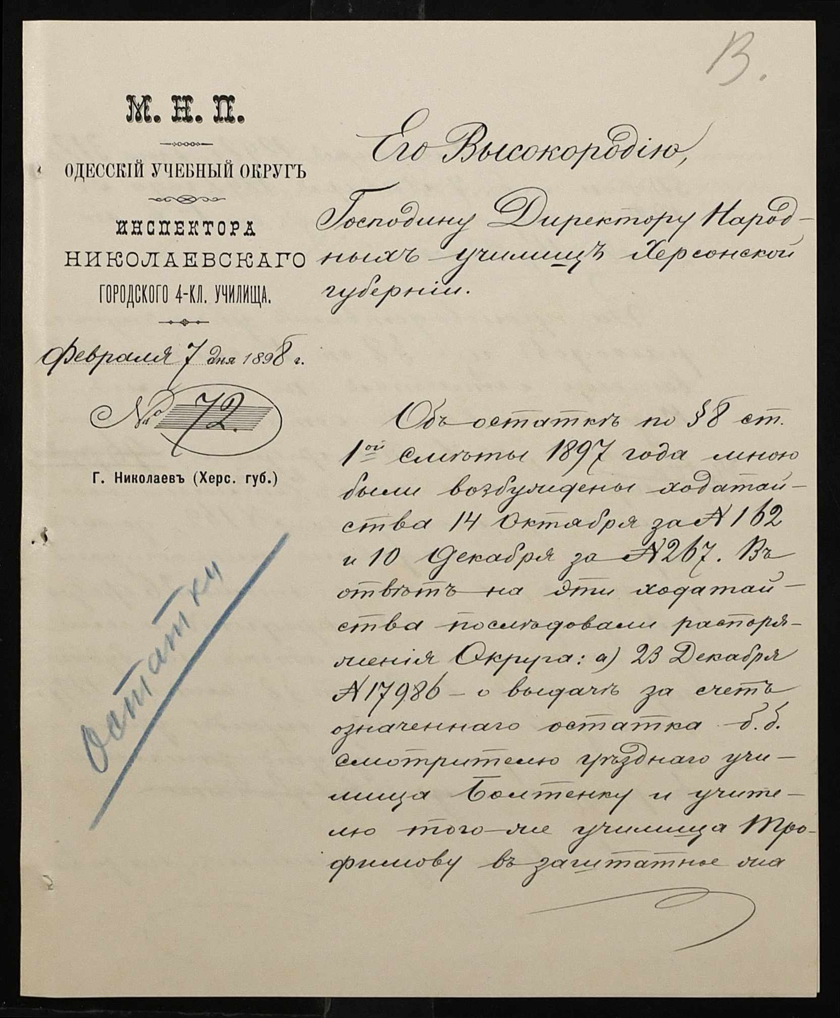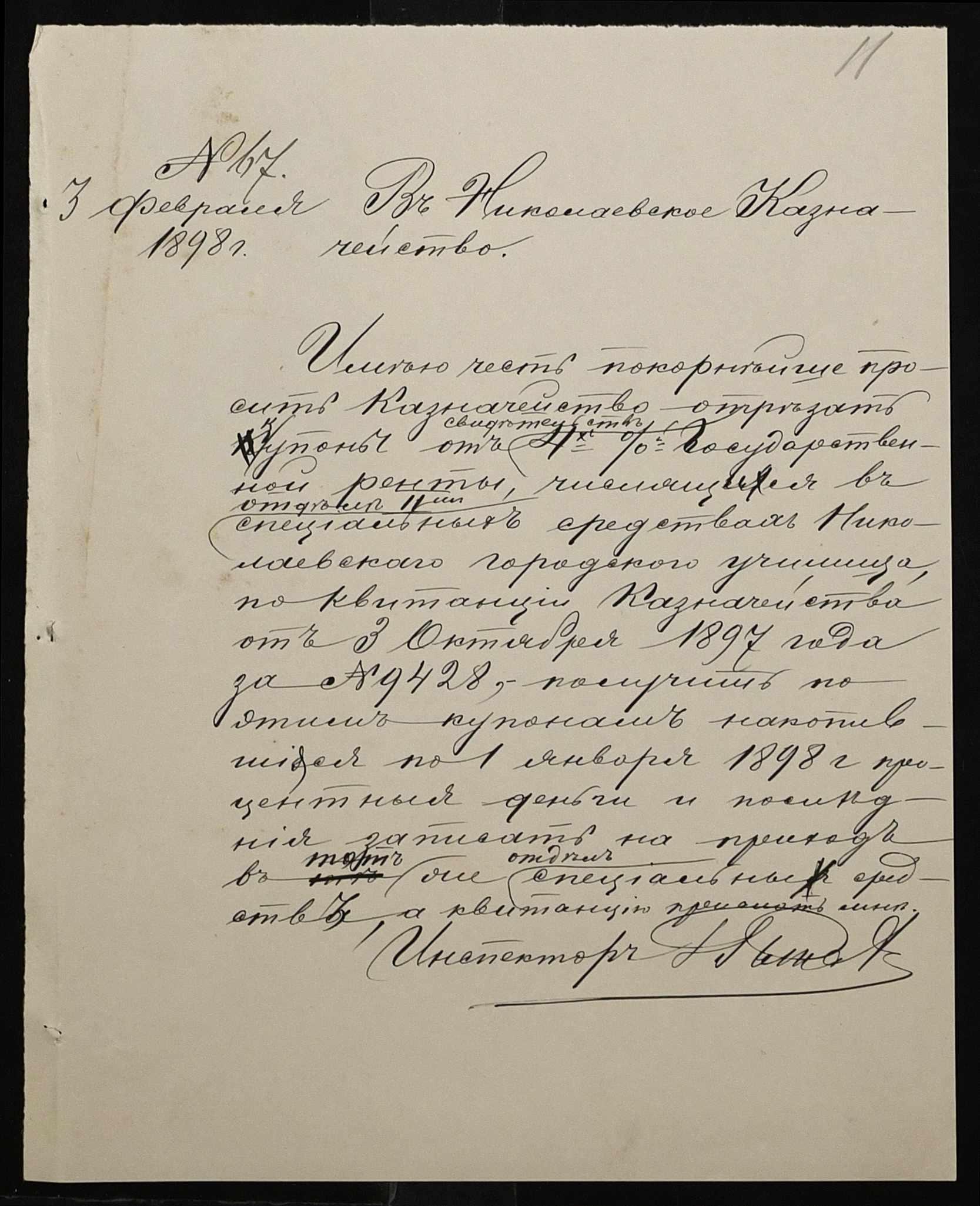 • • • • Справа № 326 “Кошторис прибутків і видатків коштів училища за 1898 рік, листування про звільнення малозабезпечених учнів від сплати за навчання”