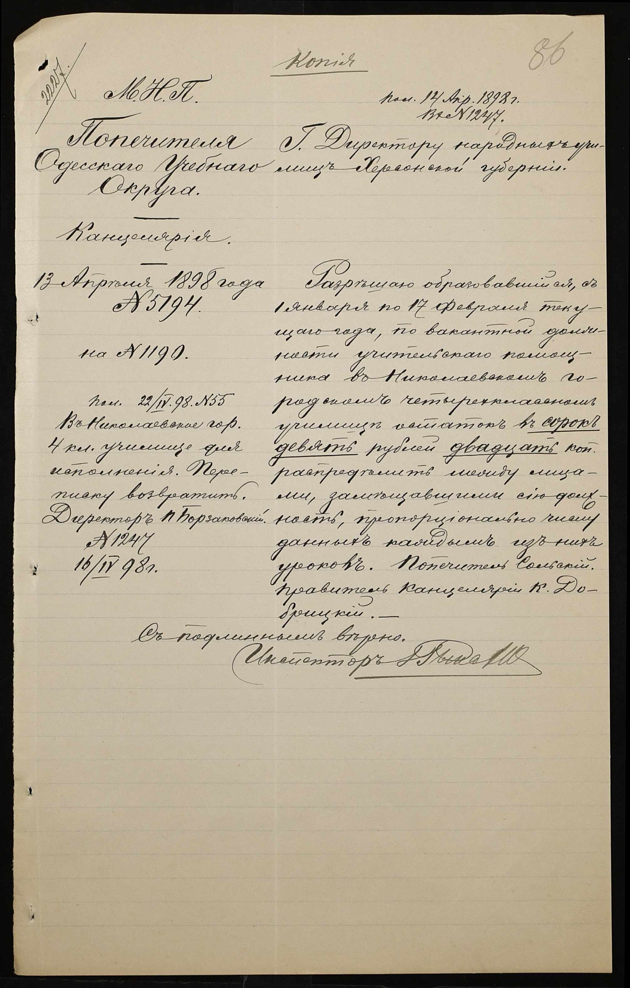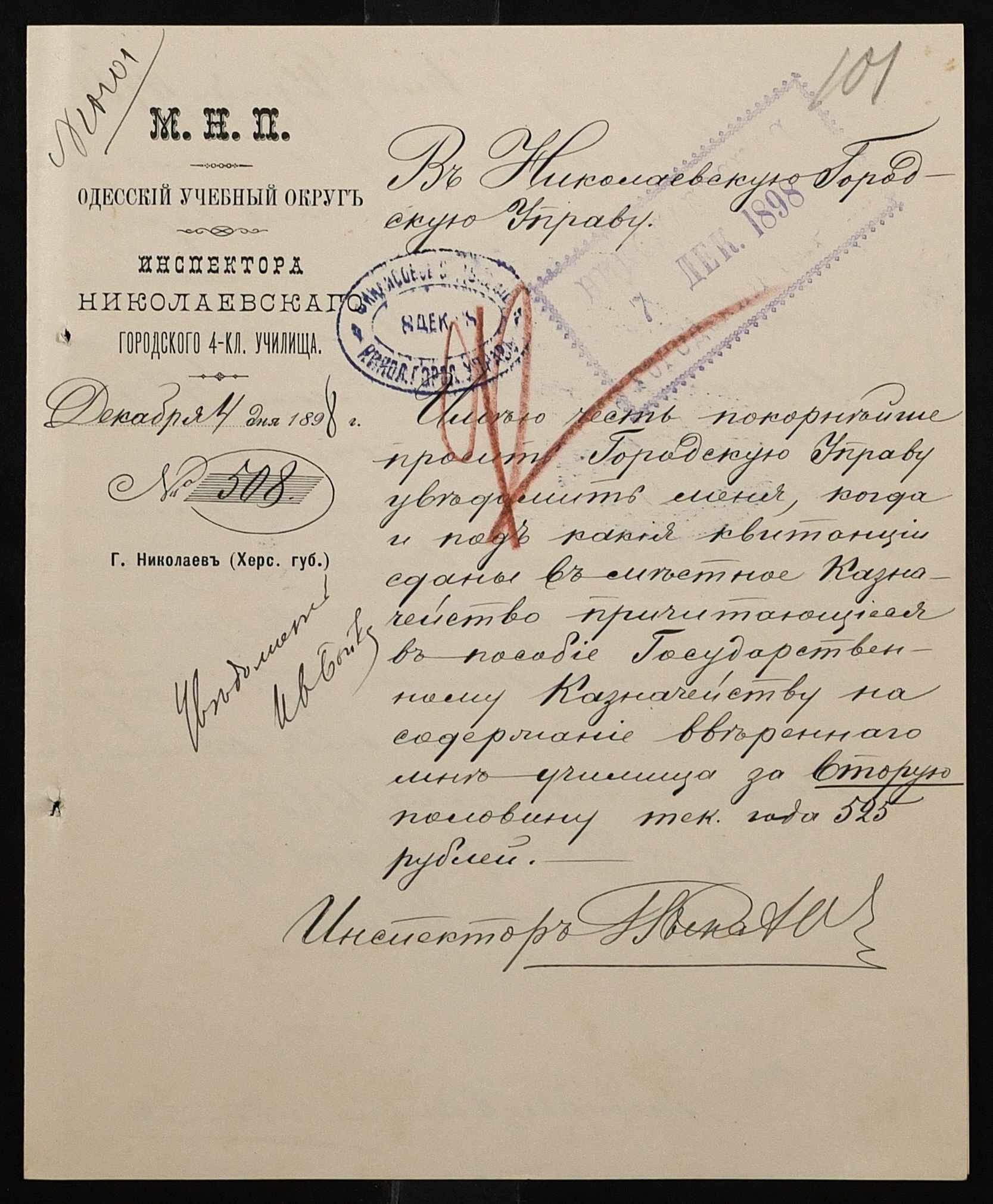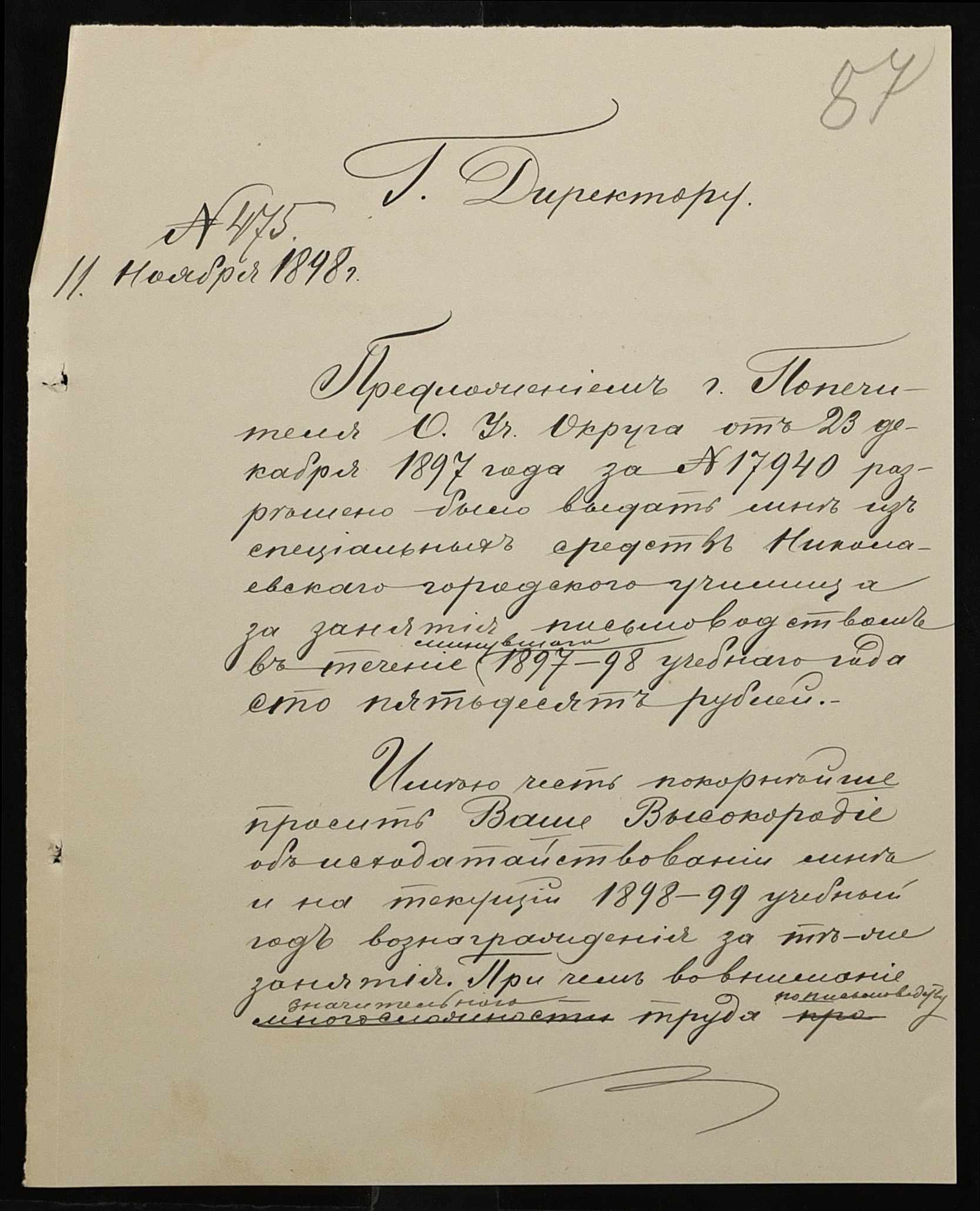 • • • • Справа № 326 “Кошторис прибутків і видатків коштів училища за 1898 рік, листування про звільнення малозабезпечених учнів від сплати за навчання”