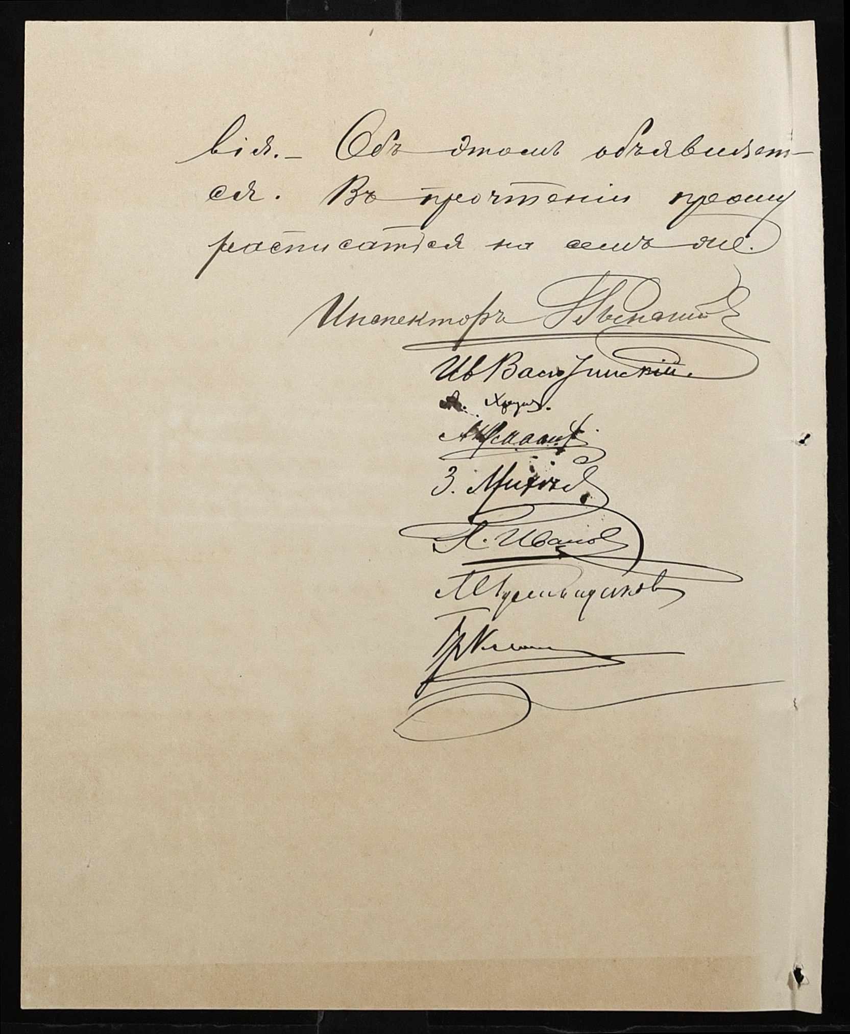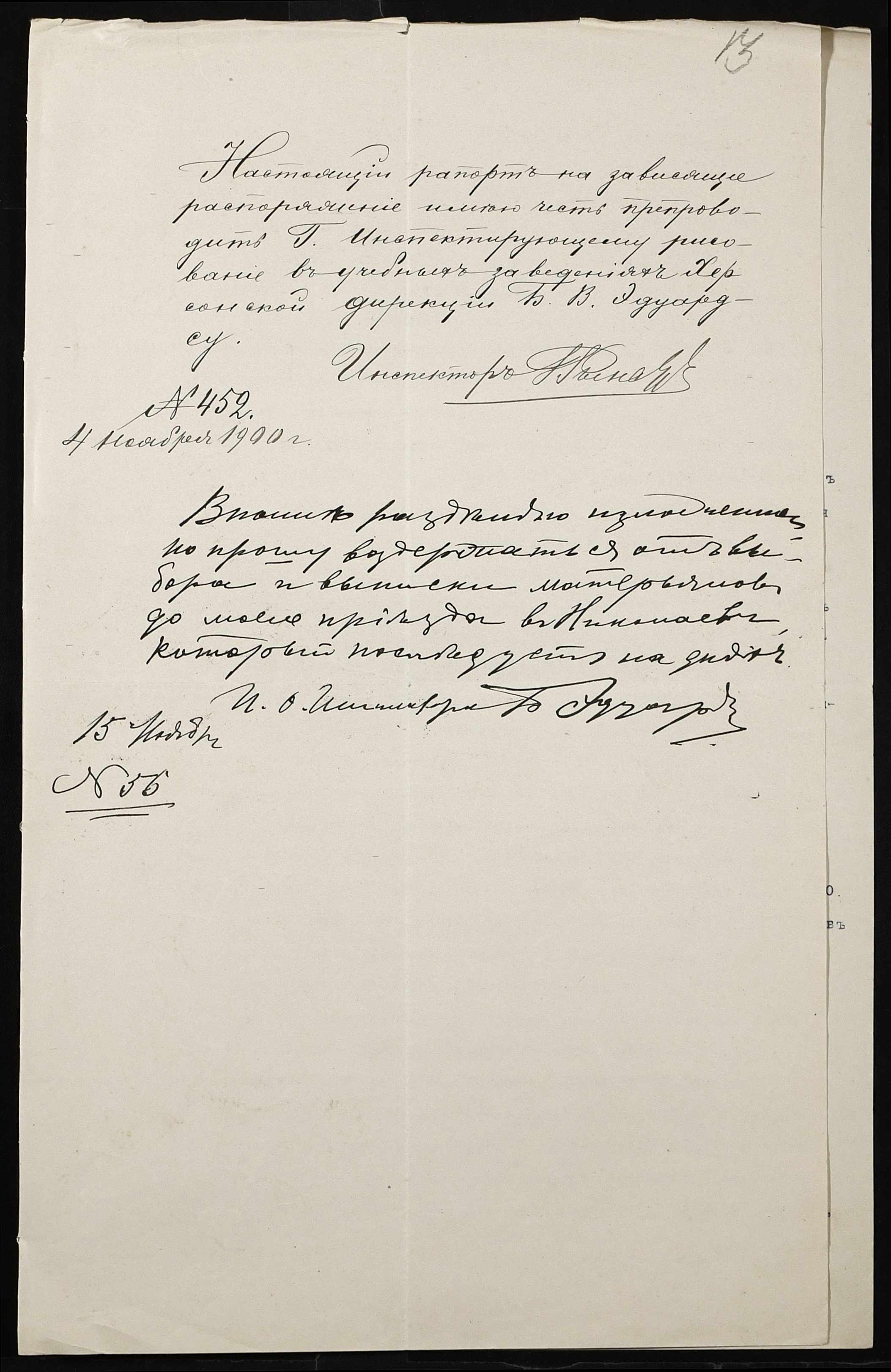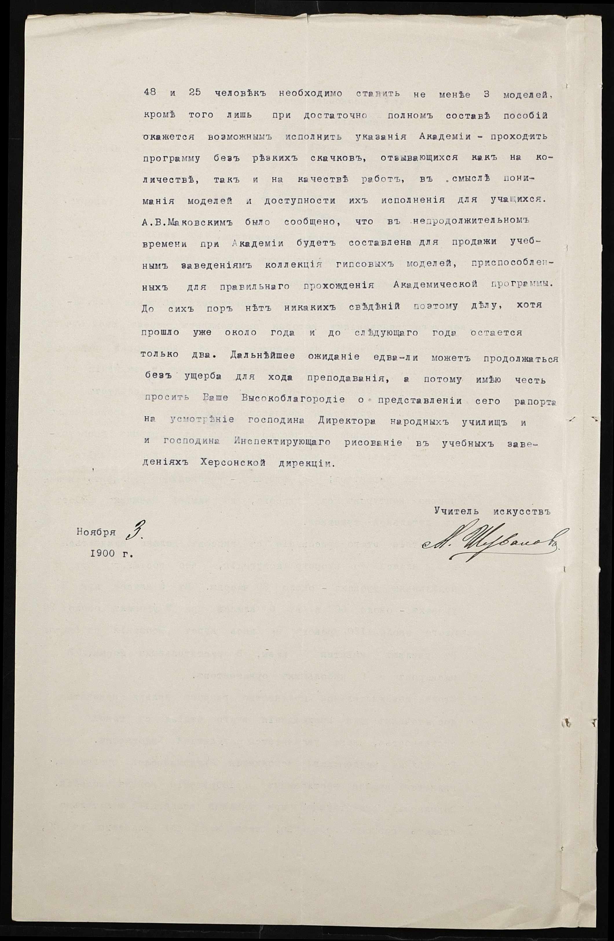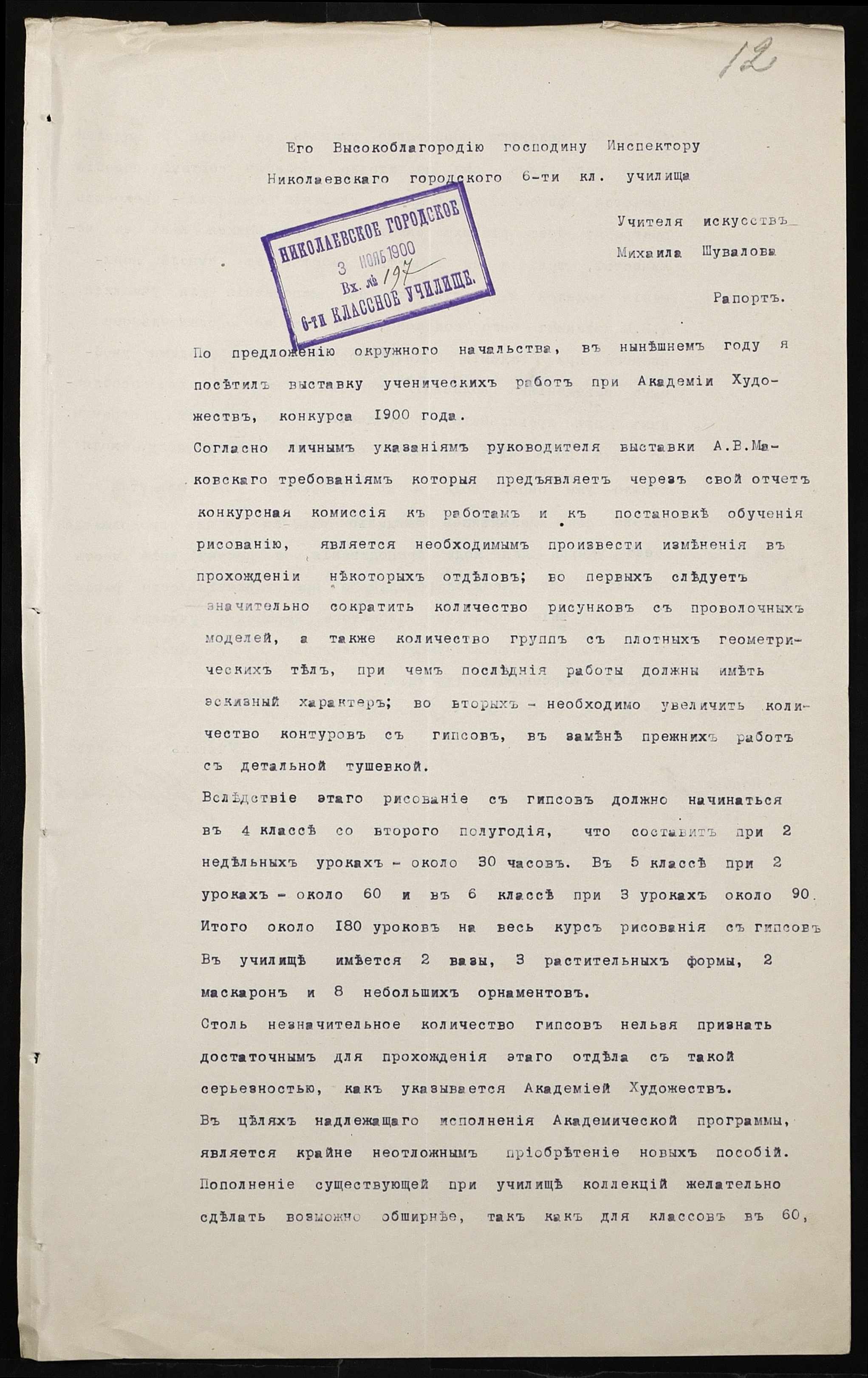 • • • • Справа № 349 “Рапорт учителя мистецтв М. Щувалова (М. Щувалова) про відвідування виставки учнівських робіт при Академії мистецтв від 3 листопада 1900 року. Листування про введення в обв’язки педагогів нагляд за поведінкою учнів поза межами училища”