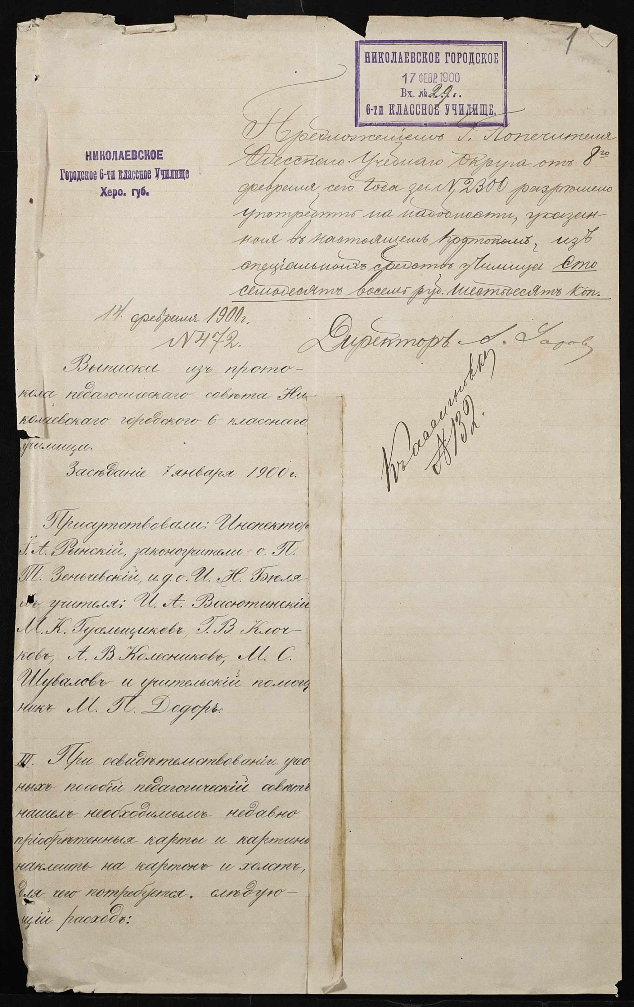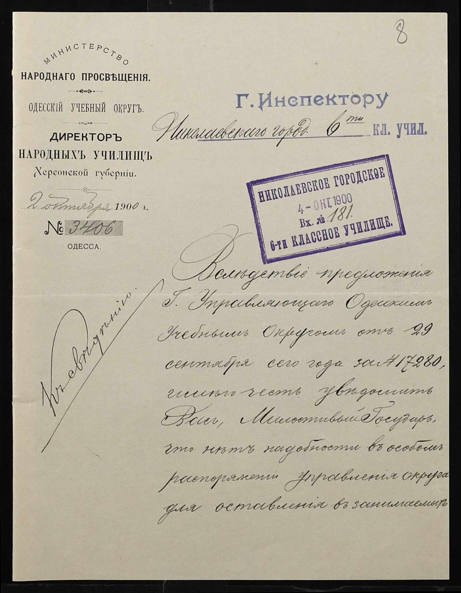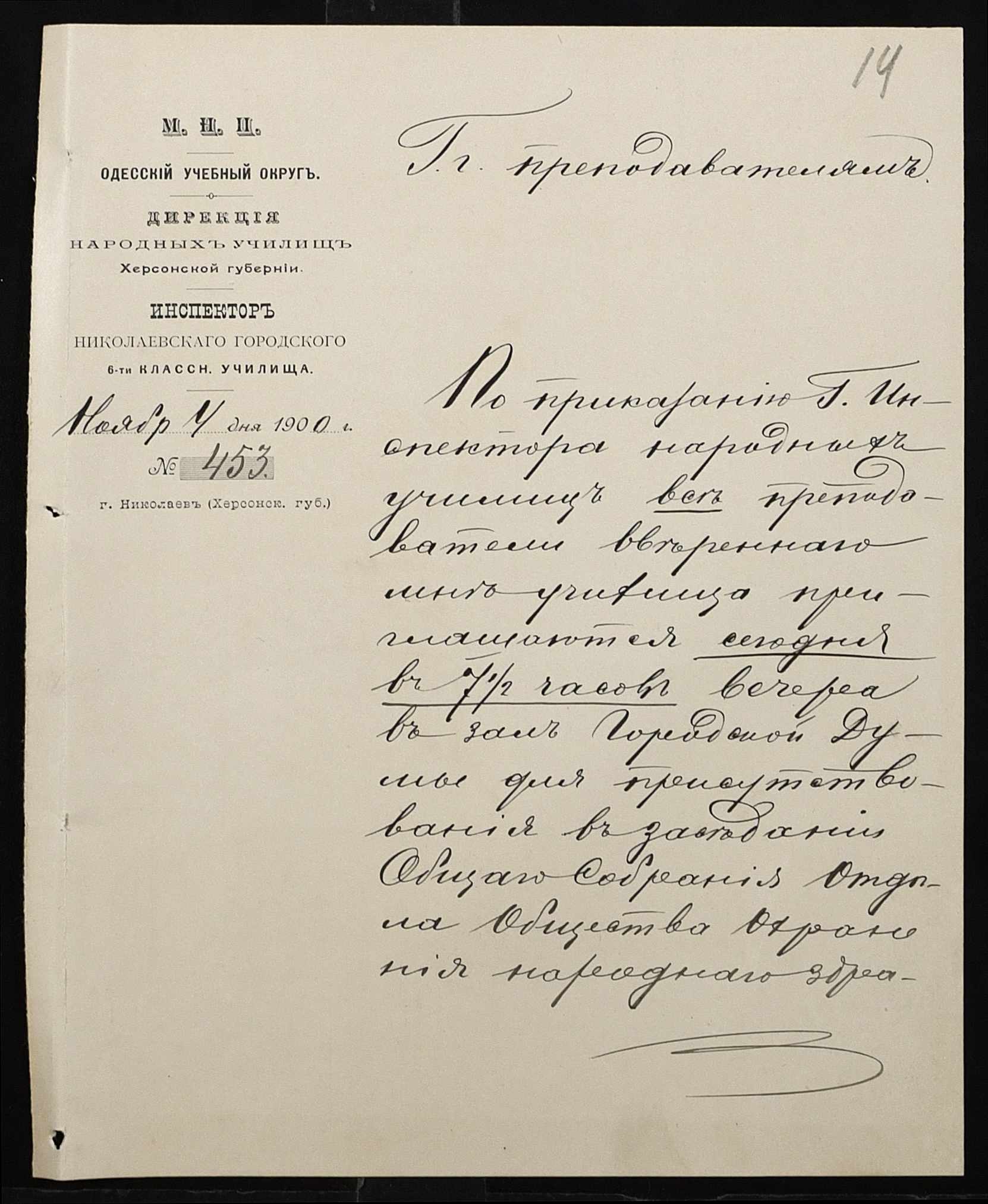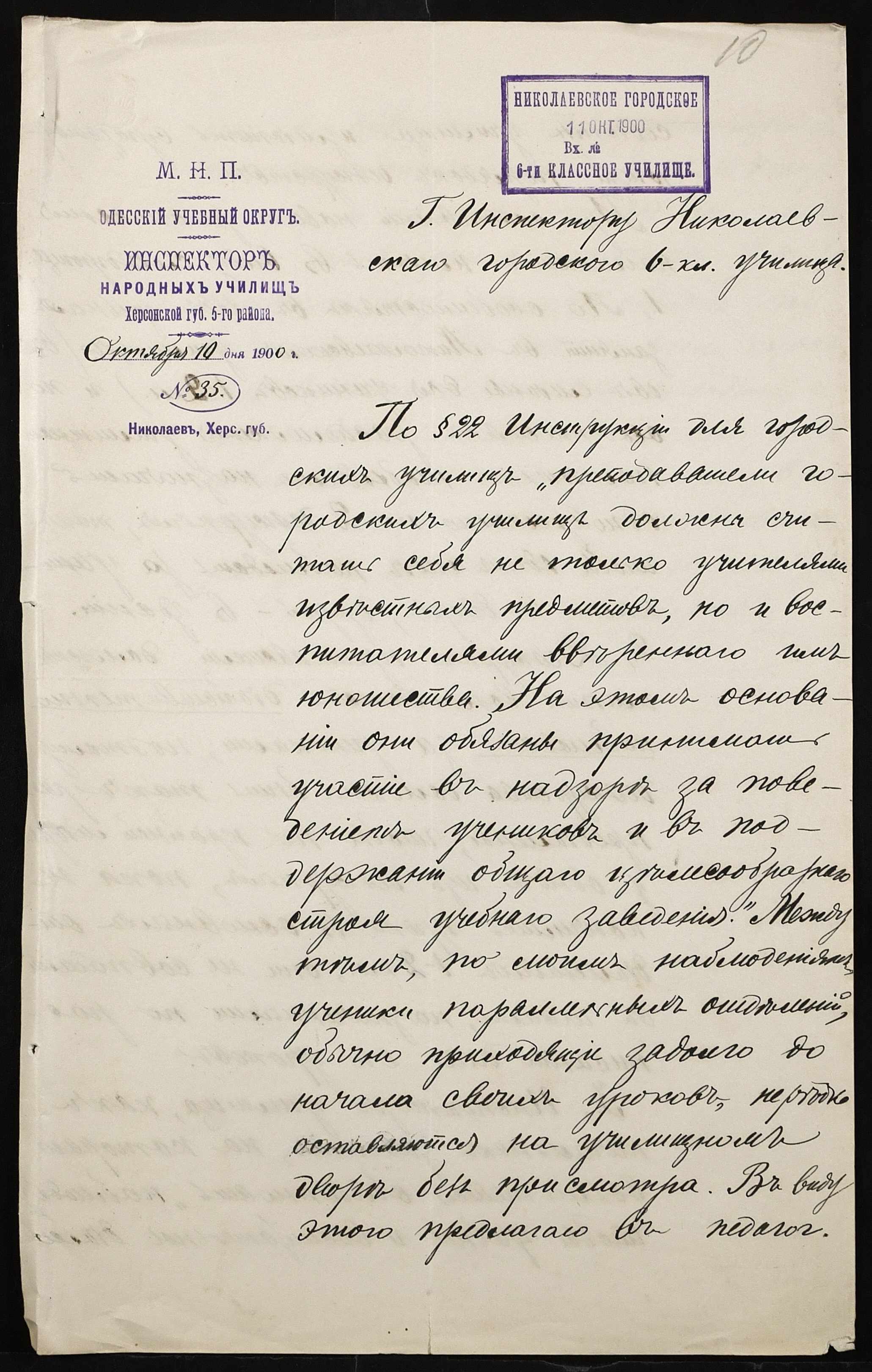 • • • • Справа № 349 “Рапорт учителя мистецтв М. Щувалова (М. Щувалова) про відвідування виставки учнівських робіт при Академії мистецтв від 3 листопада 1900 року. Листування про введення в обв’язки педагогів нагляд за поведінкою учнів поза межами училища”