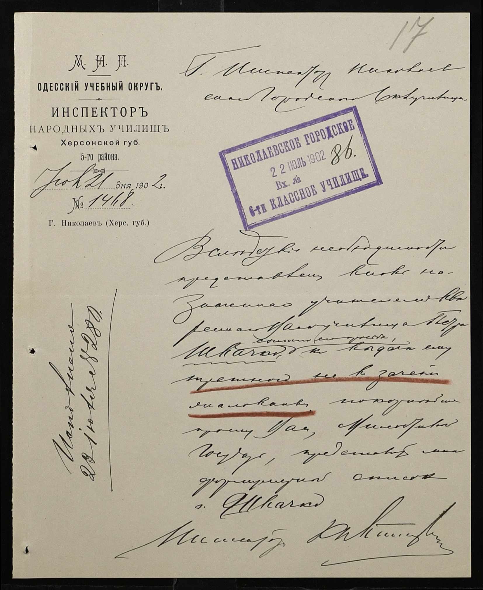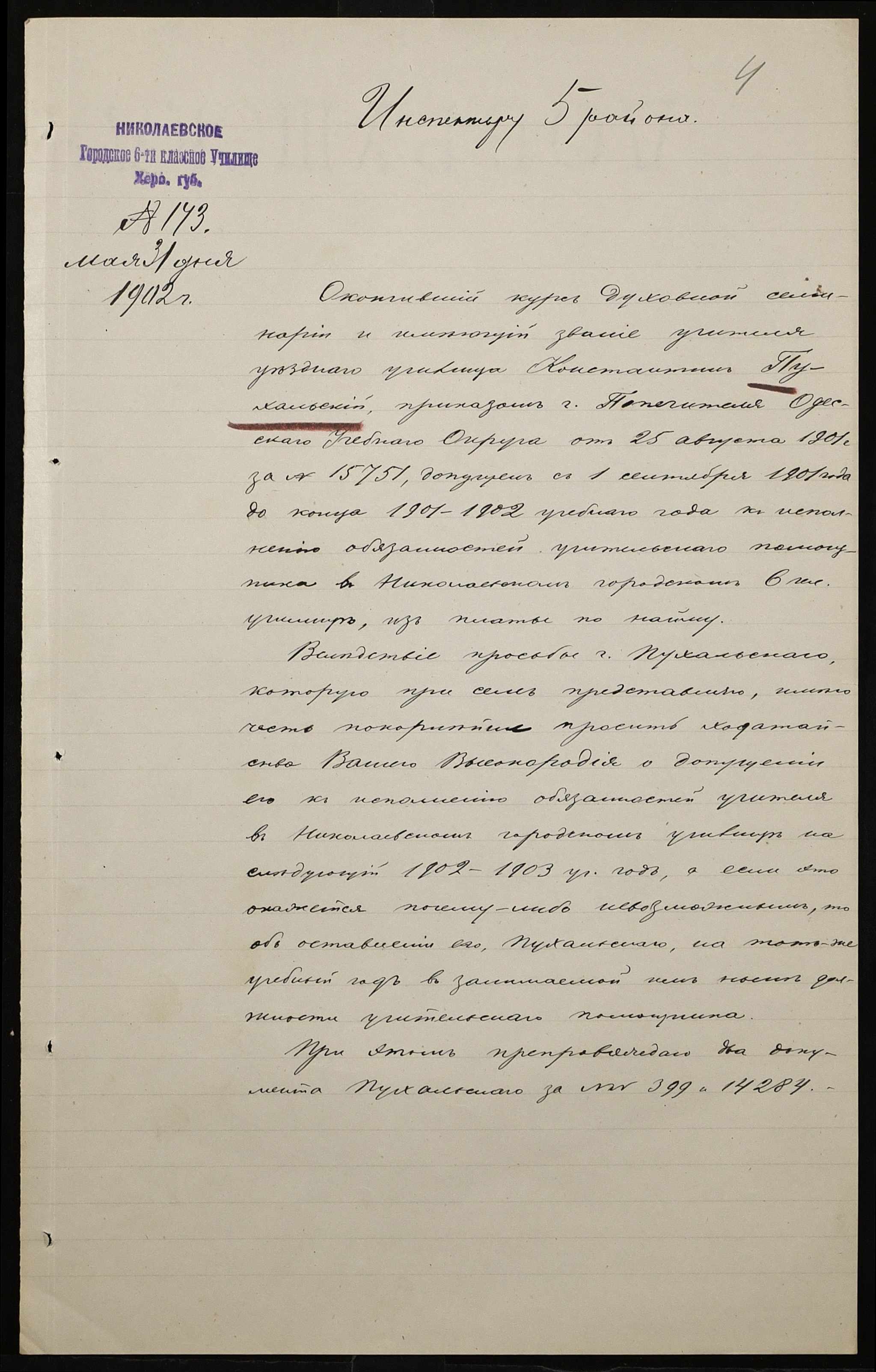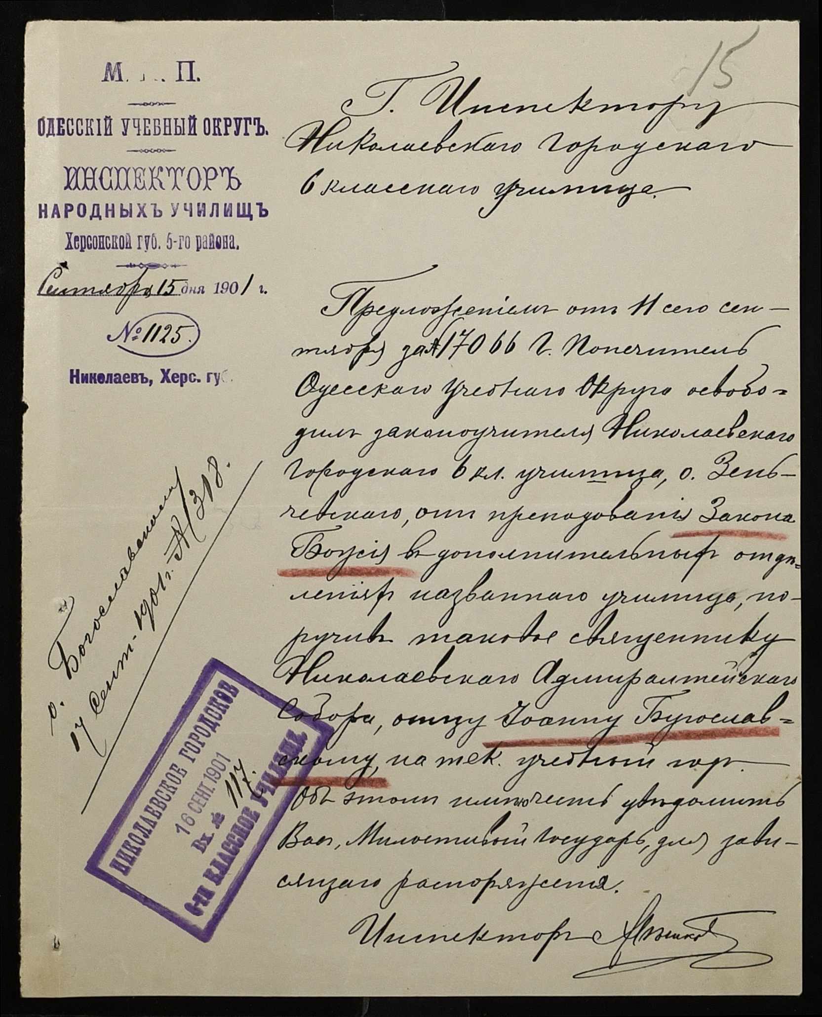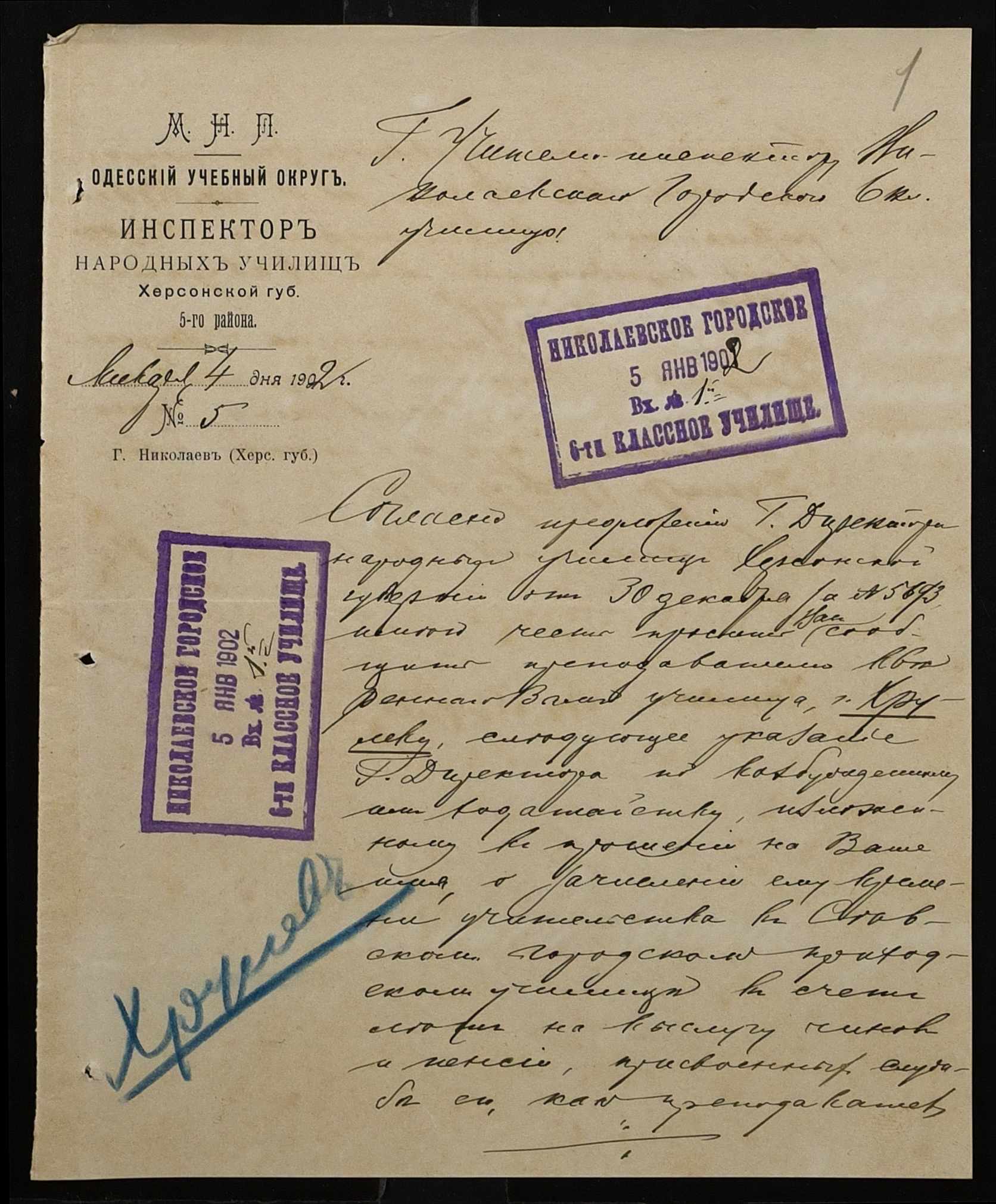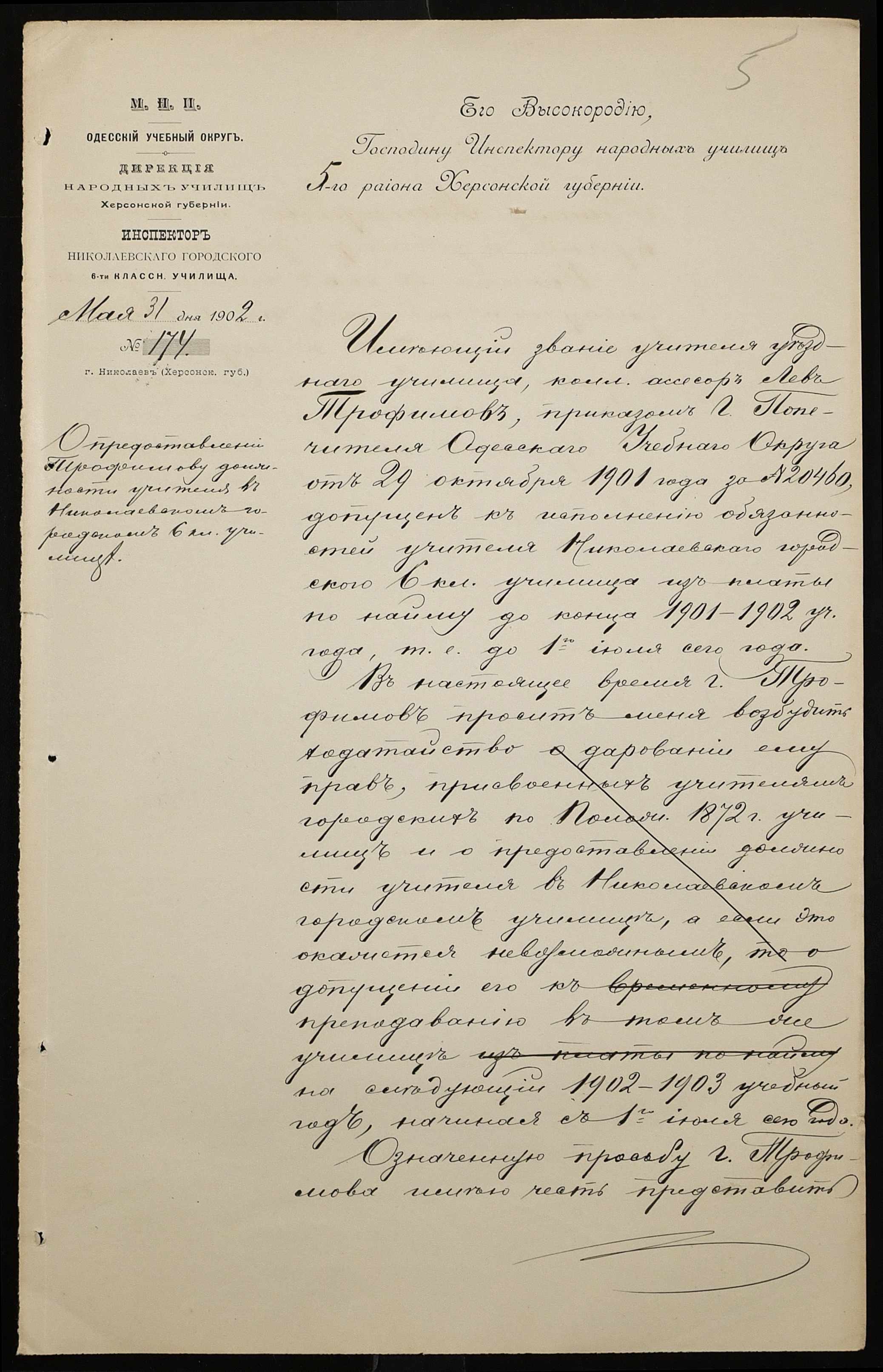 • • • • Справа № 377 “Листування з інспектором народних училищ 5-го району Херсонської губернії з особового складу”