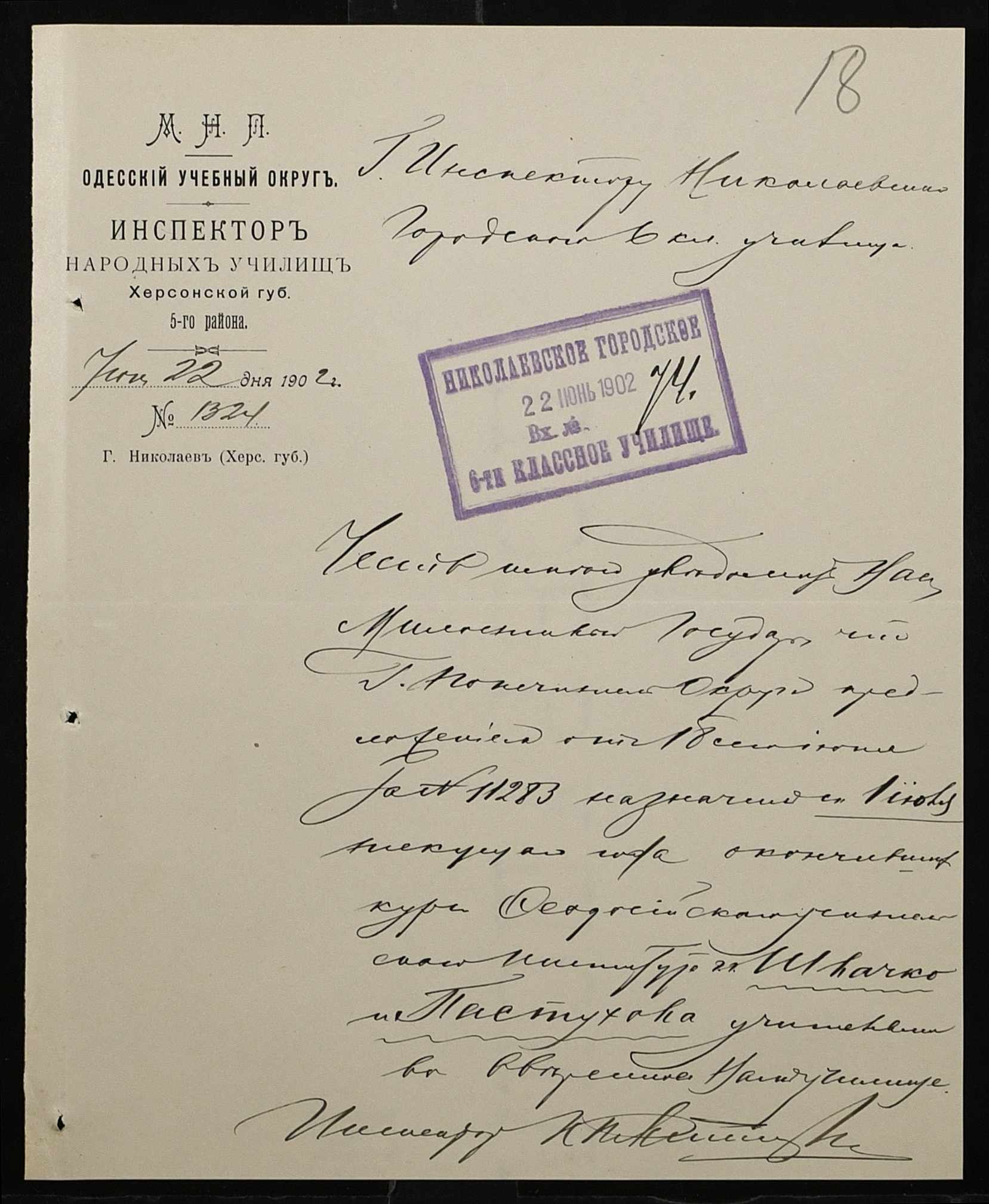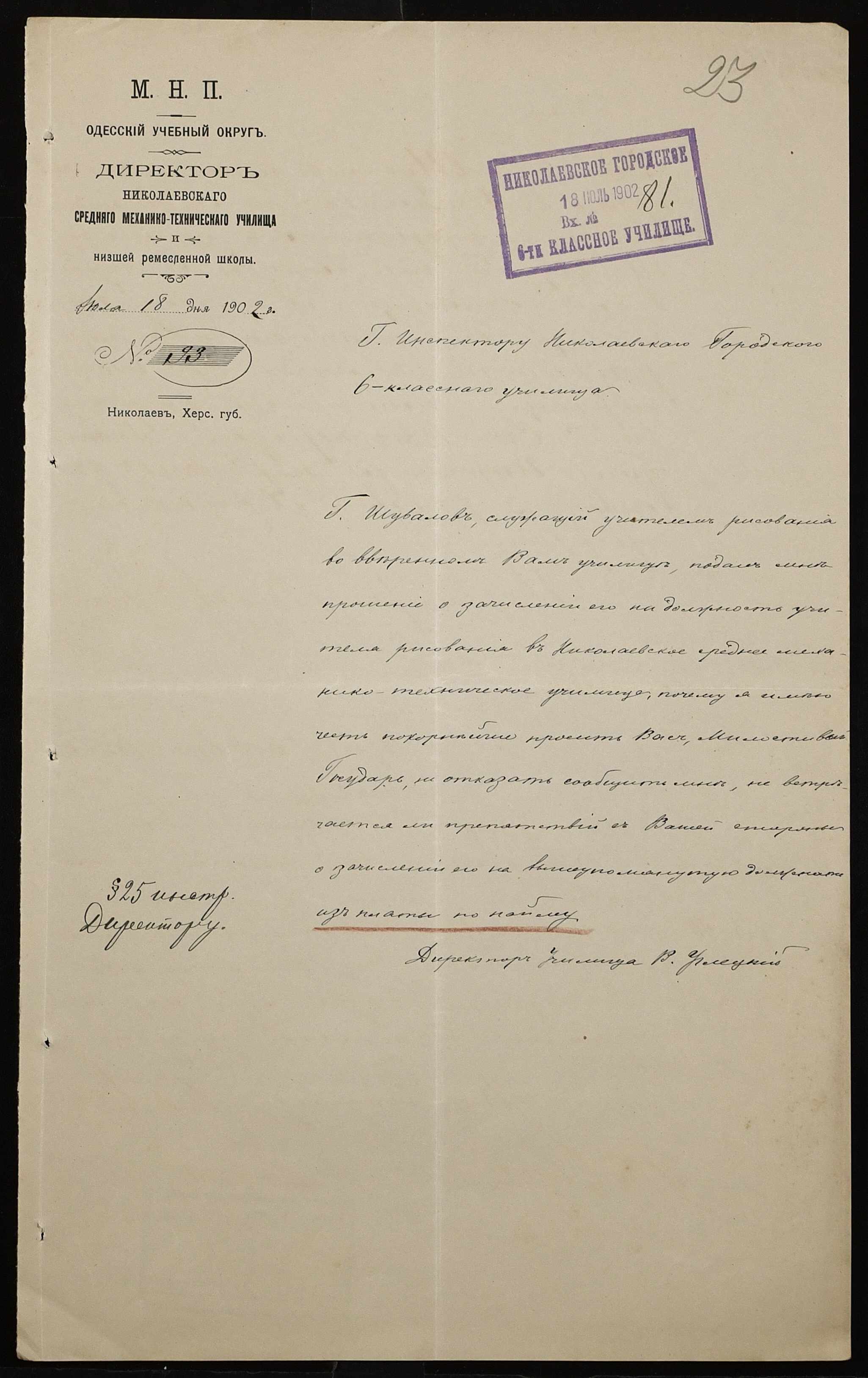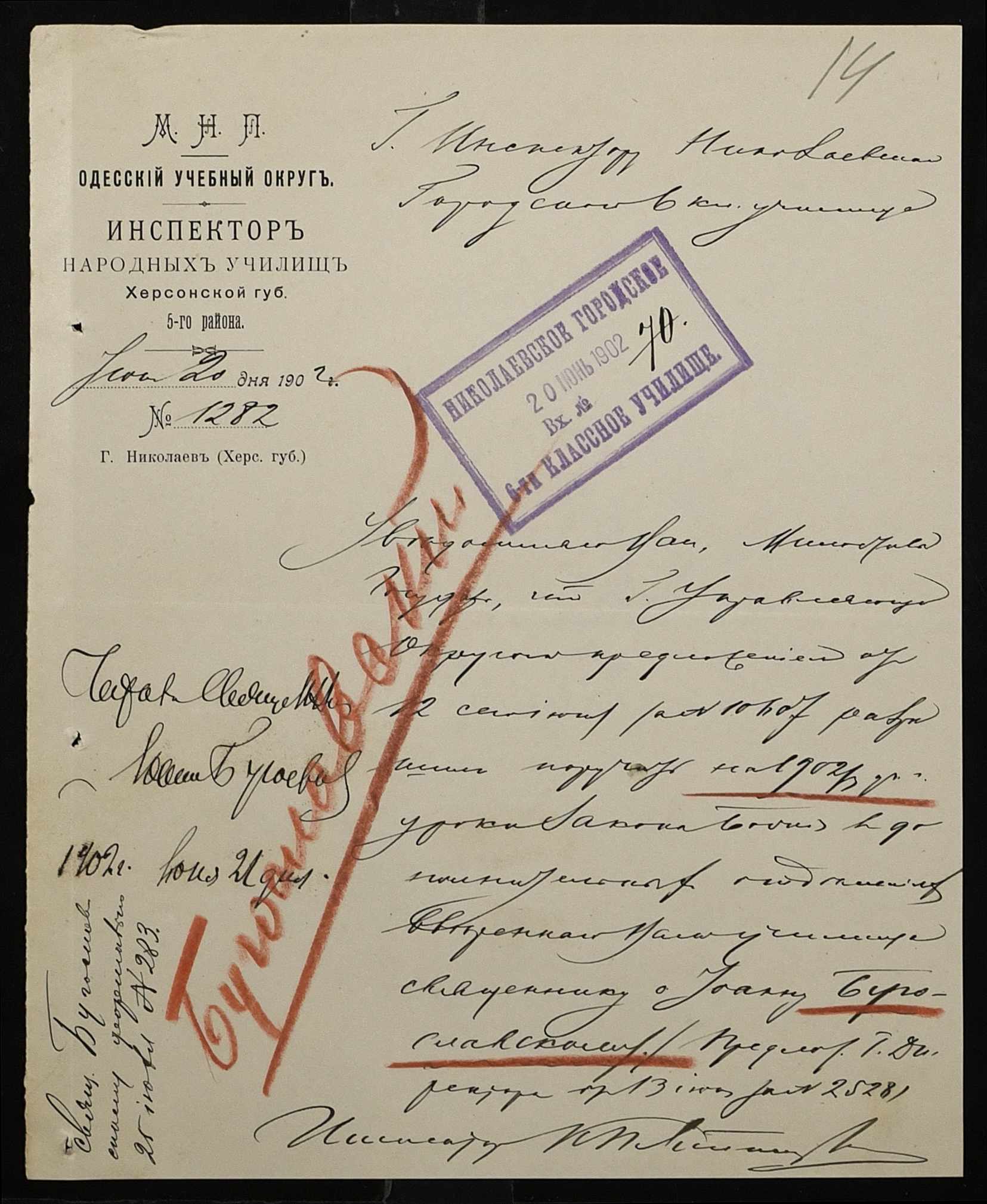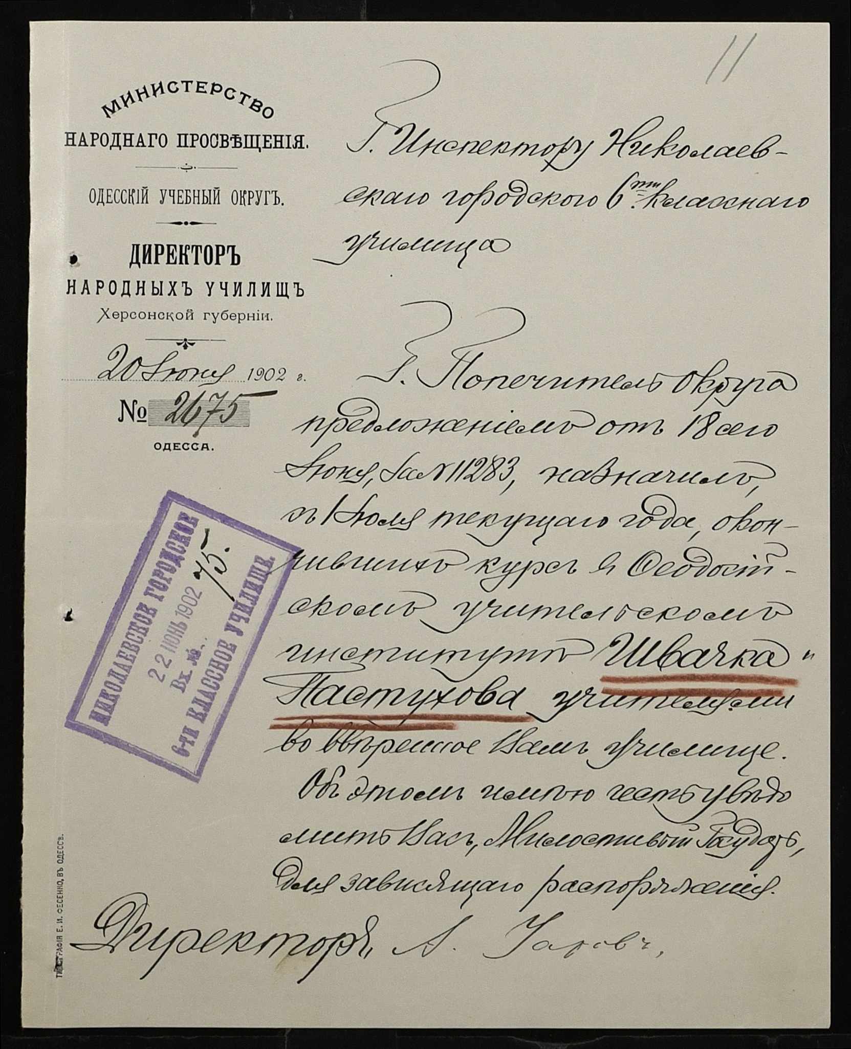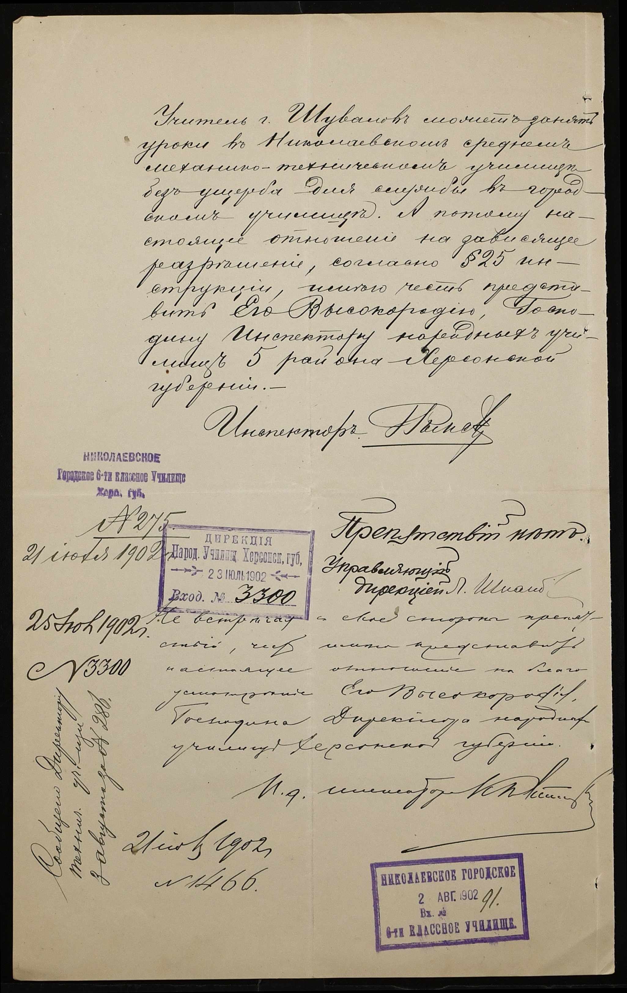 • • • • Справа № 377 “Листування з інспектором народних училищ 5-го району Херсонської губернії з особового складу”