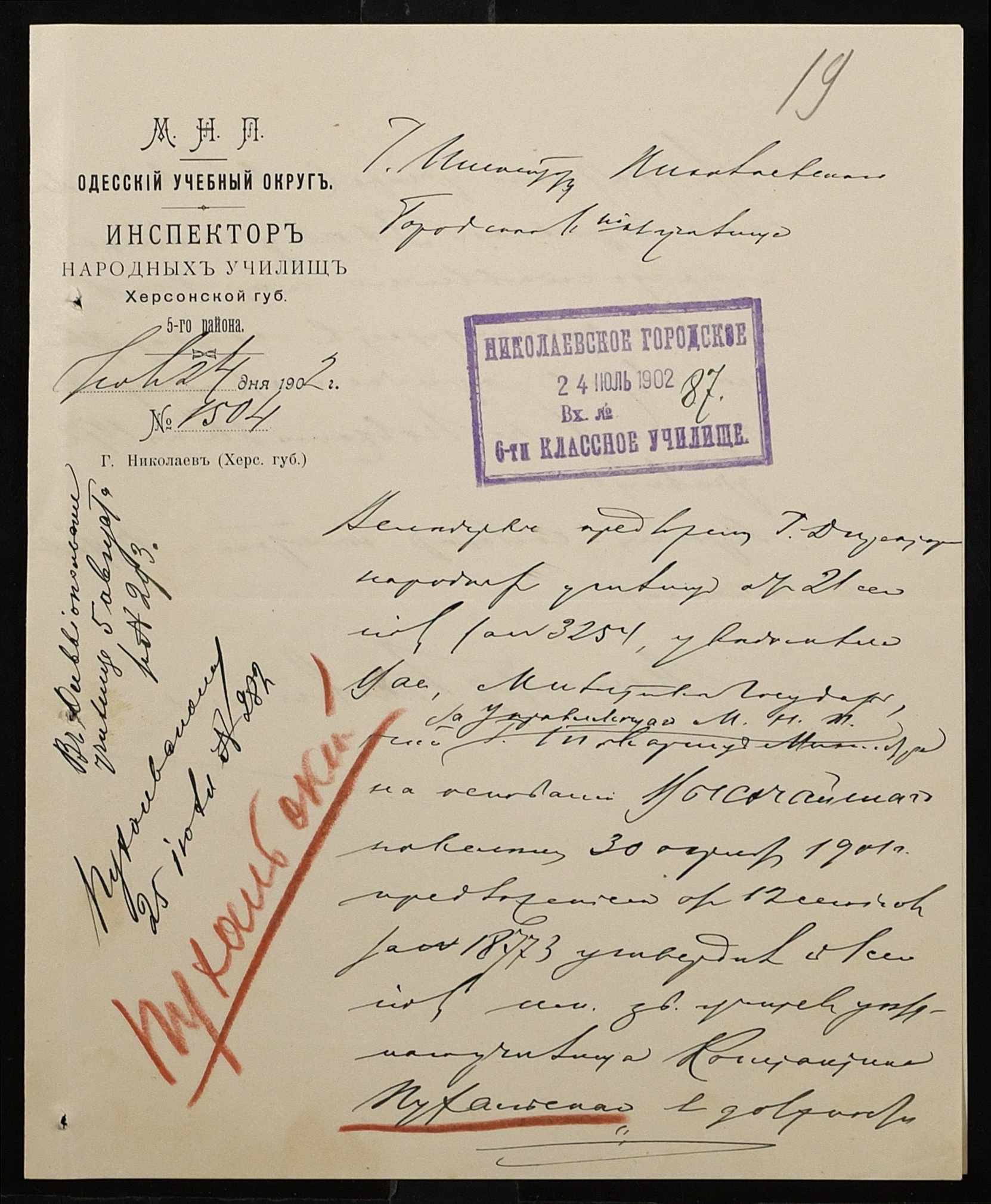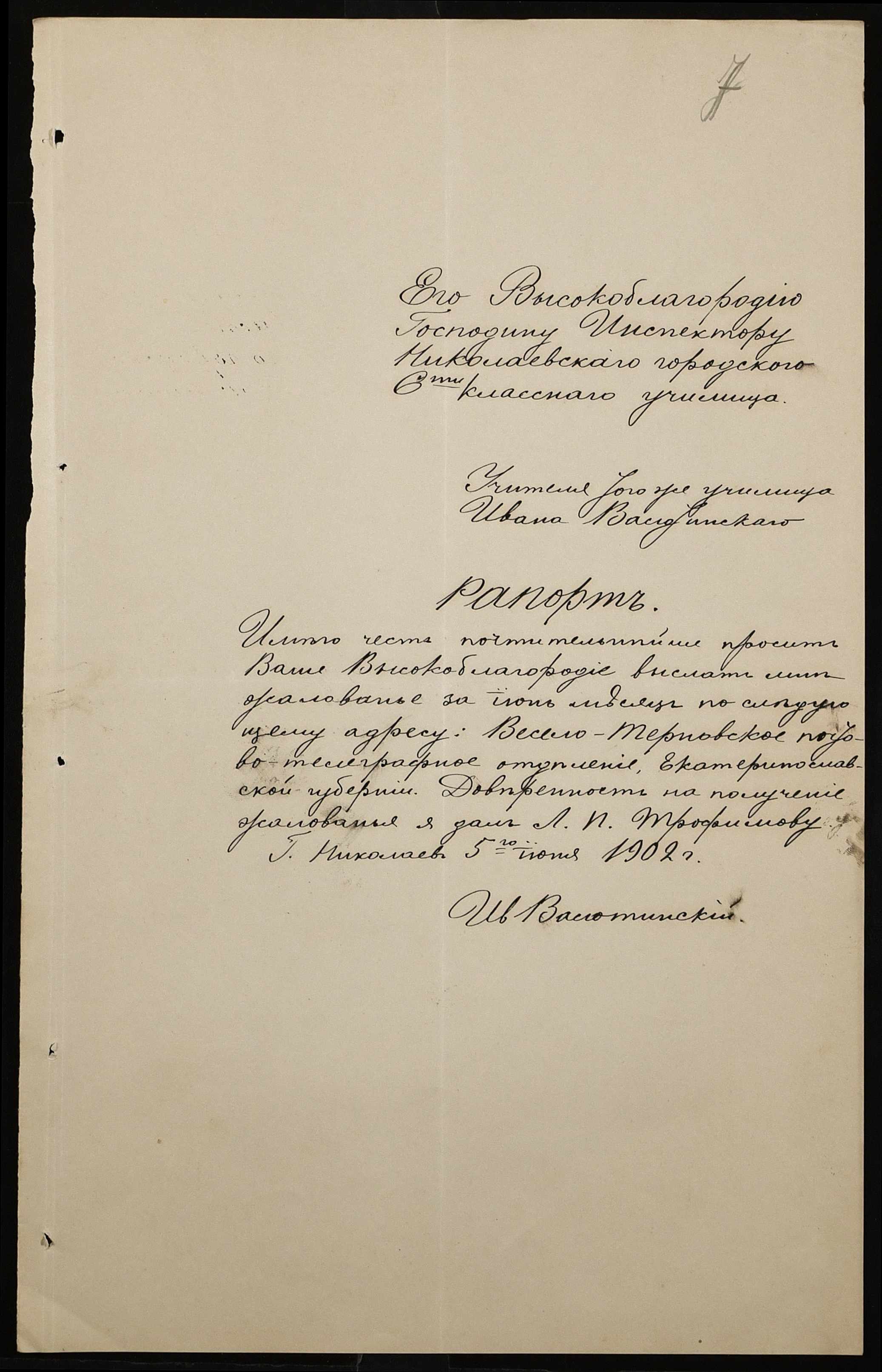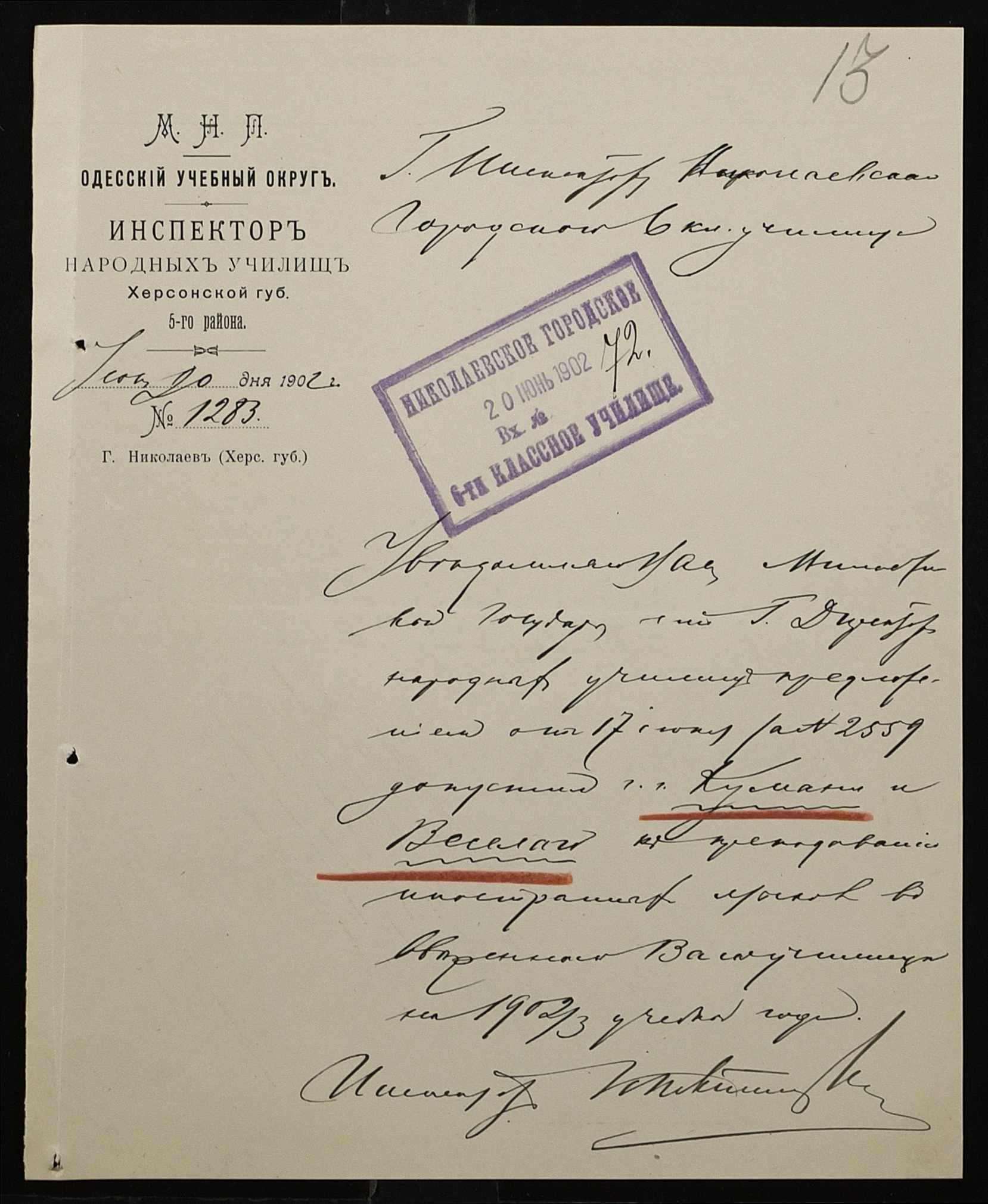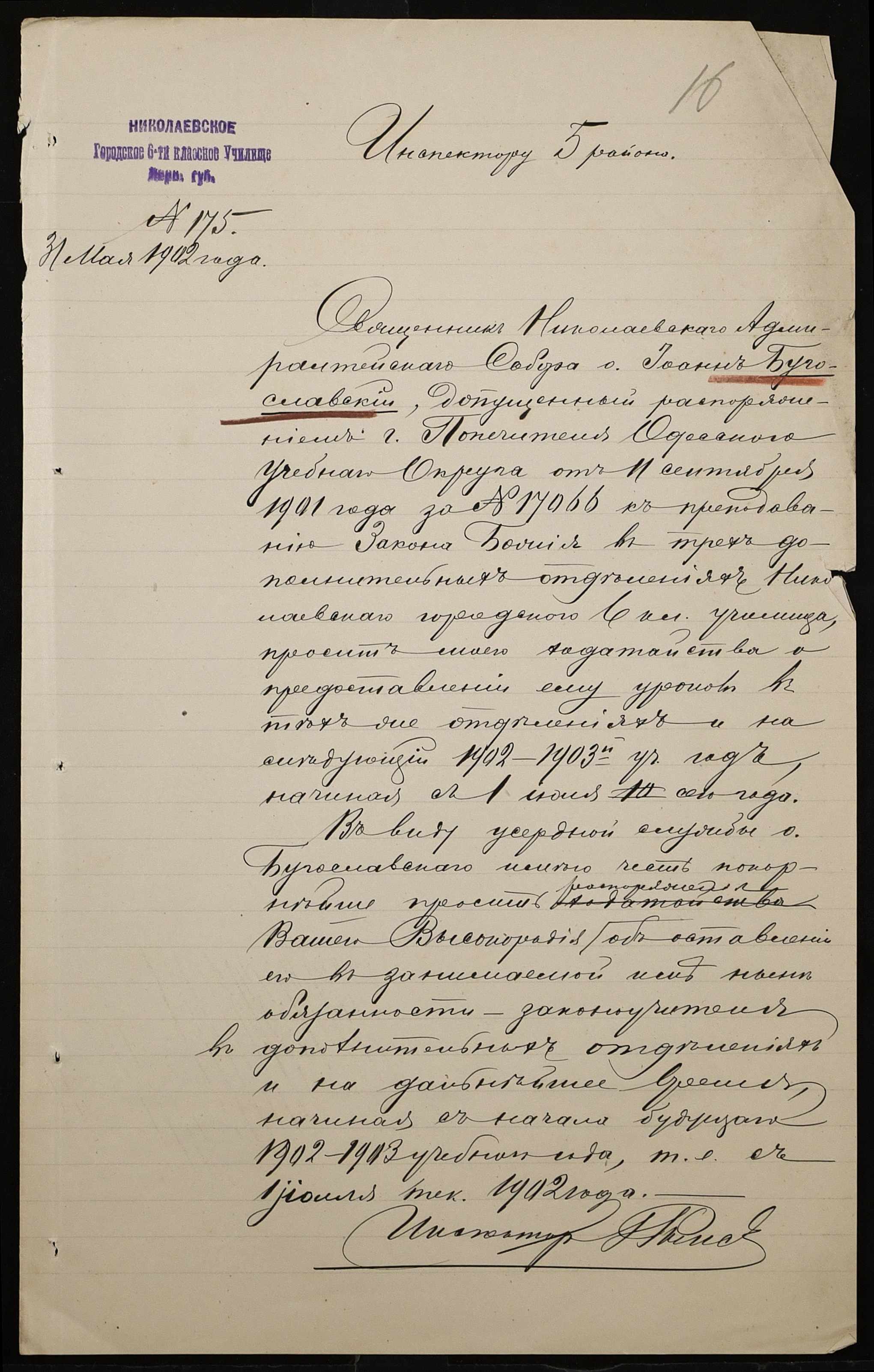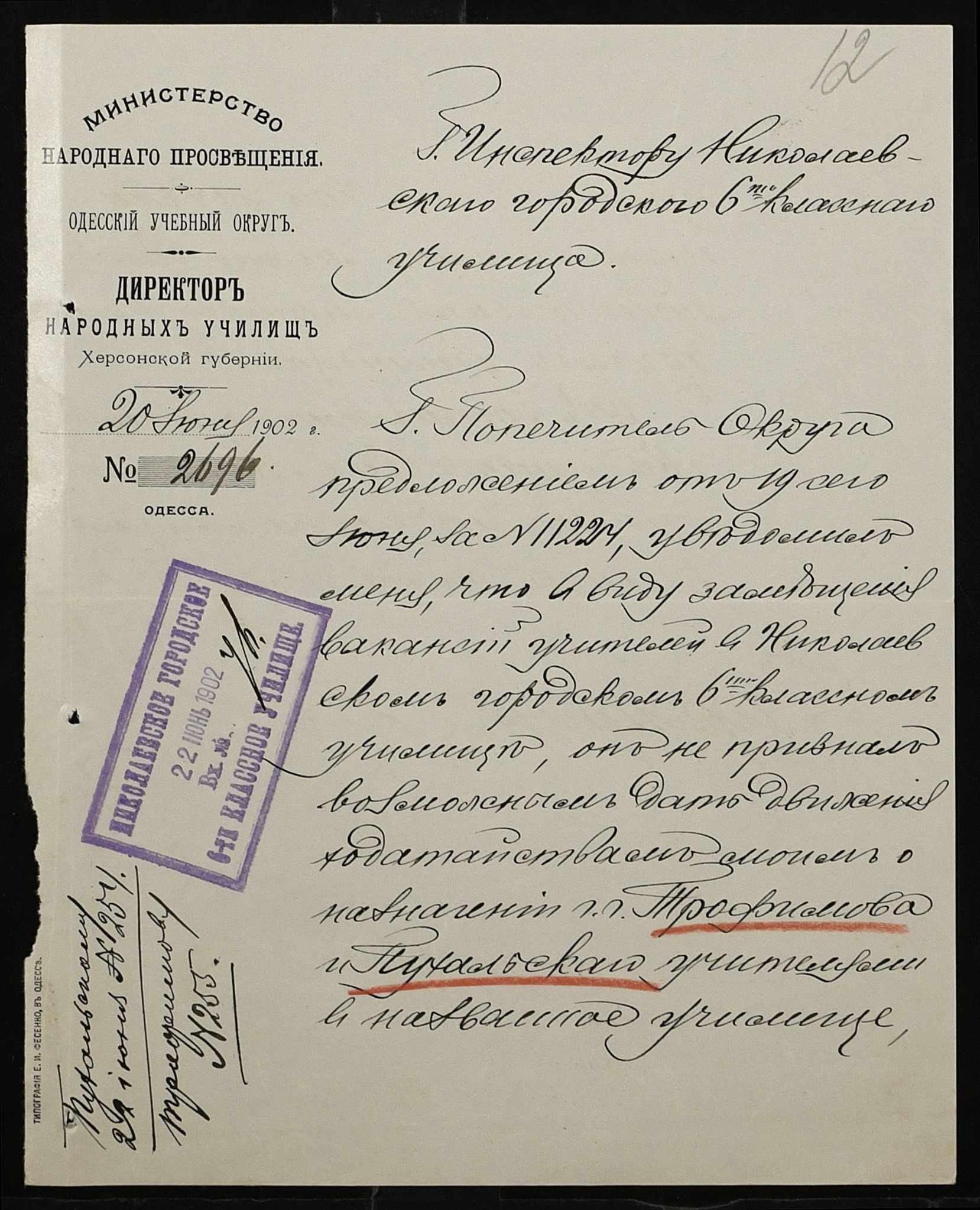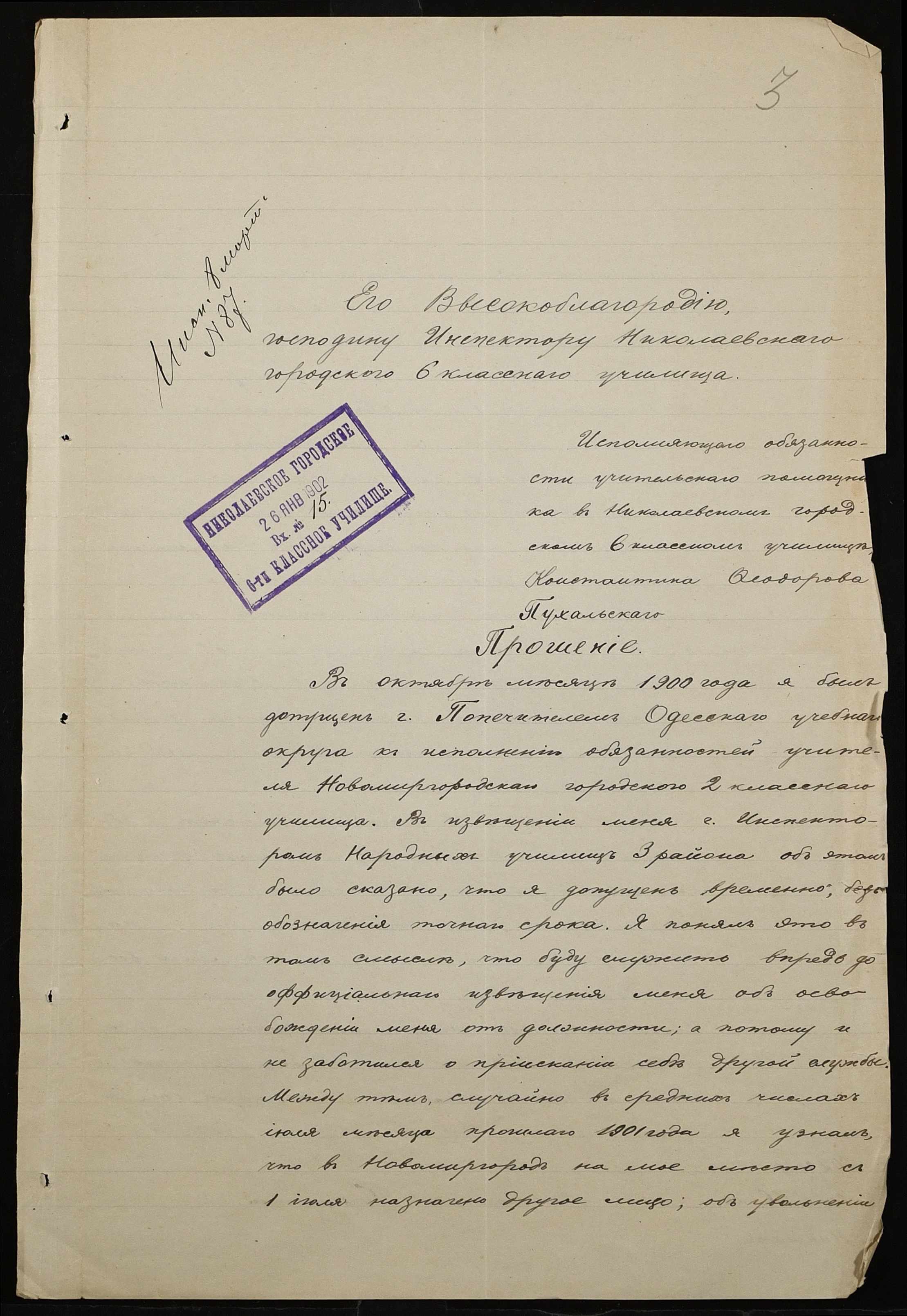 • • • • Справа № 377 “Листування з інспектором народних училищ 5-го району Херсонської губернії з особового складу”