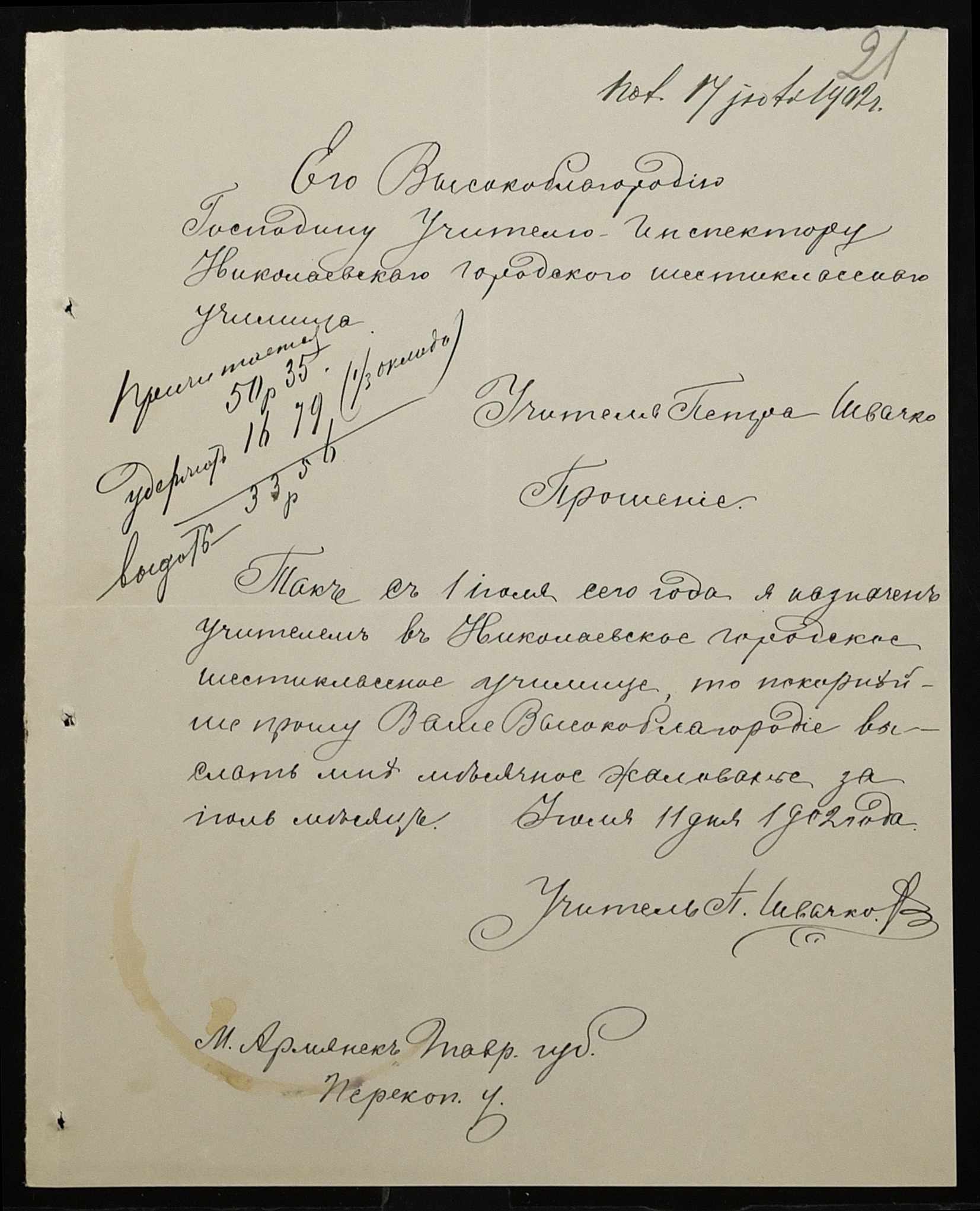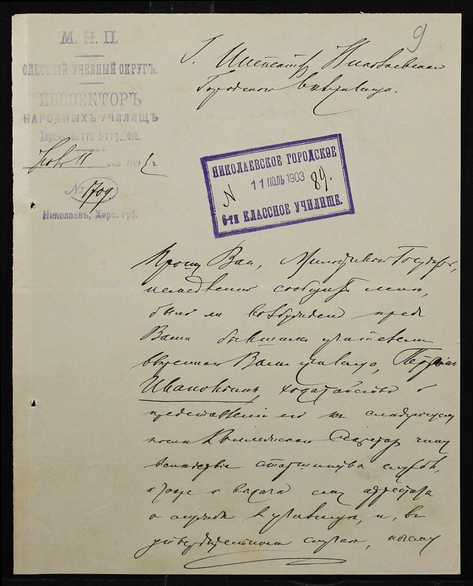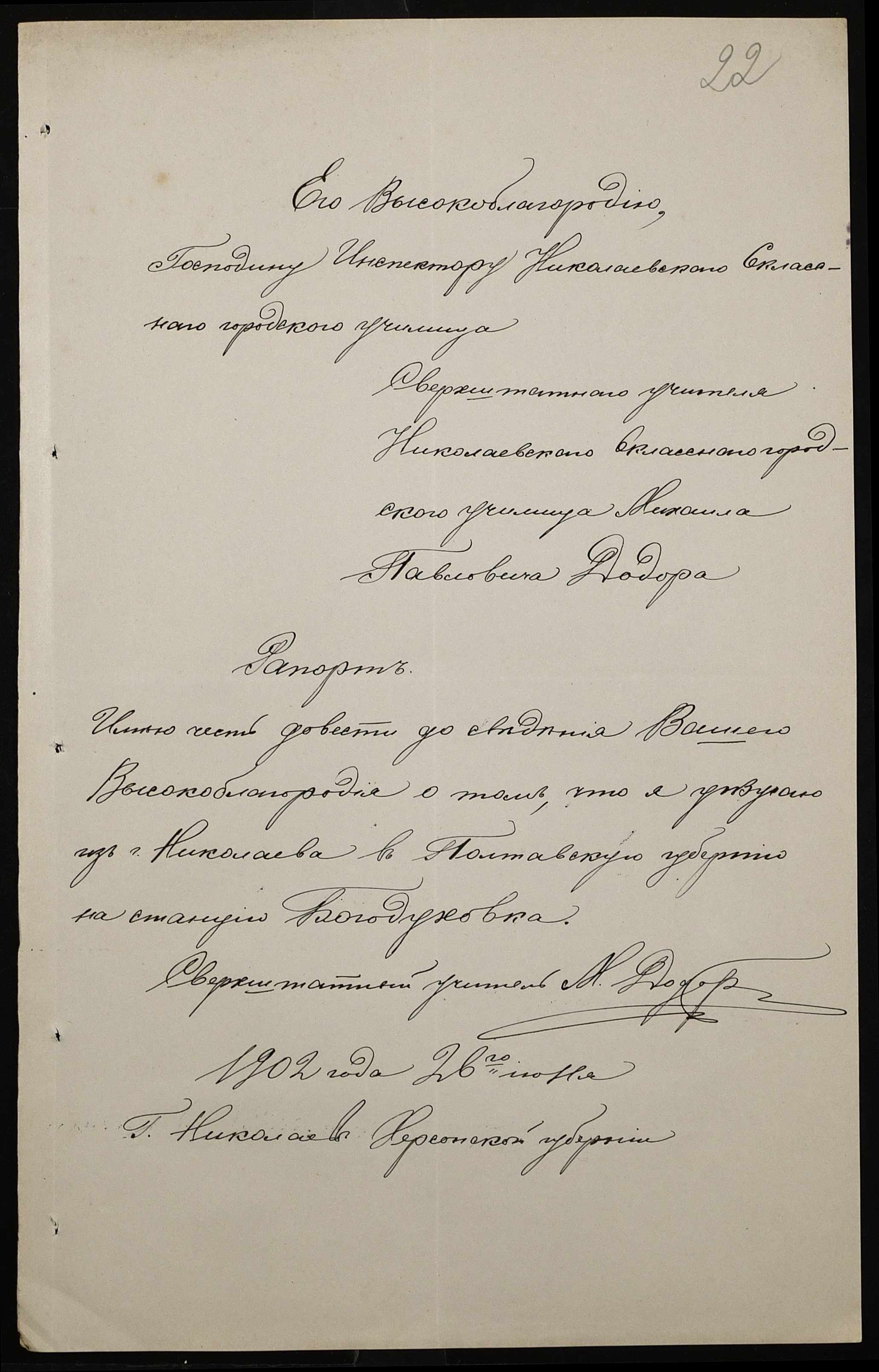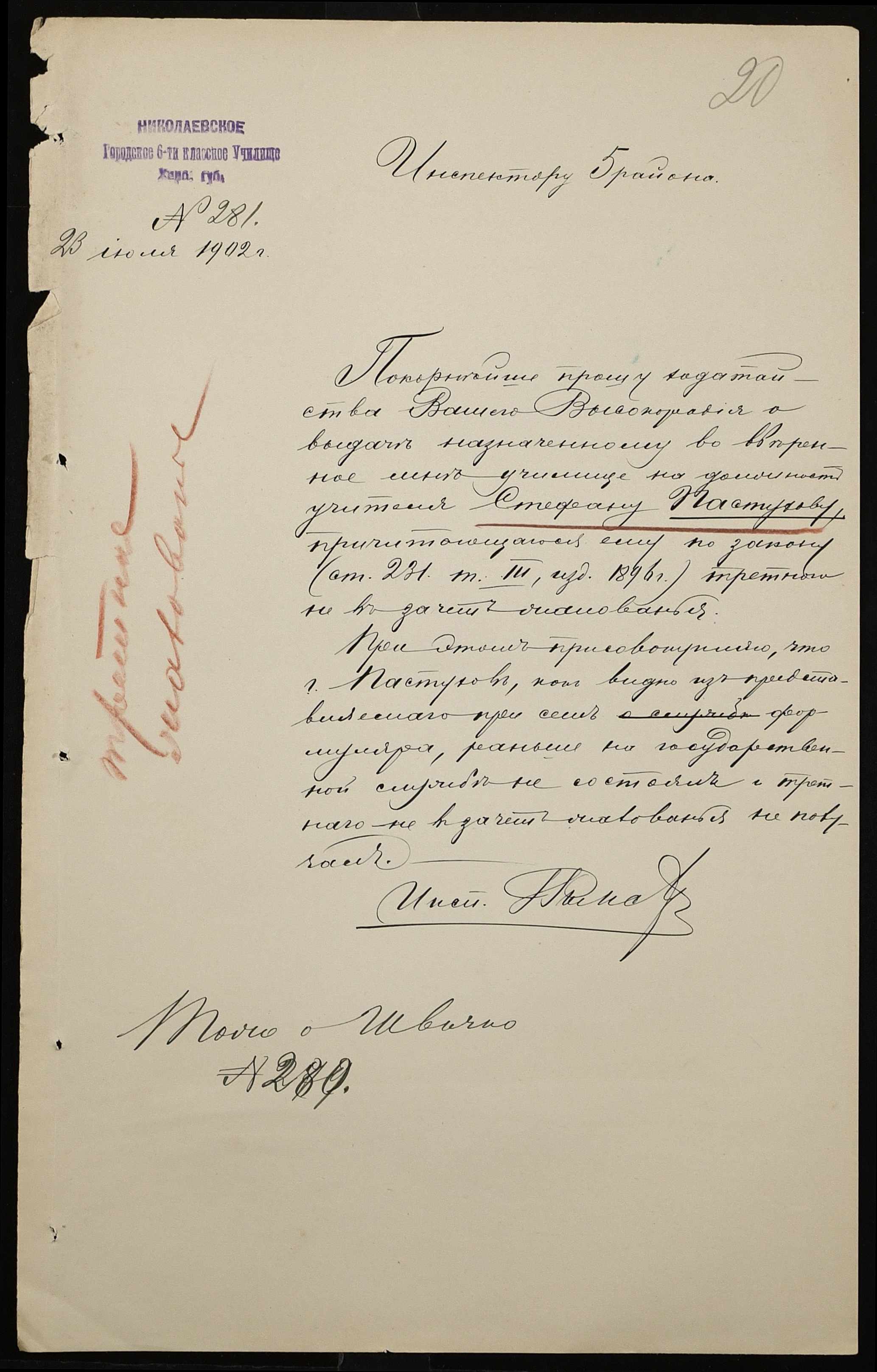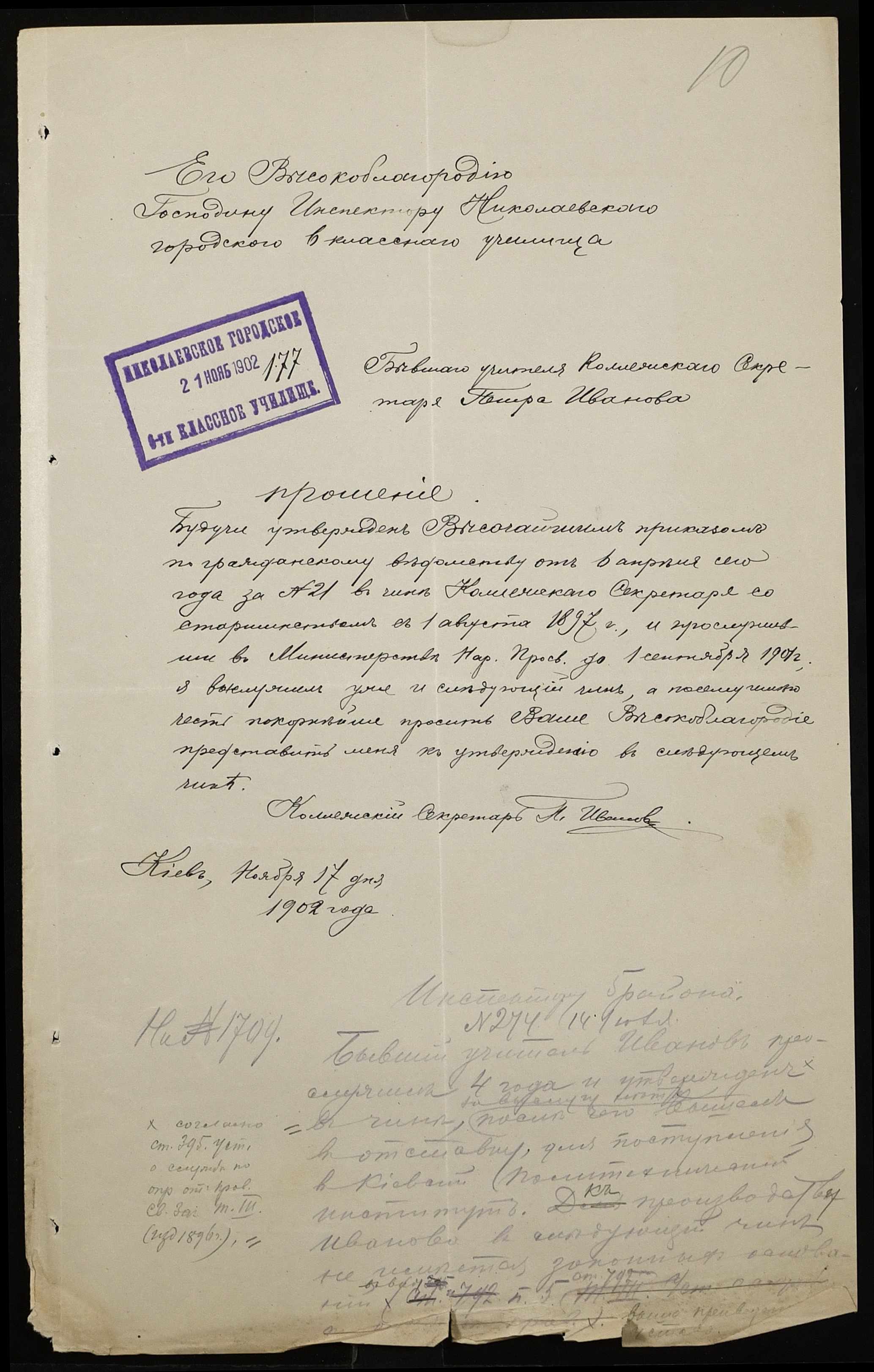 • • • • Справа № 377 “Листування з інспектором народних училищ 5-го району Херсонської губернії з особового складу”