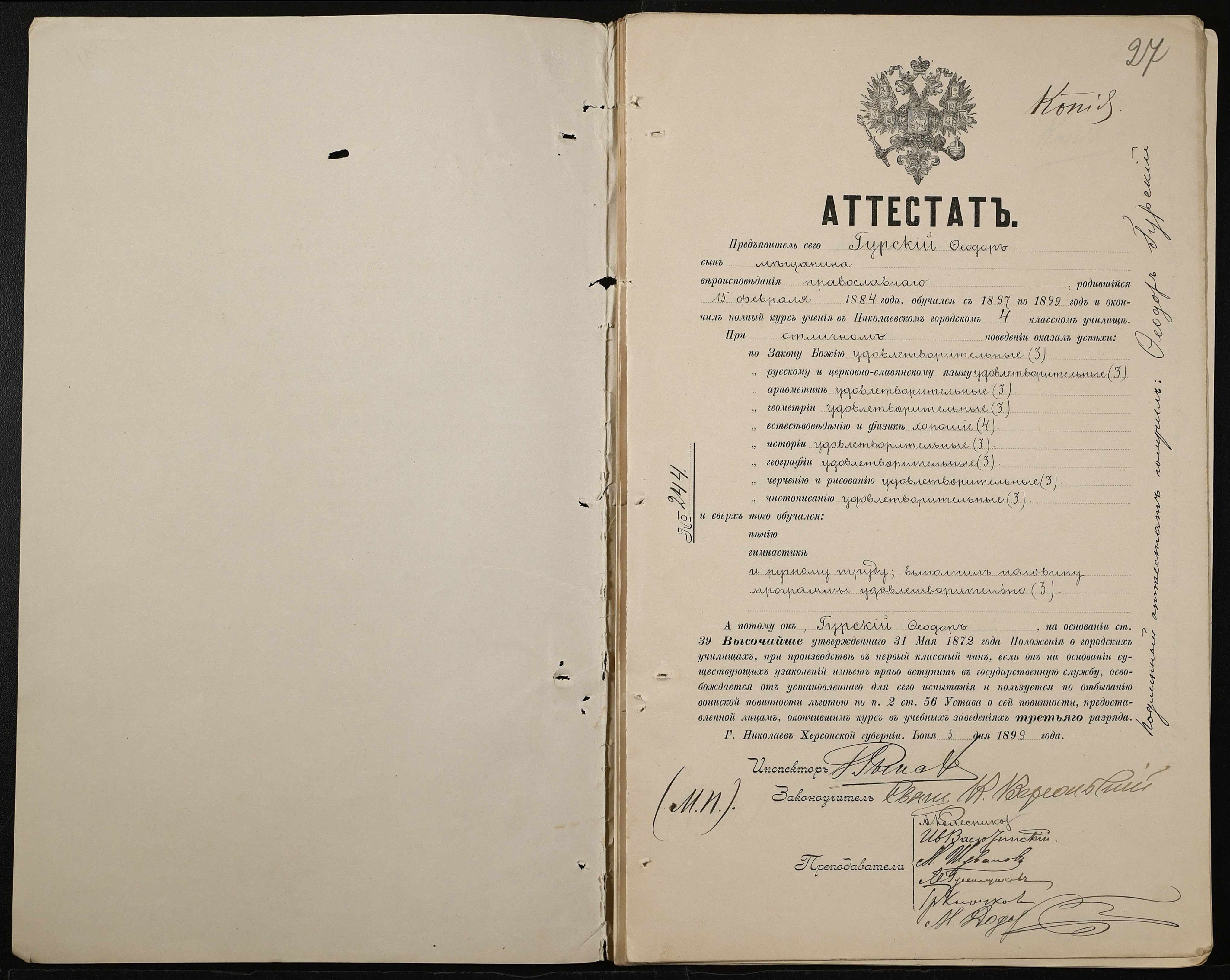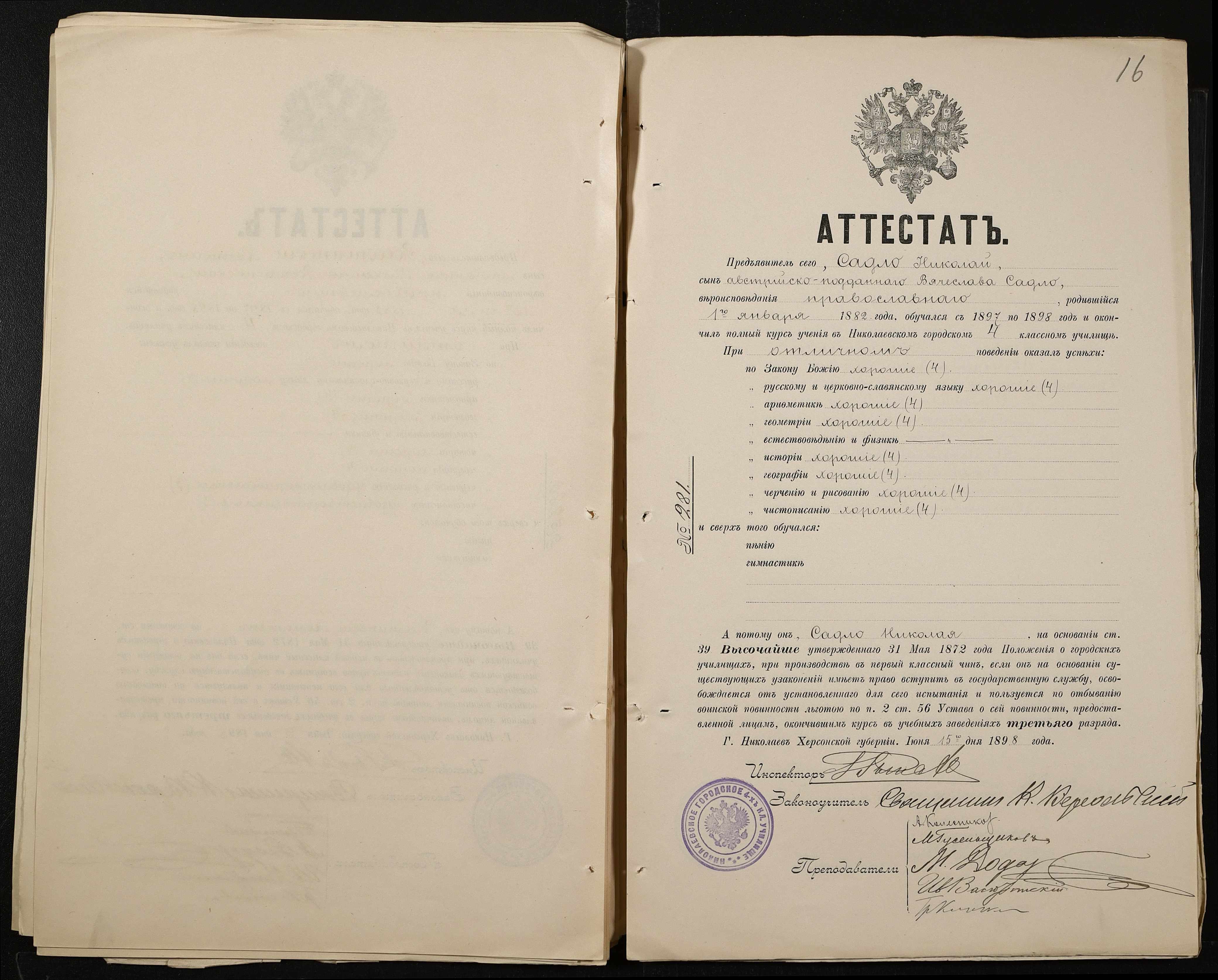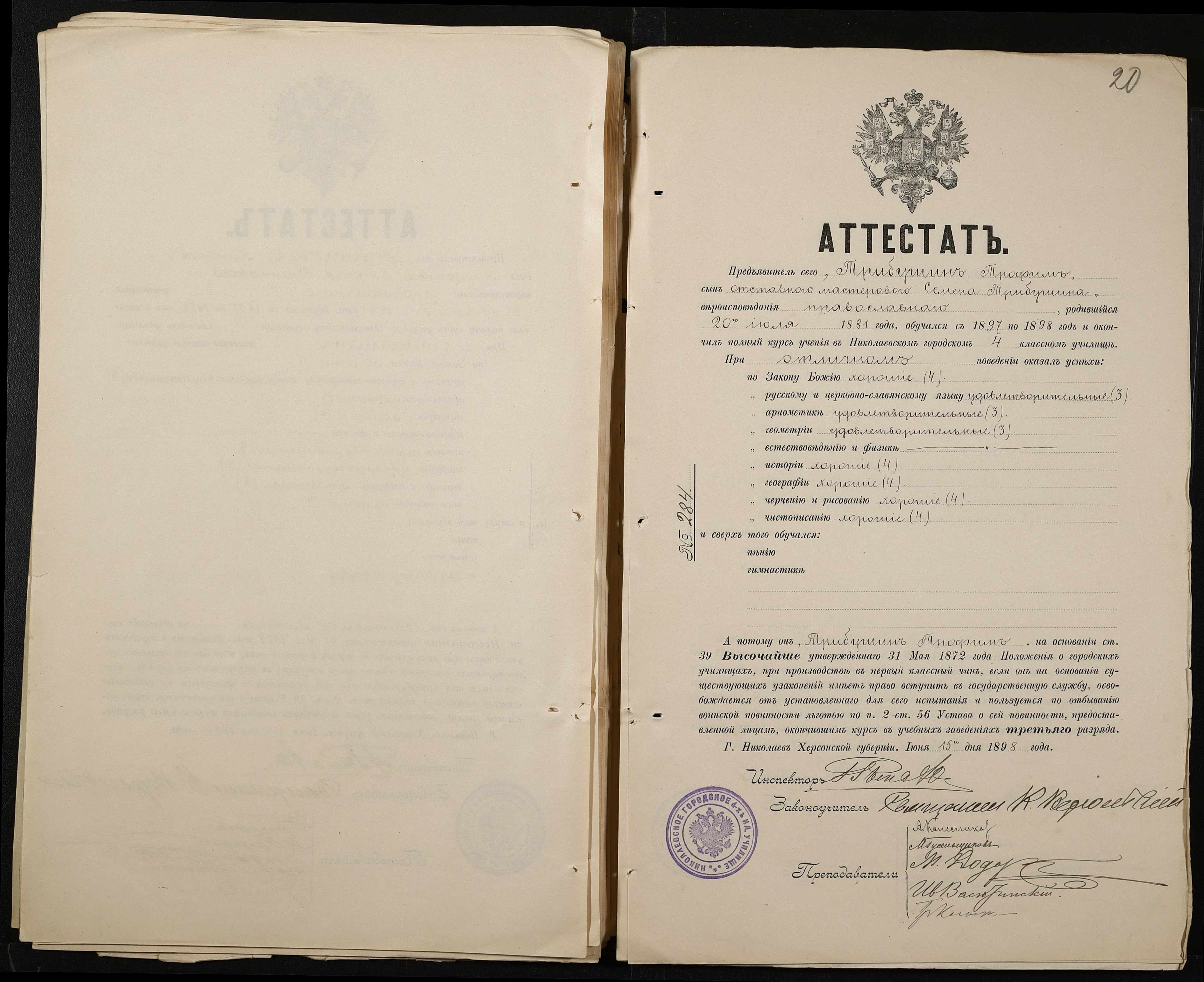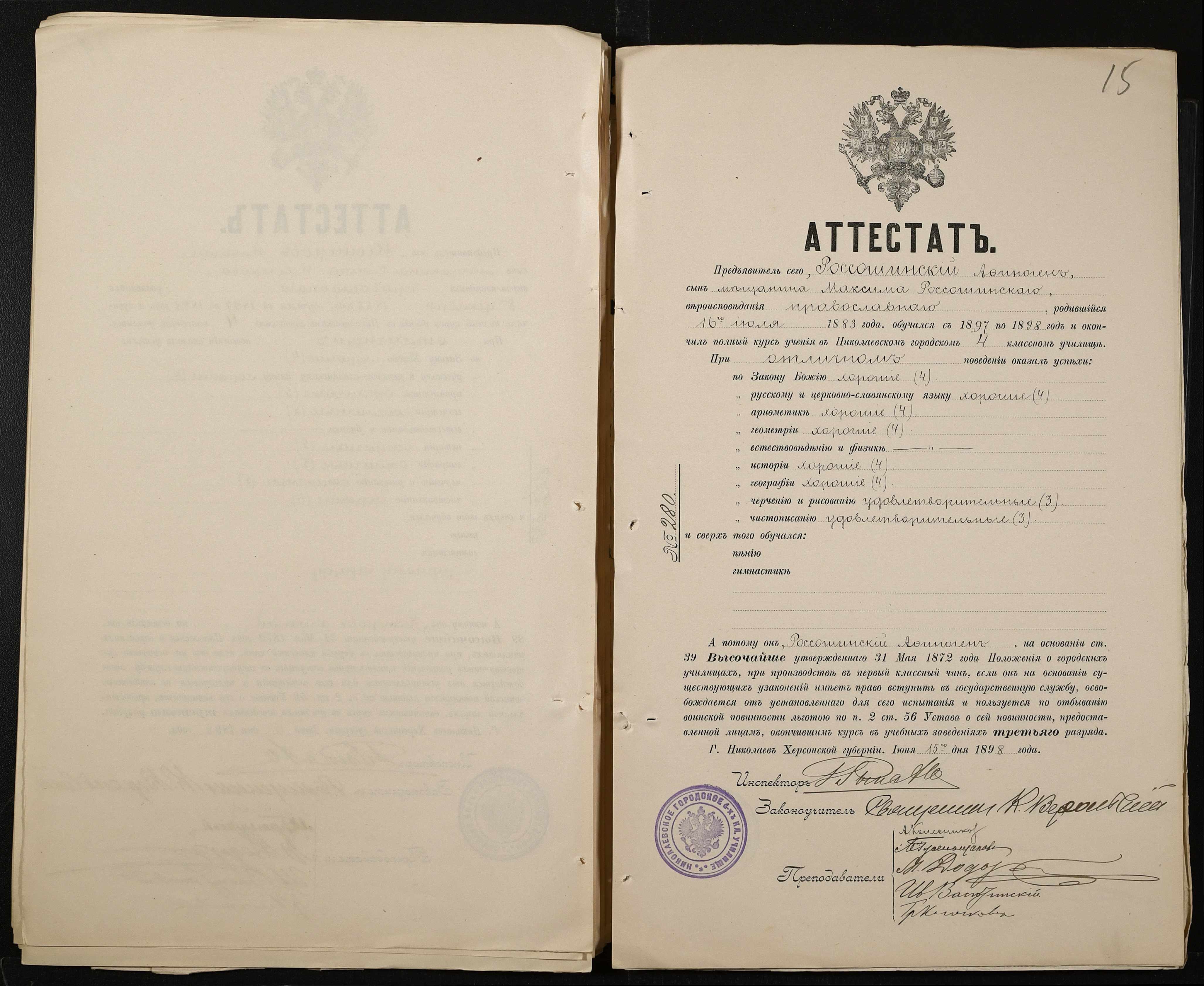 • • • • Справа № 389 “Атестати учнів про закінчення чотирикласного (шестикласного) училища (копії)”