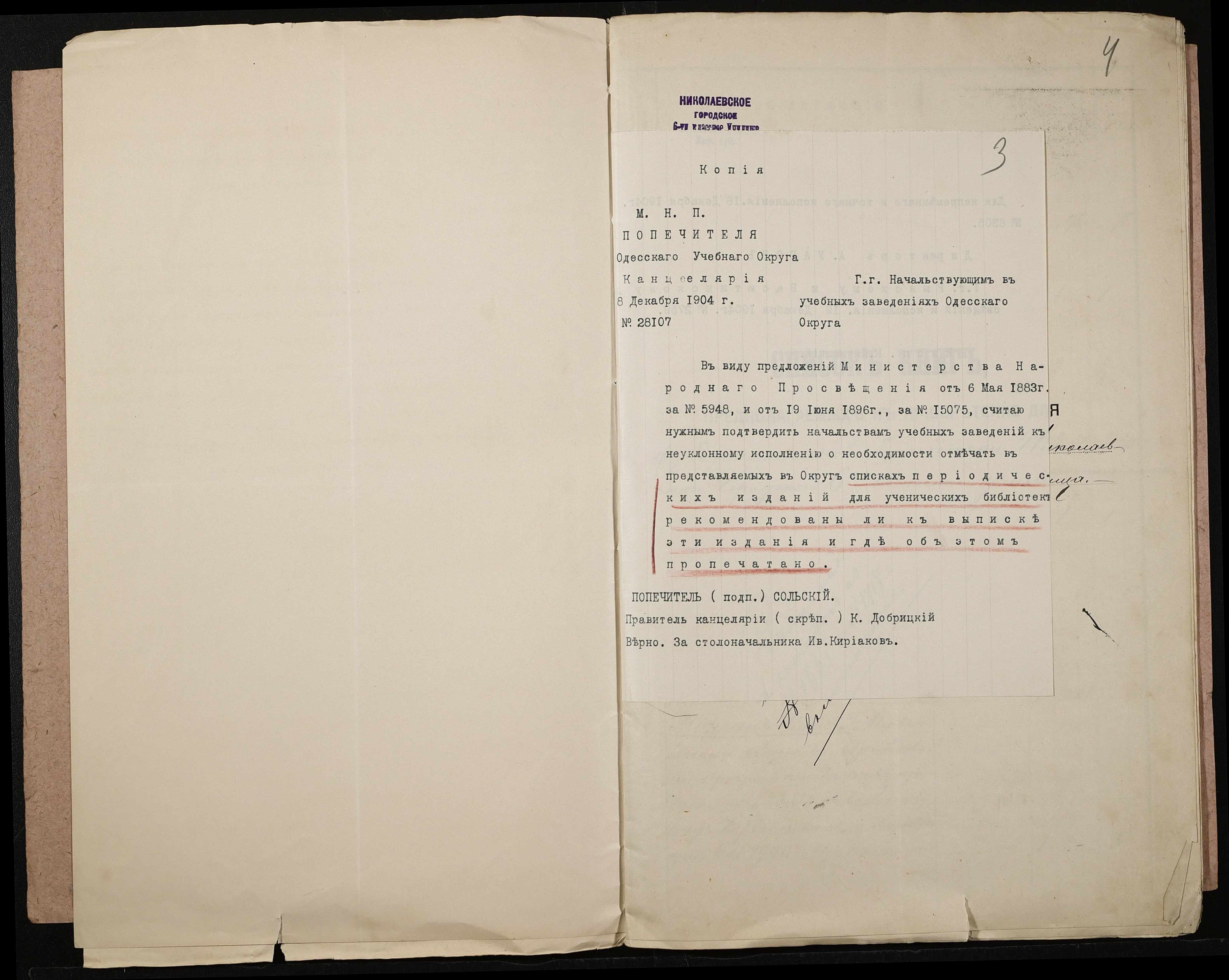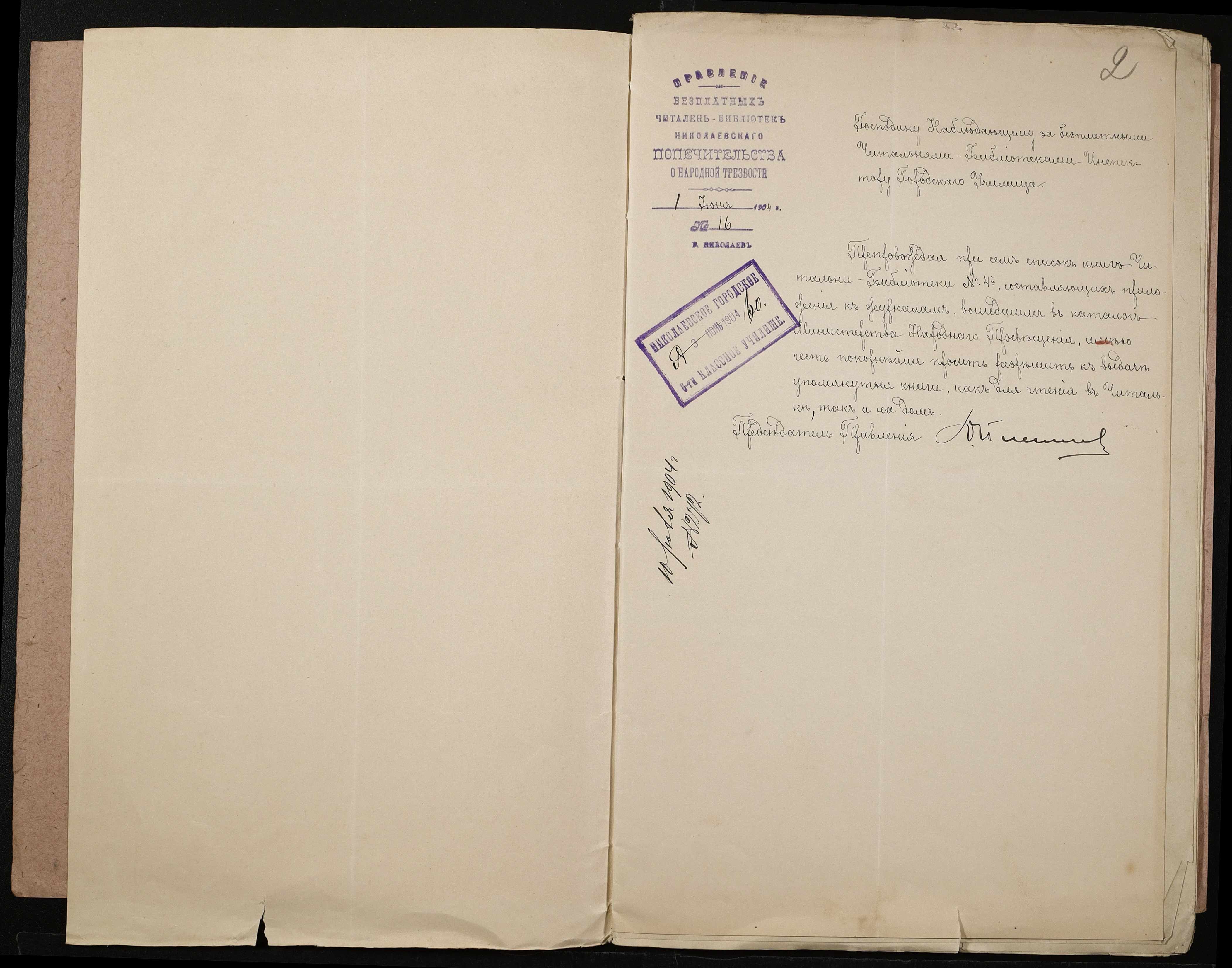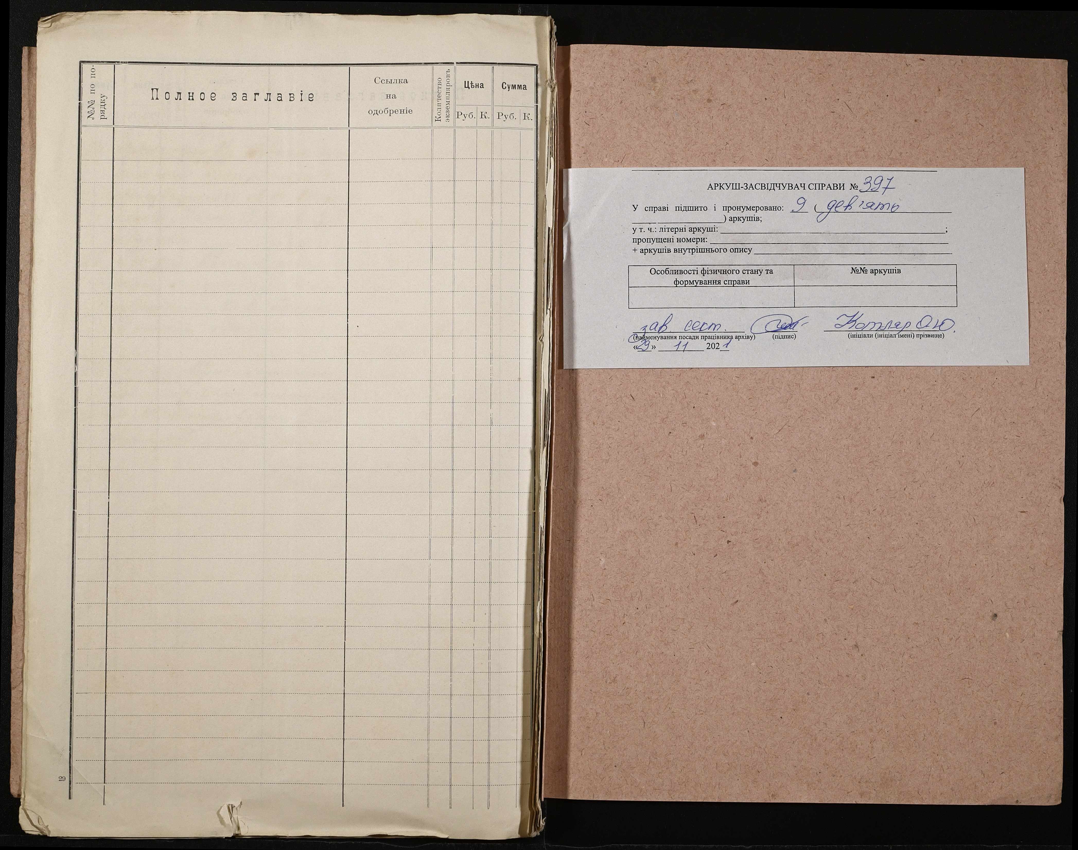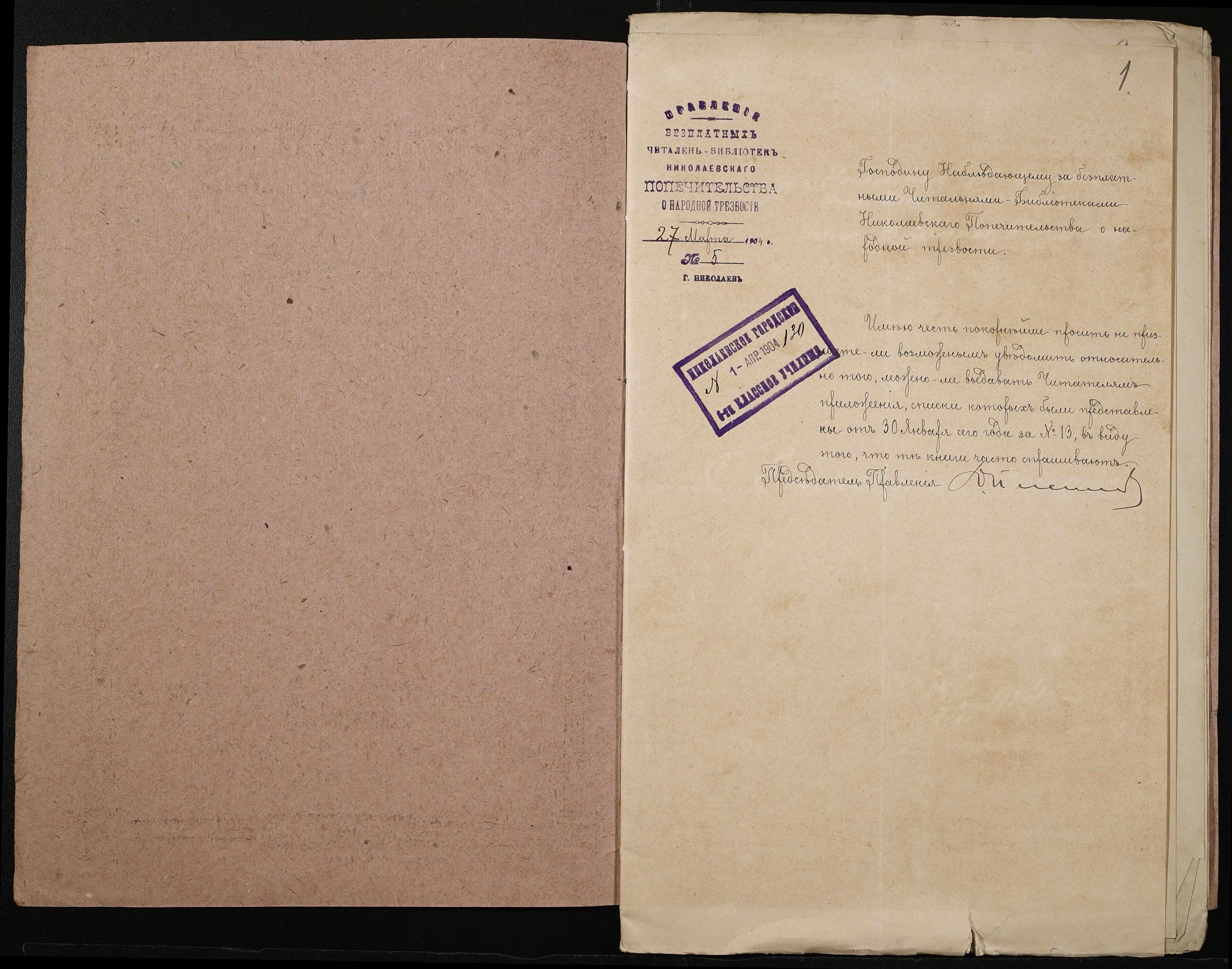 • • • • Справа № 397 “Листування з управлінням безкоштовних читальнь-бібліотек Миколаївського опікунства про народну тверезість, про дозвіл на видавання книг і журналів додому”
