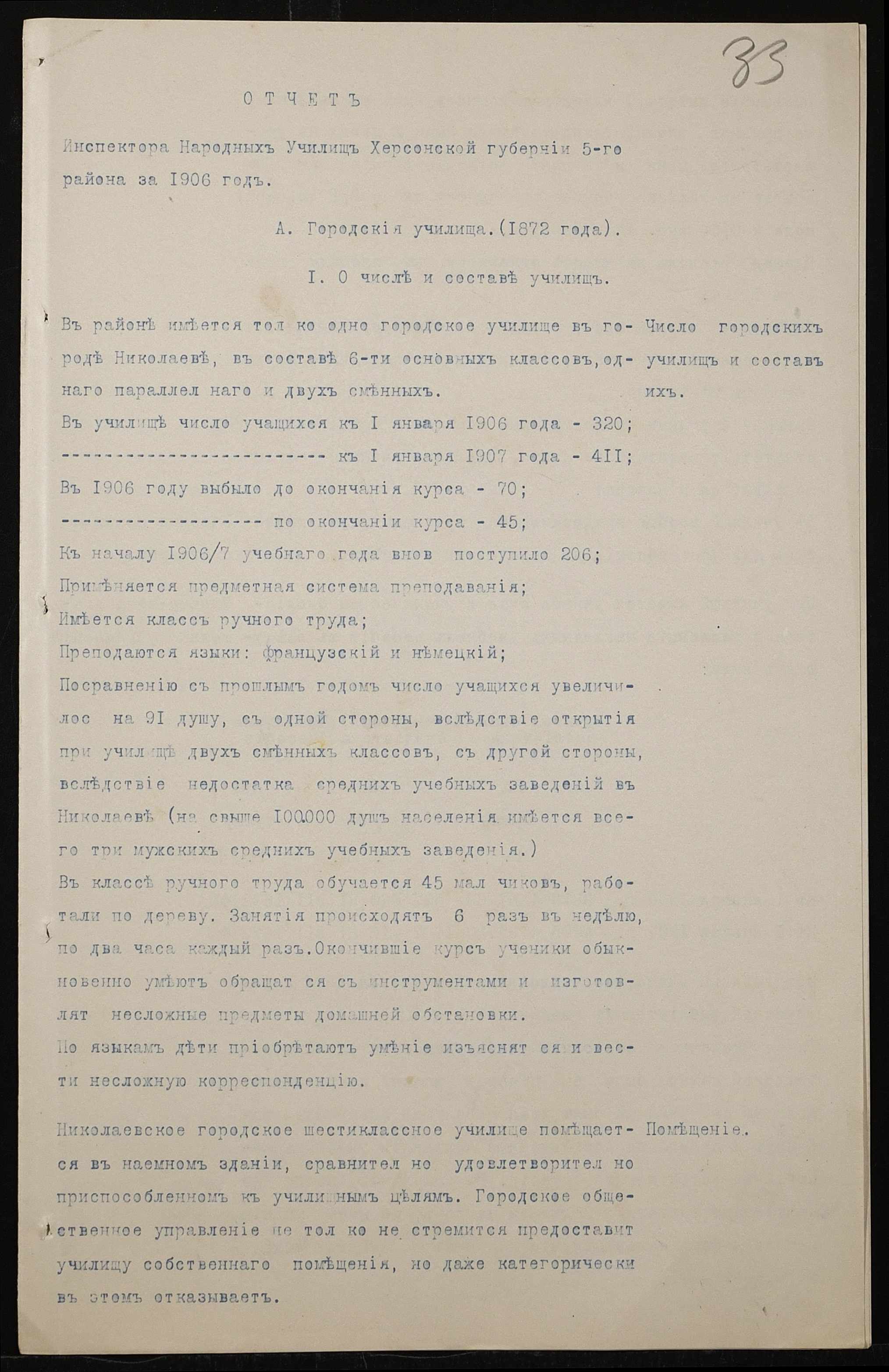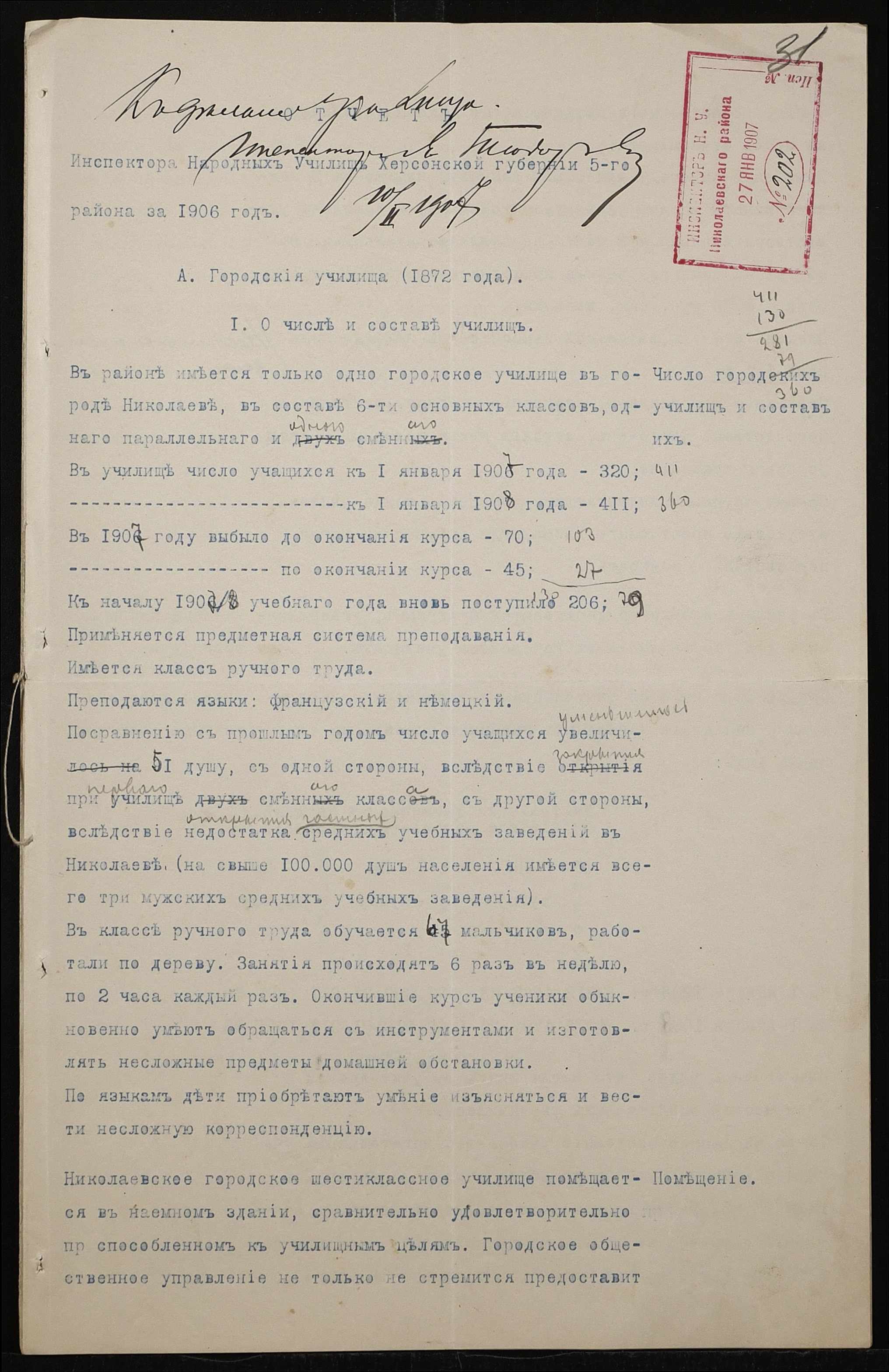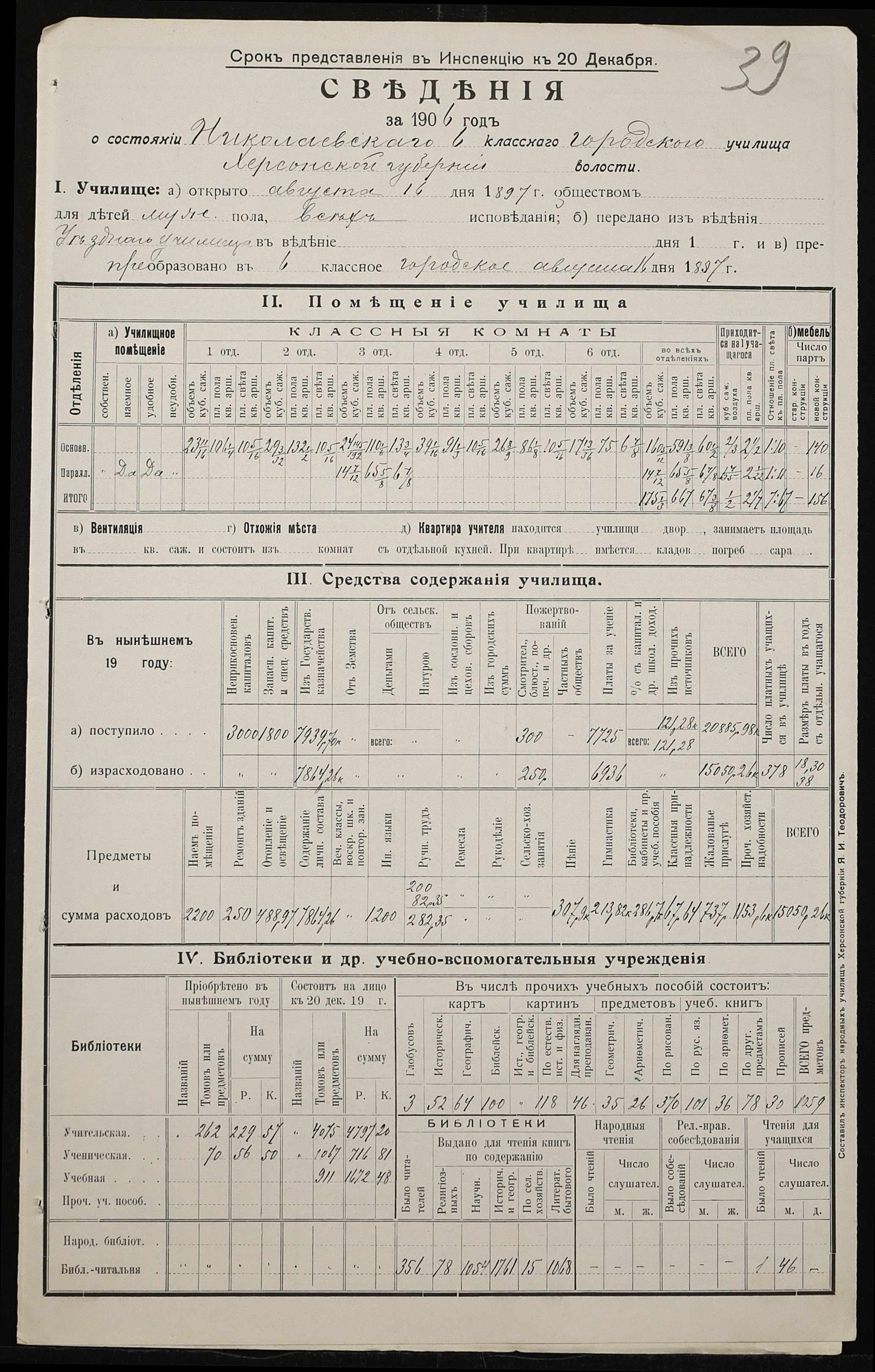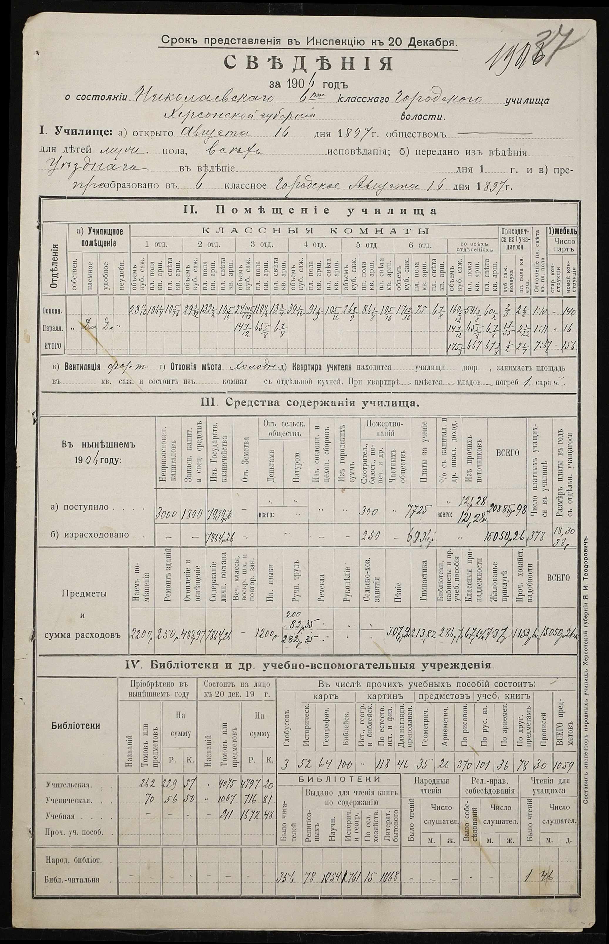• • • • Справа № 411 “Статистичні відомості про стан училища за 1906 рік, формулярні списки викладачів, протокол засідань педагогічної ради”