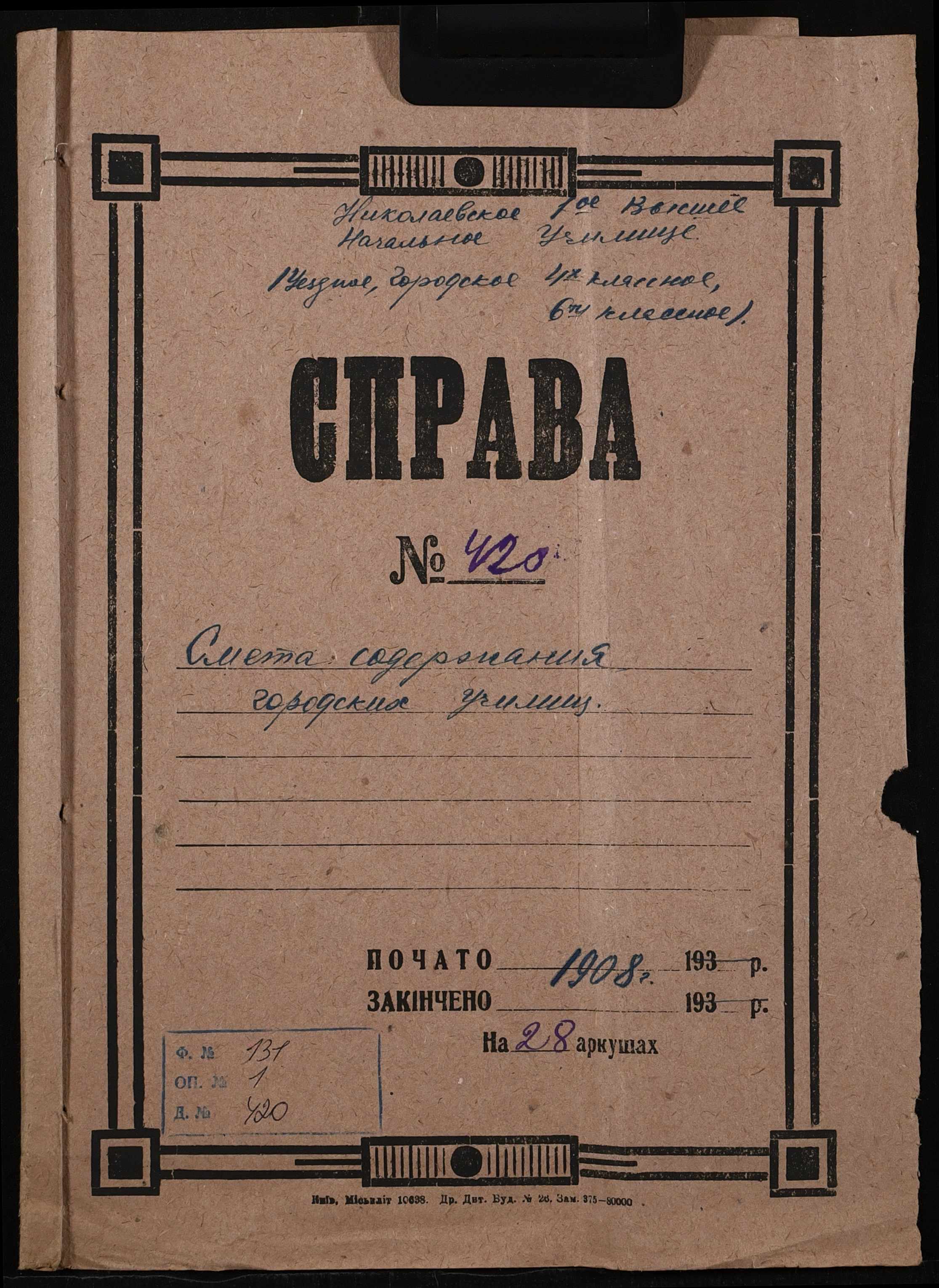 • • • • Справа № 420 “Кошторис витрат на утримання міських училищ на 1908 рік”