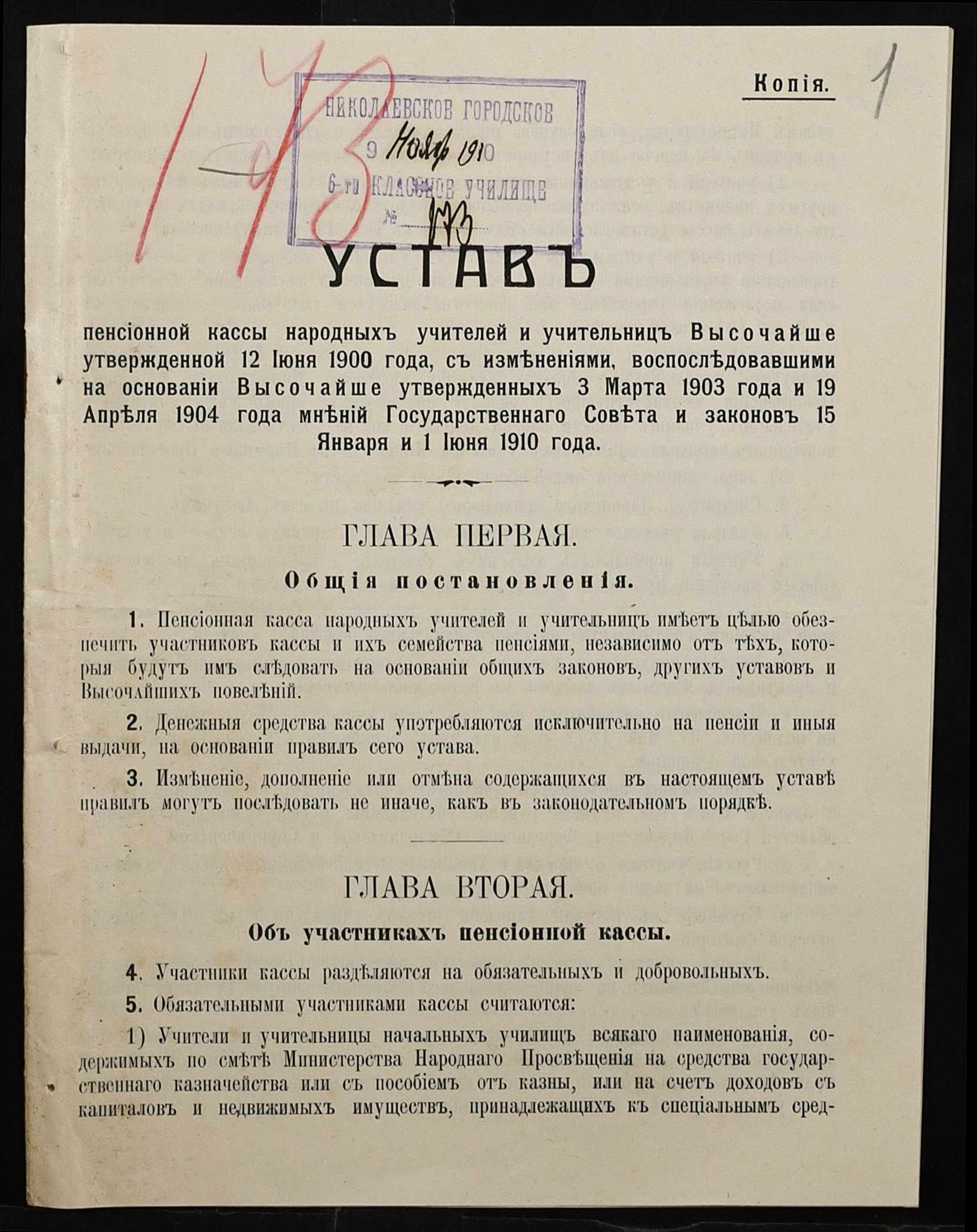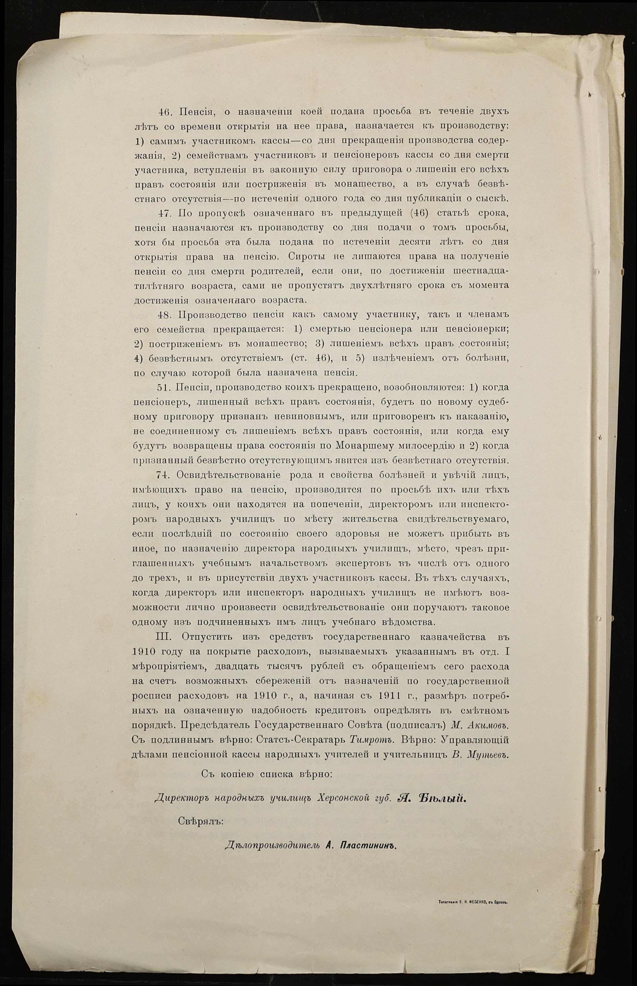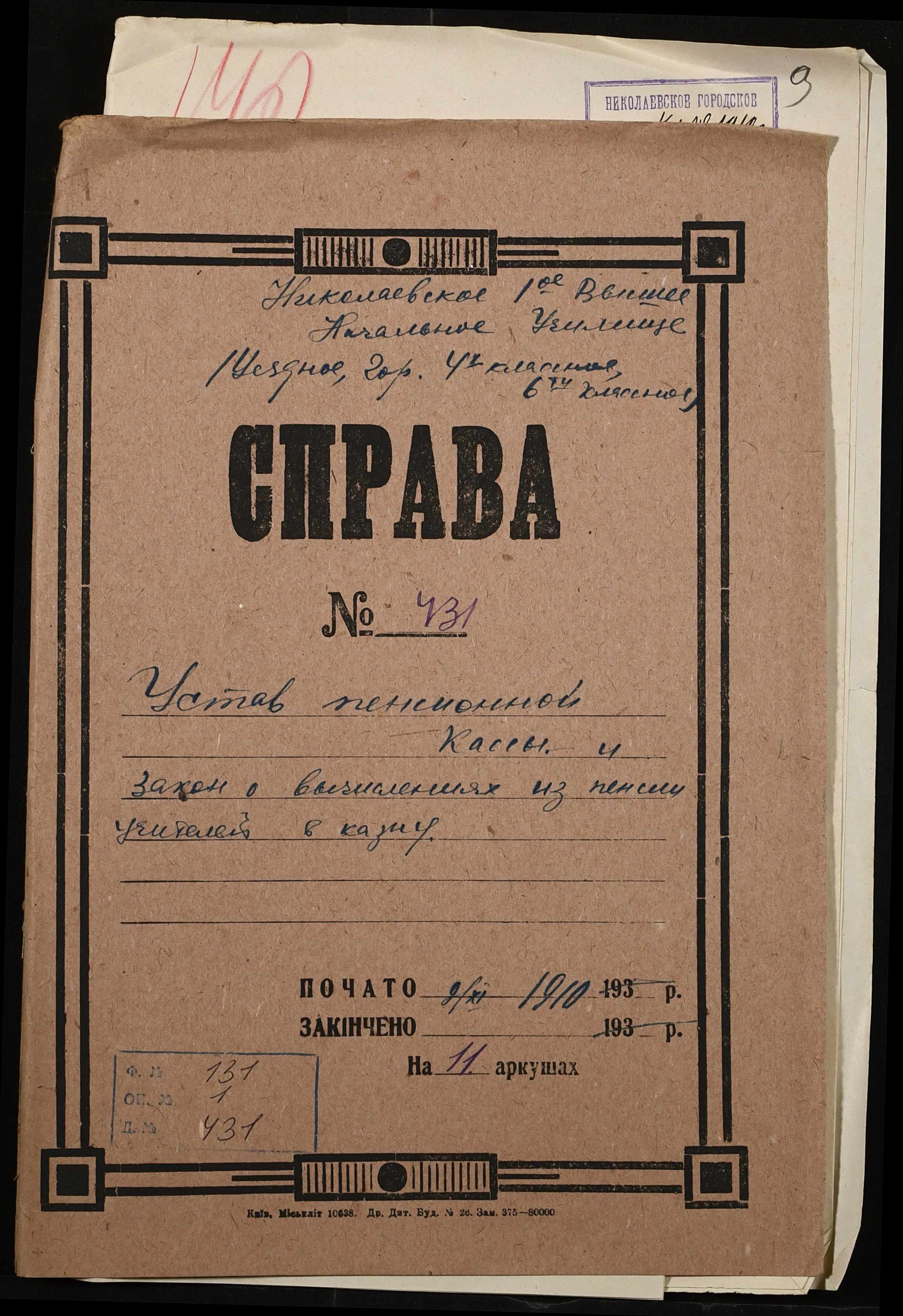 • • • • Справа № 431 “Устав пенсійної каси, закон про відрахування в казну частини платні вчителів (копії)”