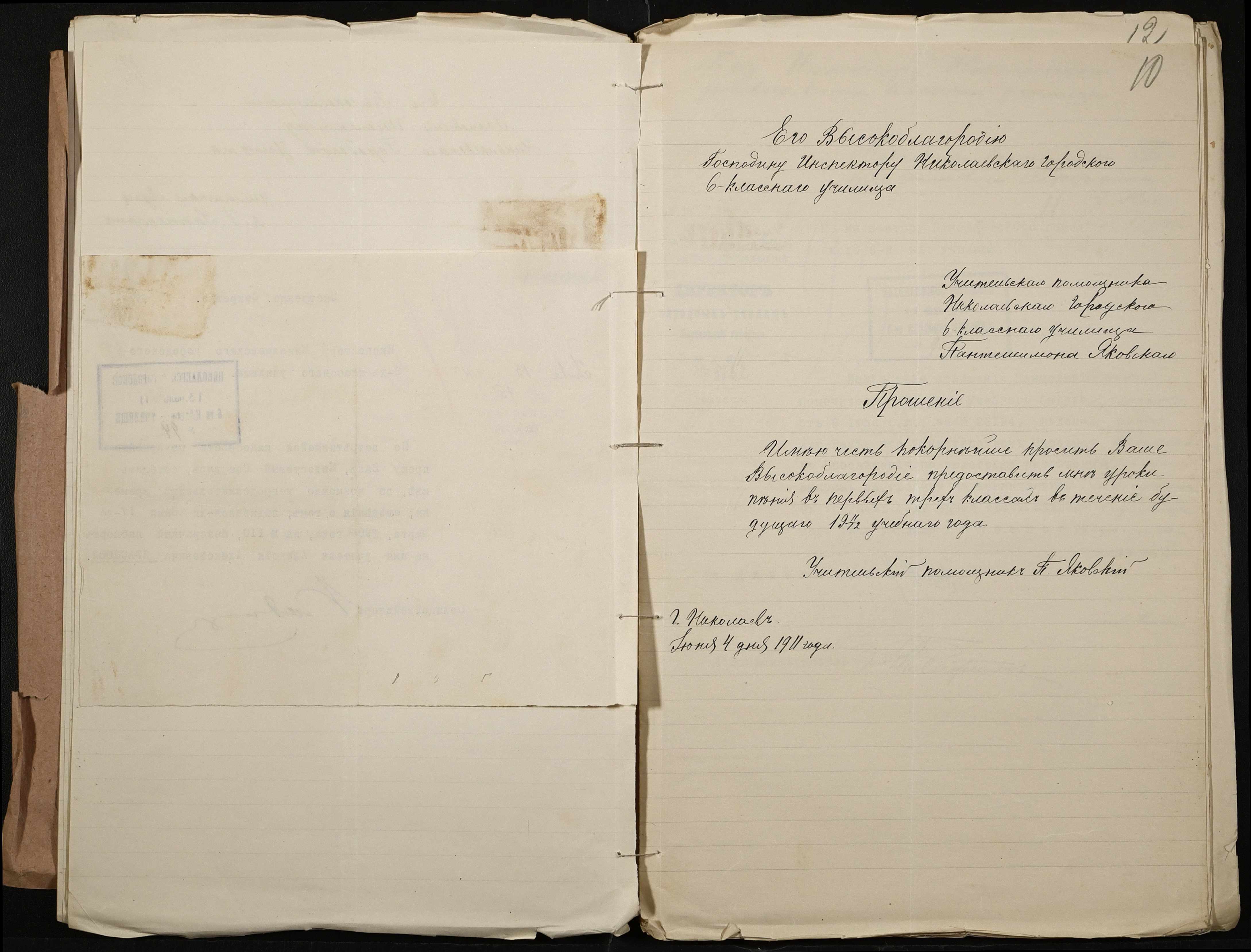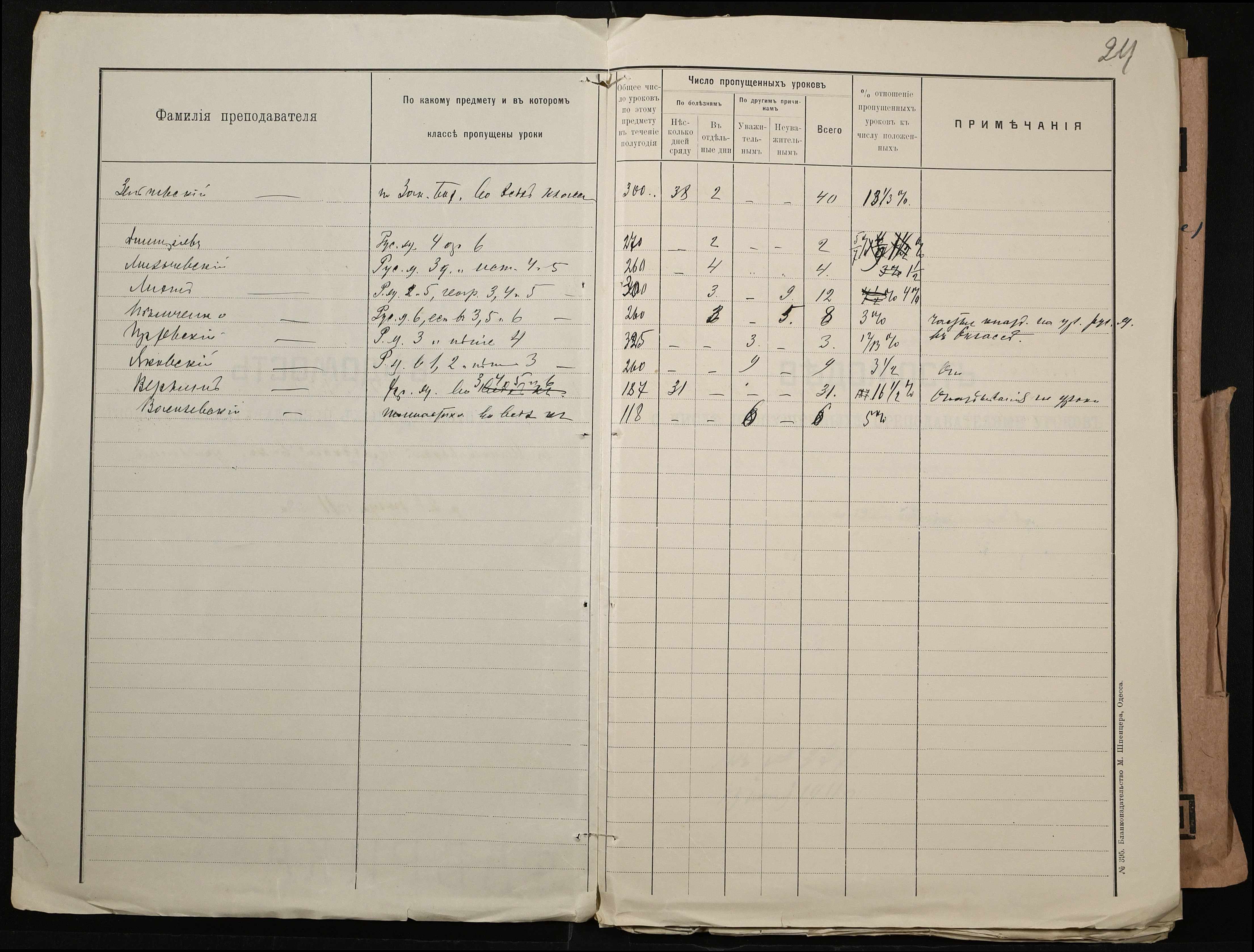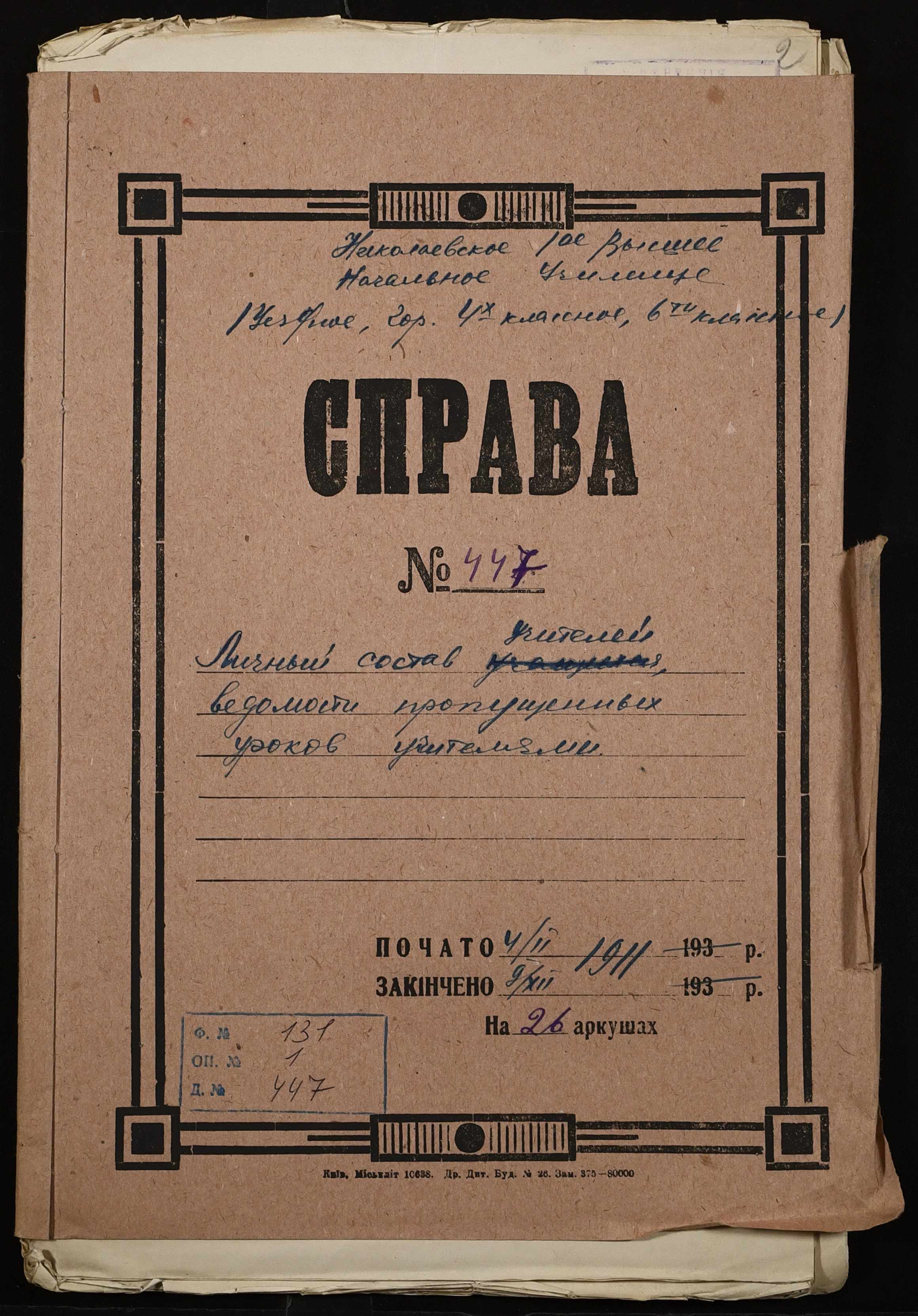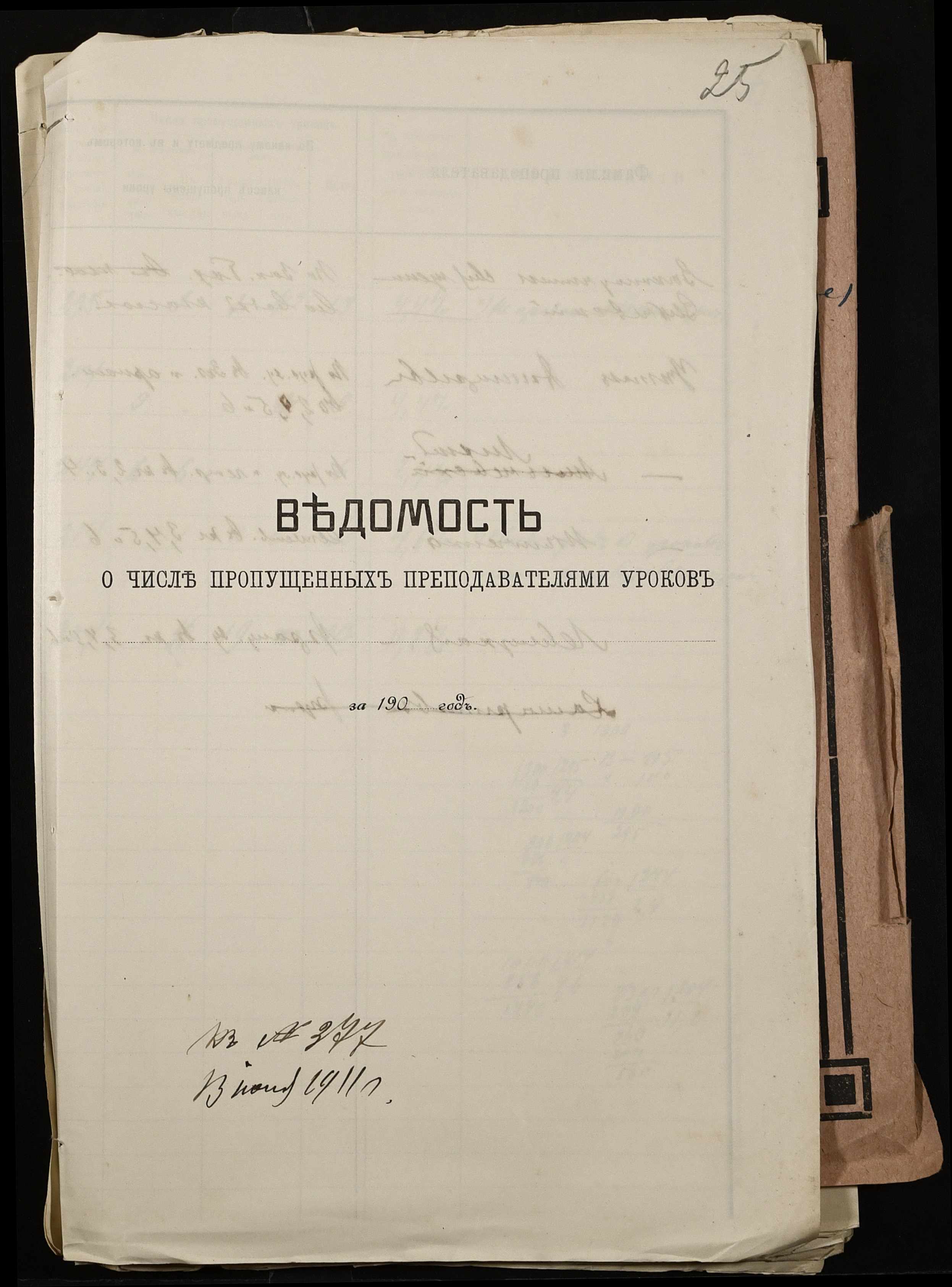• • • • Справа № 447 “Відомості обліку уроків, на яких були відсутні викладачі, за II півріччя 1910-1911 навчальний рік, прохання викладачів про надання відпусток”