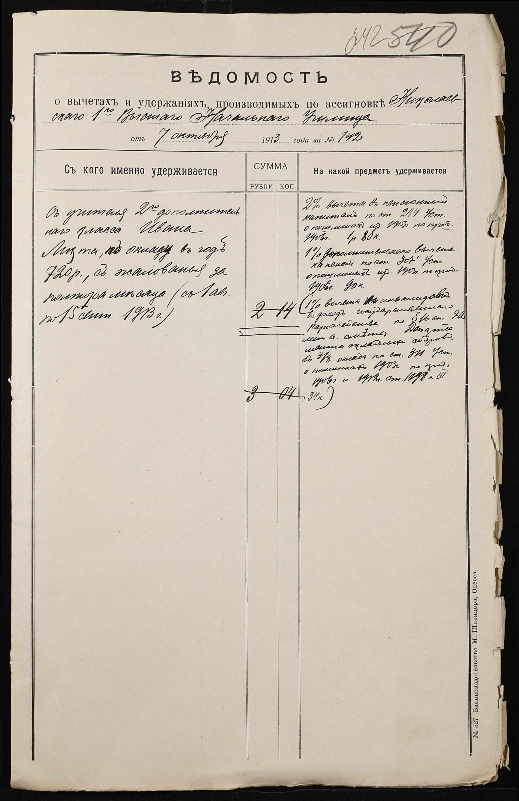 • • • • Справа № 460а “Кошторис прибутків і видатків училища, реєстр бухгалтерських документів, список викладачів з зазначенням чину. Том 2”