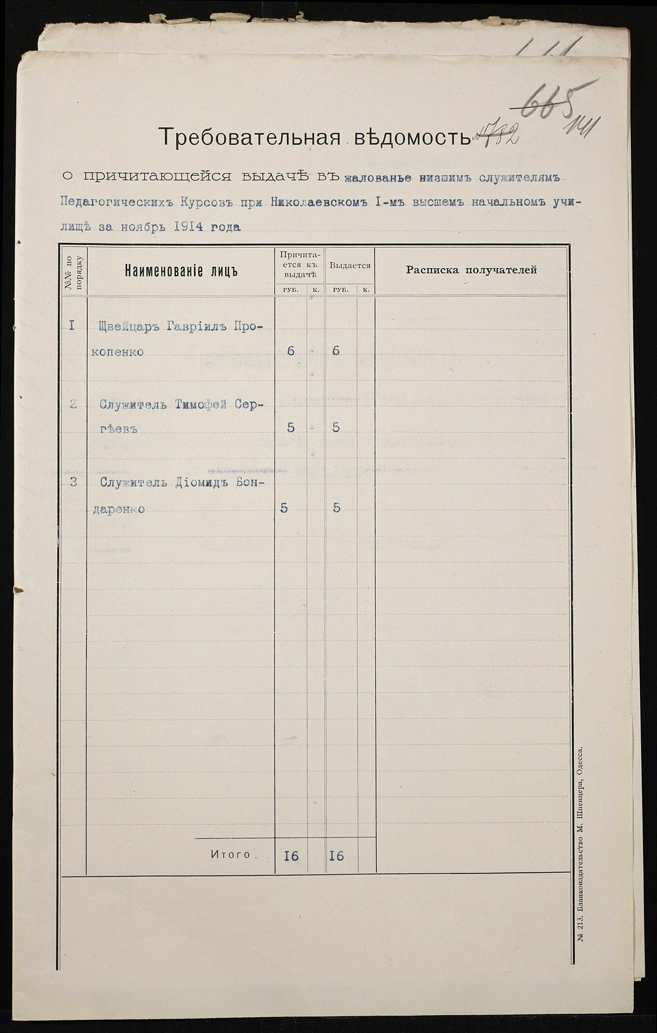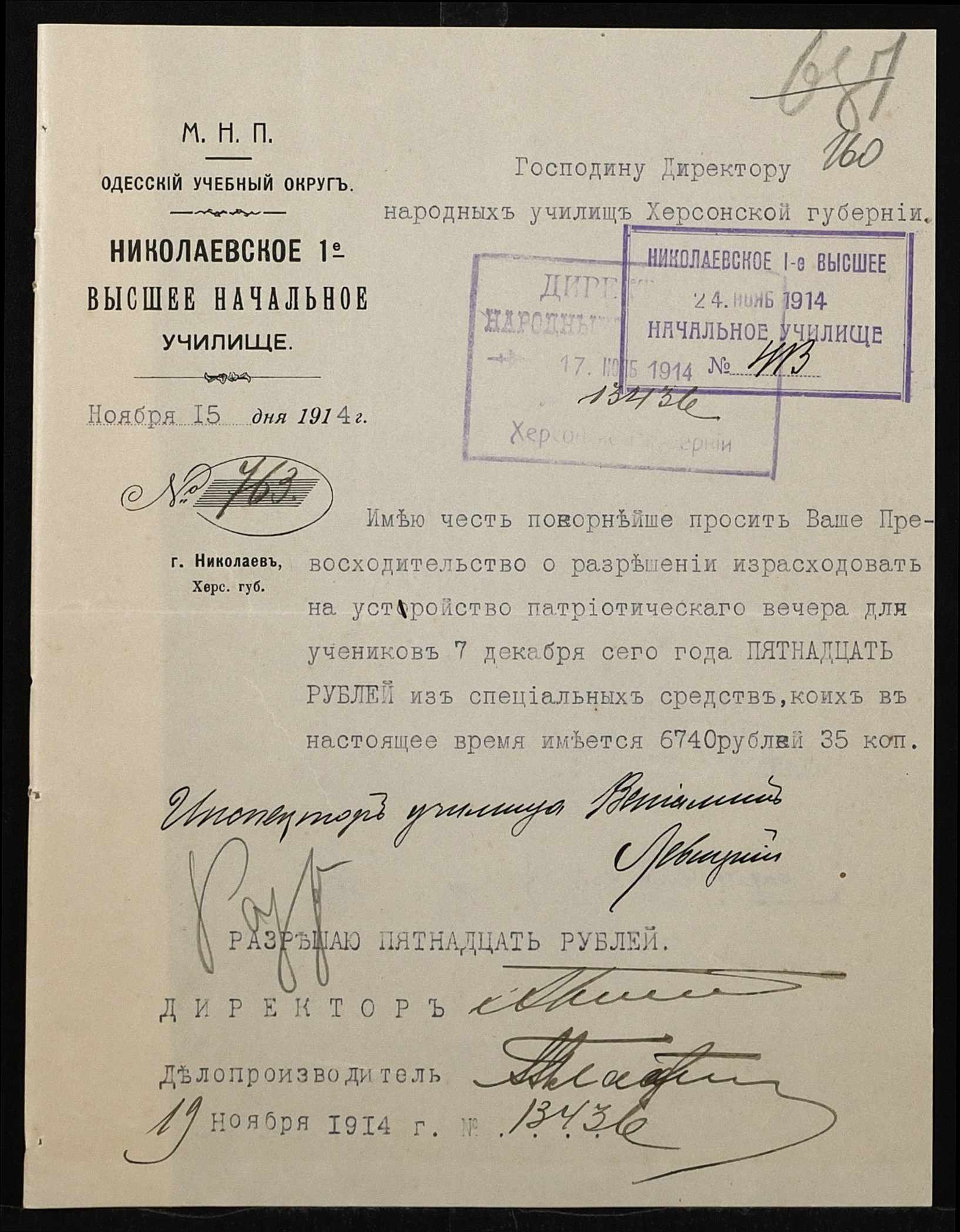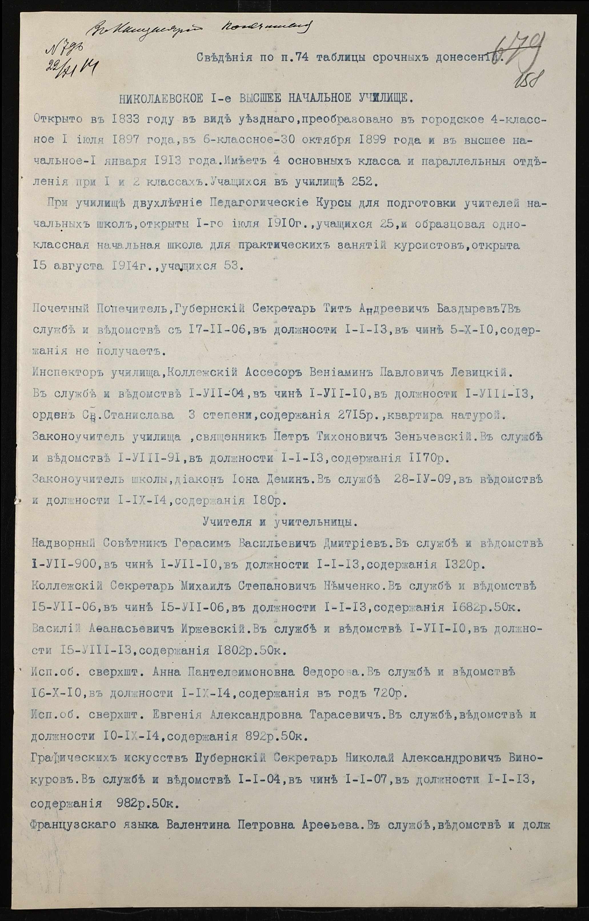 • • • • Справа № 464б “Прибутково-видаткові документи (кошториси, відомості), екзаменаційні відомості за 1913-1914 навчальний рік, список викладачів училища. Том 3”