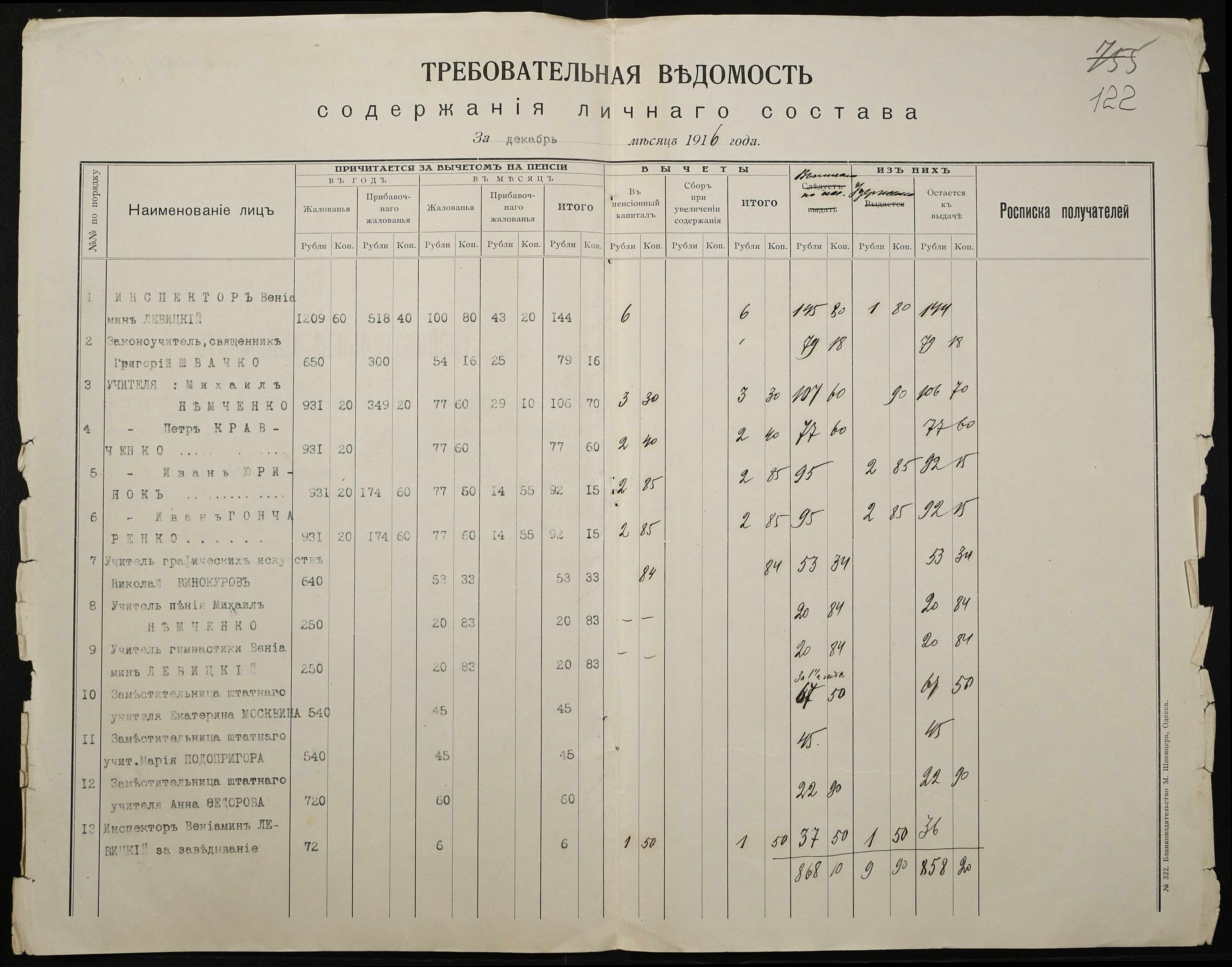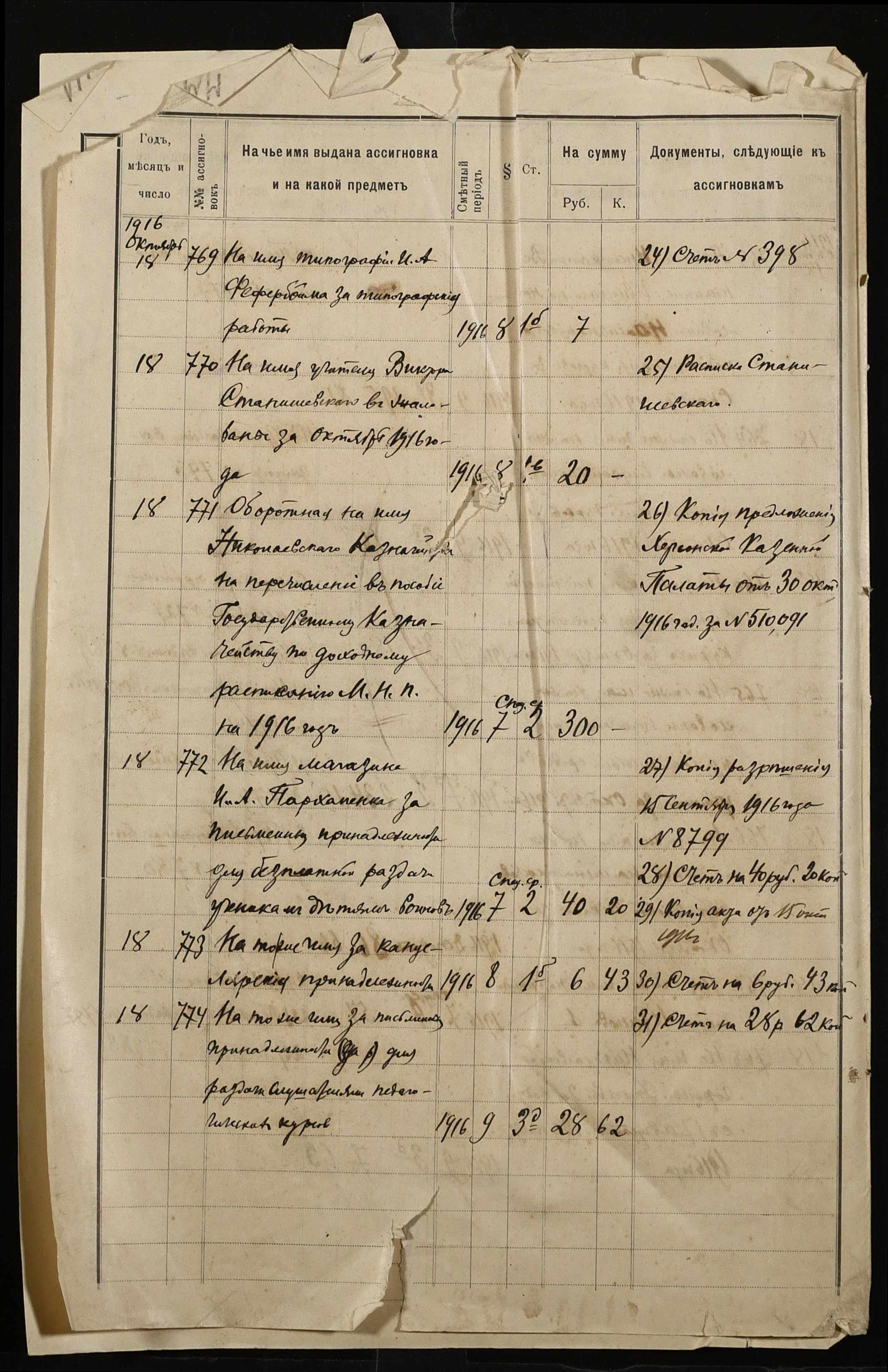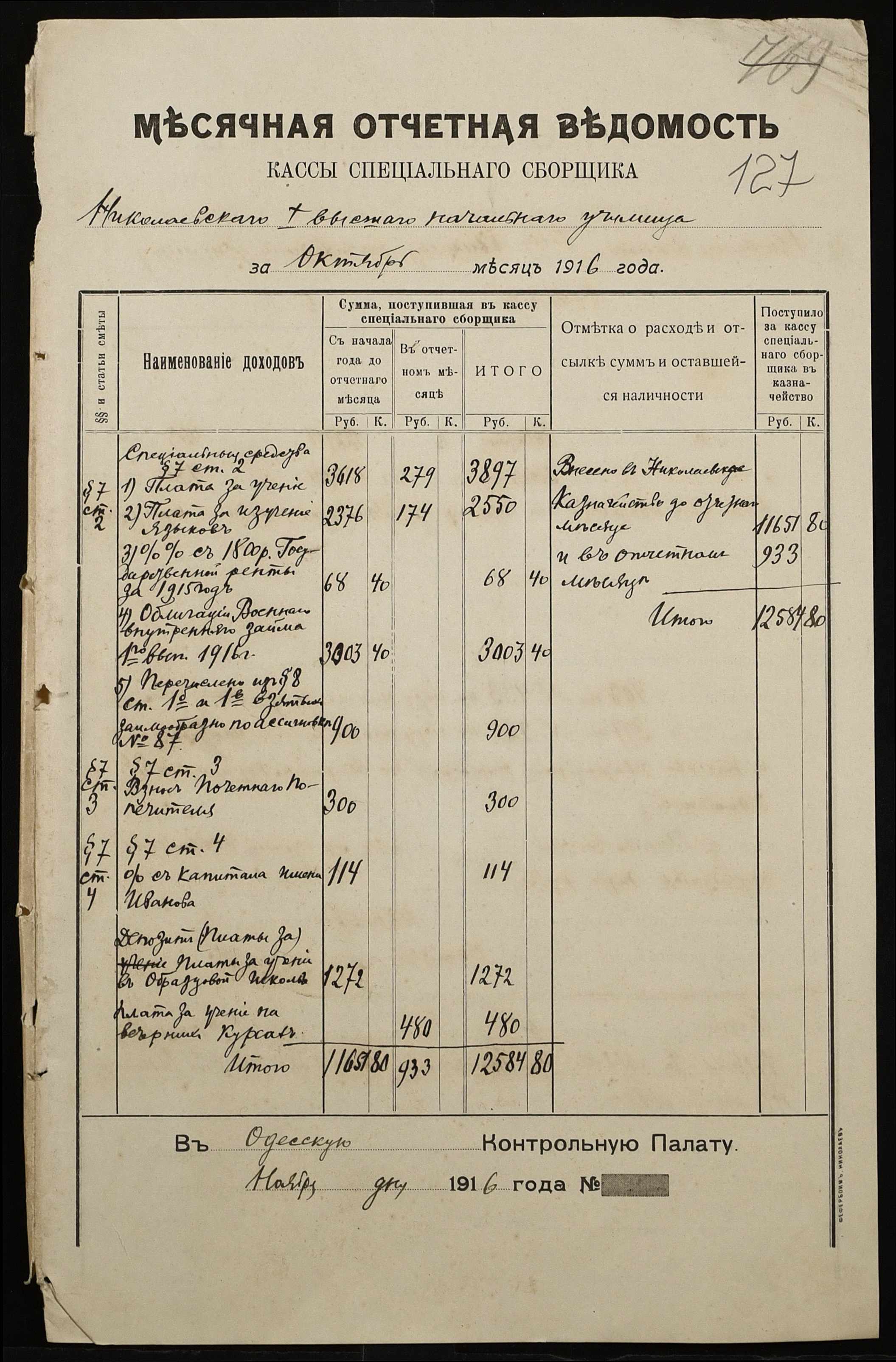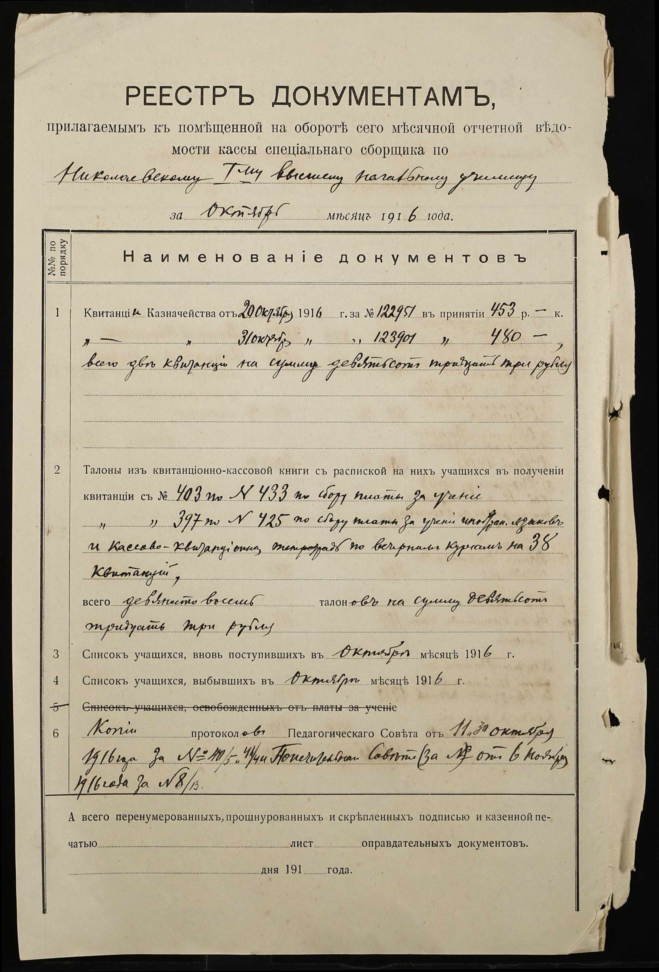 • • • • Справа № 466б “Кошторис на утримання училища, інформація про зміни, які відбулися в складі училища, реєстр бухгалтерських документів, відомості на видачу утримання викладачам за 1916 рік. Том 3”