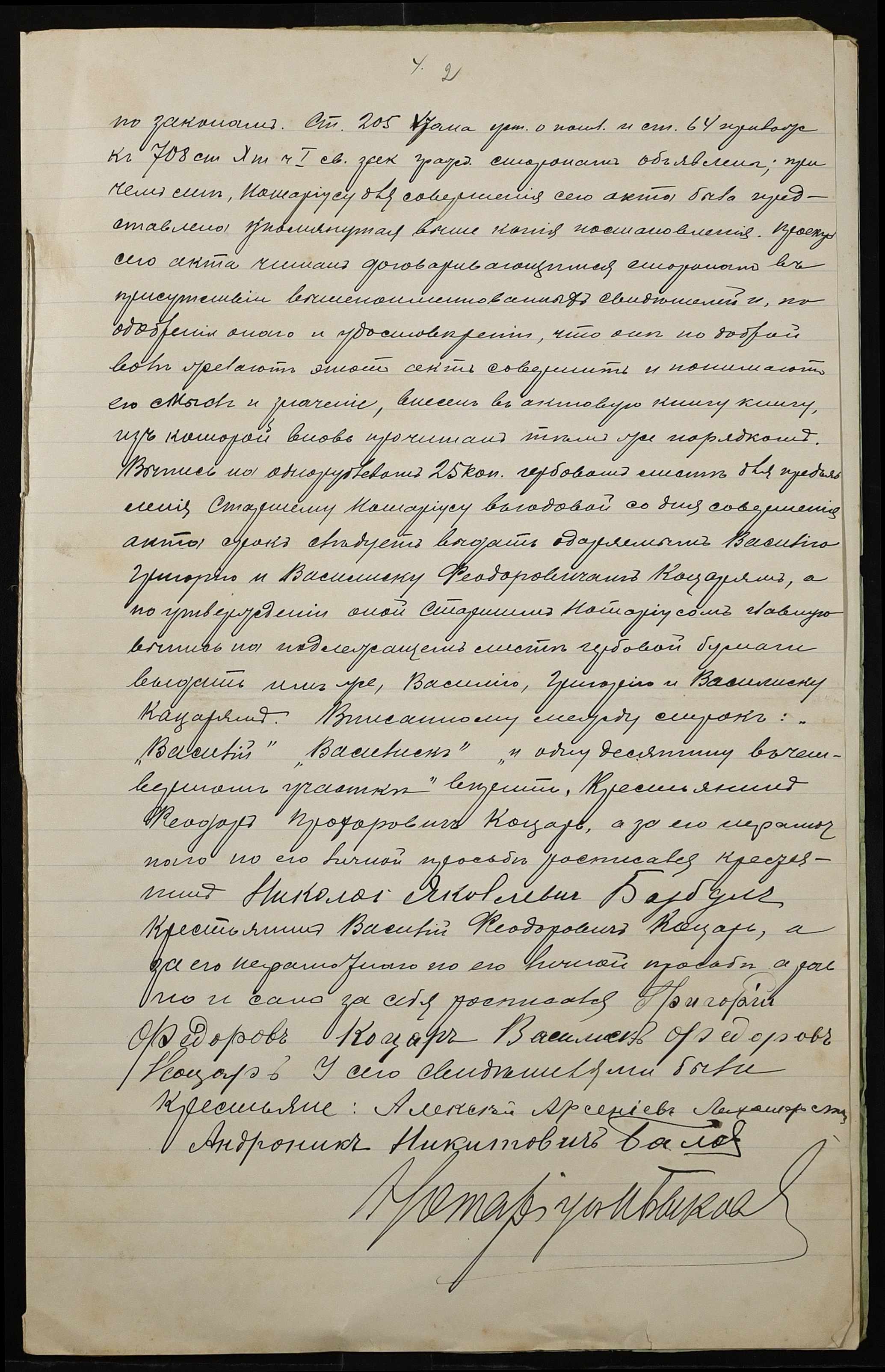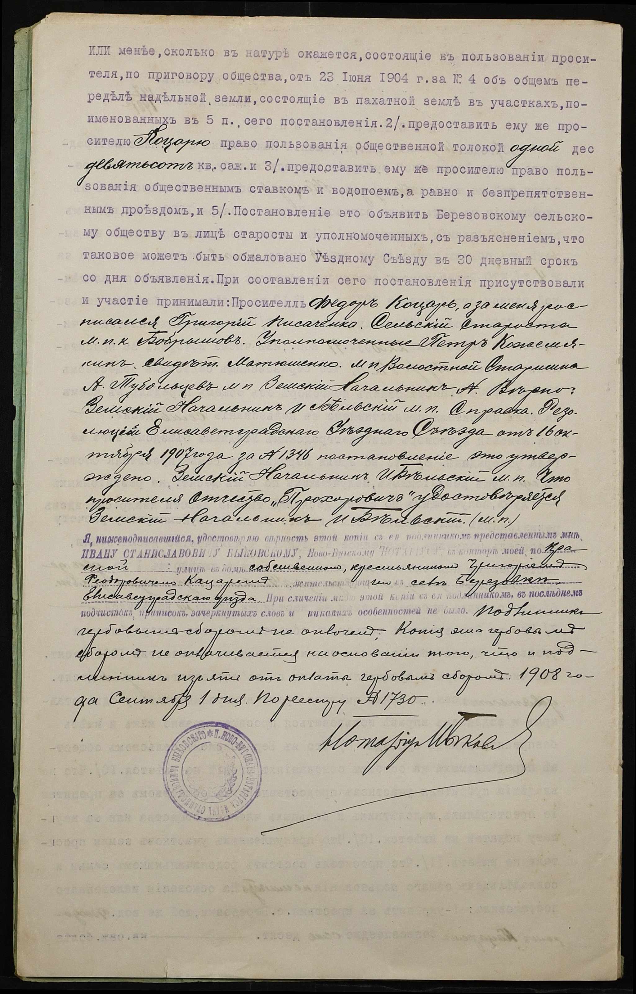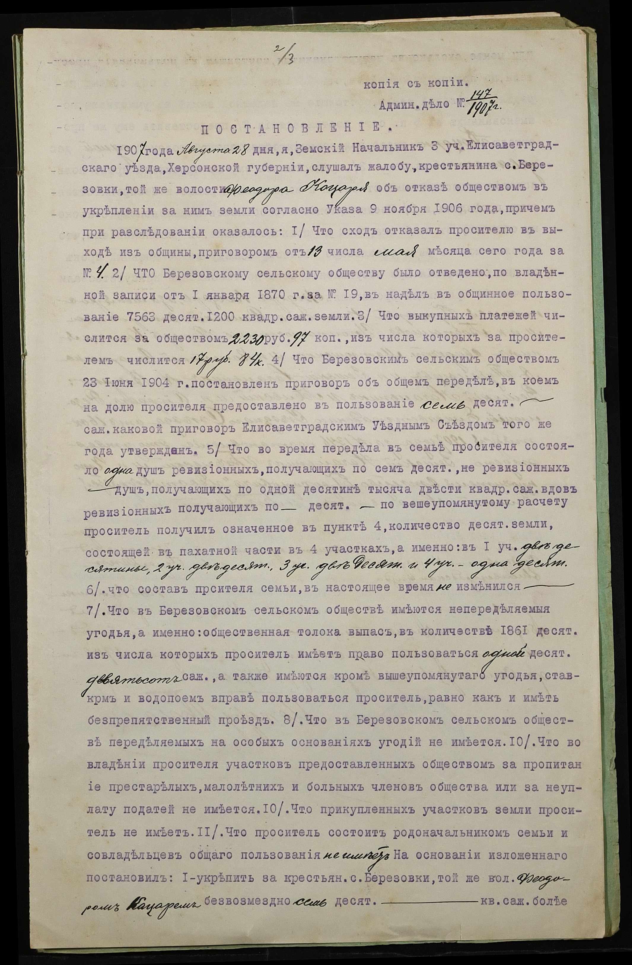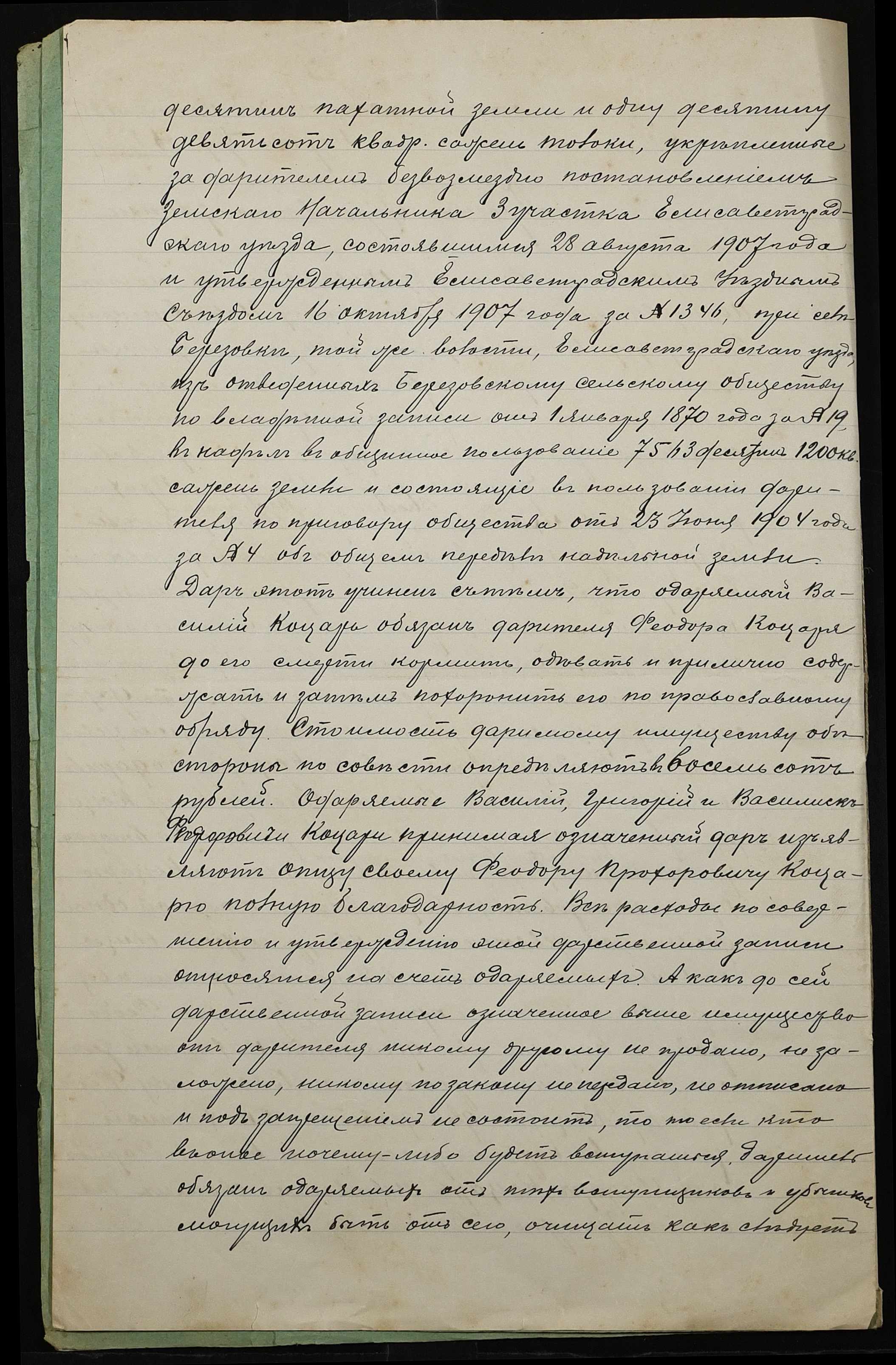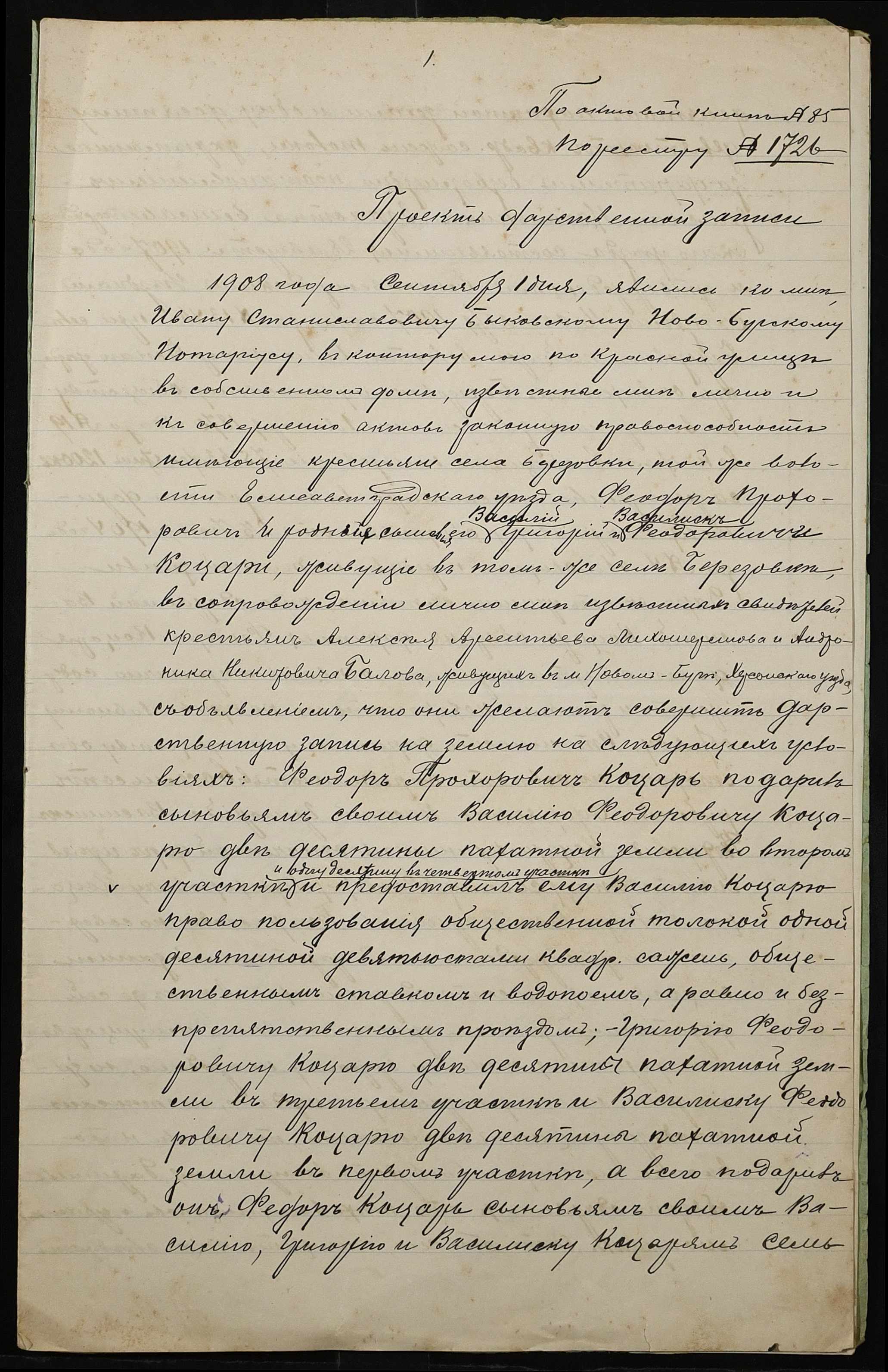 • • • • Справа № 5 “Справа про укладення дарчого запису на землю, передану селянином Кацарем Федором Прохоровичем у власність Кацаря Василя (Василия) Федоровича, Кацаря Григорія (Григория) Федоровича і Кацаря Василіска (Василиска) Федоровича”