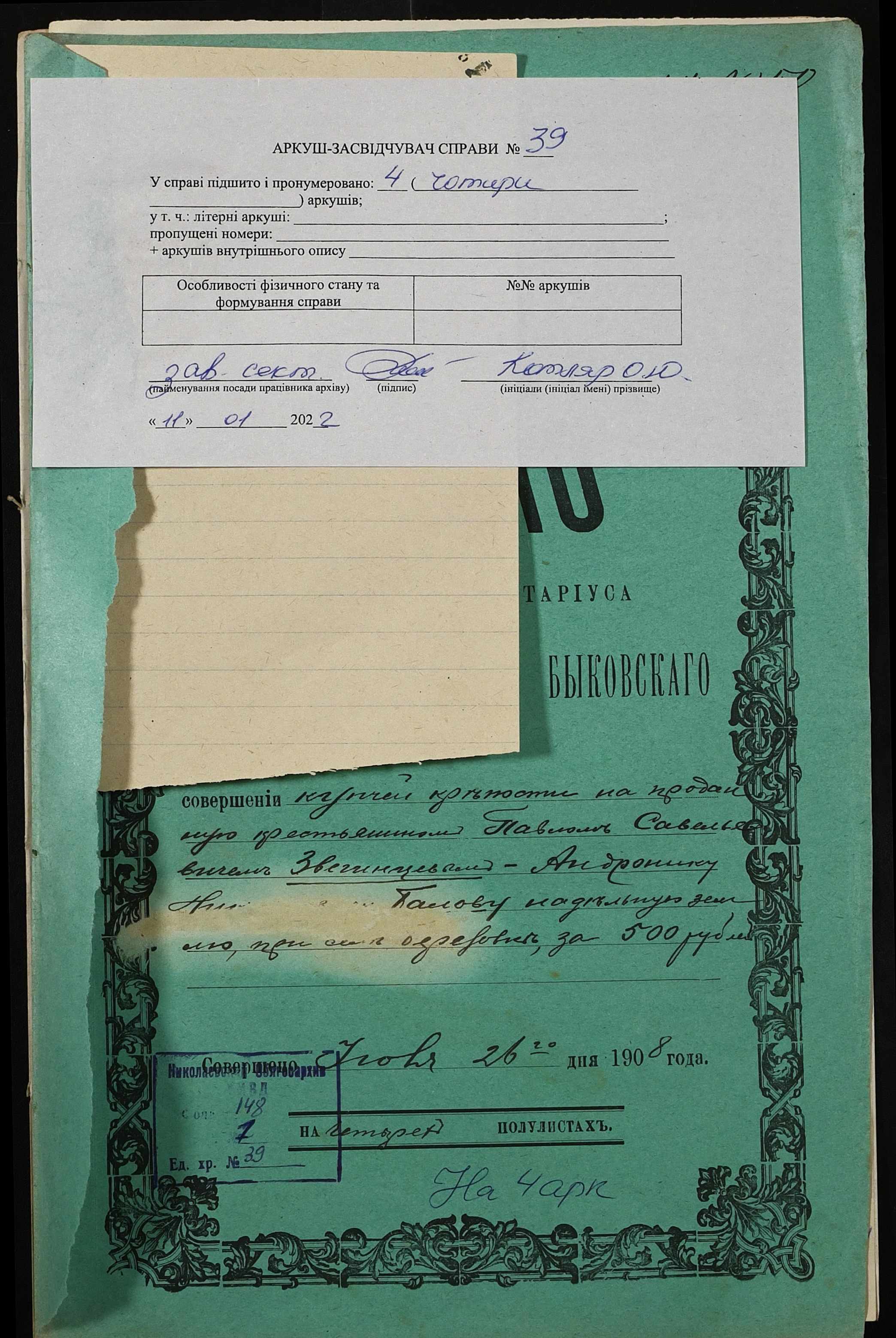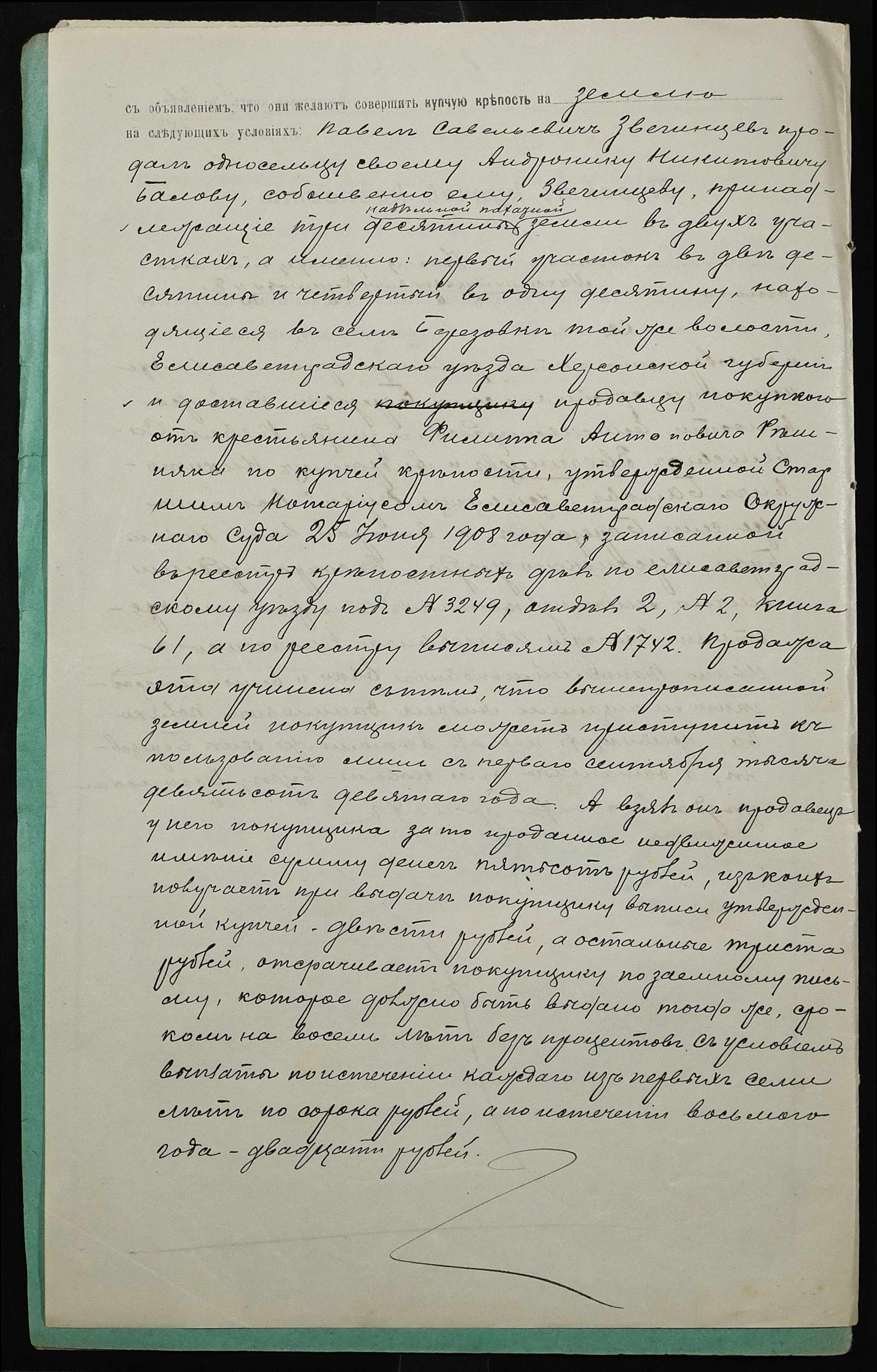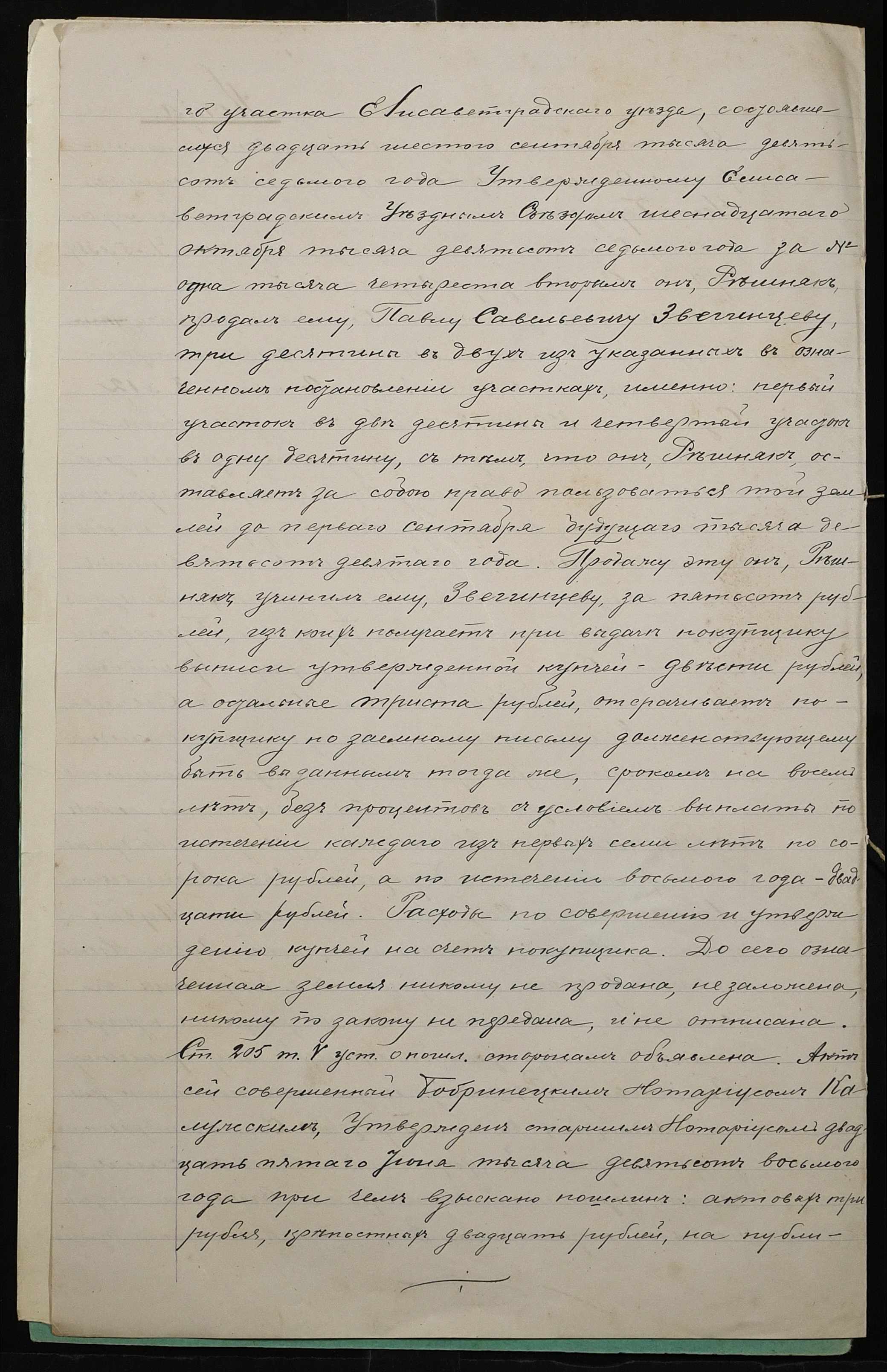 • • • • Справа № 39 “Справа про вчинення купчої про продаж землі селянином Звегінцевим (Звегинцевым) Павлом Савелійовичем (Савельевичем) на користь селянина Балова Андроника Микитовича (Никитовича)”