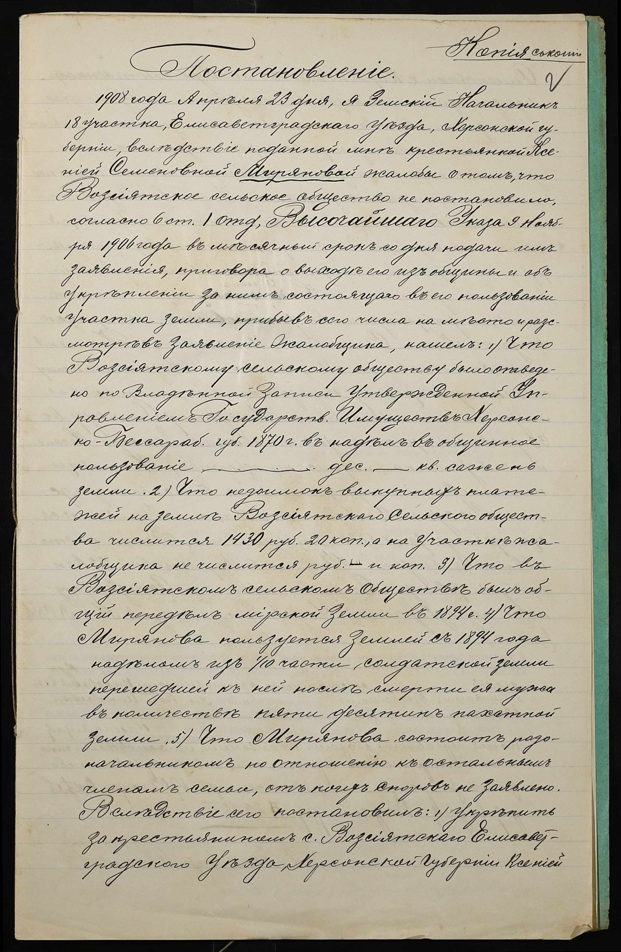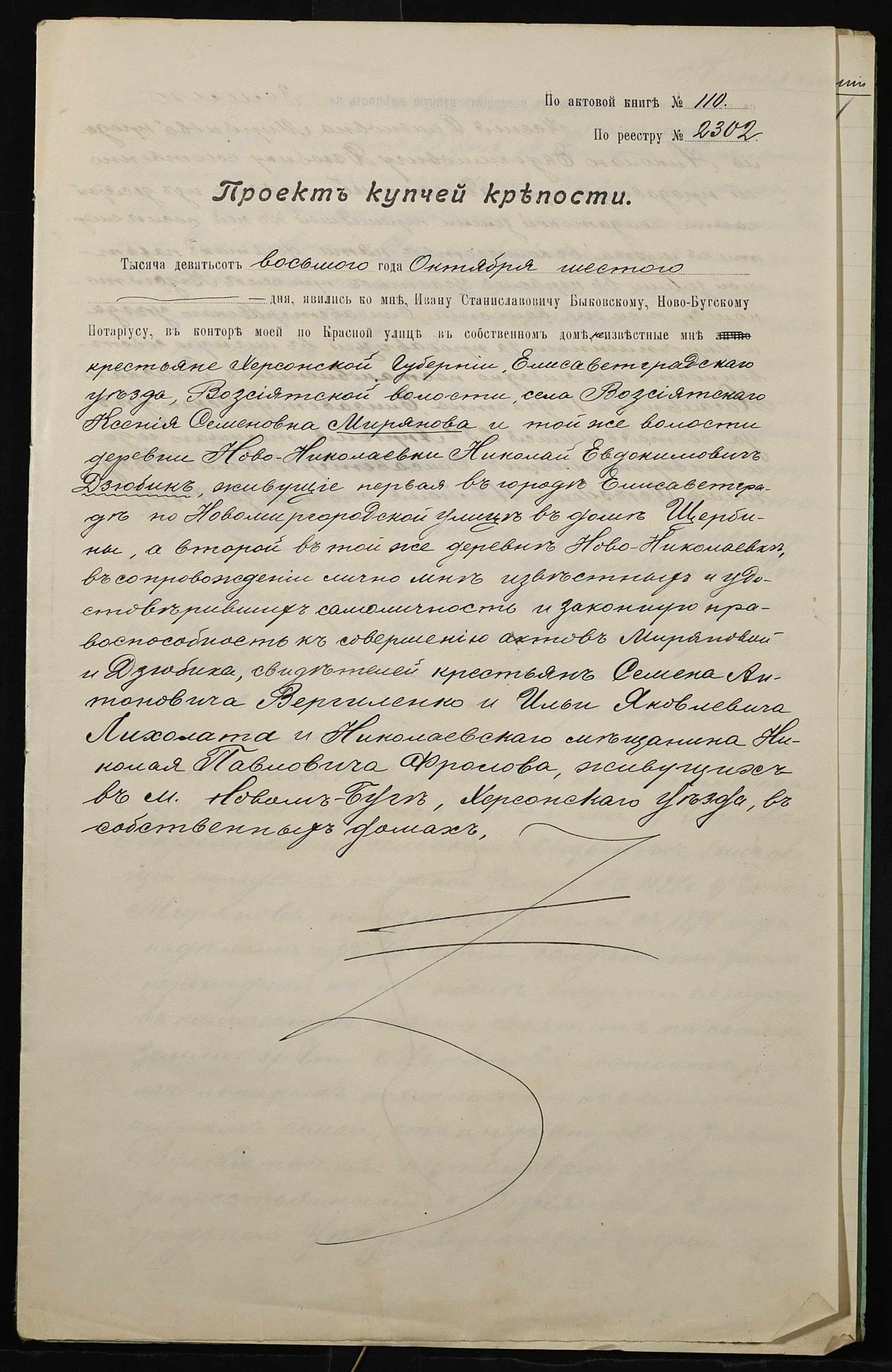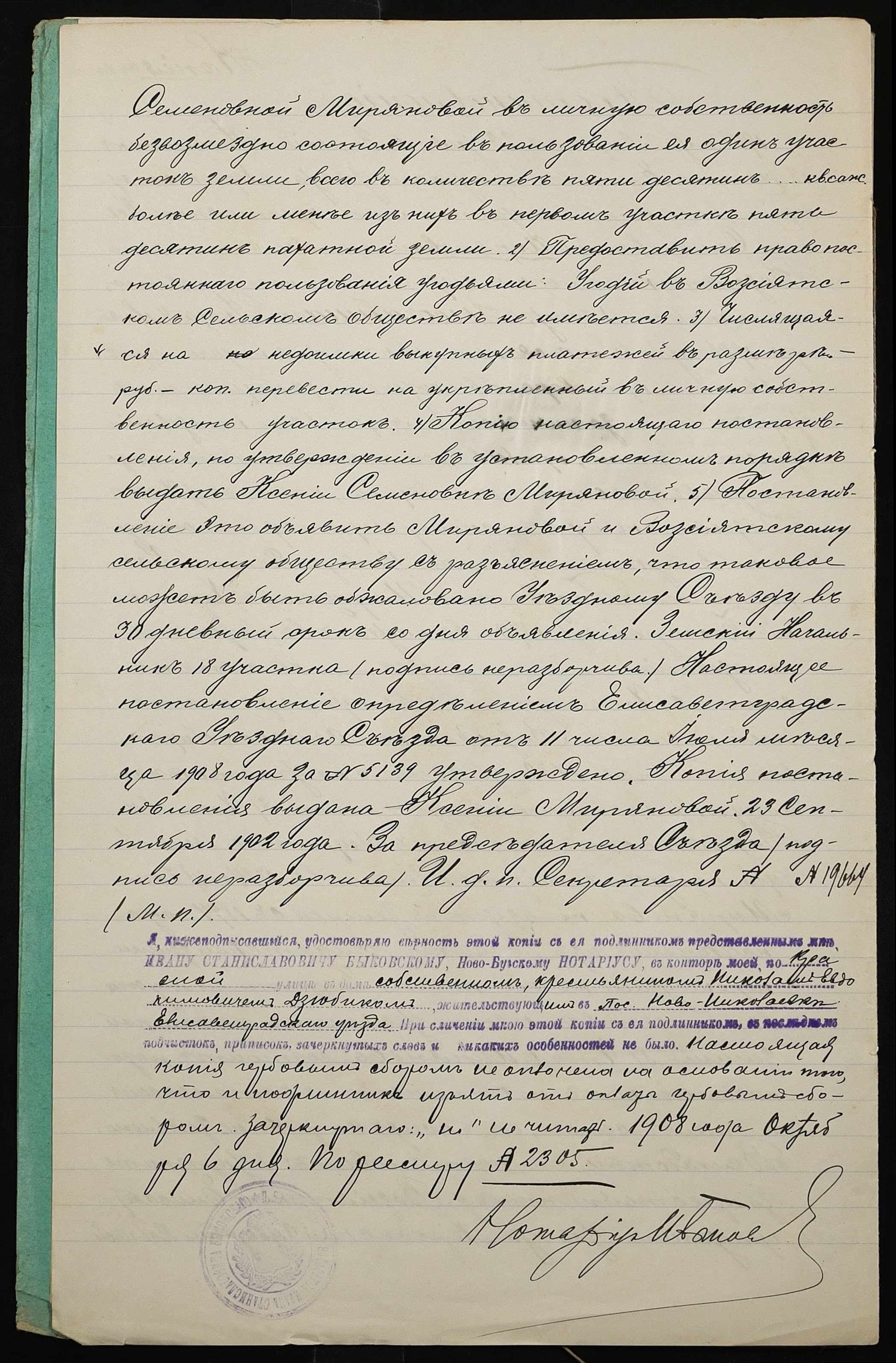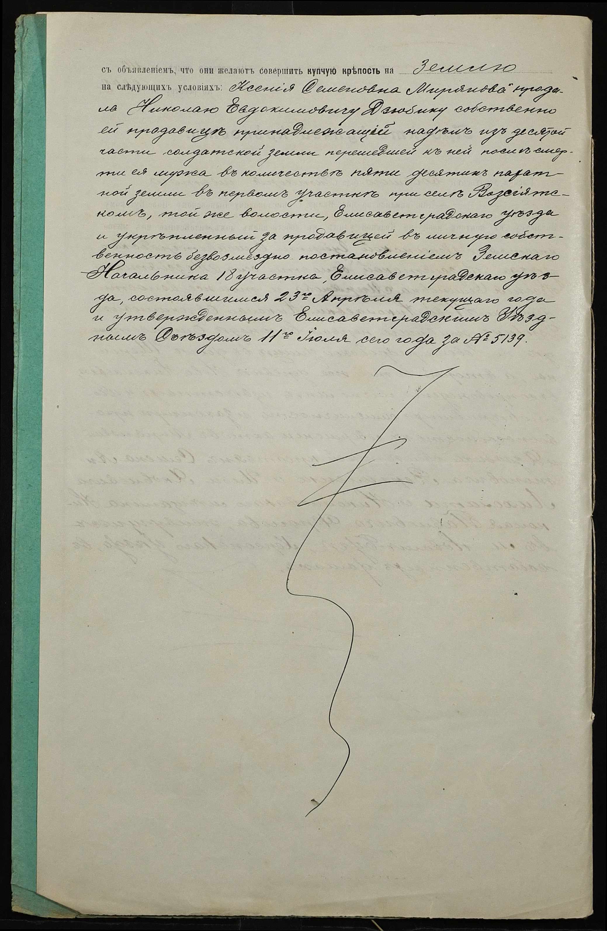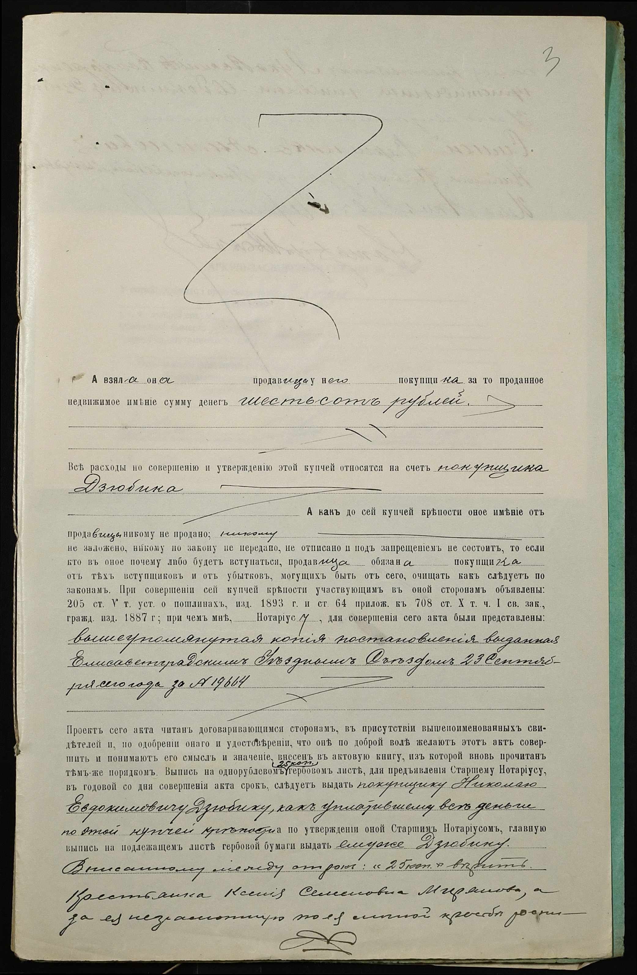 • • • • Справа № 49 “Справа про вчинення купчої про продаж землі селянкою Миряновою Ксенією Семенівною (Миряновой Ксенией Семеновной) на користь селянина Дзюбика Миколи Євдокимовича (Николая Евдокимовича)”