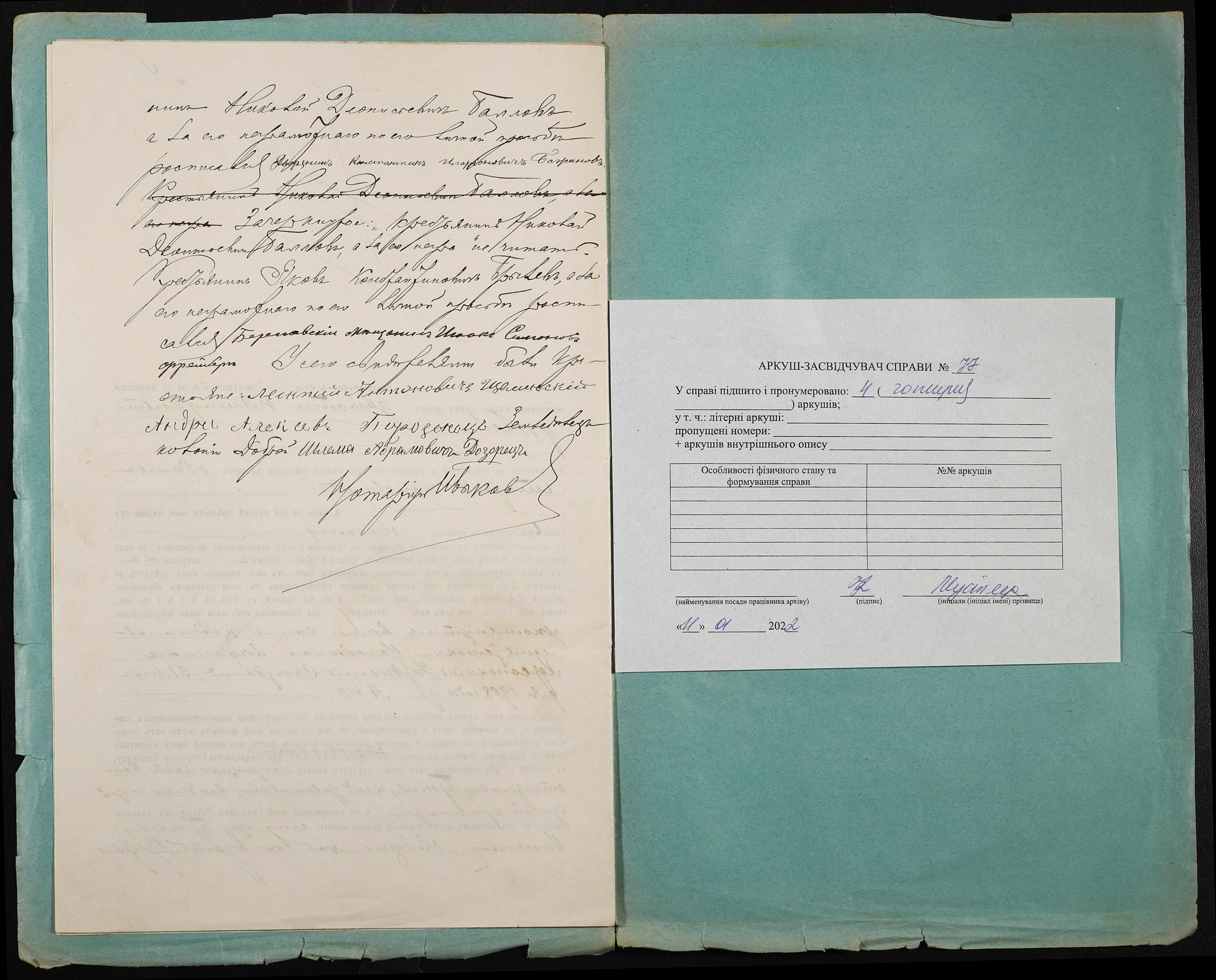 • • • • Справа № 77 “Справа про вчинення купчої про продаж землі селянином Баловим Миколою Деонісійовичем (Николаем Деонисиевичем) на користь селянина Брильова (Брылева) Якова Костянтиновича (Константиновича)”
