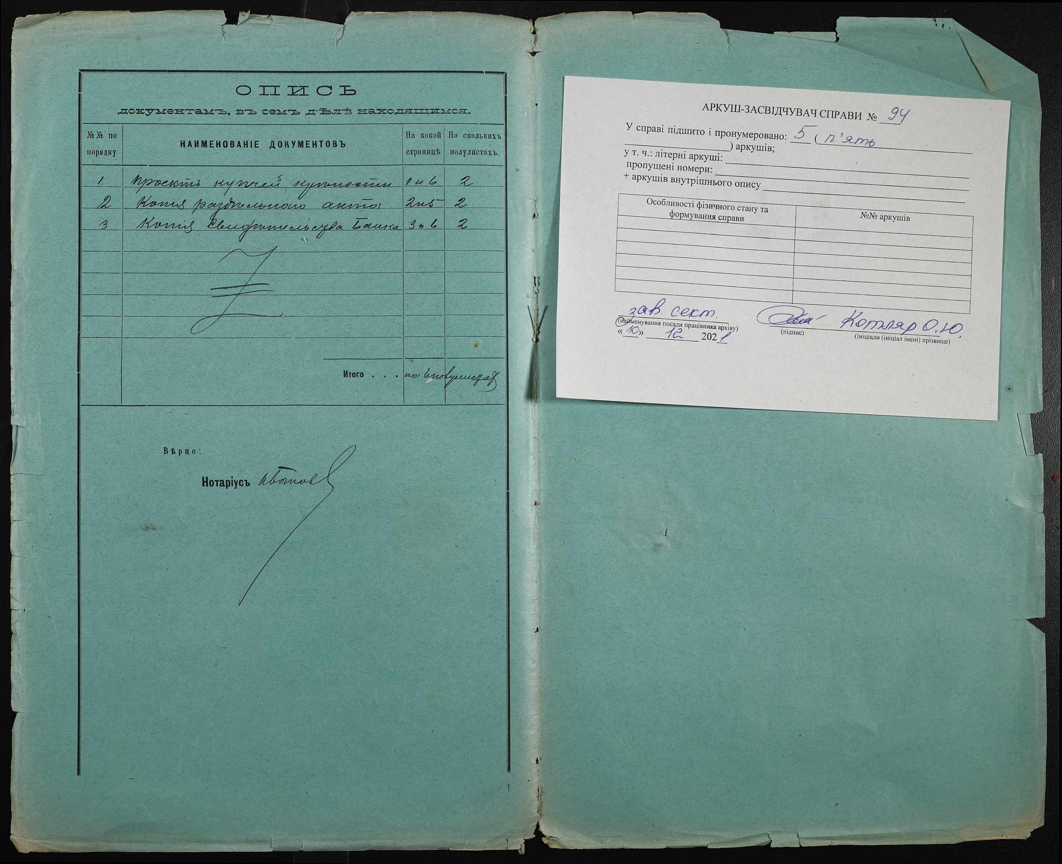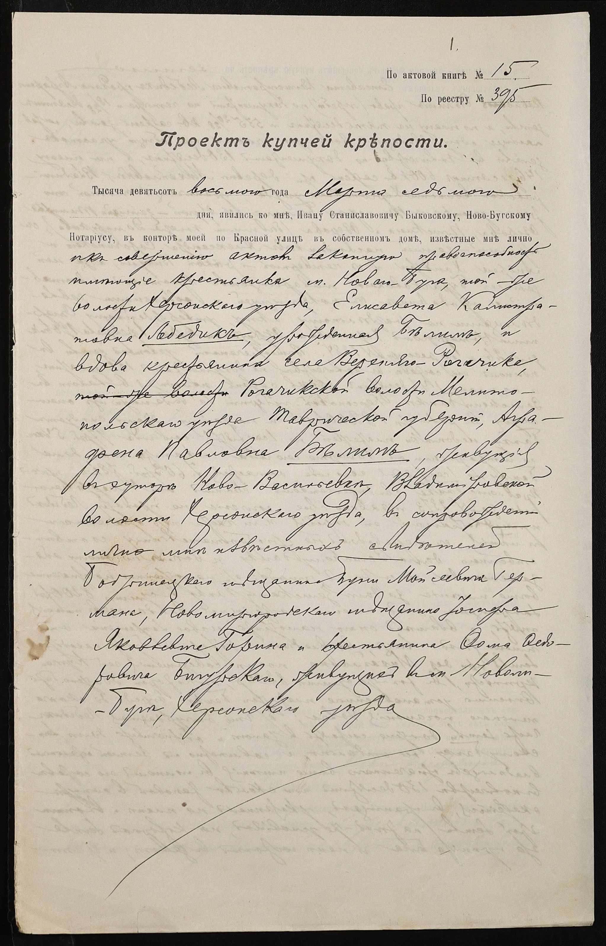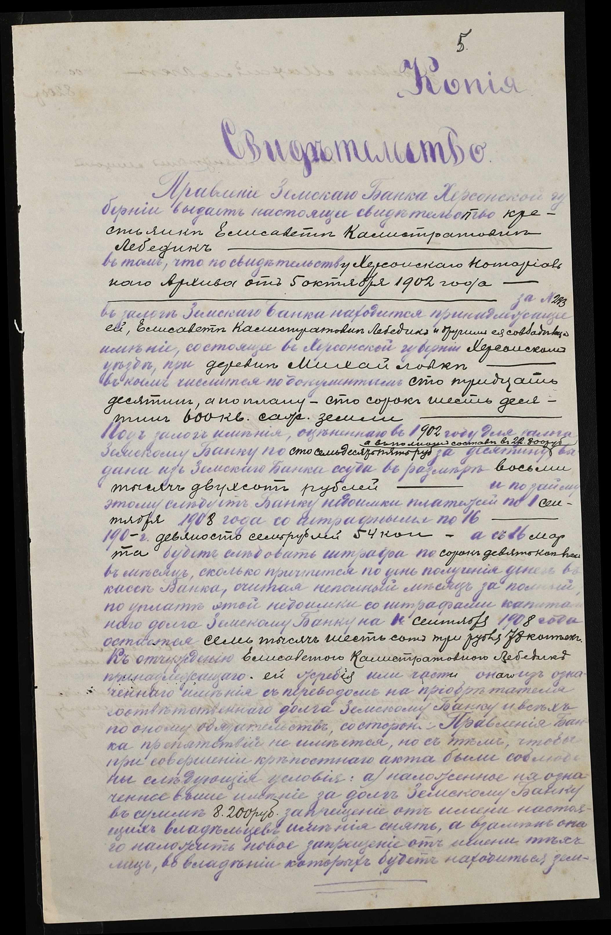 • • • • Справа № 94 “Справа про вчинення купчої про продаж землі селянкою Лебедик Єлисаветою Калістратівною (Елисаветой Калистратовной) на користь селянки Бєлої Горпини Павлівни (Белой Аграфены Павловны)”