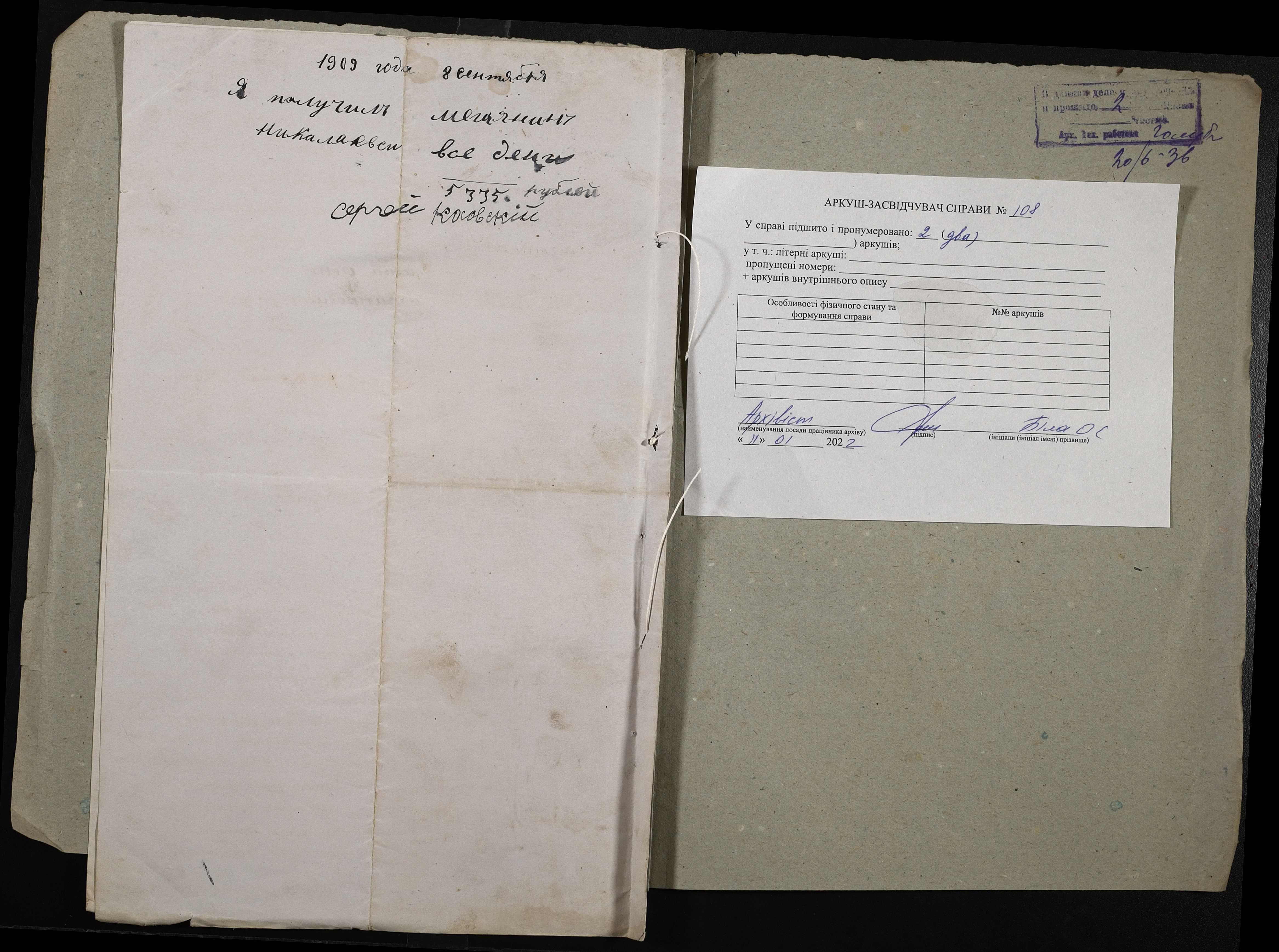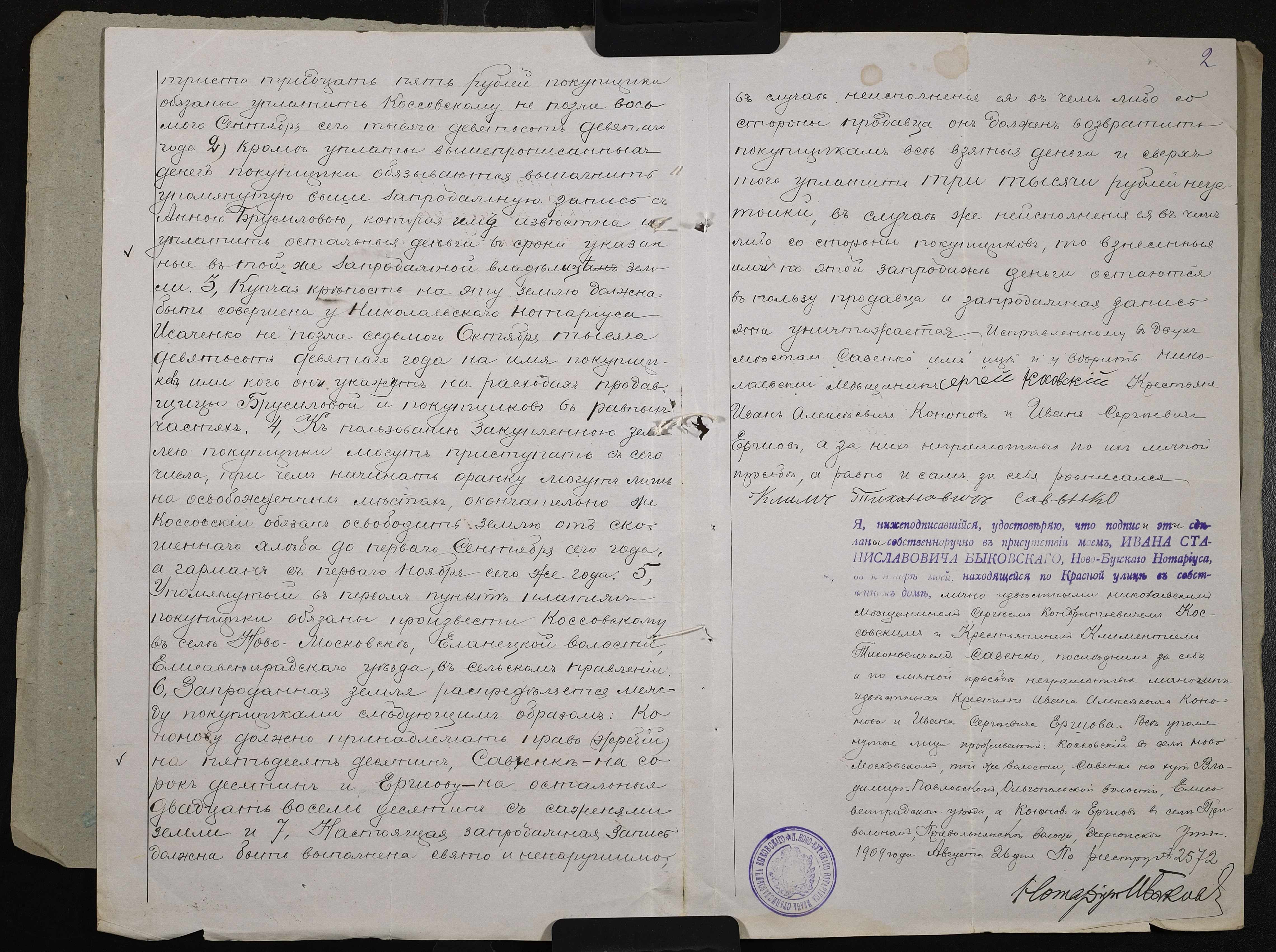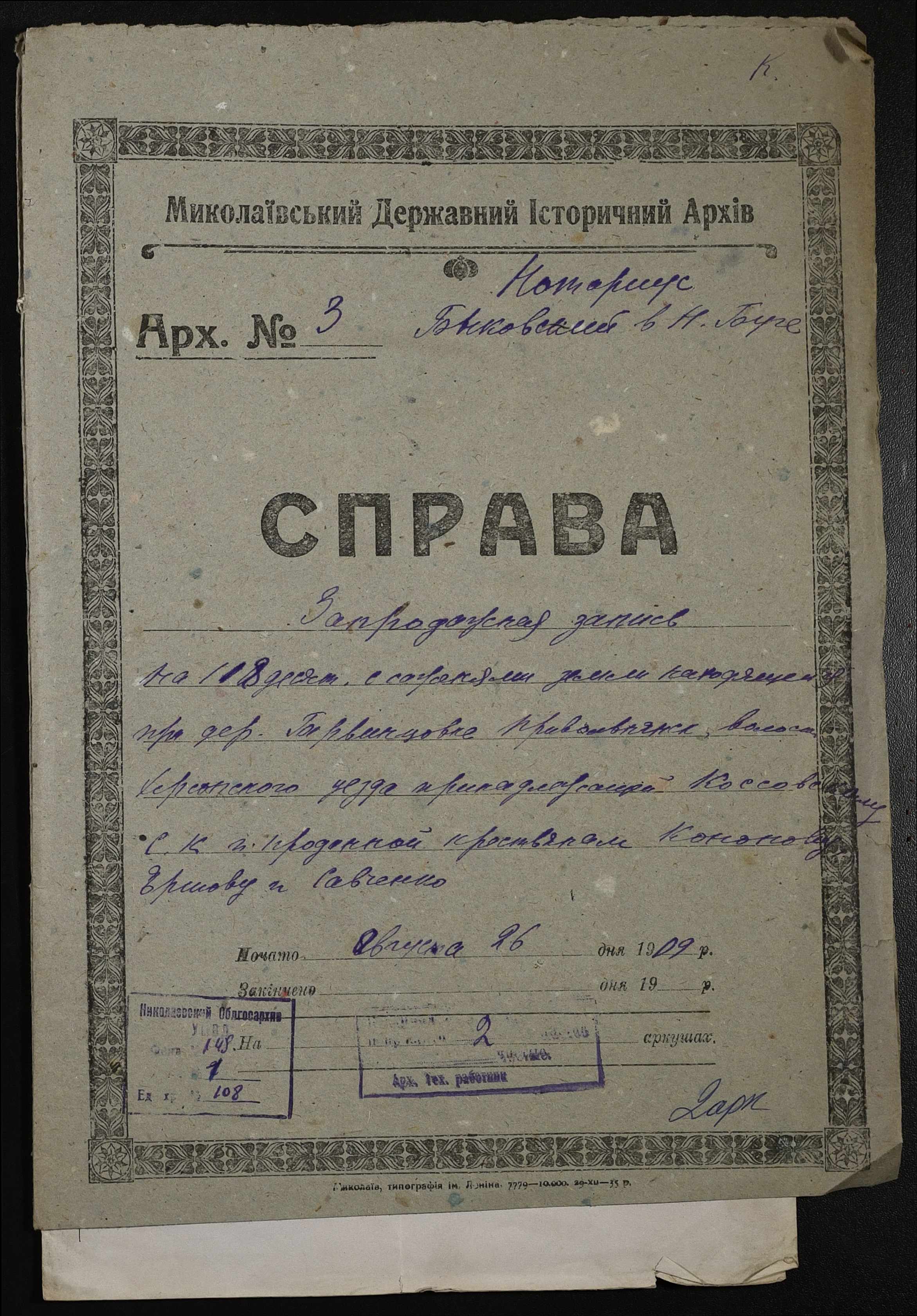 • • • • Справа № 108 “Справа про укладення запродажного запису на землю між миколаївським міщанином Коссовським Сергієм Кіндратовичем (Коссовским Сергеем Кондратьевичем) і селянами Кононовим Іваном Олексійовичем (Кононовым Иваном Алексеевичем), Єршовим Іваном Сергійовичем (Ершовым Иваном Сергеевичем) і Савченком Климентієм (Савченко Климентием) Тихоновичем”