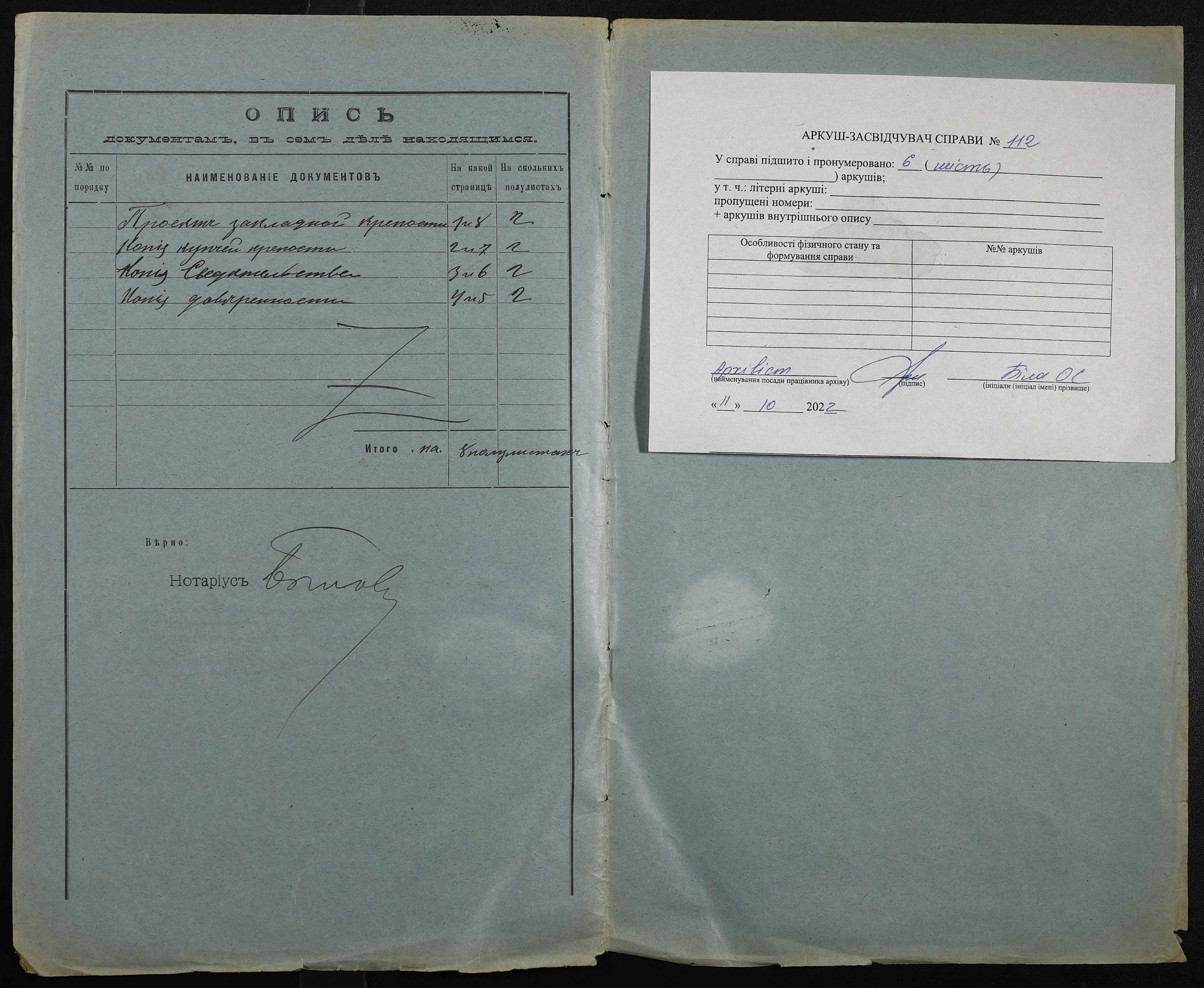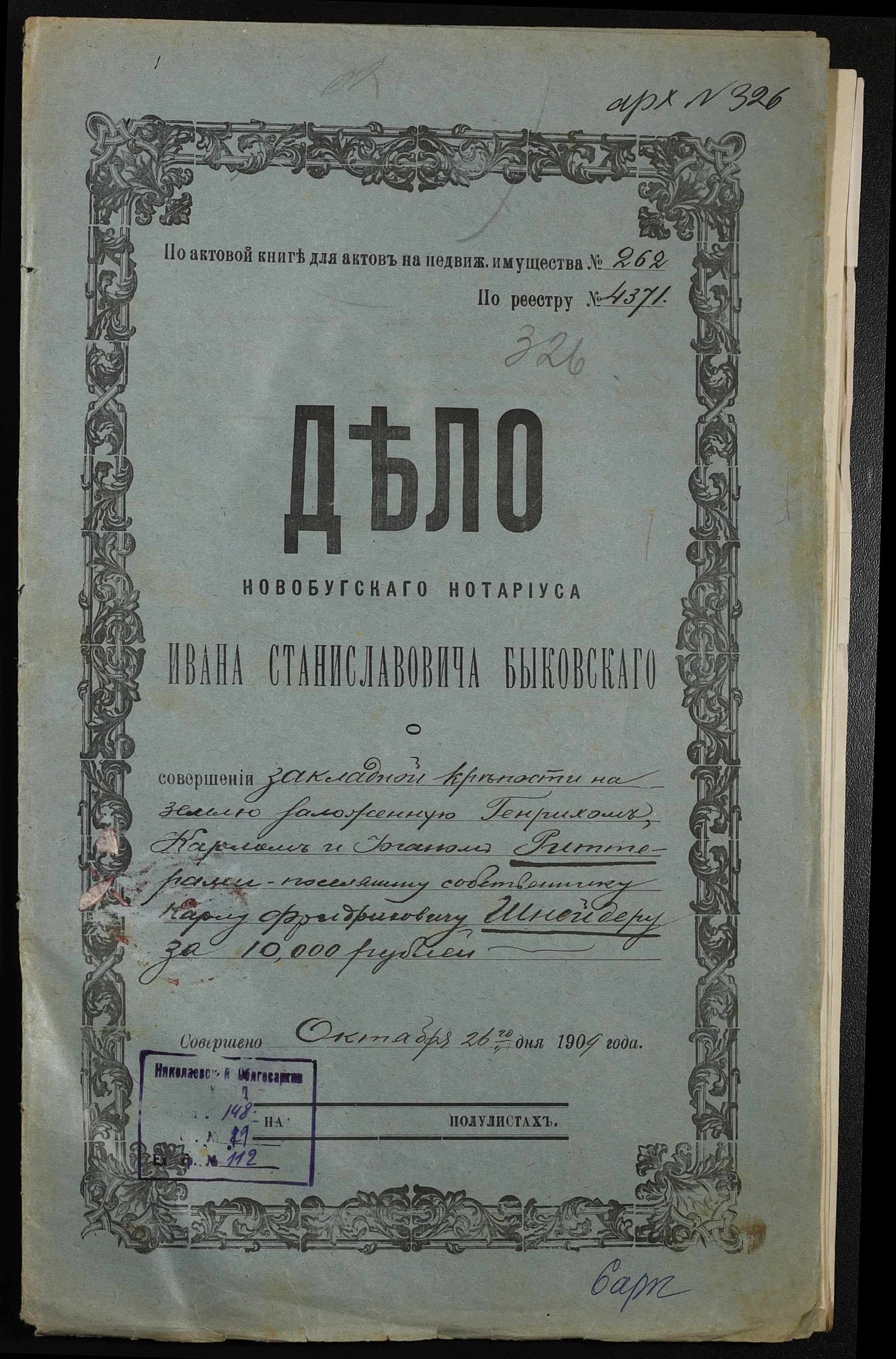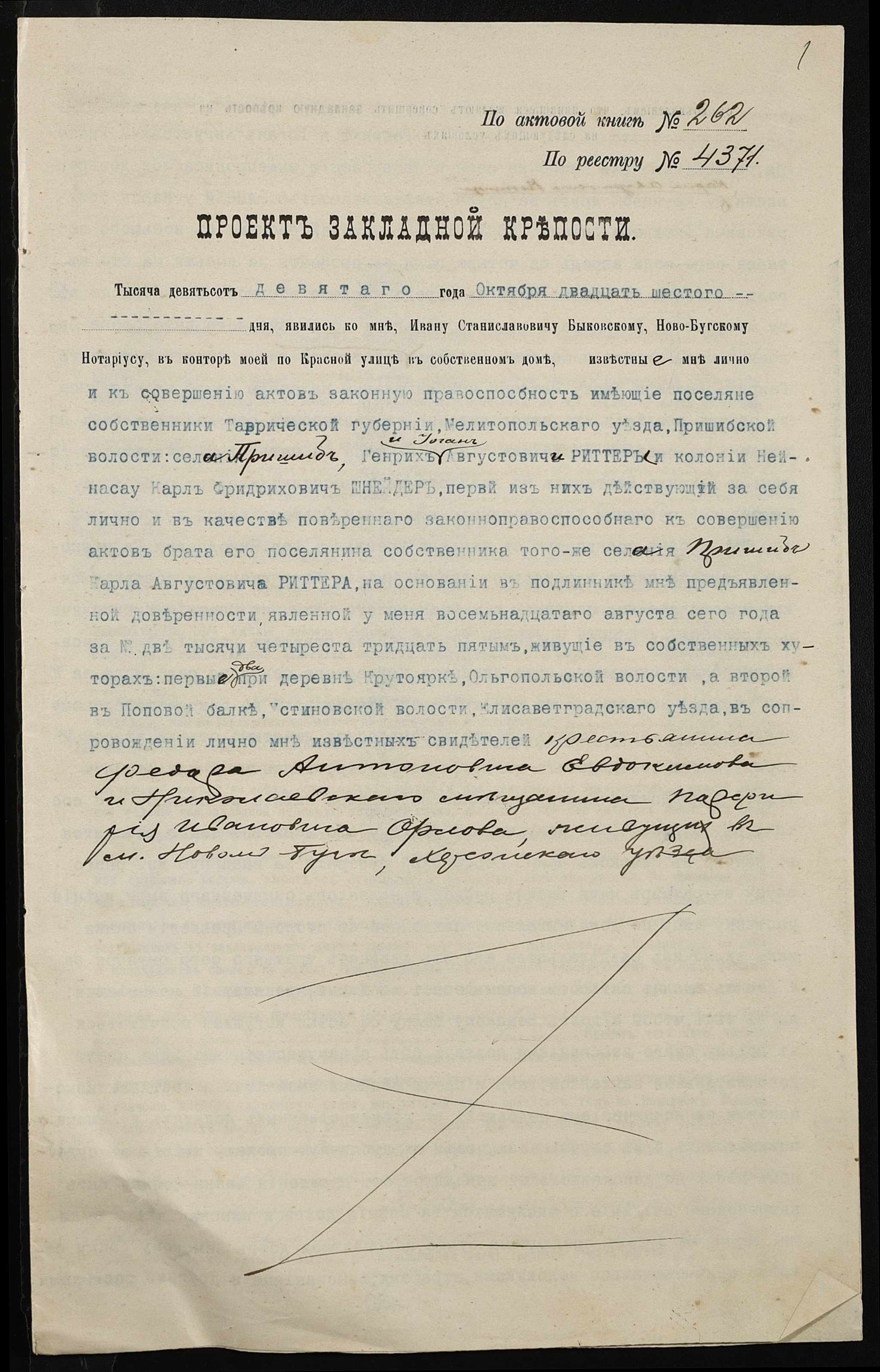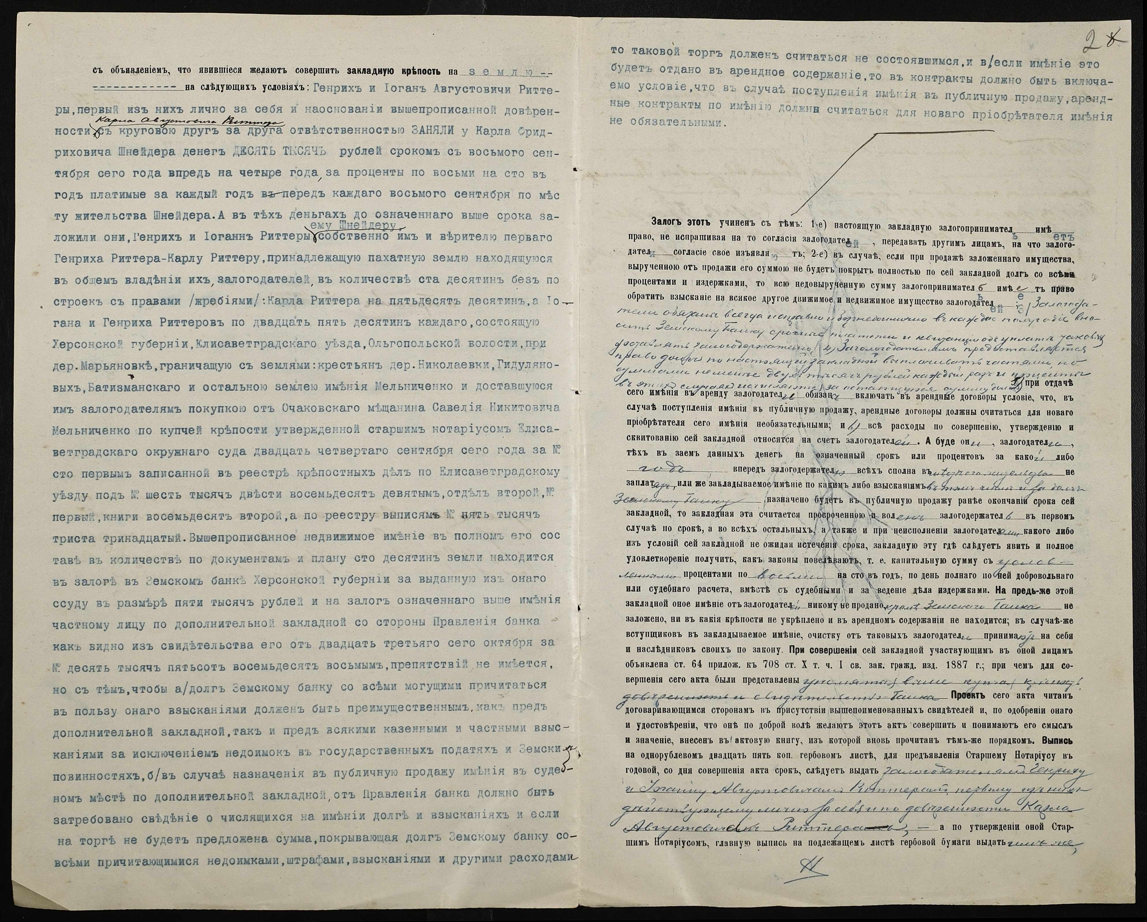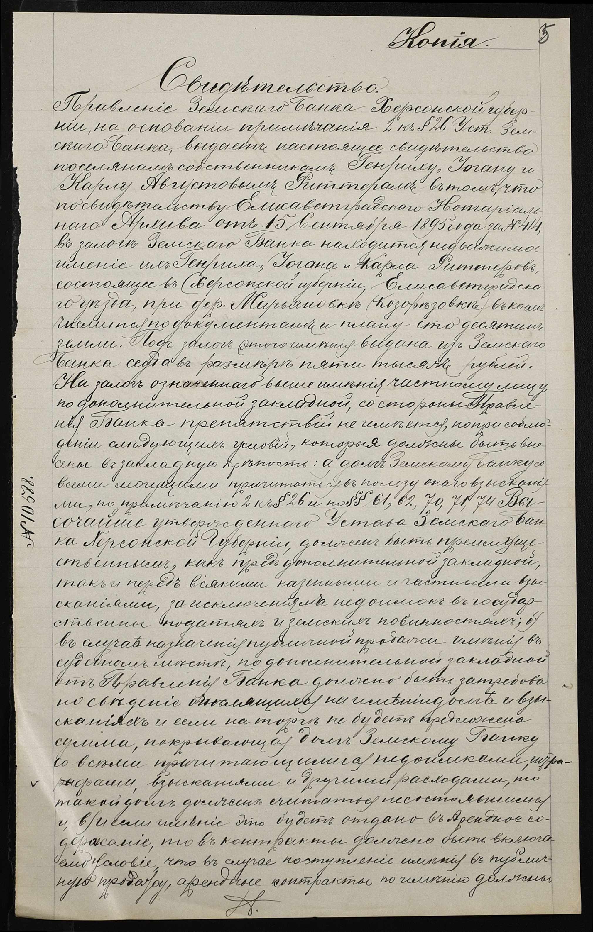 • • • • Справа № 112 “Справа про вчинення заставної на землю, закладену Ріттером Генріхом (Риттером Генрихом), Ріттером (Риттером) Карлом і Ріттером (Риттером) Йоганом селянину-власнику Шнейдеру Карлу Фрідріховичу (Фридриховичу)”