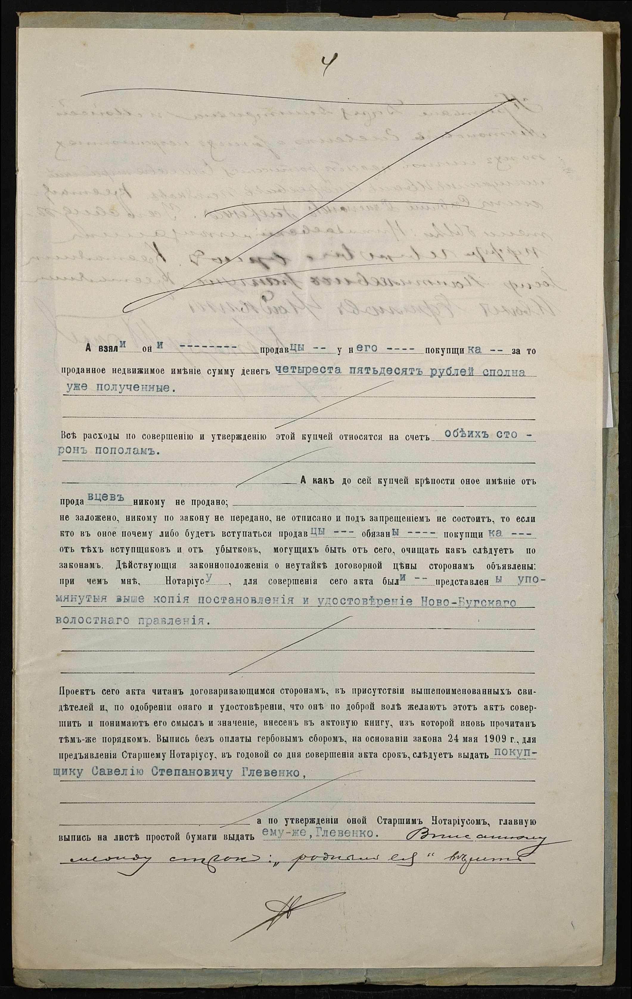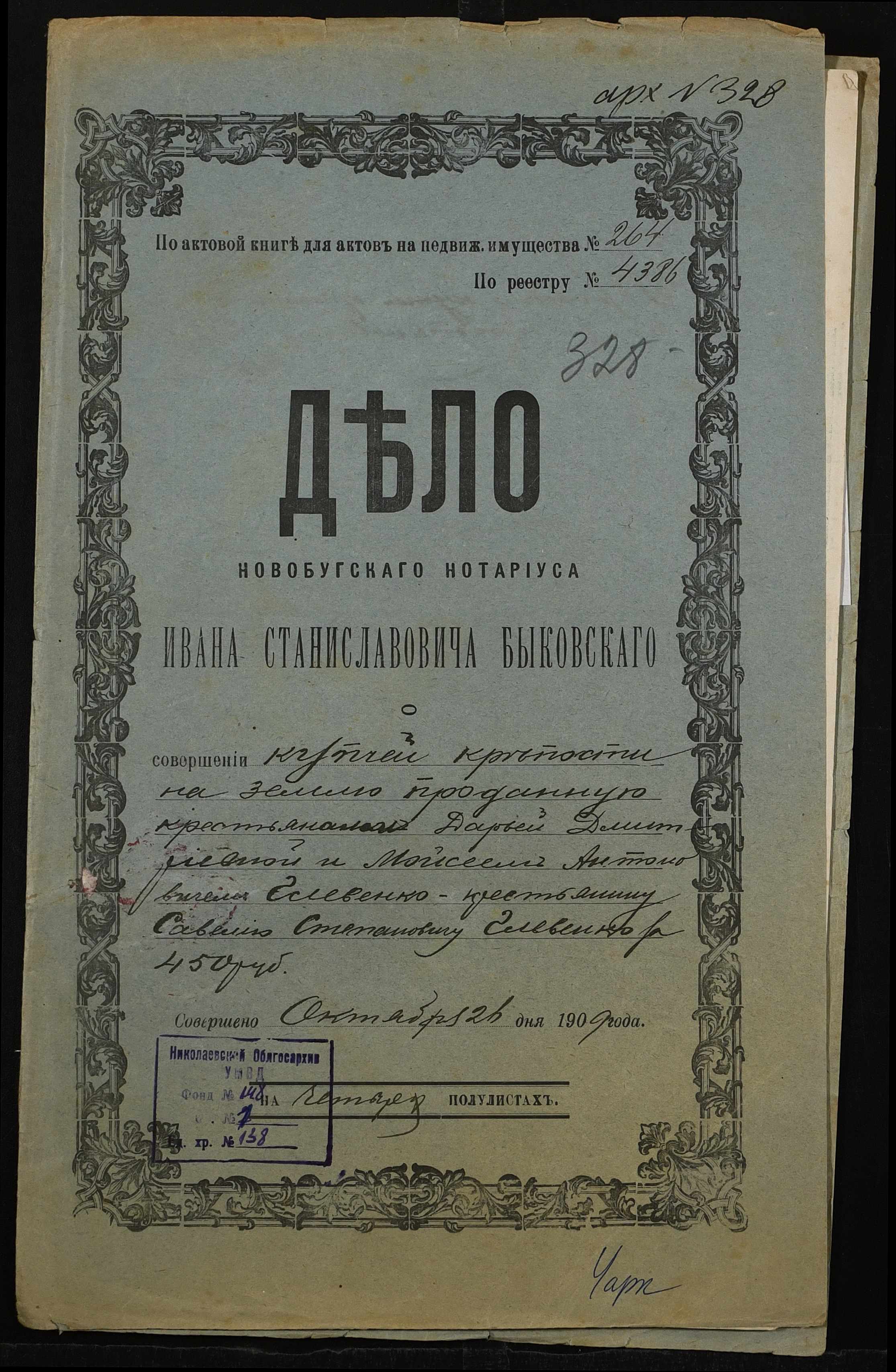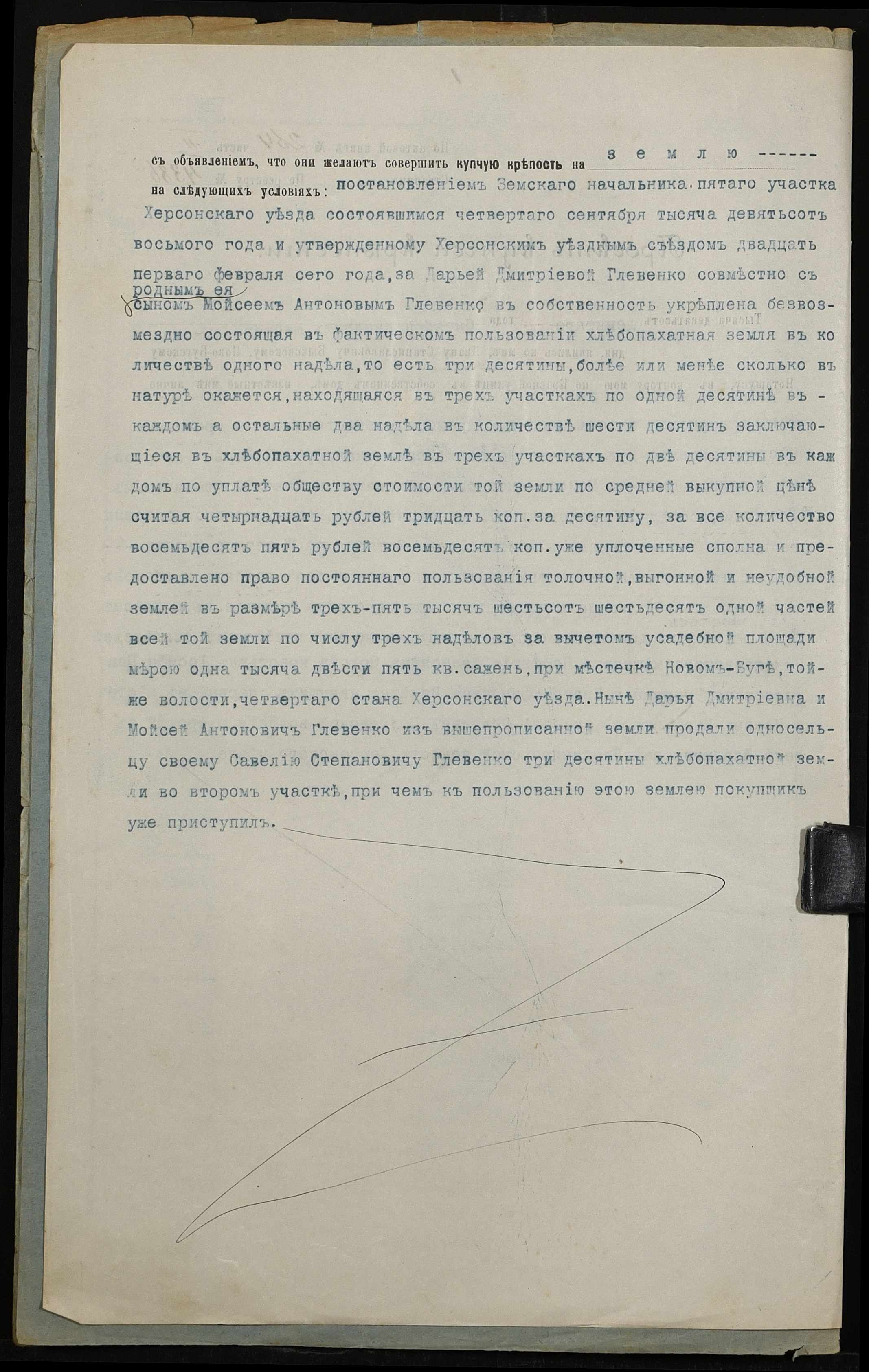 • • • • Справа № 138 “Справа про вчинення купчої про продаж землі селянами Глевенко Дарією Дмитрівною (Дарией Дмитриевной) і Глевенком Мойсеєм Антоновичем (Глевенко Моисеем Антоновичем) на користь селянина Глевенка Савелія (Глевенко Савелия) Степановича”